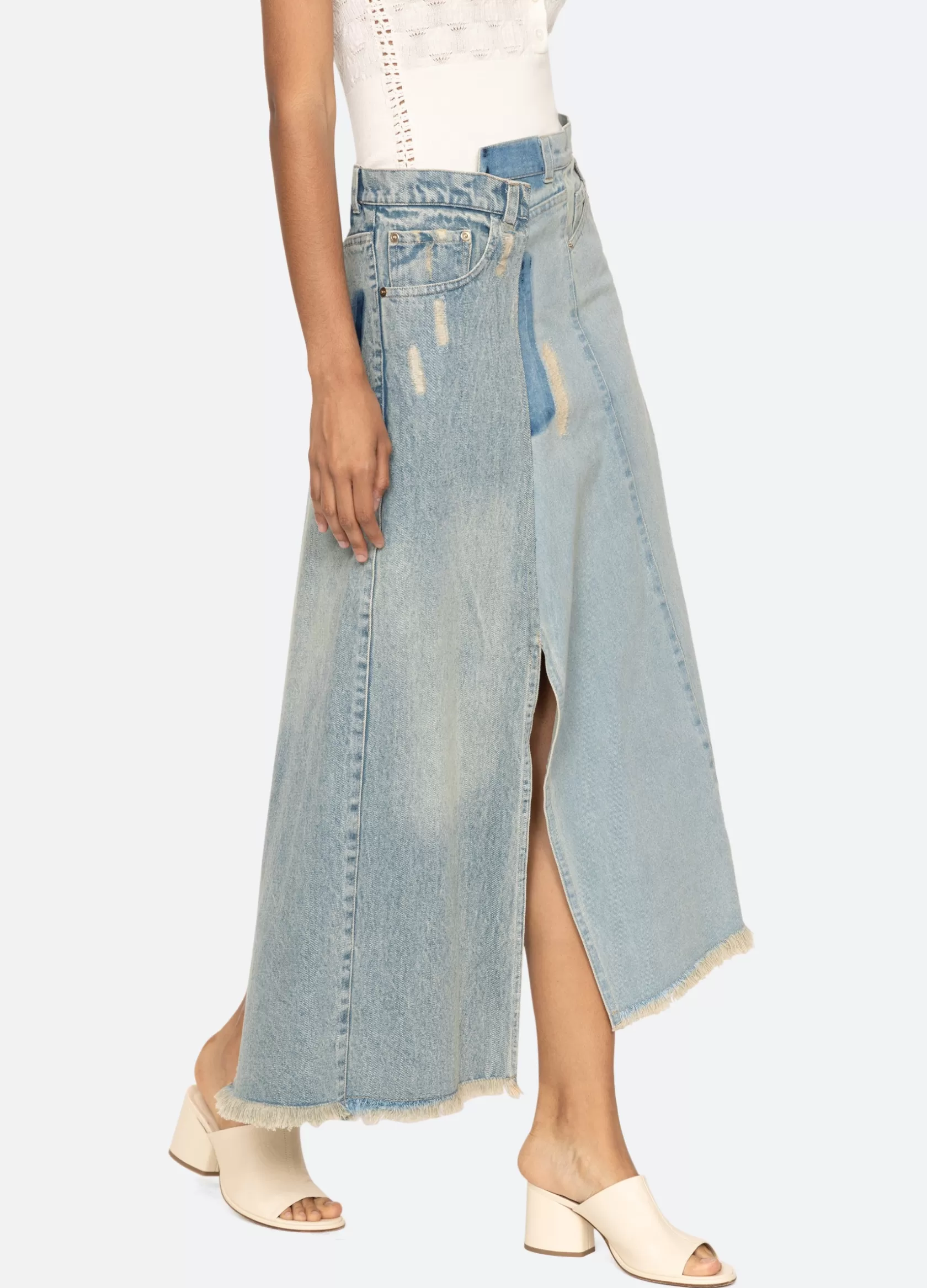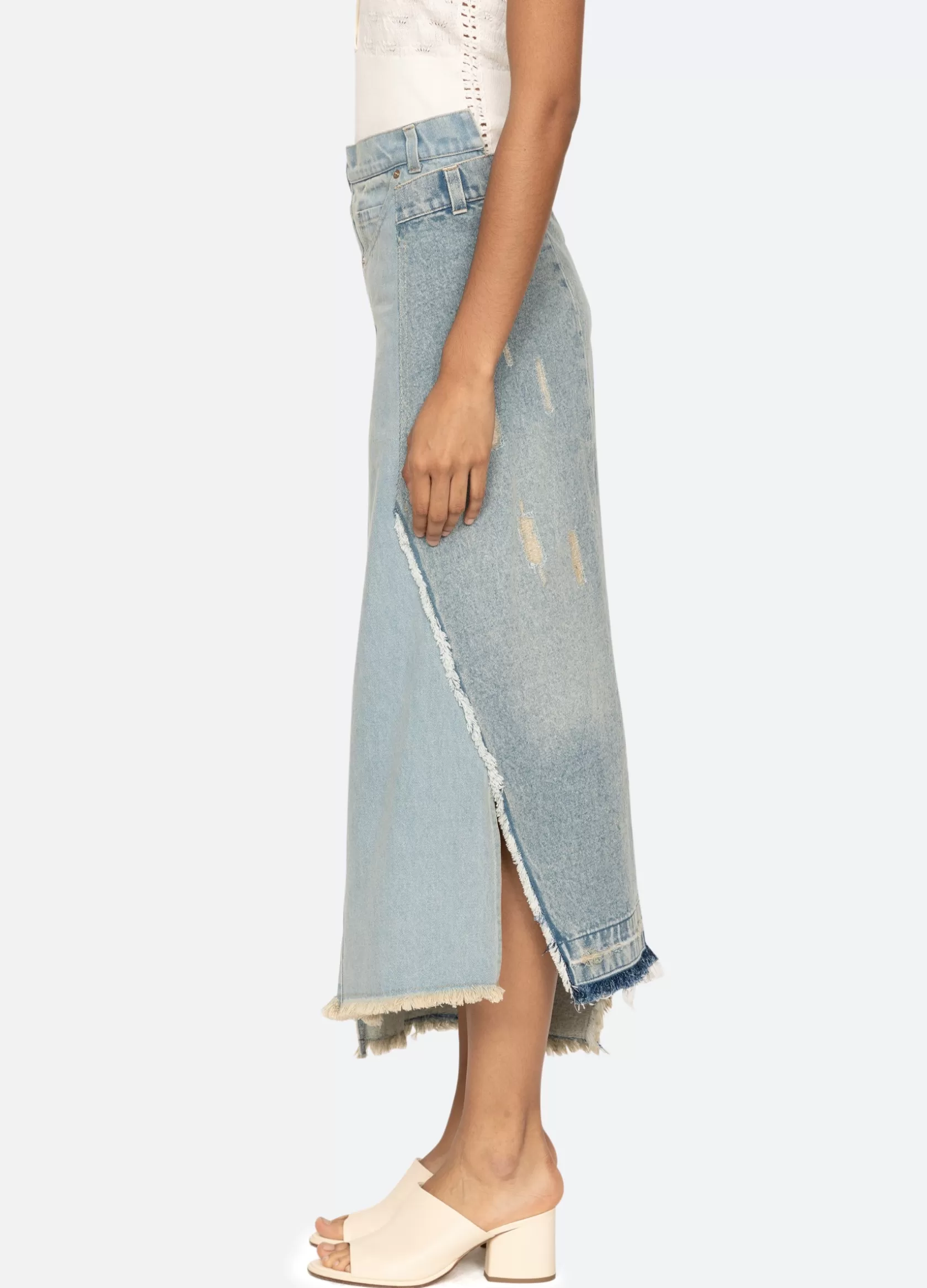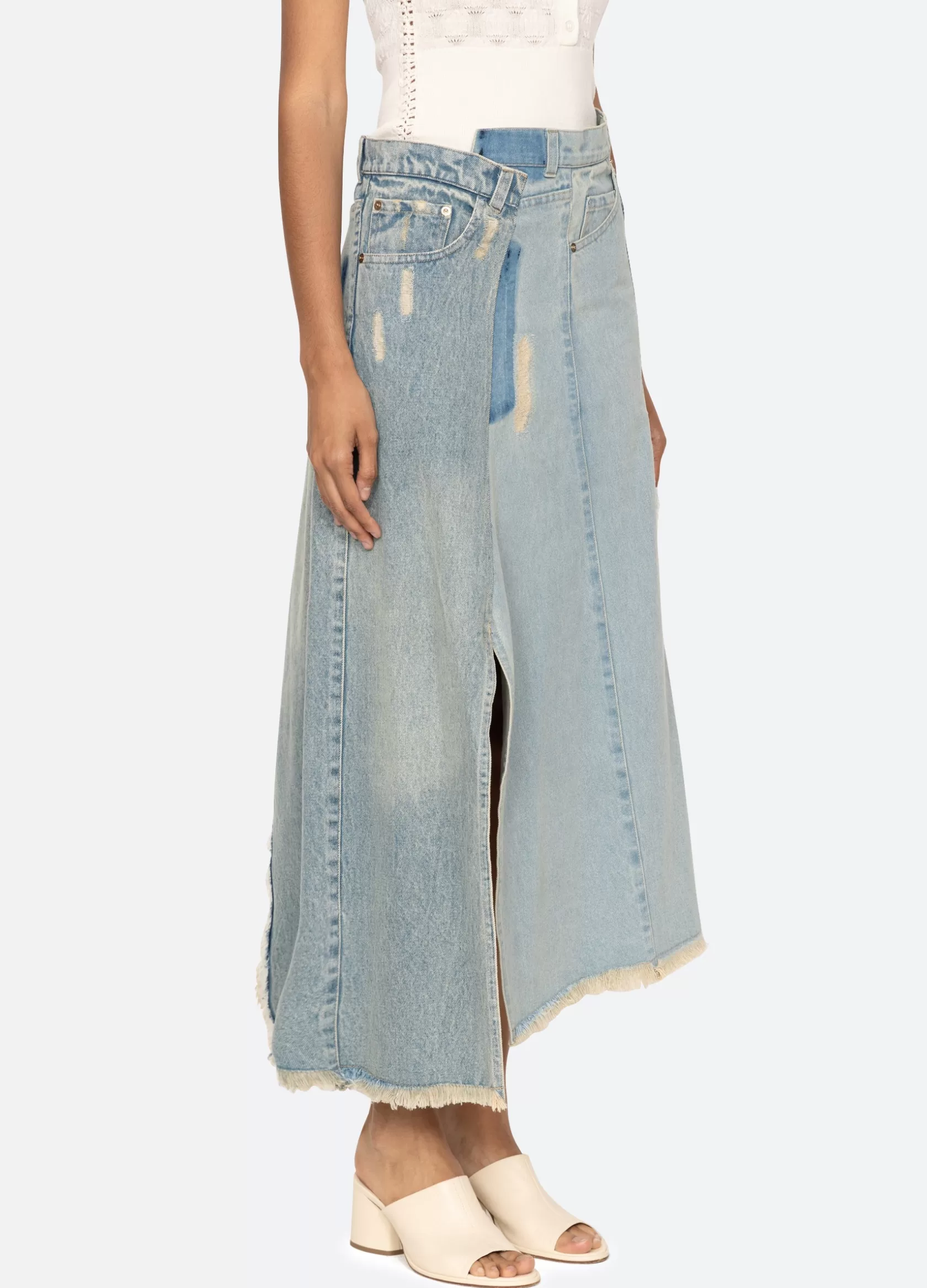 The Alba denim skirt features a high rise asymmetrical waist, asymmetrical front slit and finished with heavy distressing.