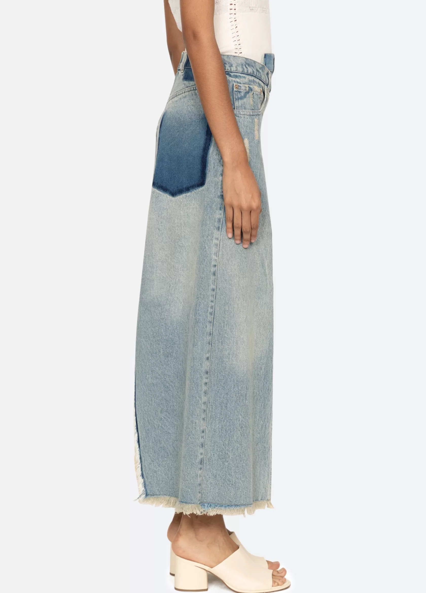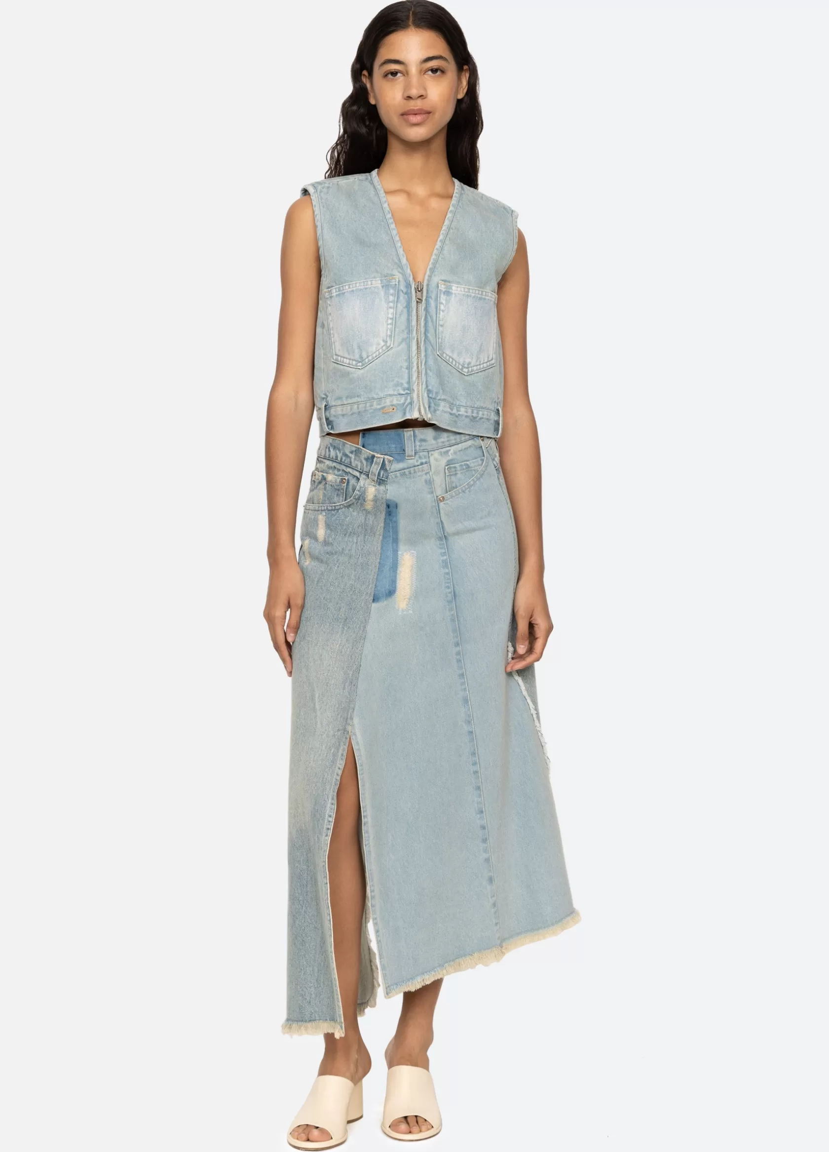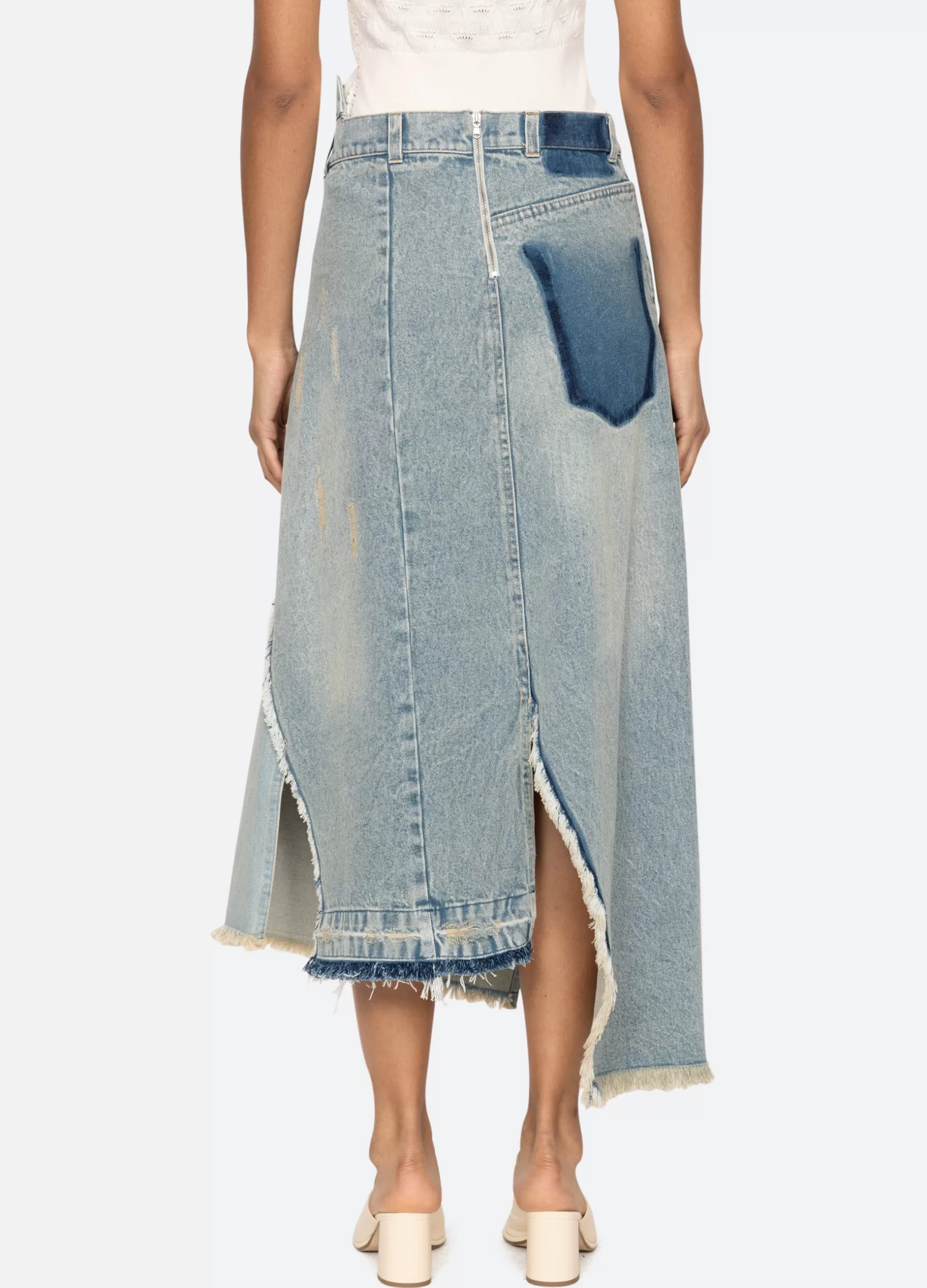 The Alba denim skirt features a high rise asymmetrical waist, asymmetrical front slit and finished with heavy distressing.