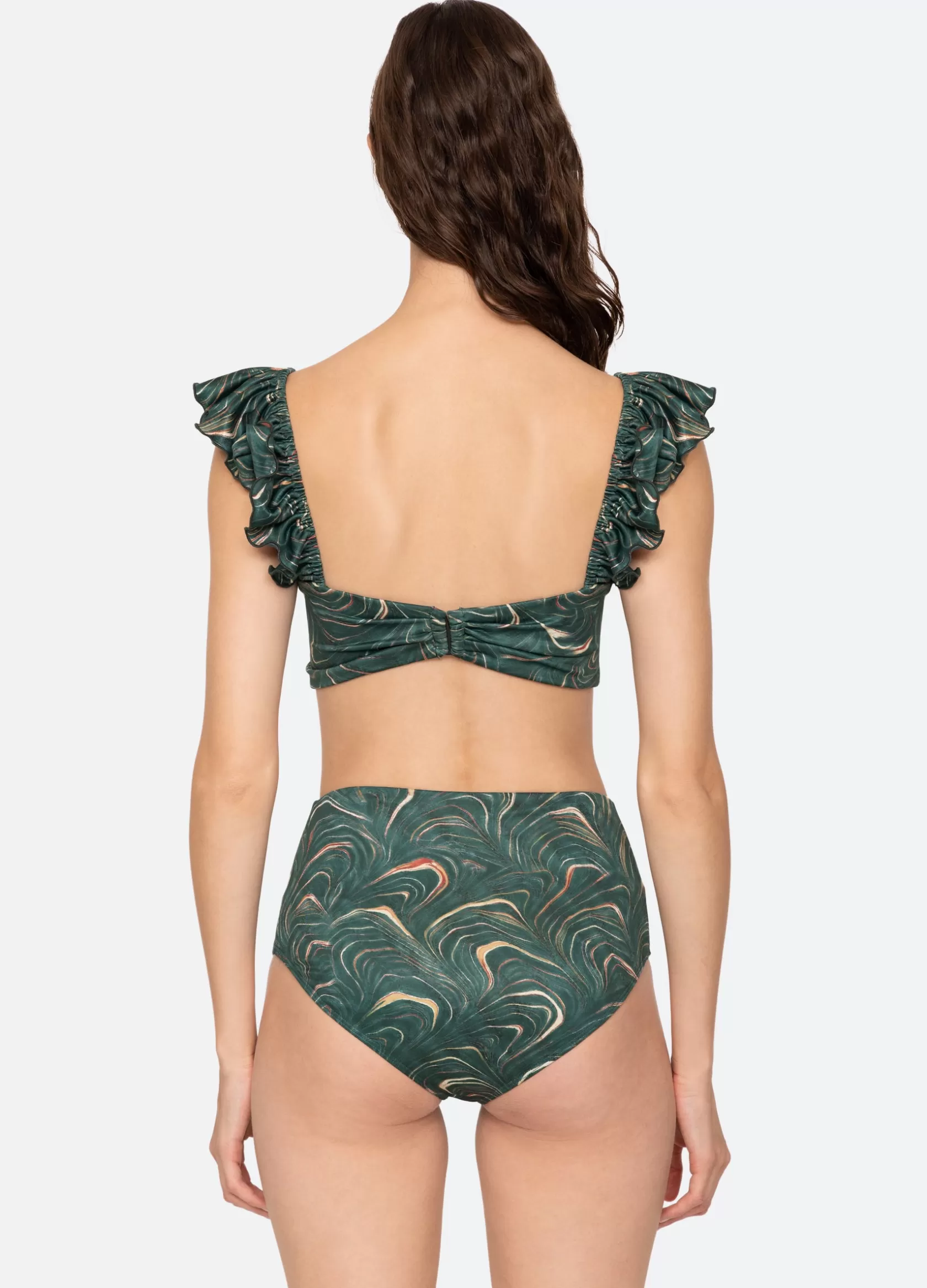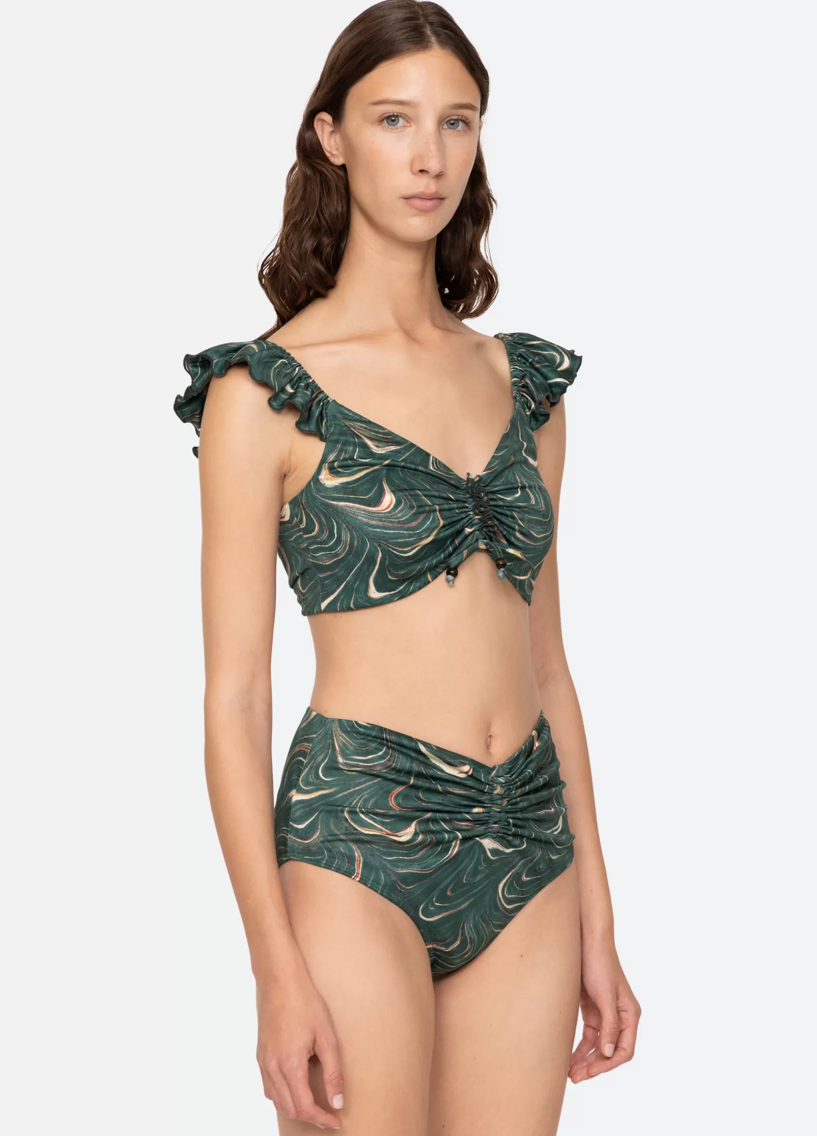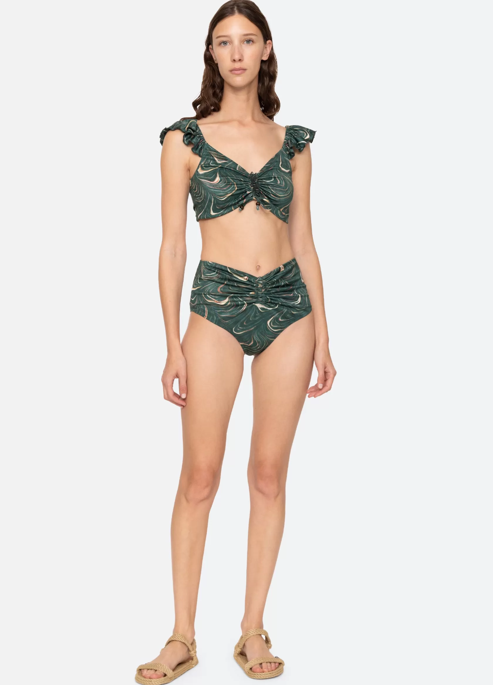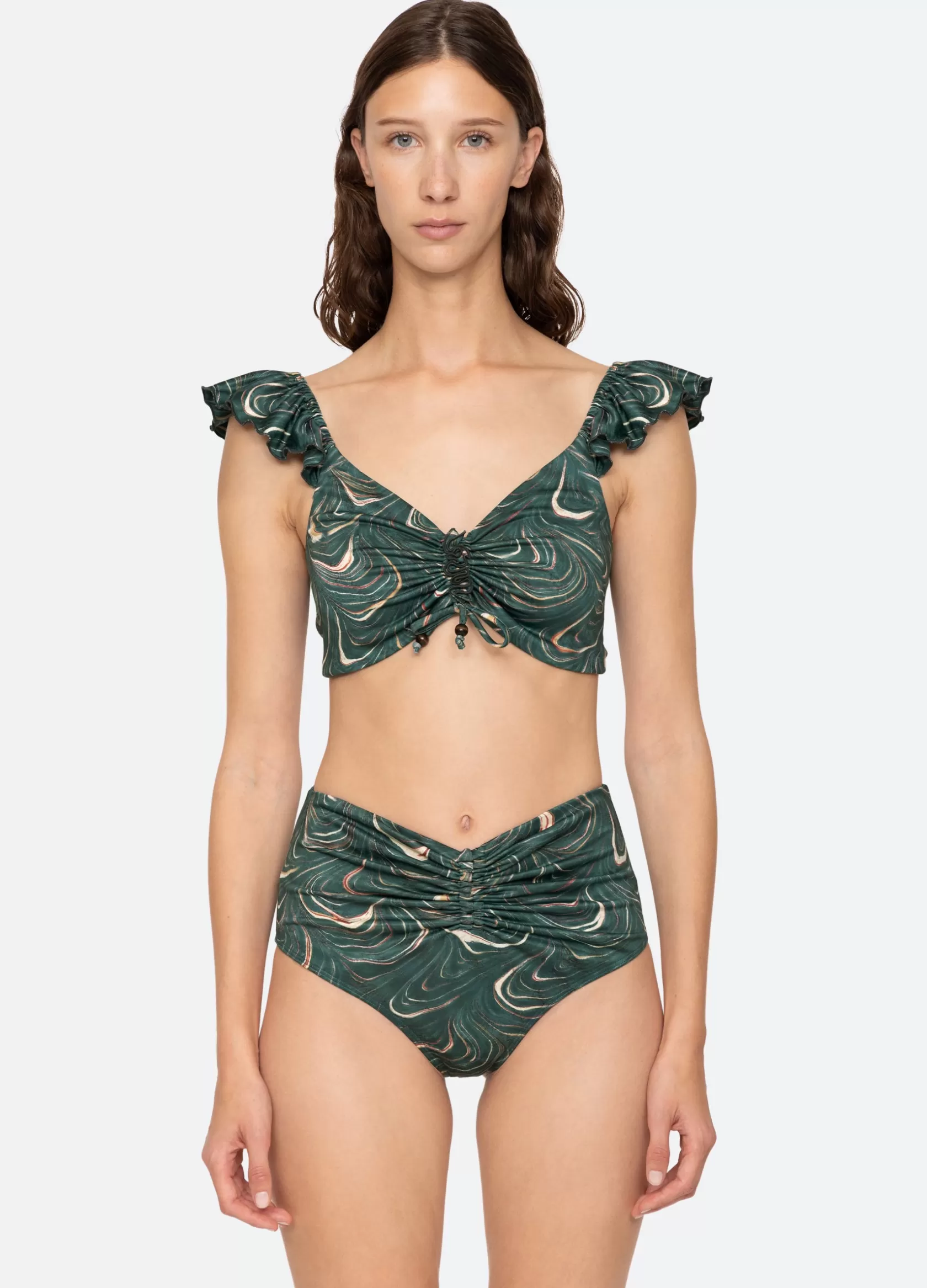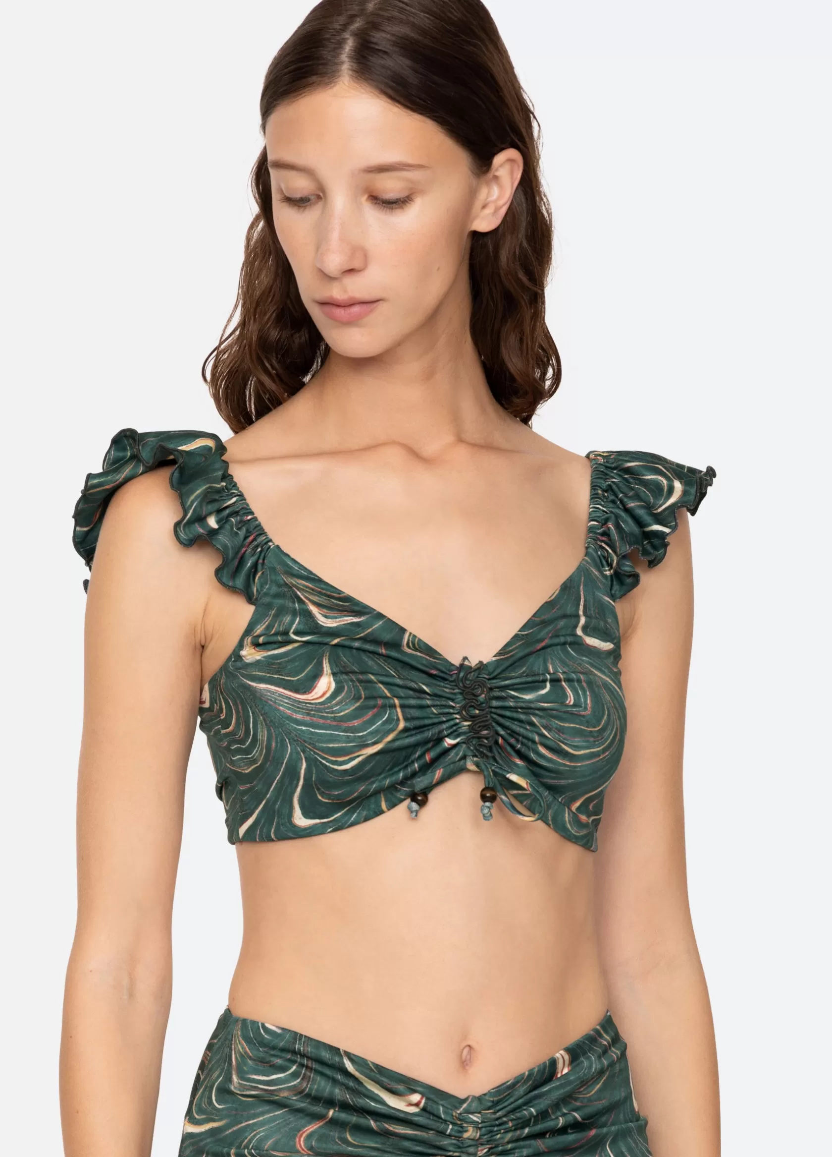 The Amara marble print bikini top features flutter sleeves and ruched detailing.