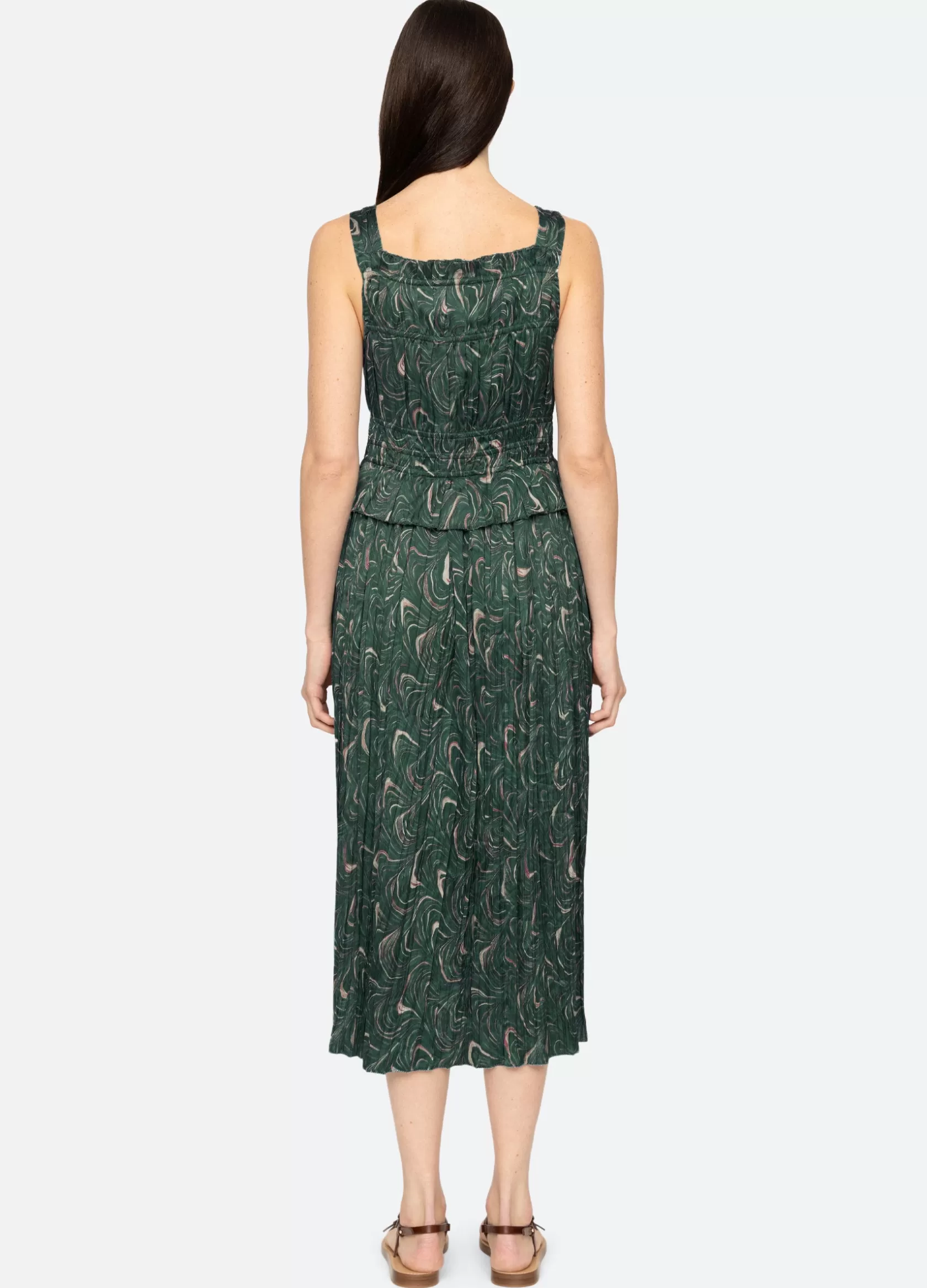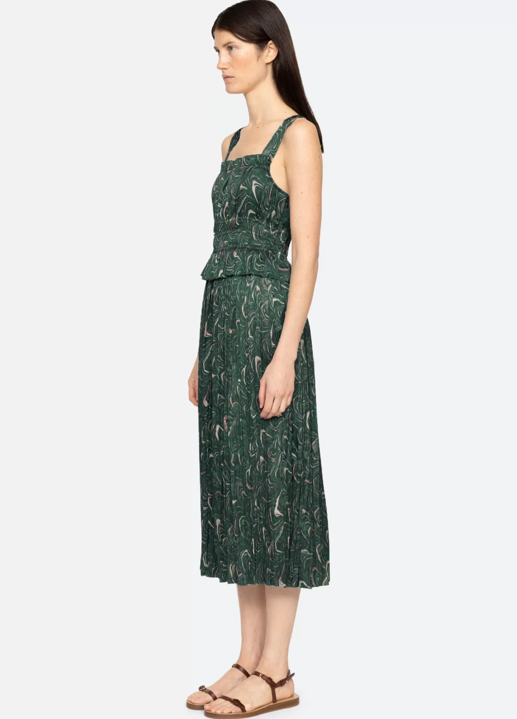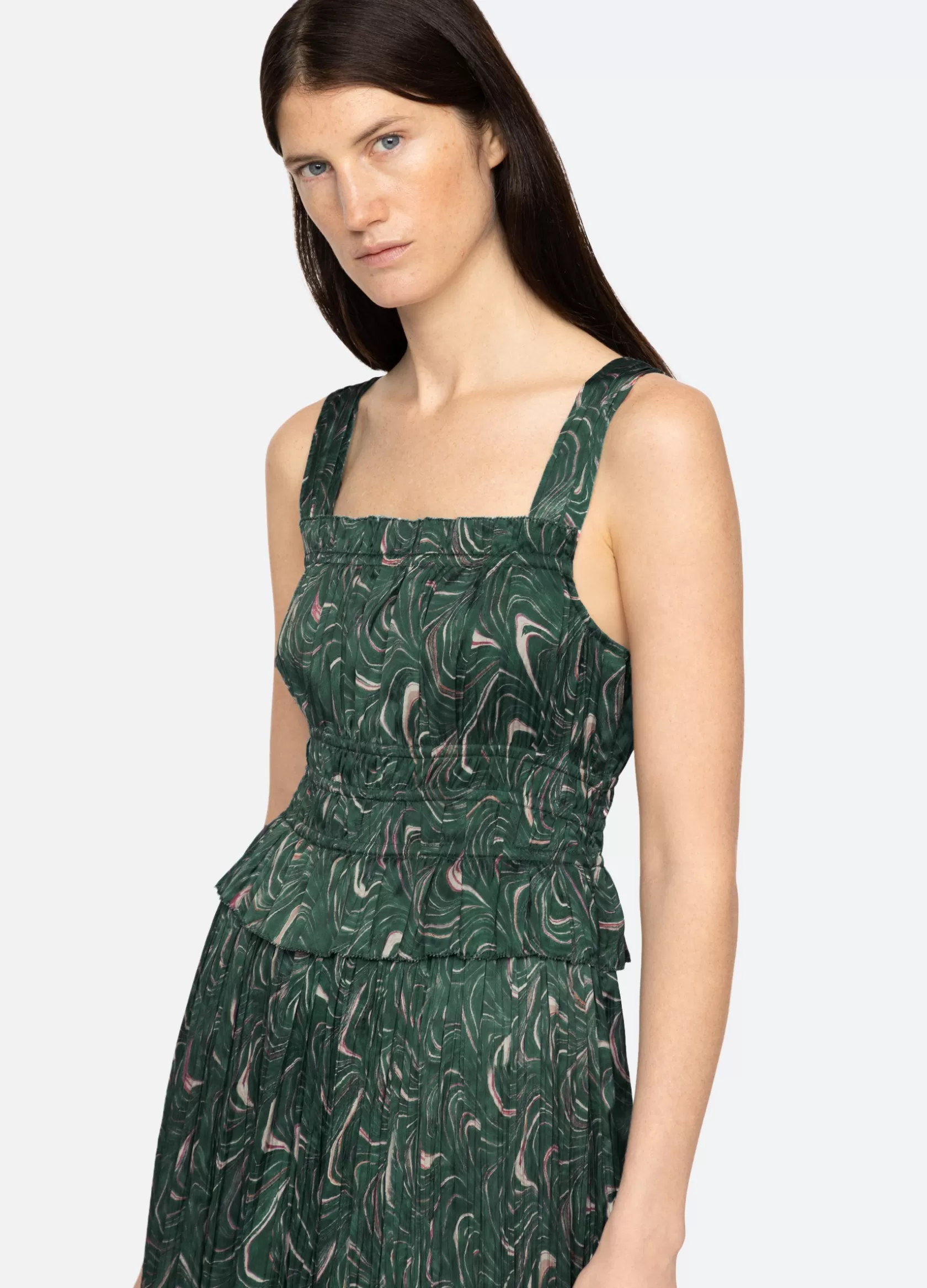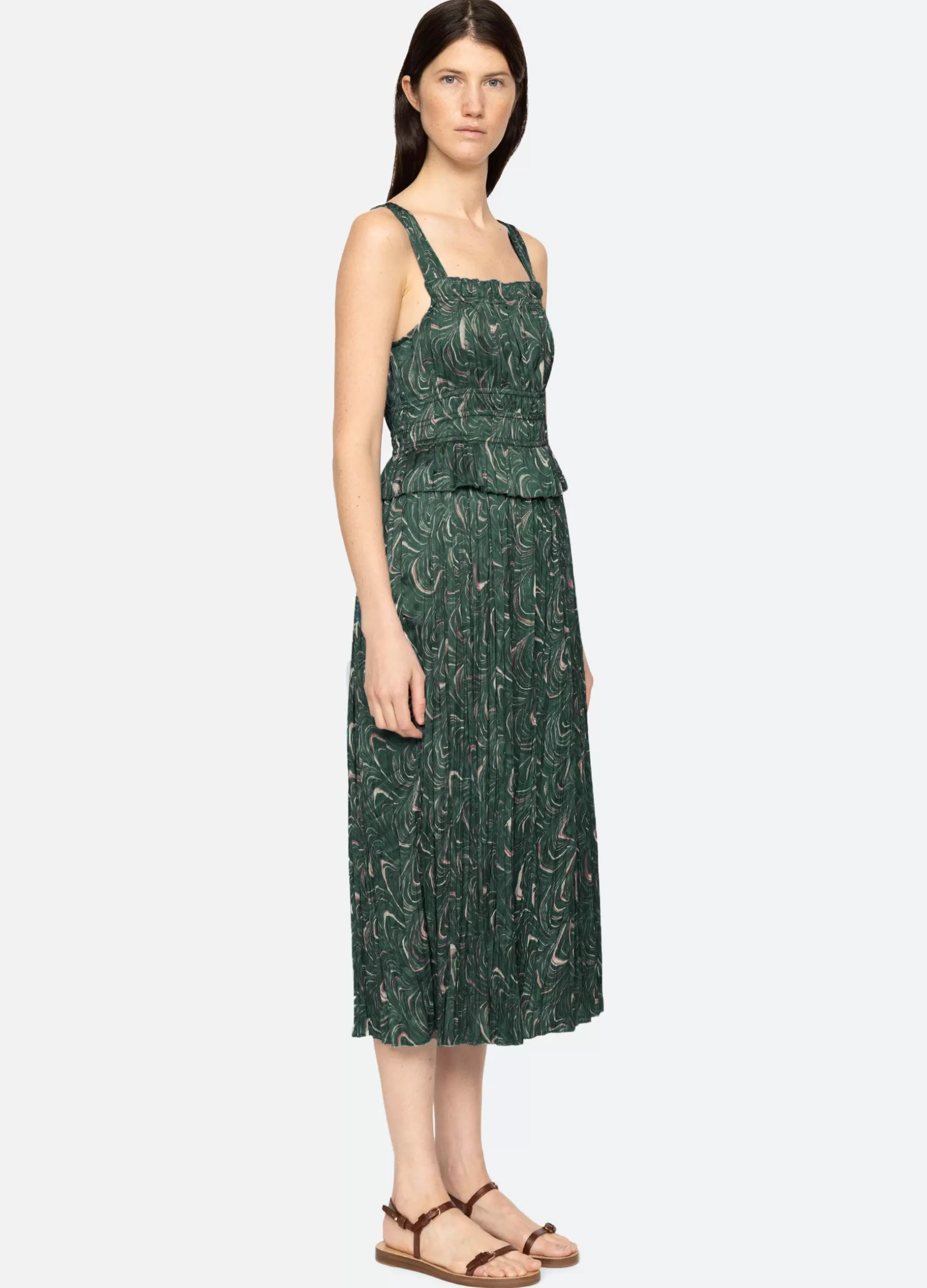 The Amara marble print ruched dress features a ruched bodice and a midi silhouette.