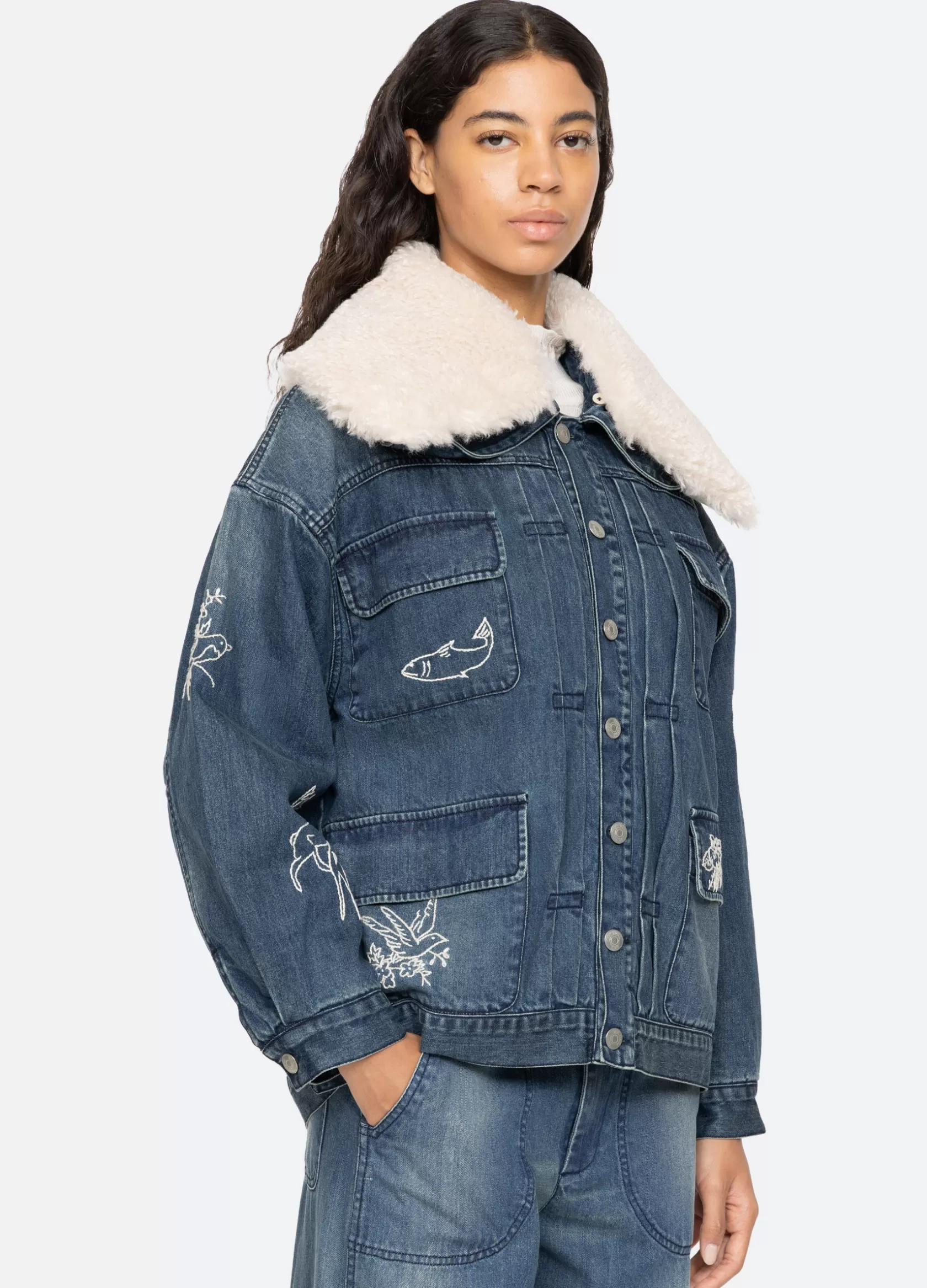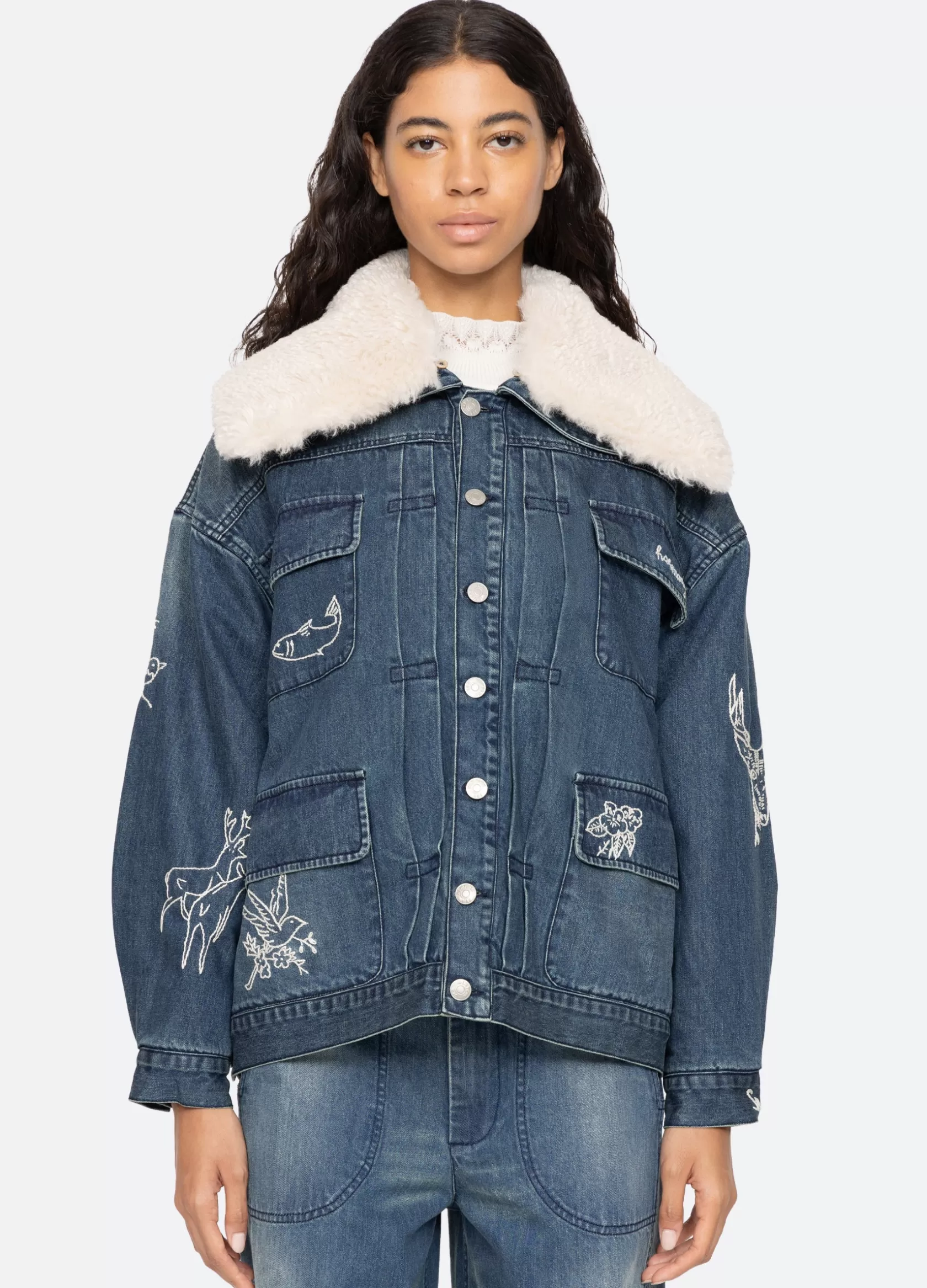 The Amari embroidered denim jacket features a faux shearling collar, extended shoulder silhouette, voluminous long sleeves and embroidered detailing throughout. Designed for an easy, relaxed fit.