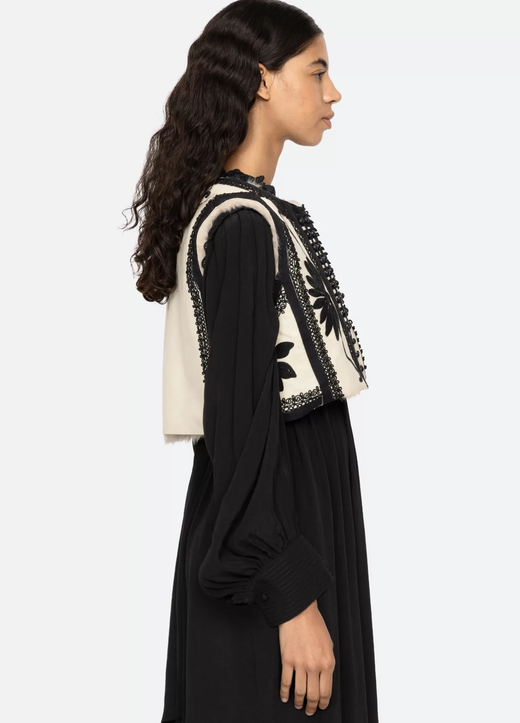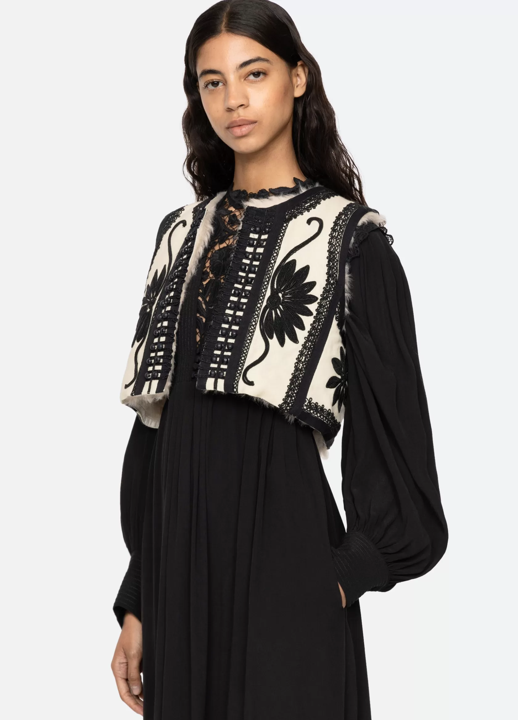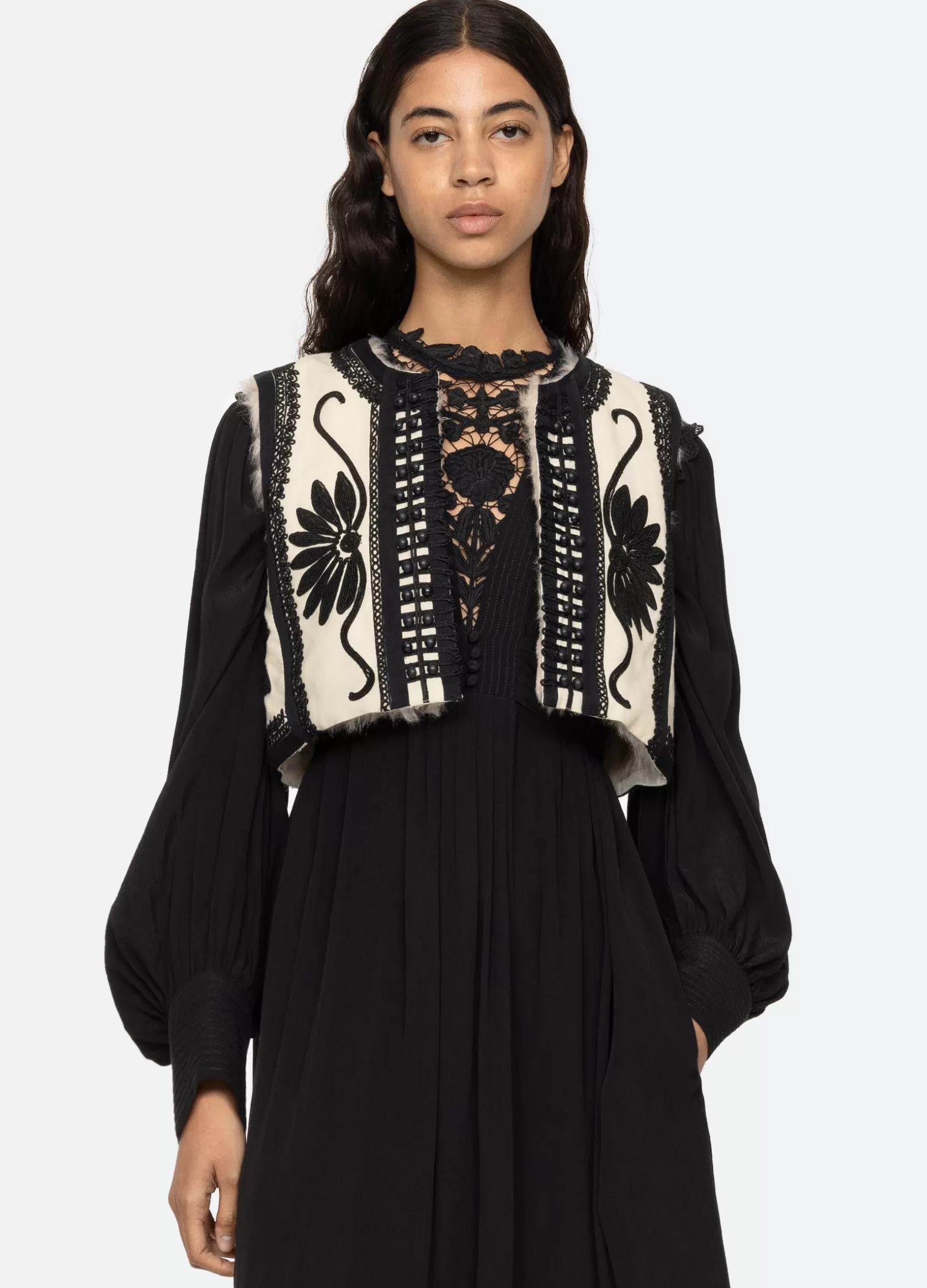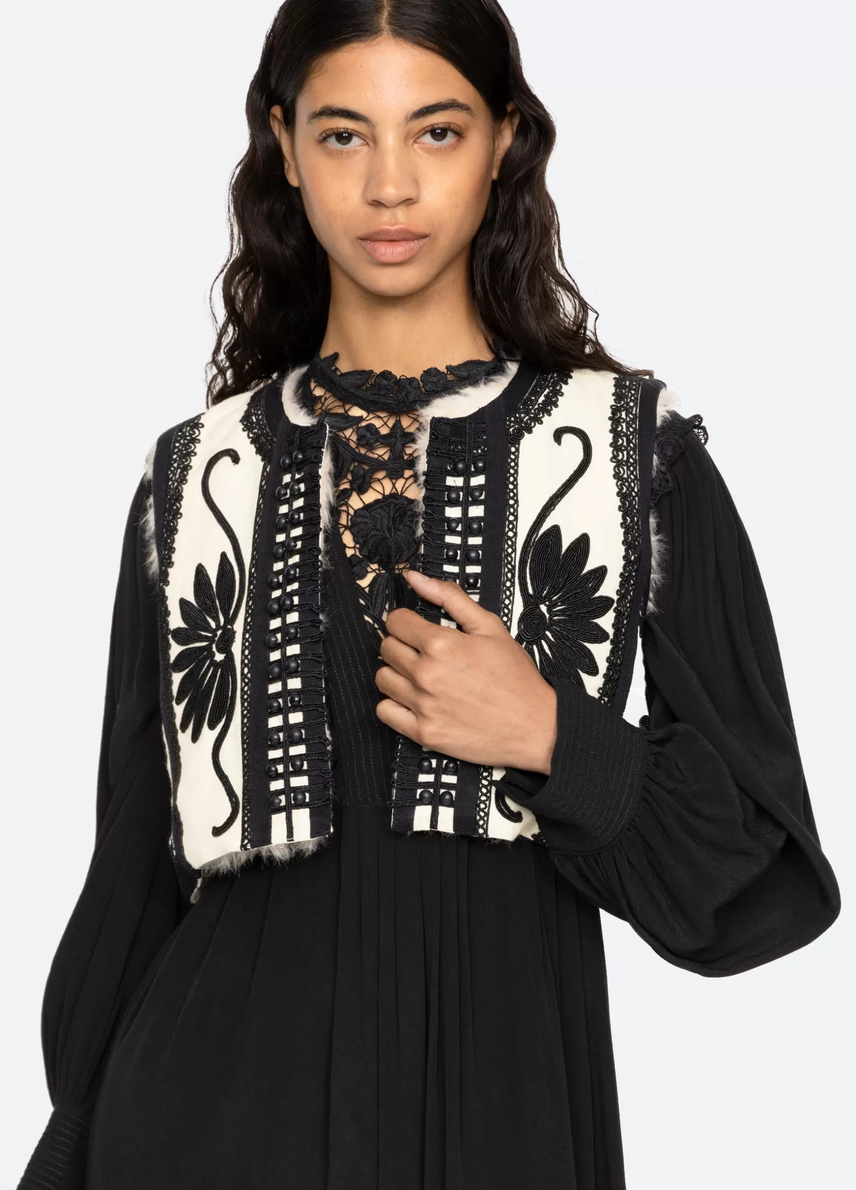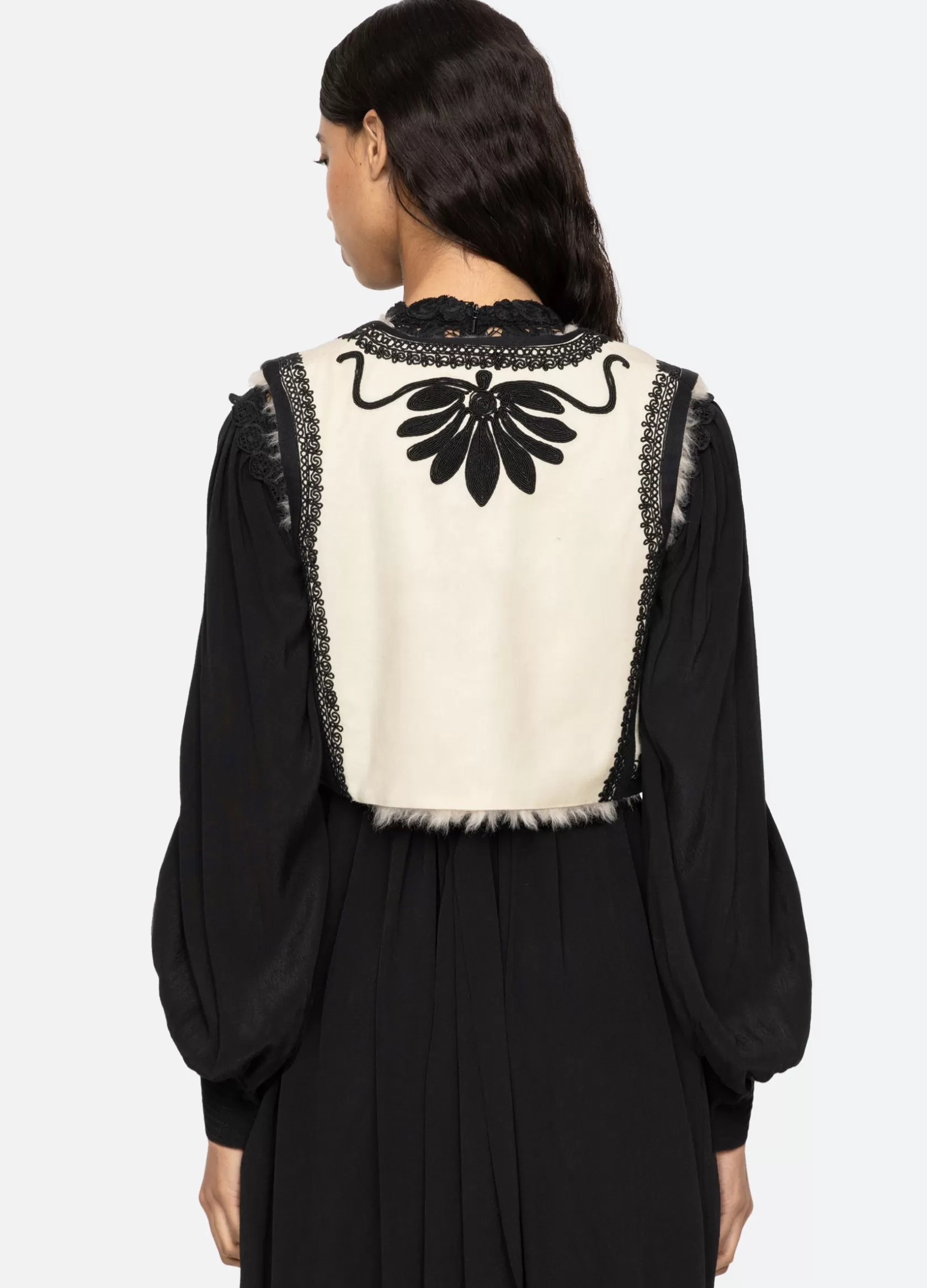 The Ambrose soutache vest features detailed embroidery throughout, cropped silhouette, and faux fur lining.