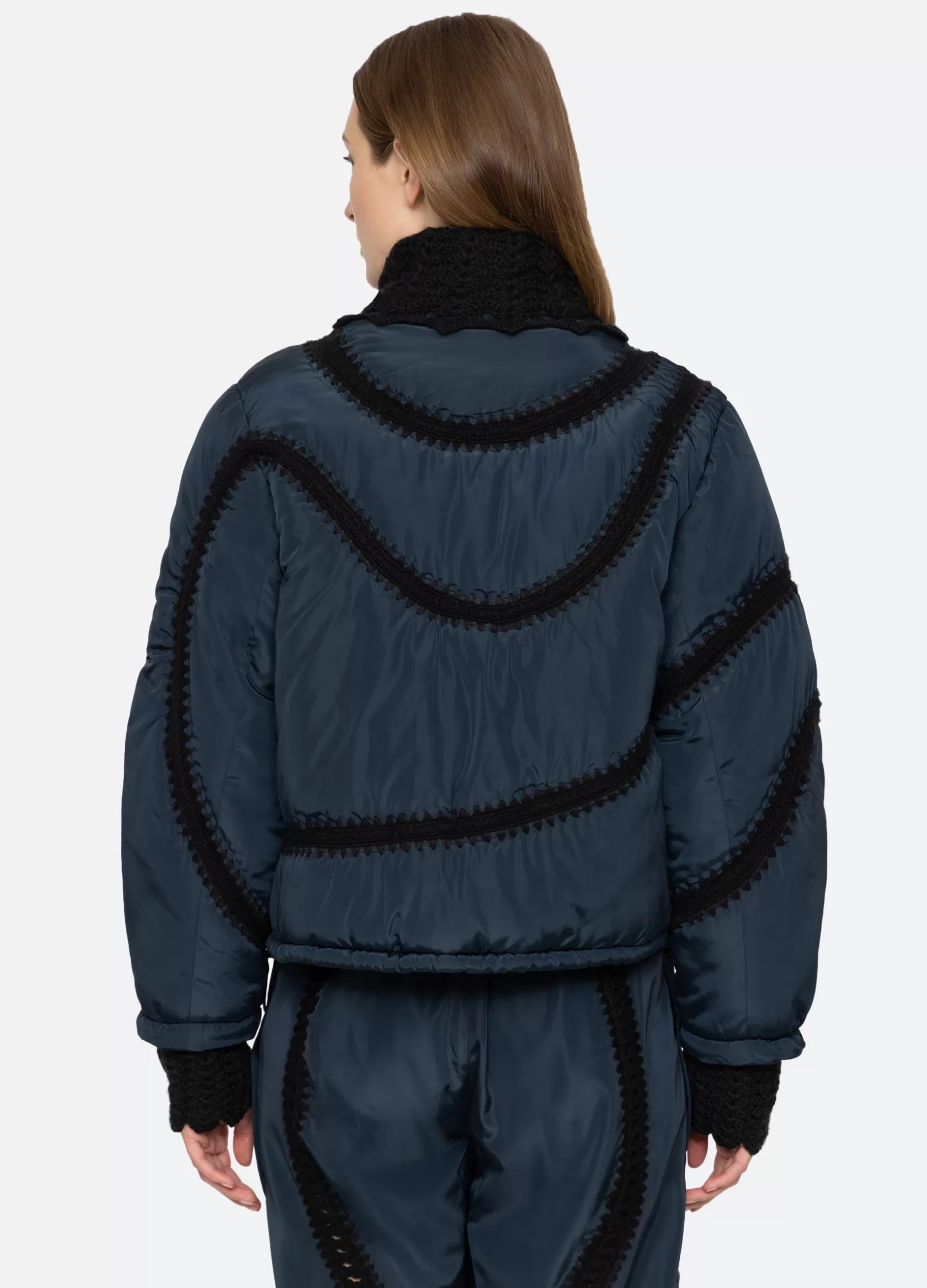 The Averie windbreaker puffer jacket features a high neckline and crochet detailing throughout.