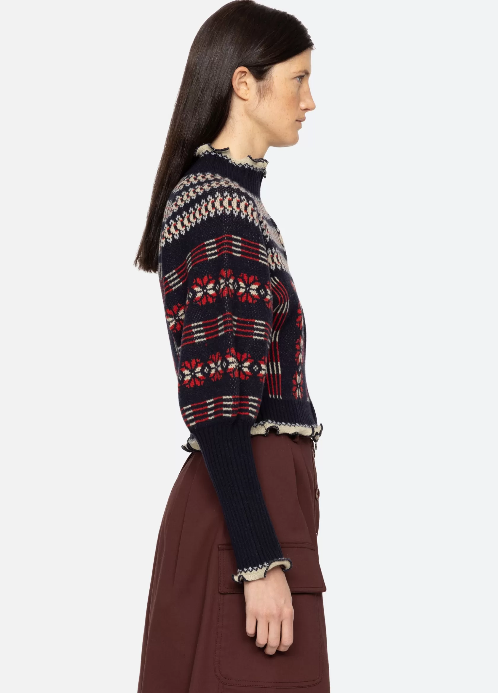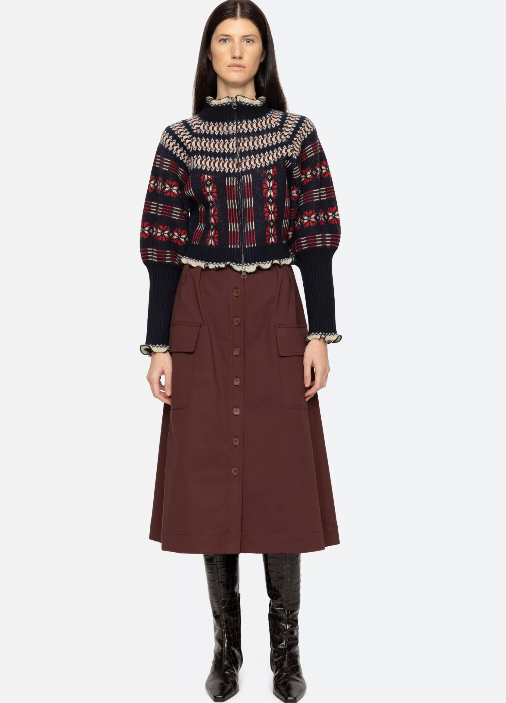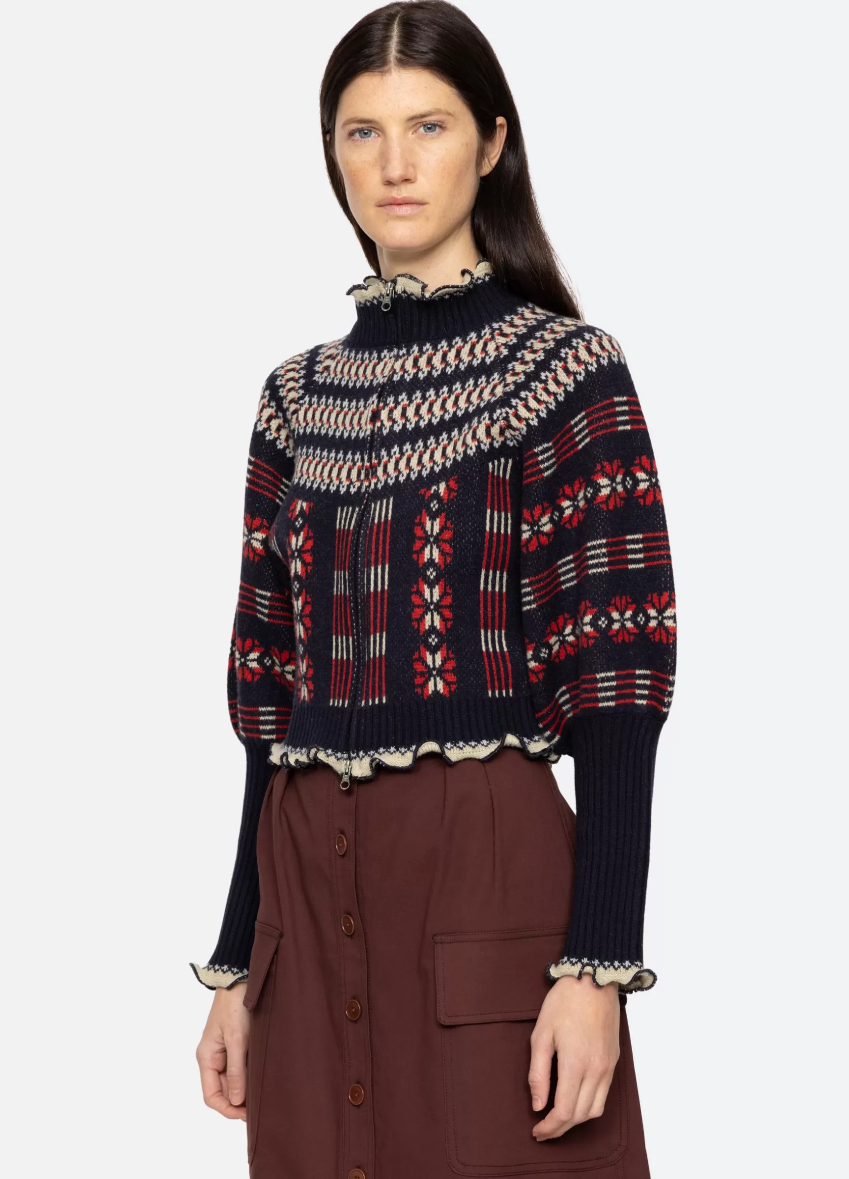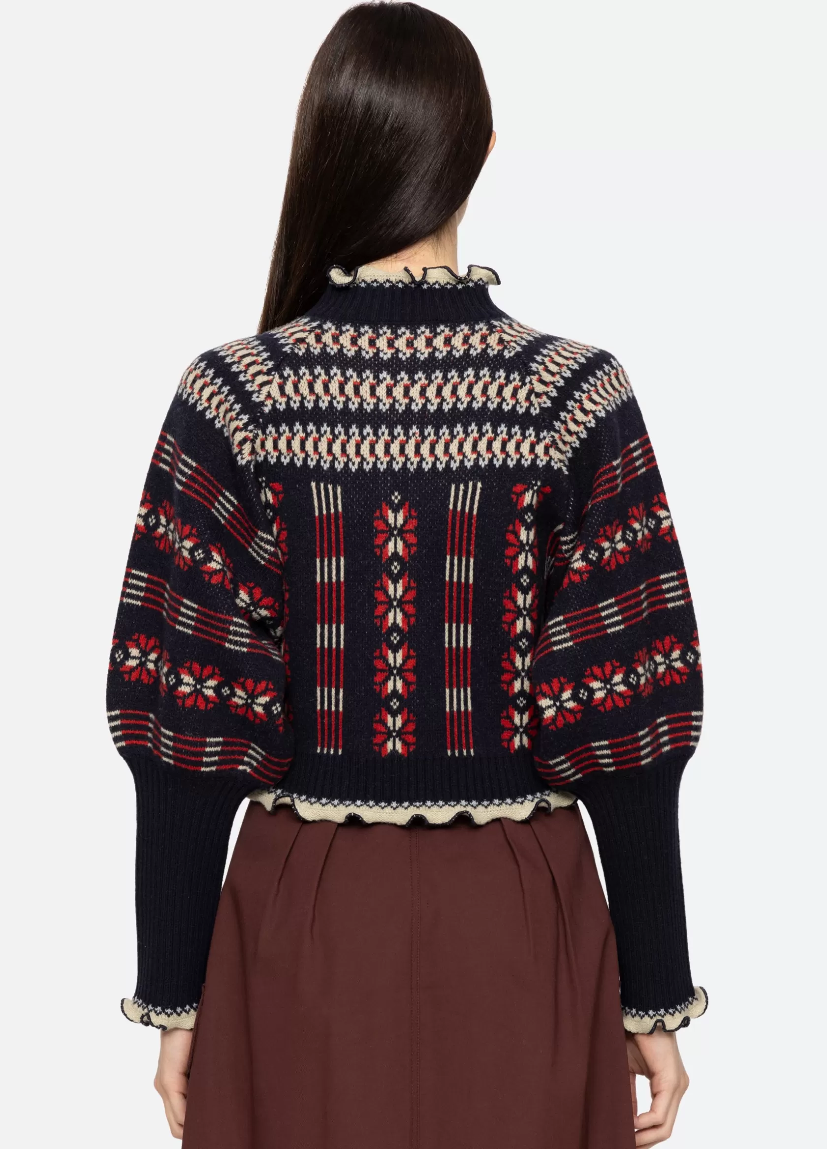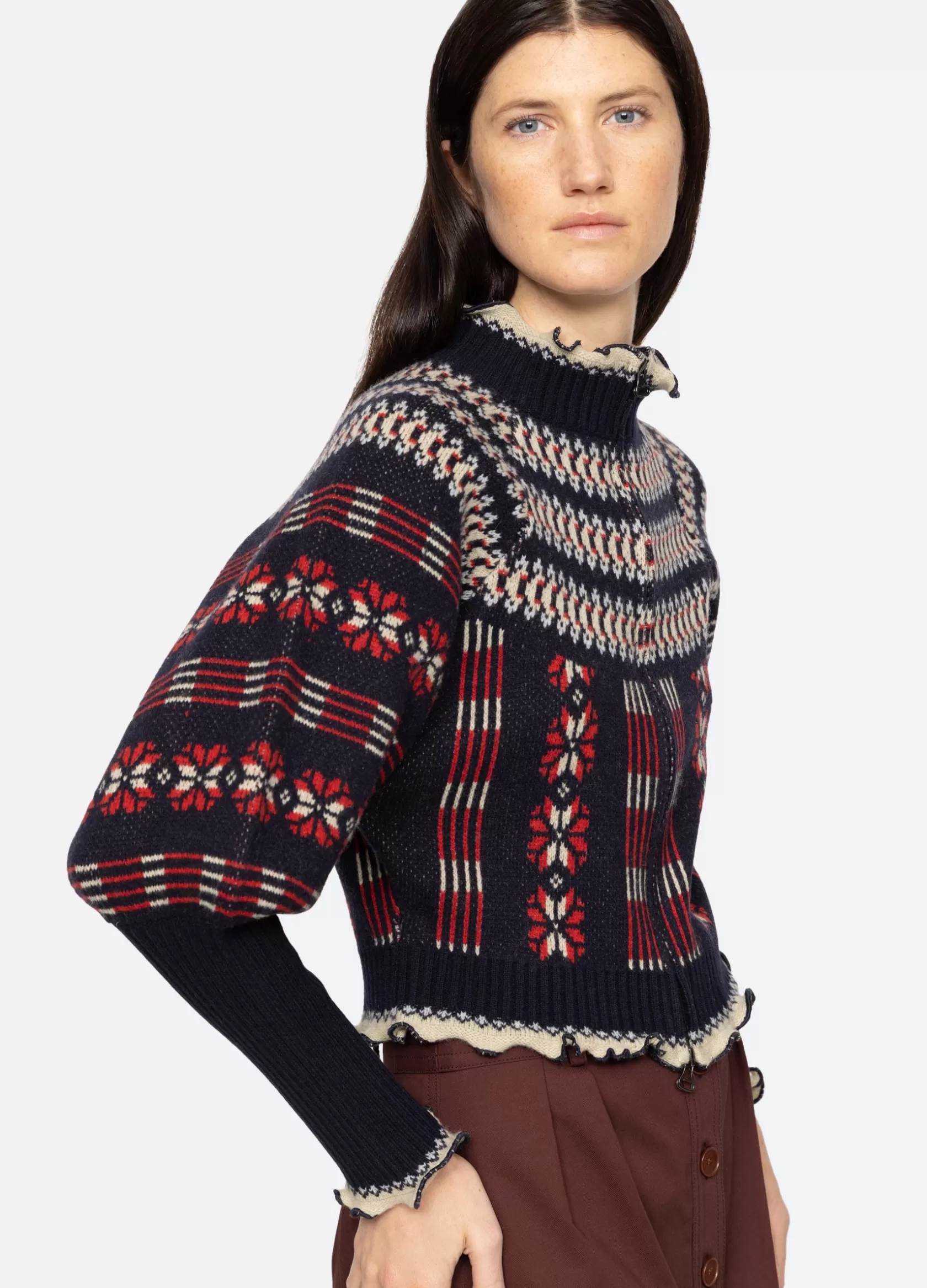 The Ayla fair isle knit cardigan features long puff sleeves, exposed front zipper and ruffle detailing. Designed for an easy, relaxed fit.