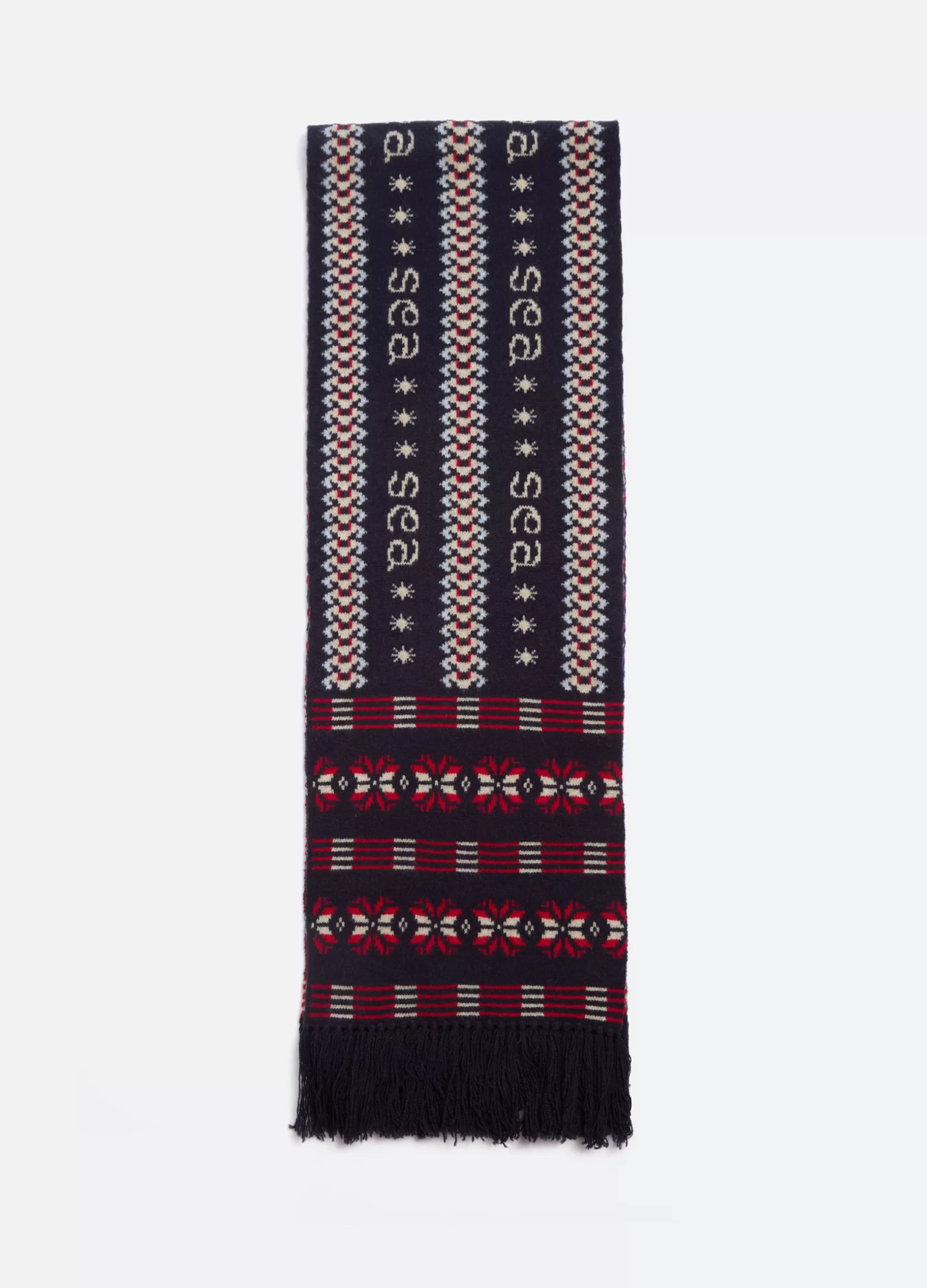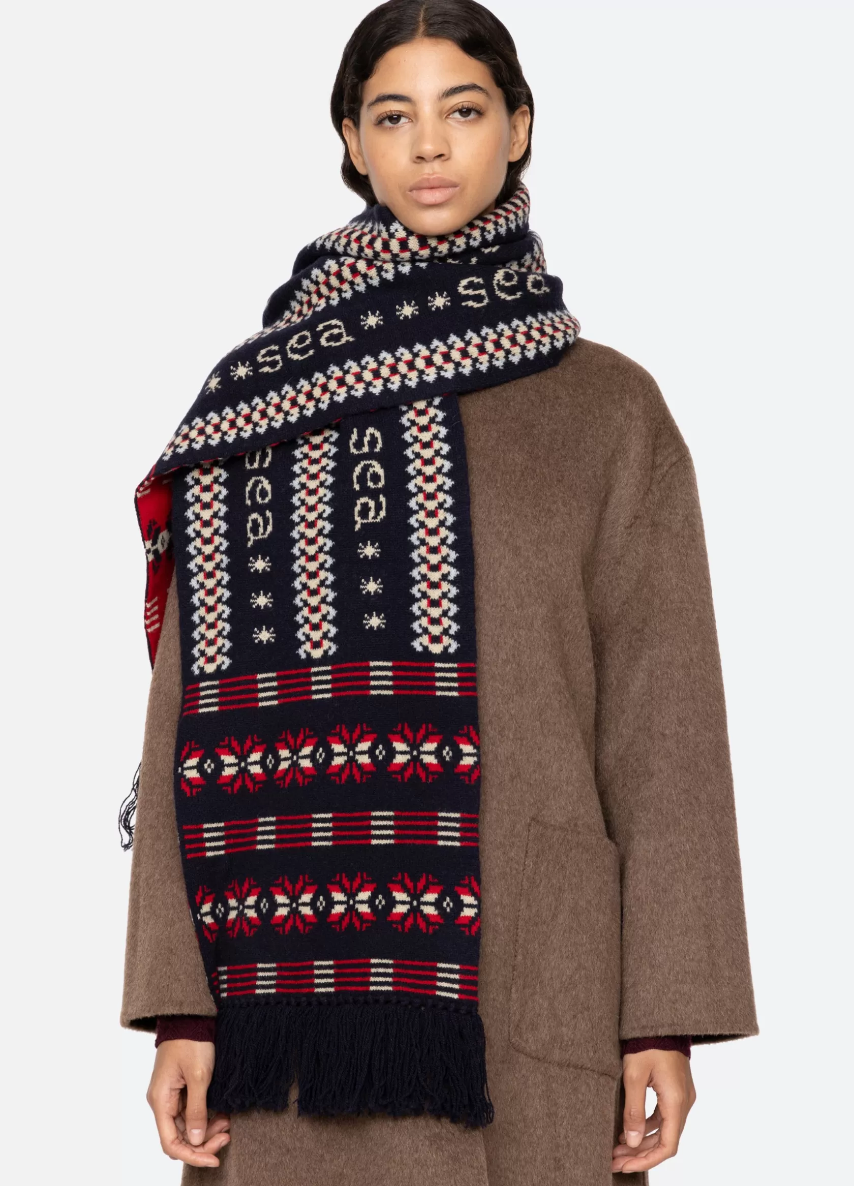 An online and in store exclusive. The Ayla scarf features a fair isle knit, fringe edges and ‘Sea’ logo.