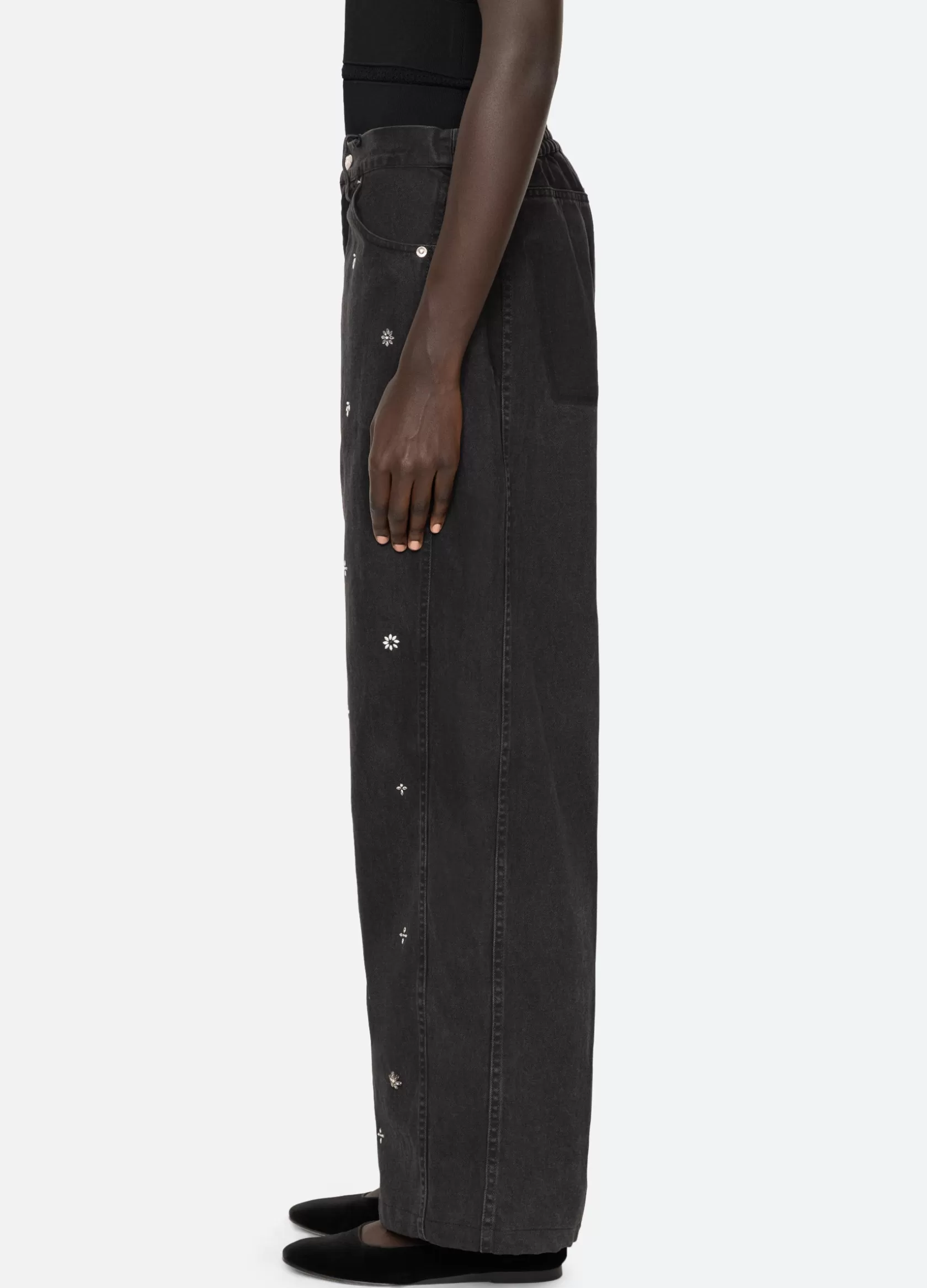 The Bala jeans are embellished with rhinestone accents throughout. Designed for an oversized, relaxed fit.