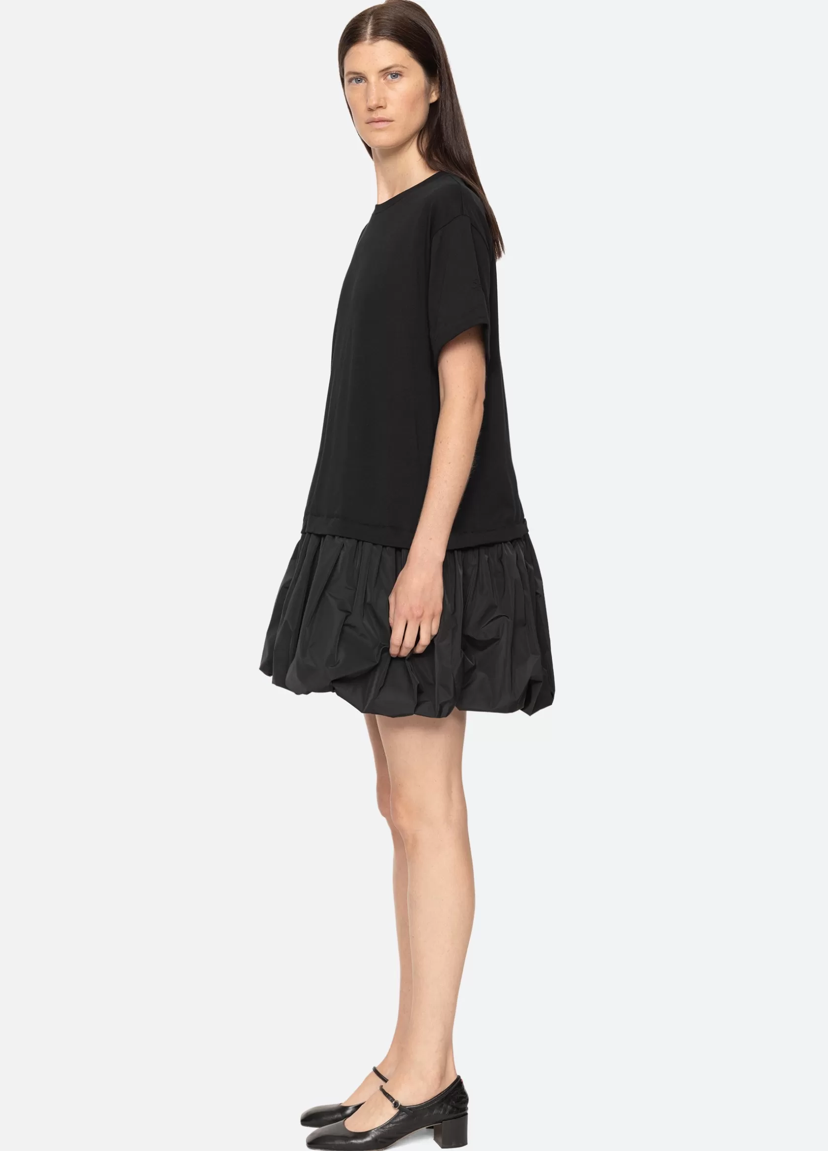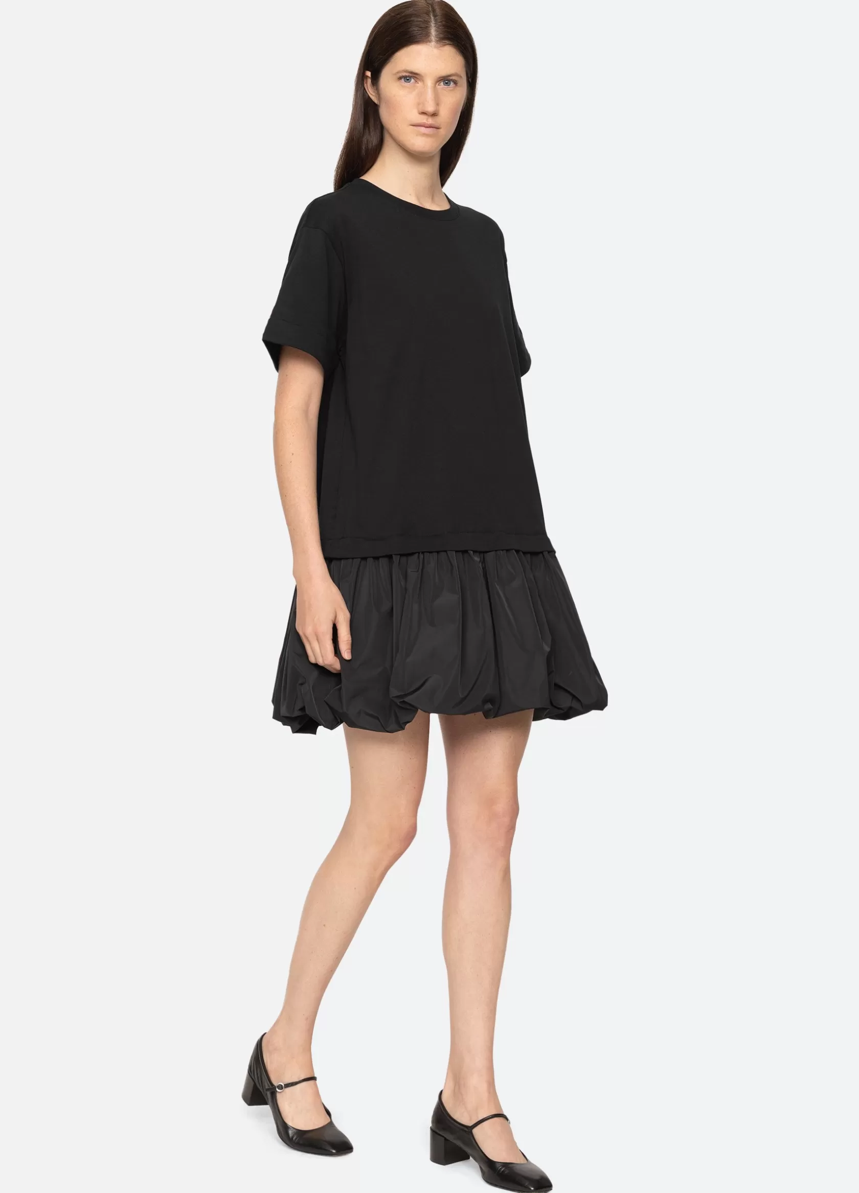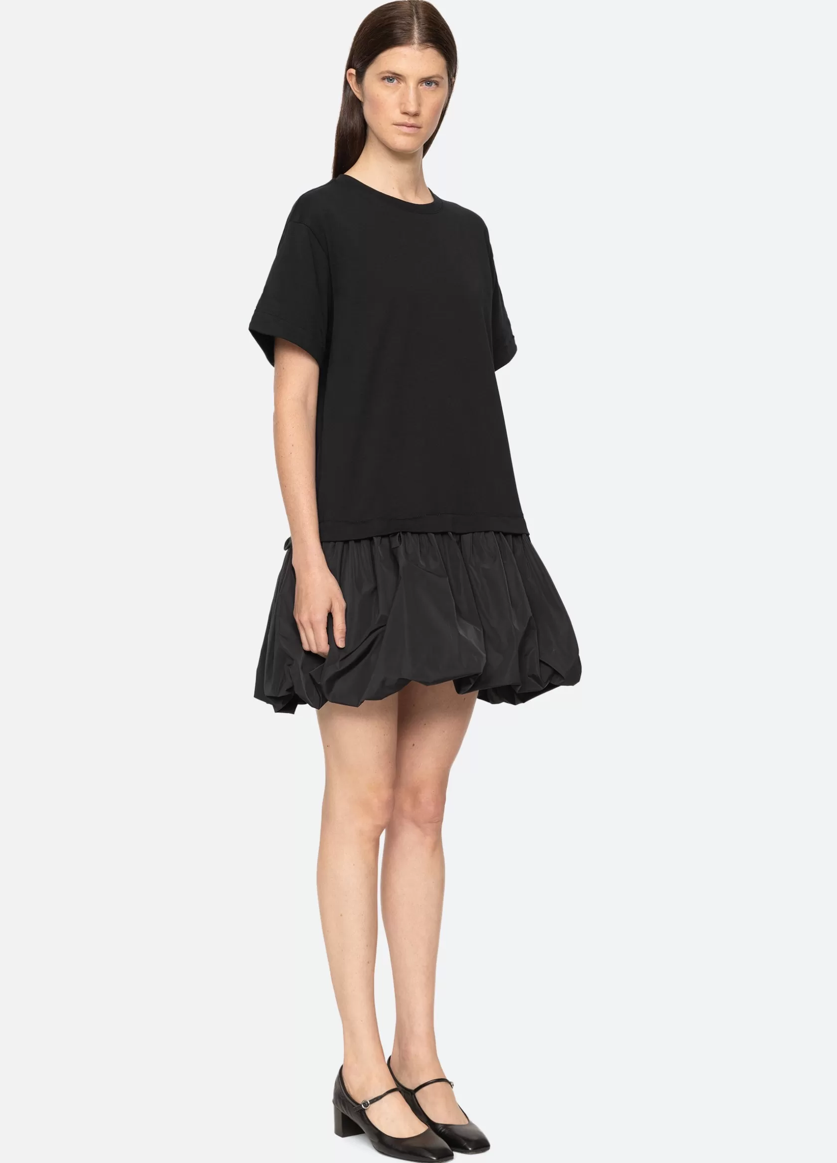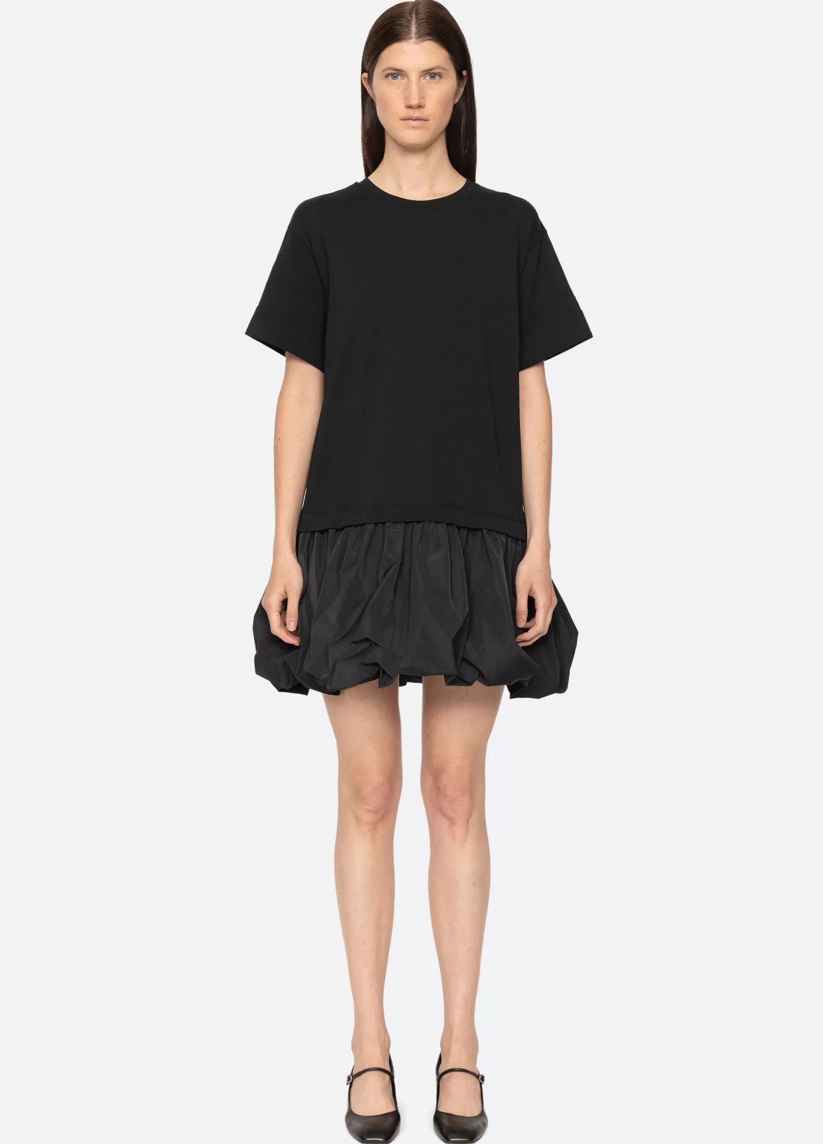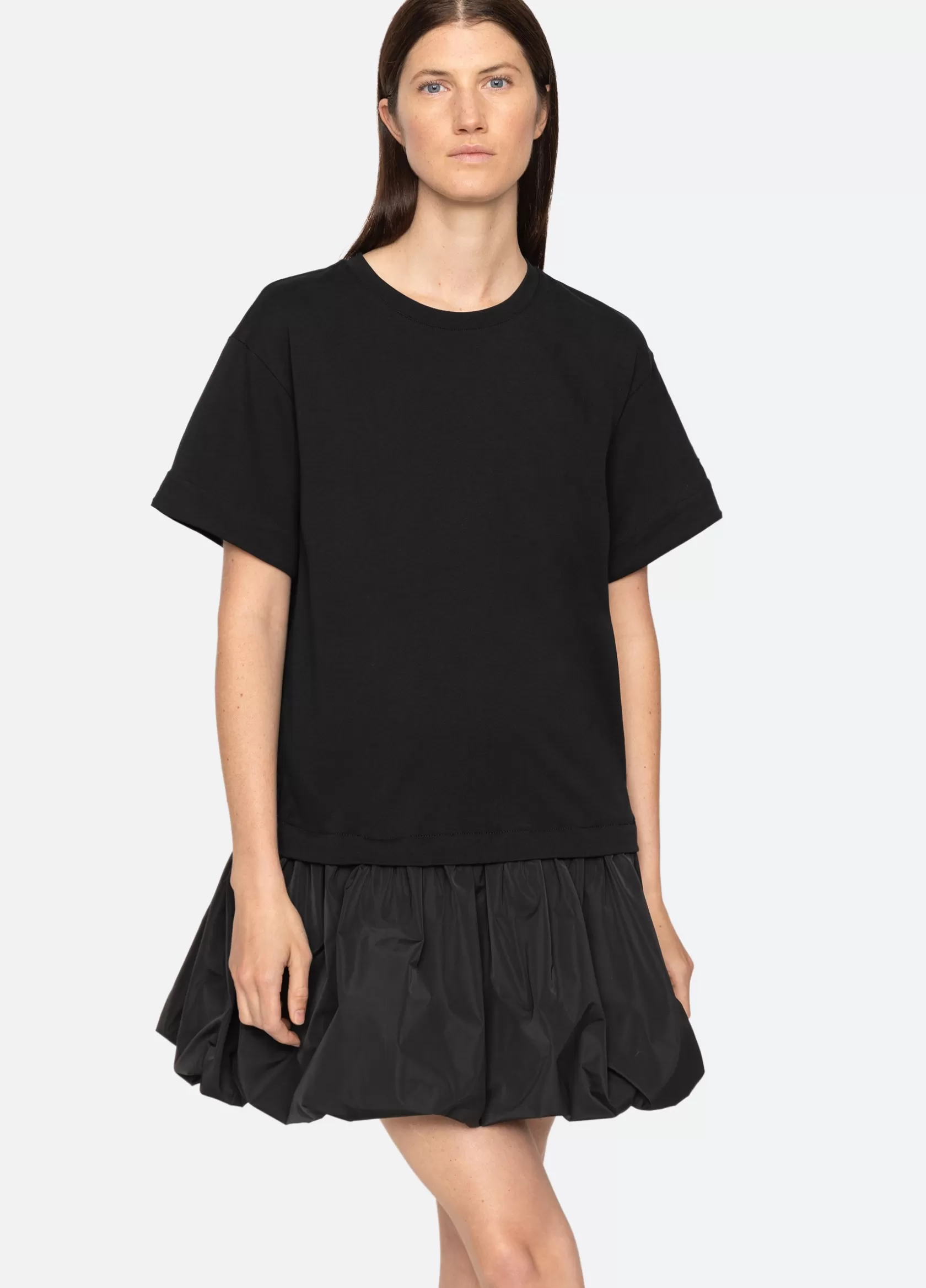 The Belen taffeta t-shirt dress features a combo black t-shirt top attached to a voluminous taffeta bubble skirt.