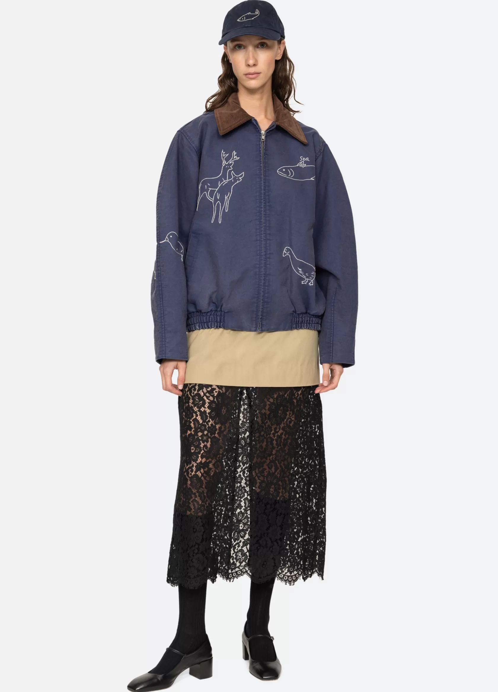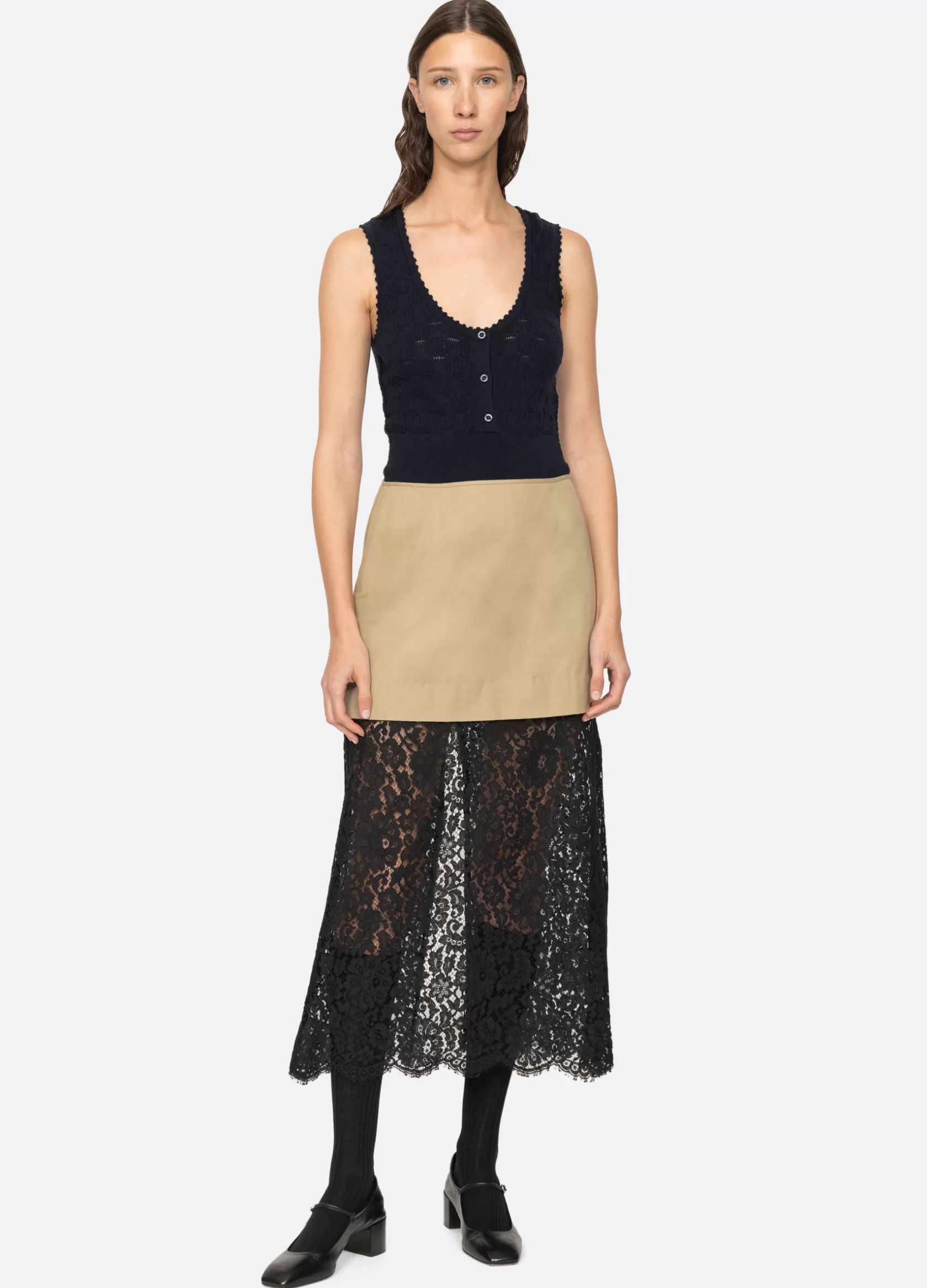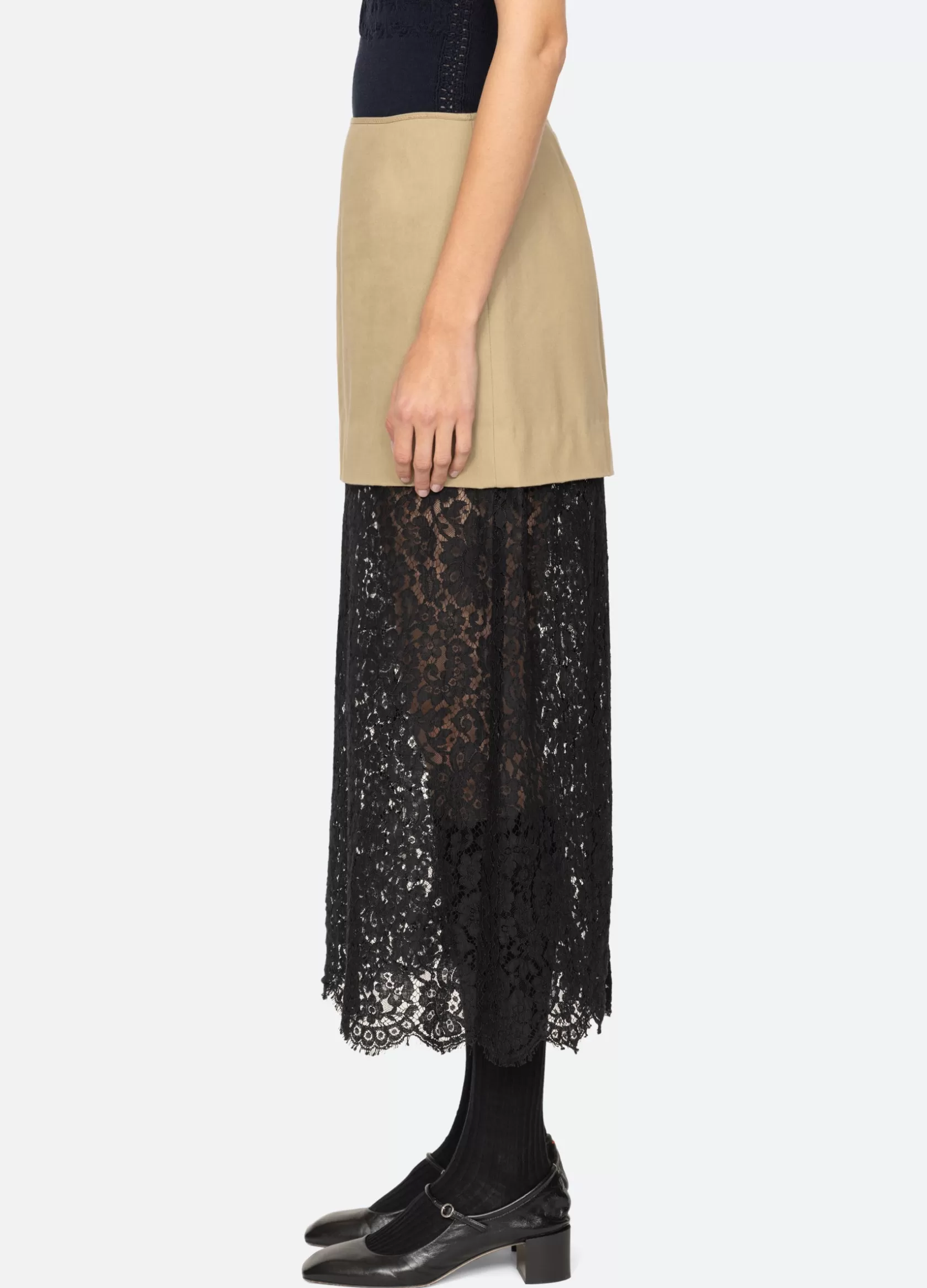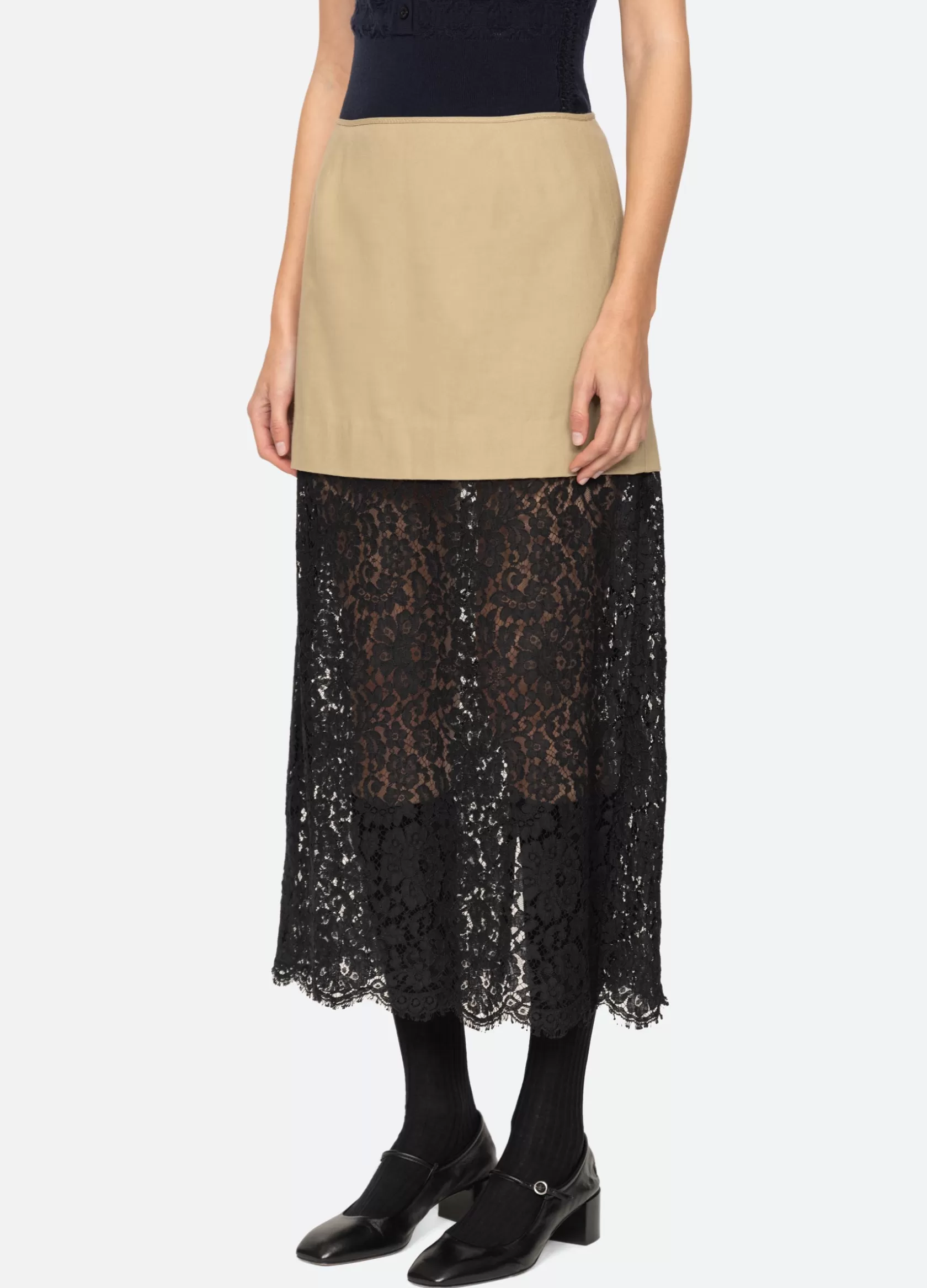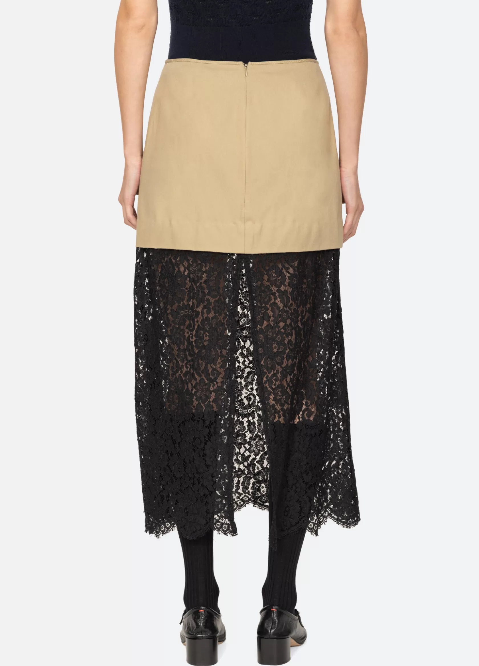 The Belle stone washed chino combo skirt features a cotton mini skirt paired with sheer lace detailing.