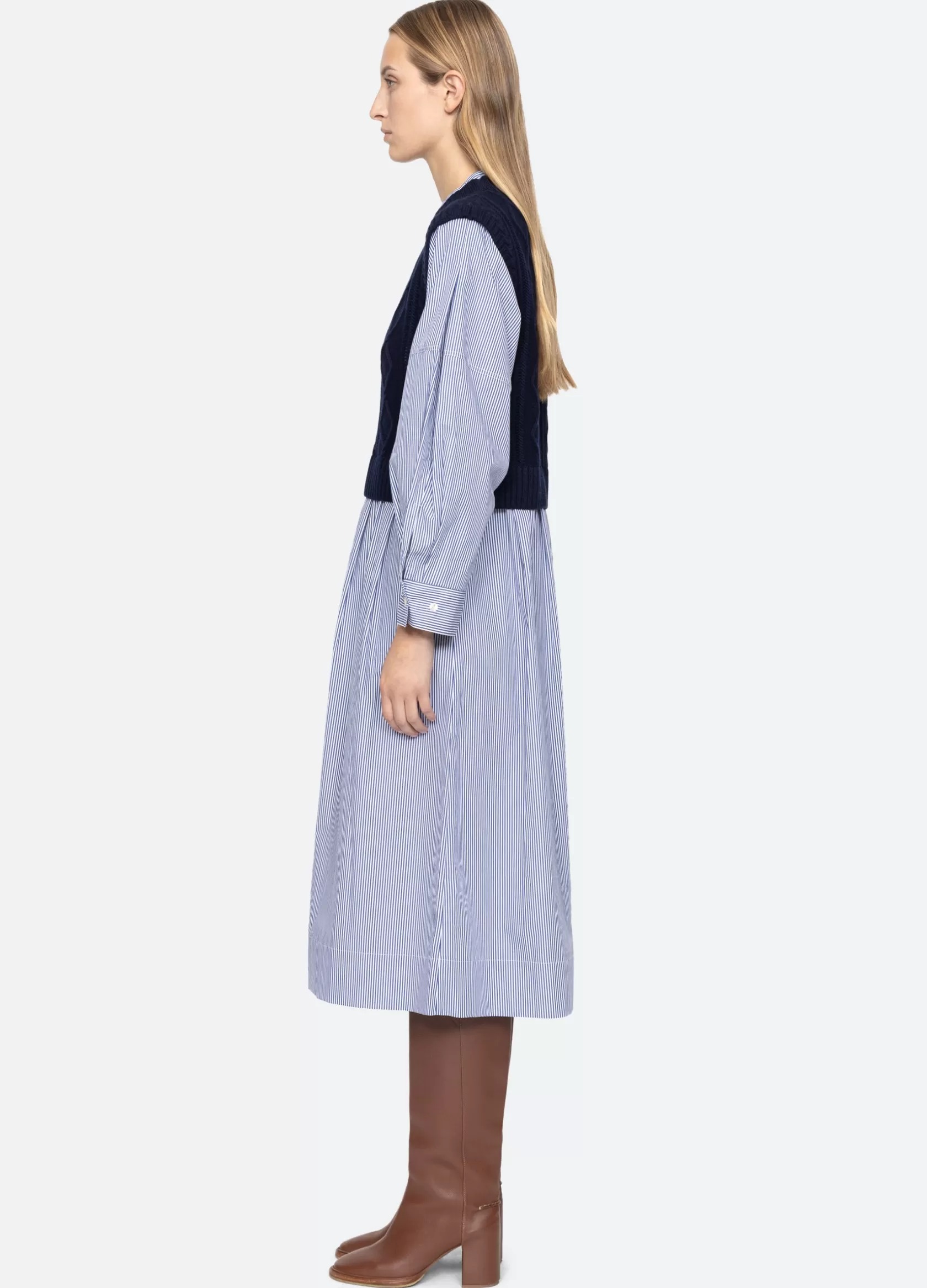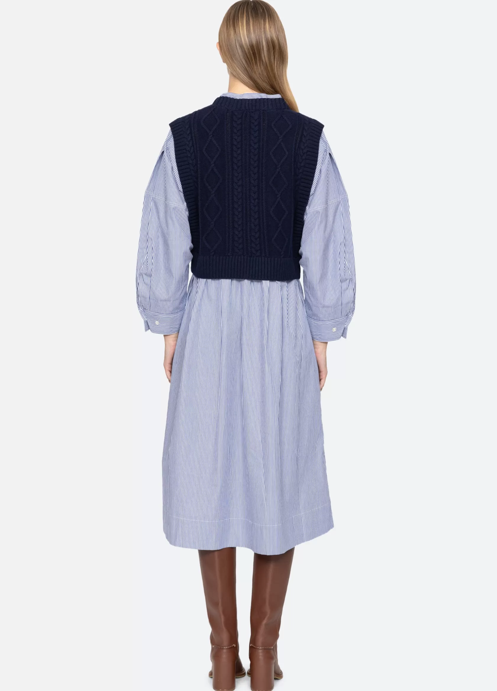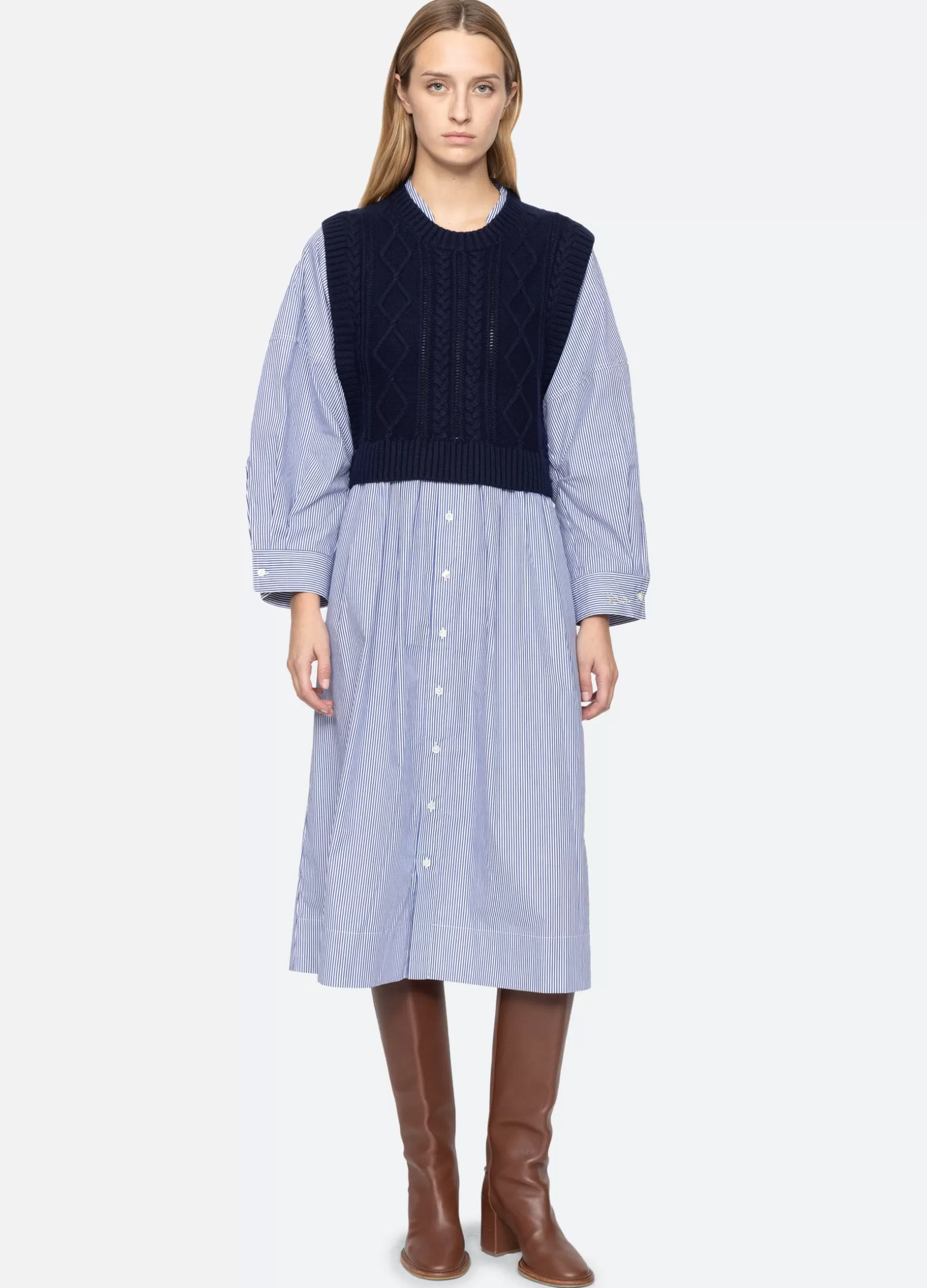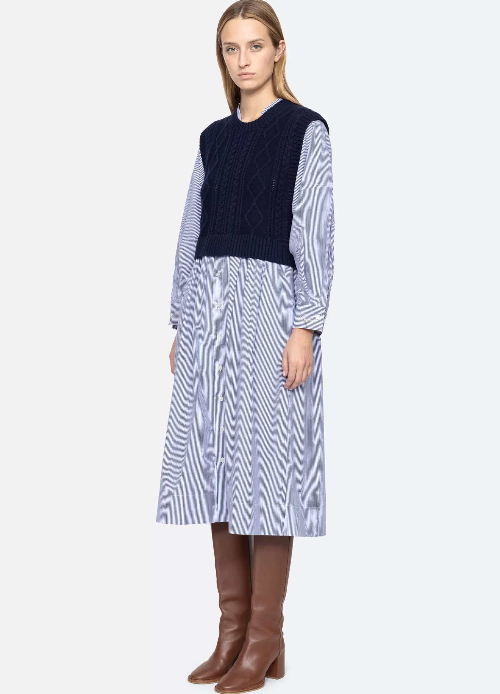 The Caleb sweater dress features a cable knit vest layered over a striped button down shirt dress. Designed for an easy, relaxed fit.