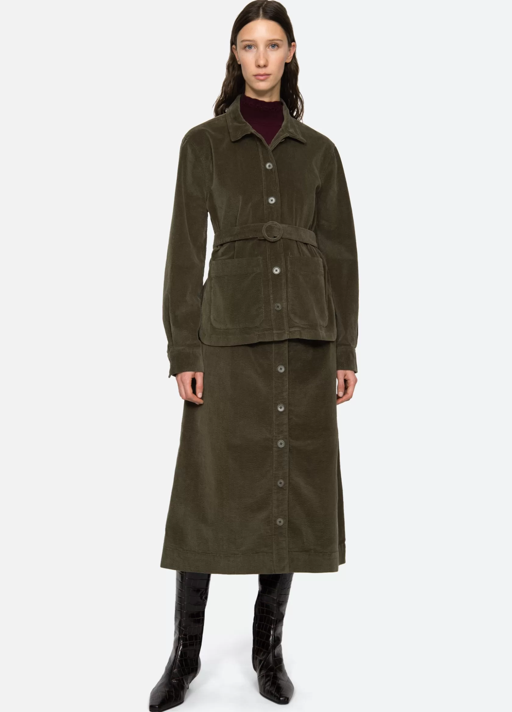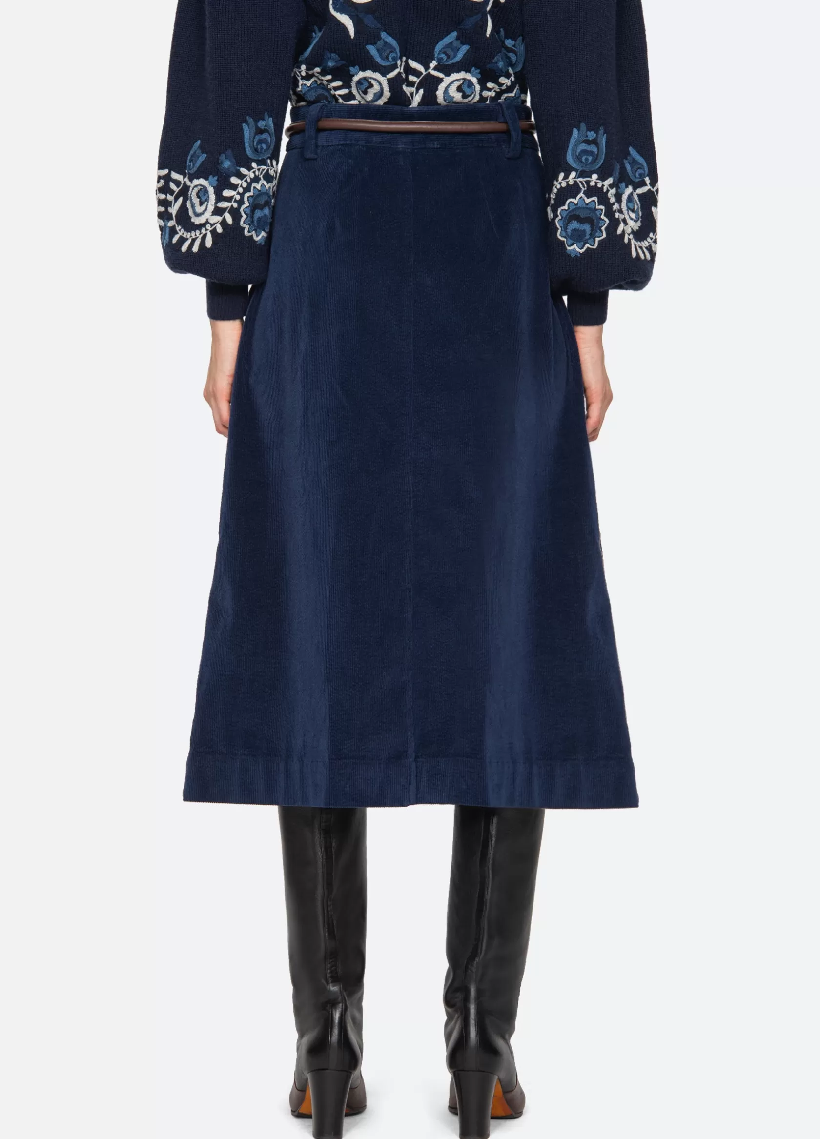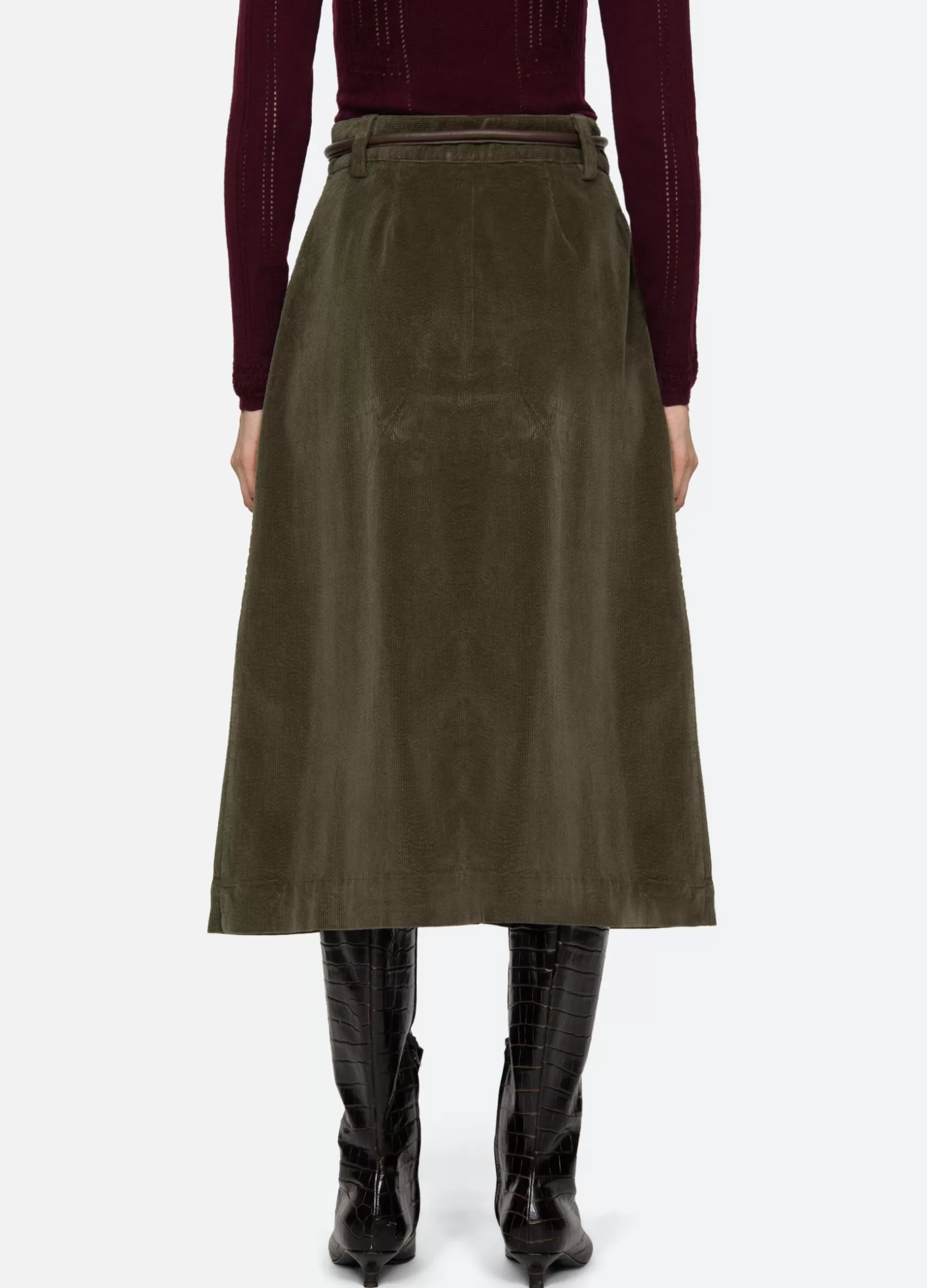 The Carine corduroy skirt features a high waisted and A-line silhouette and a removable belt.