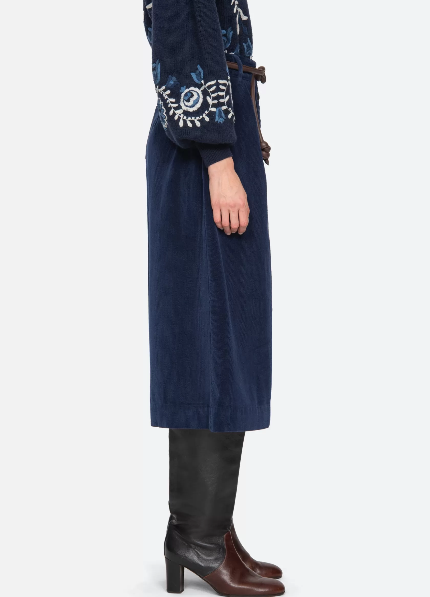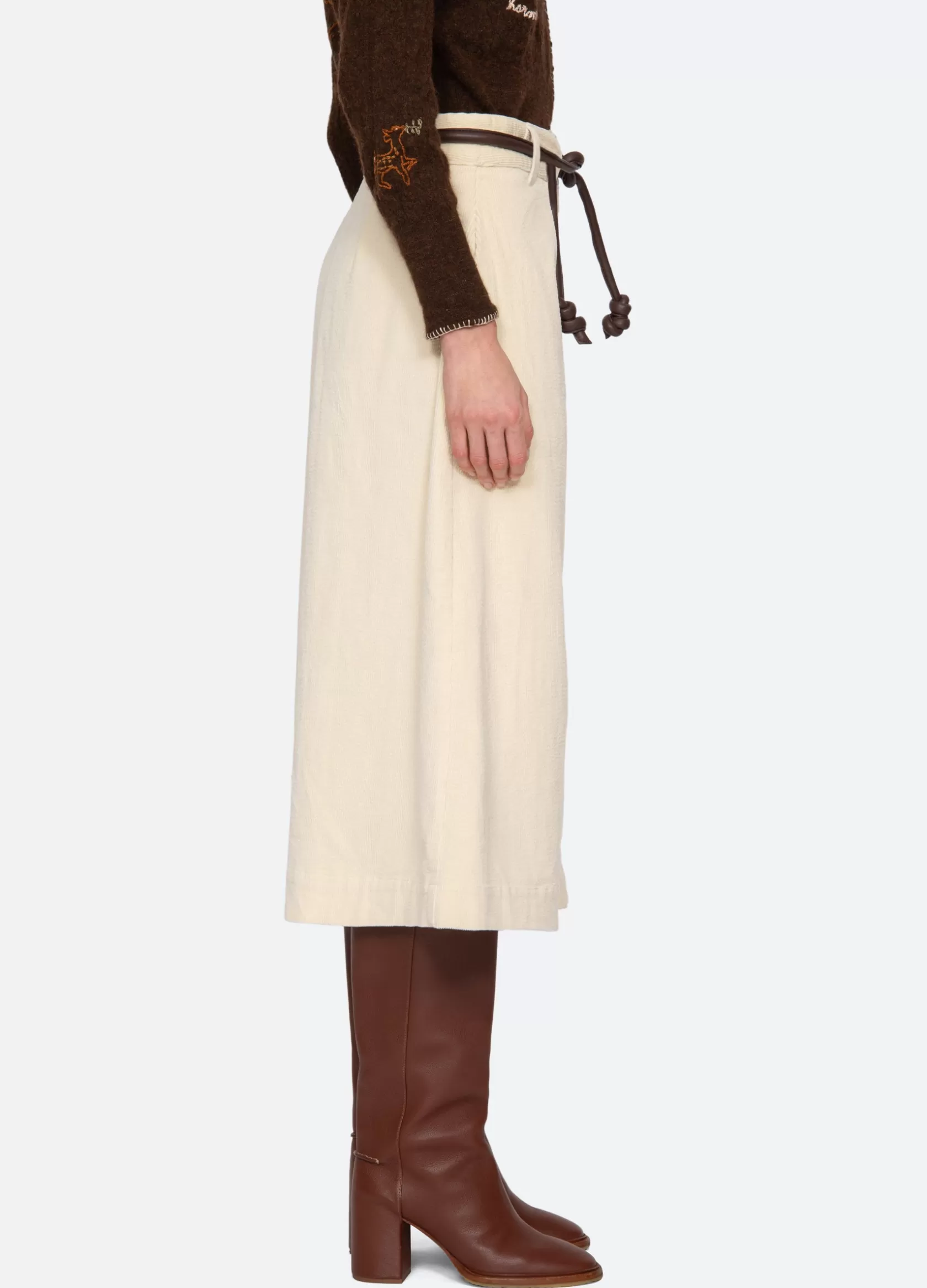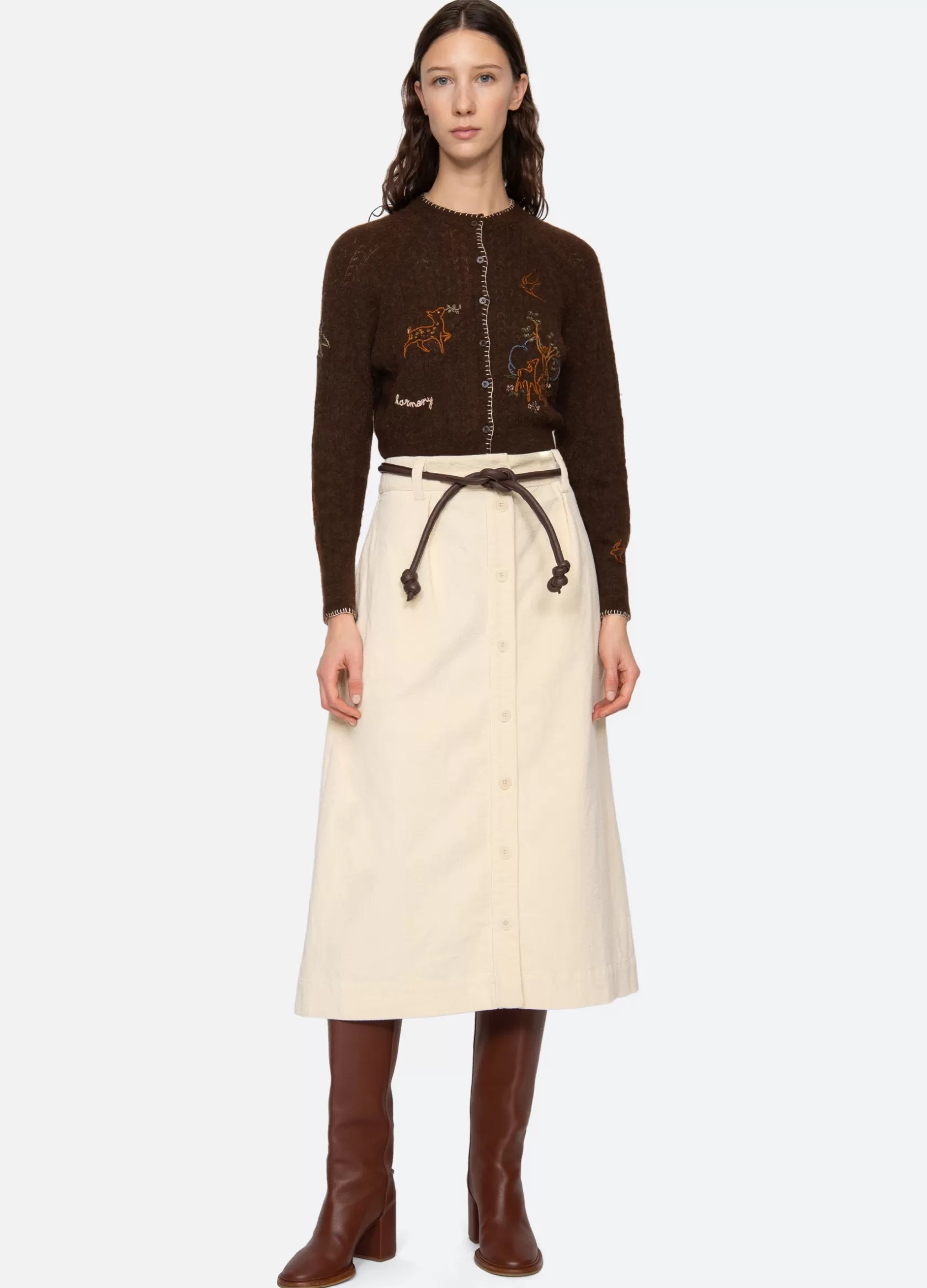 The Carine corduroy skirt features a high waisted and A-line silhouette and a removable belt.