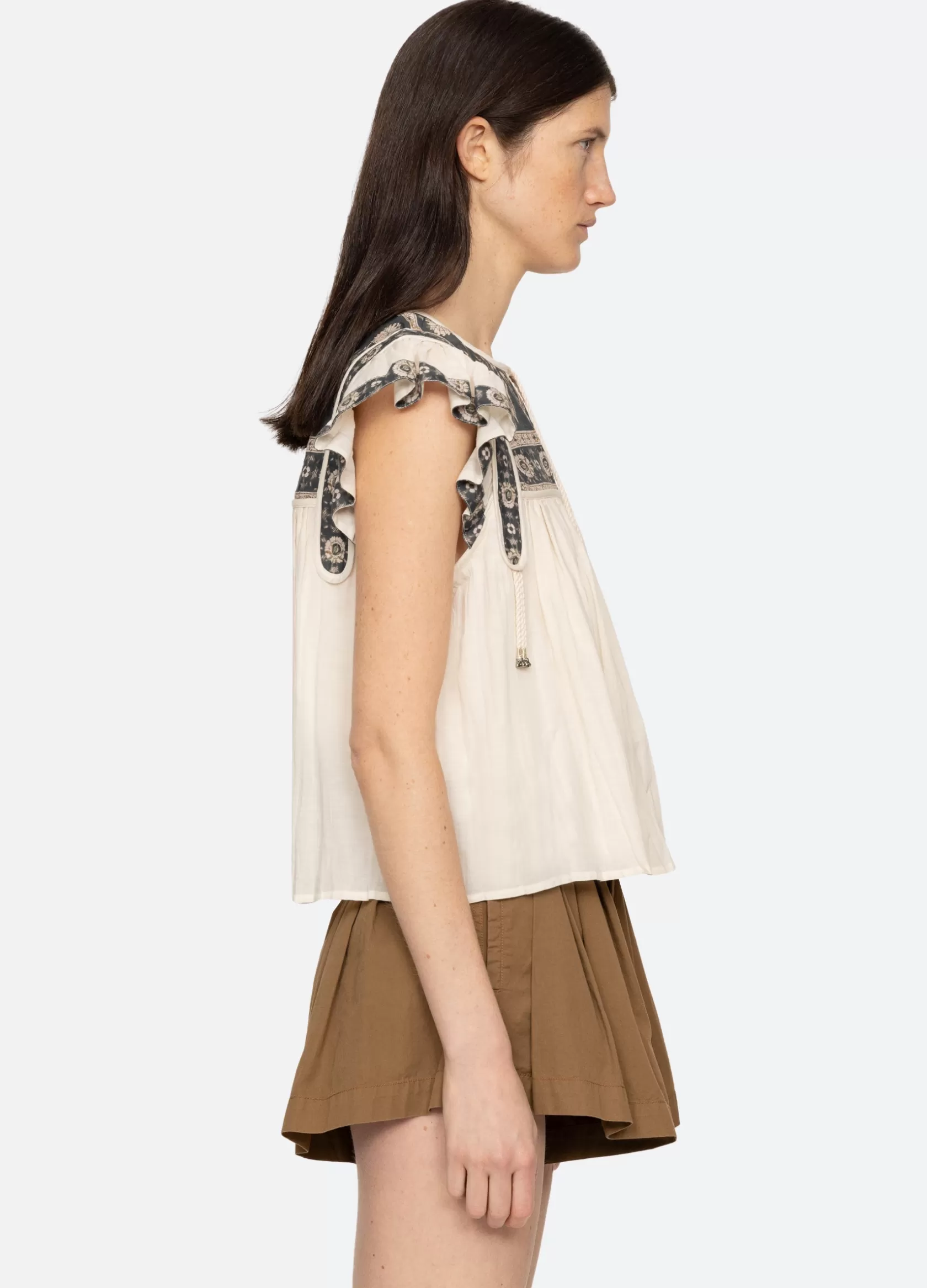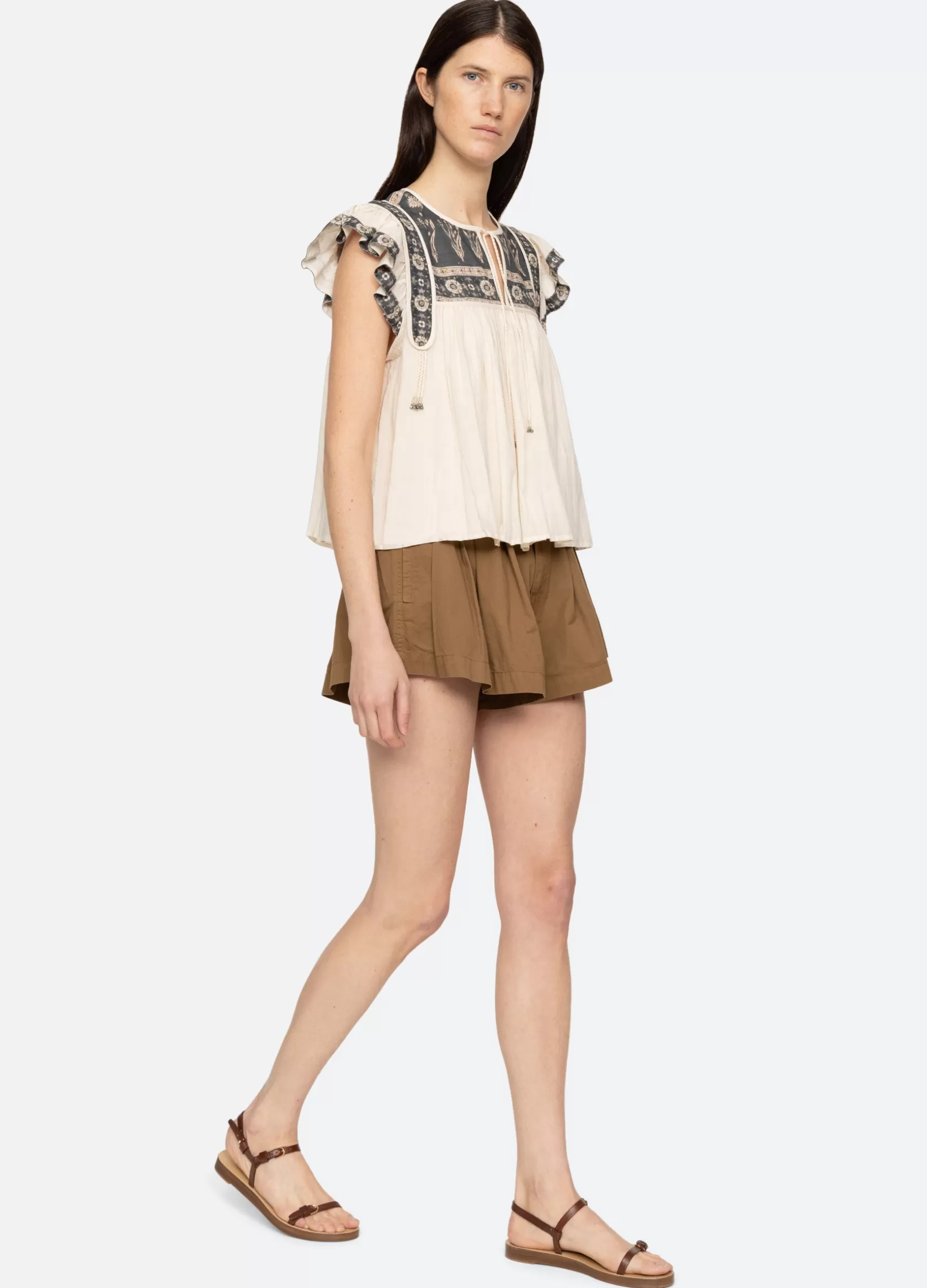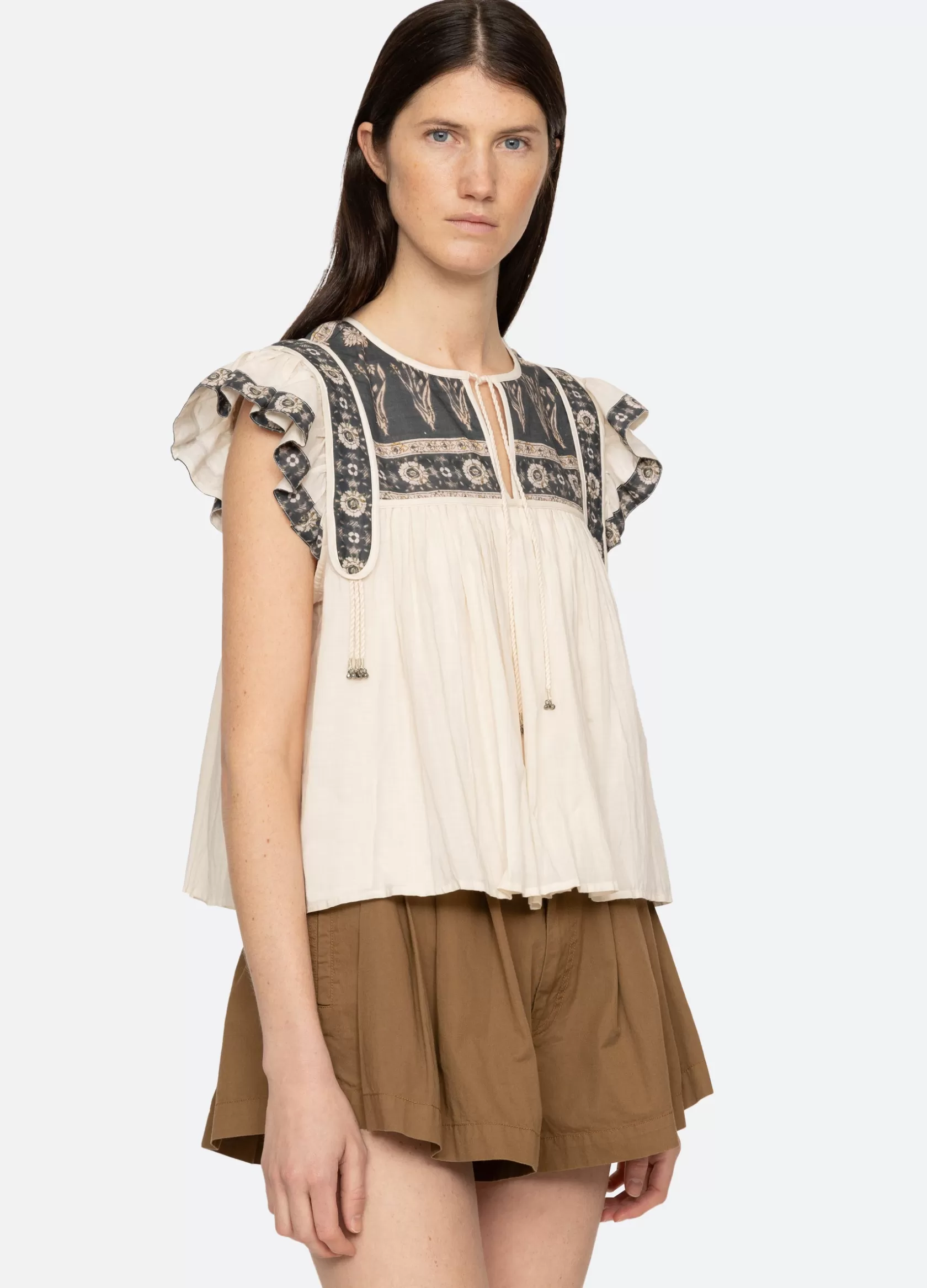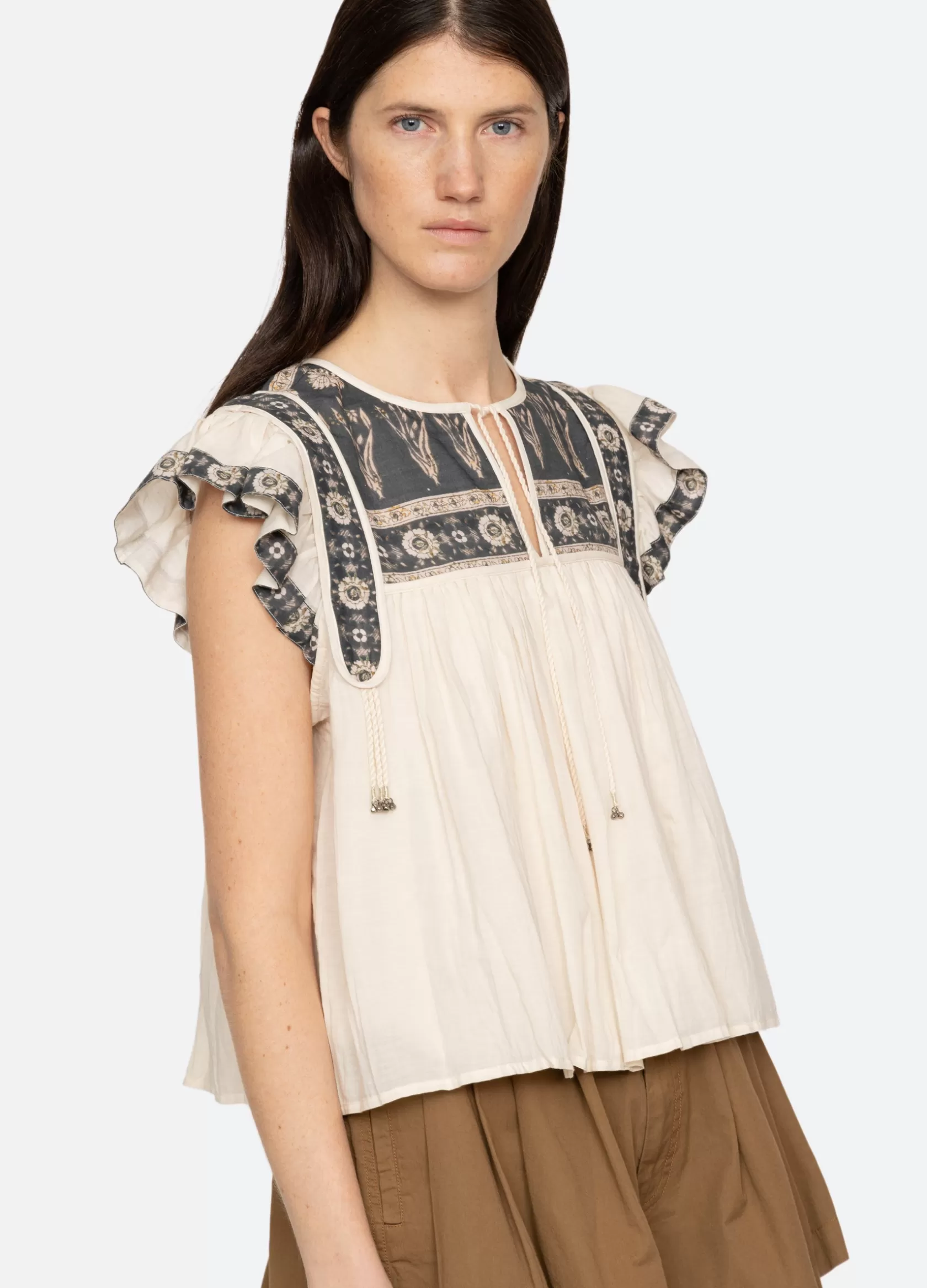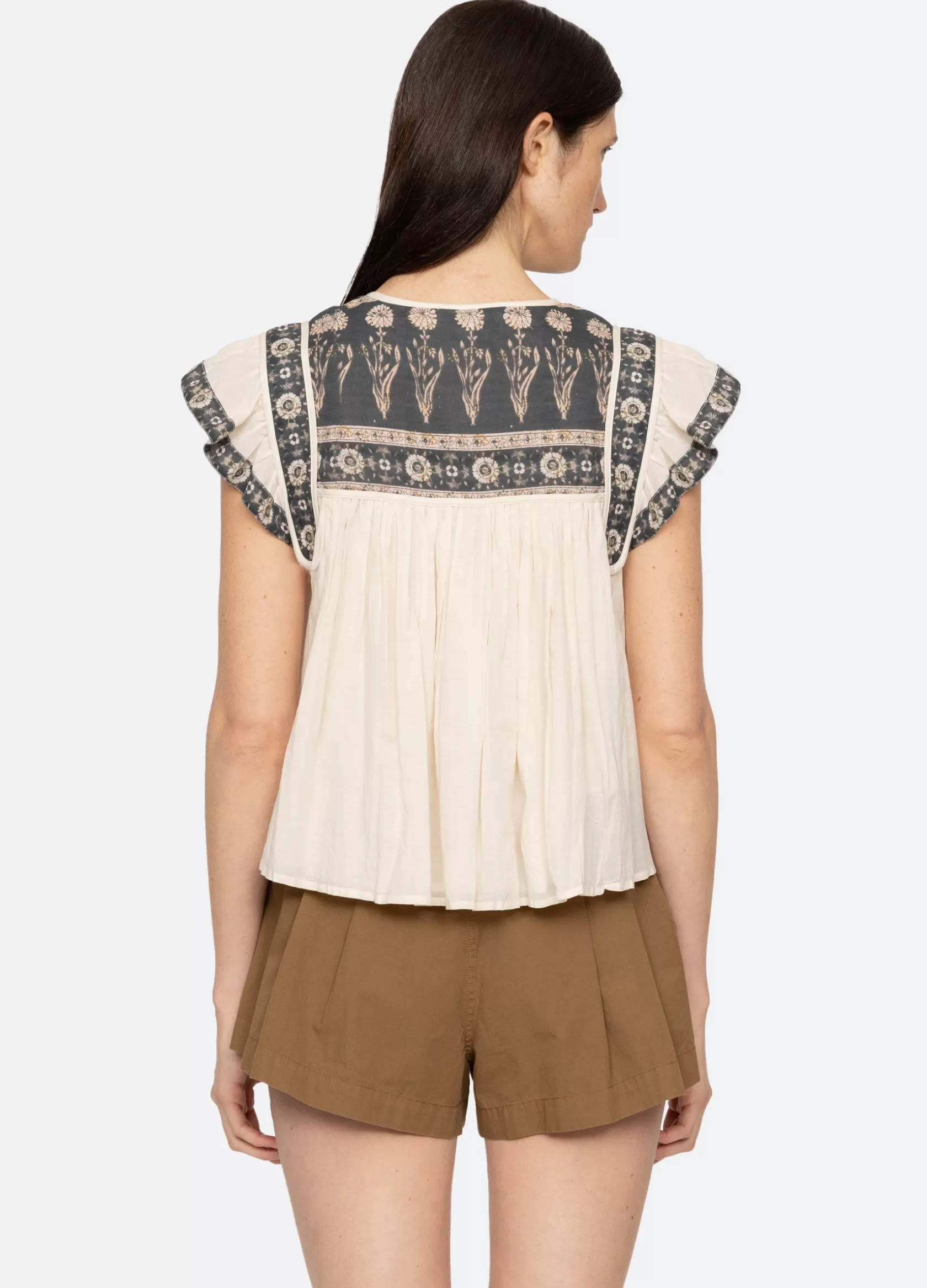 The Carla floral border print top features flutter sleeves and twisted cord neck ties with beading. Designed for an easy, relaxed fit.