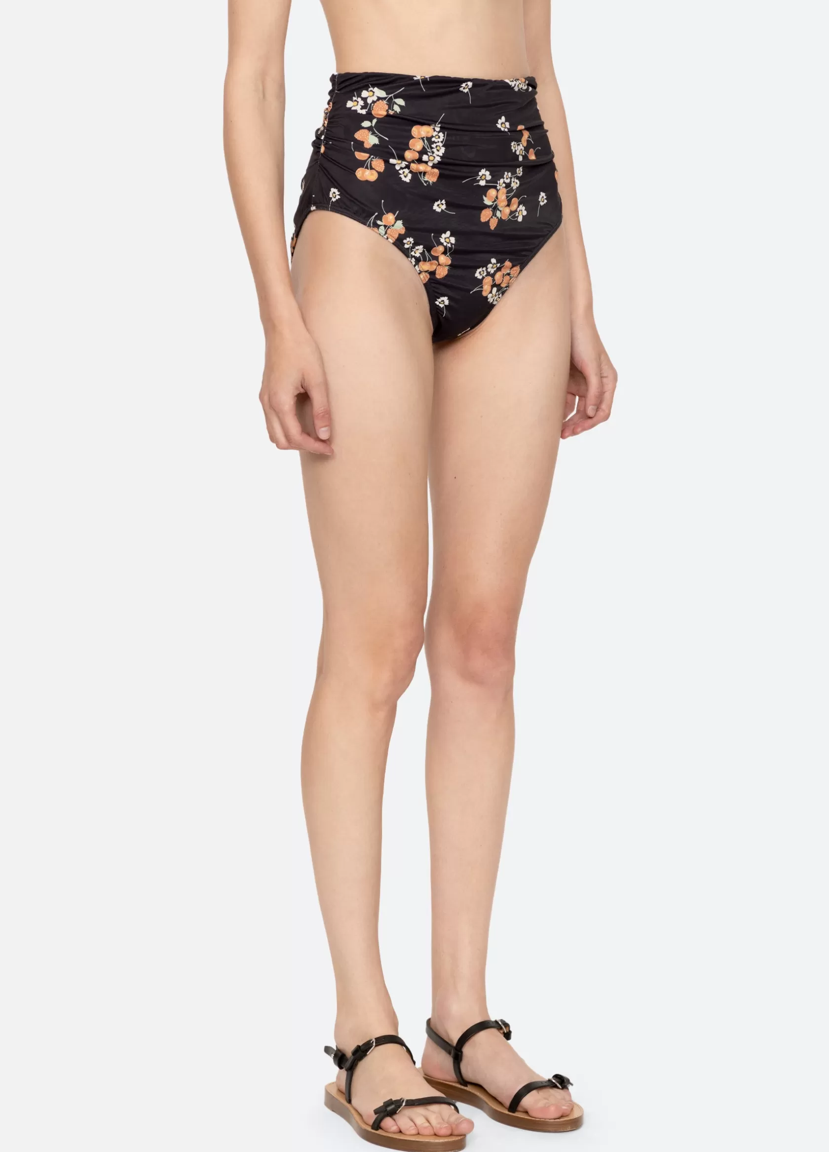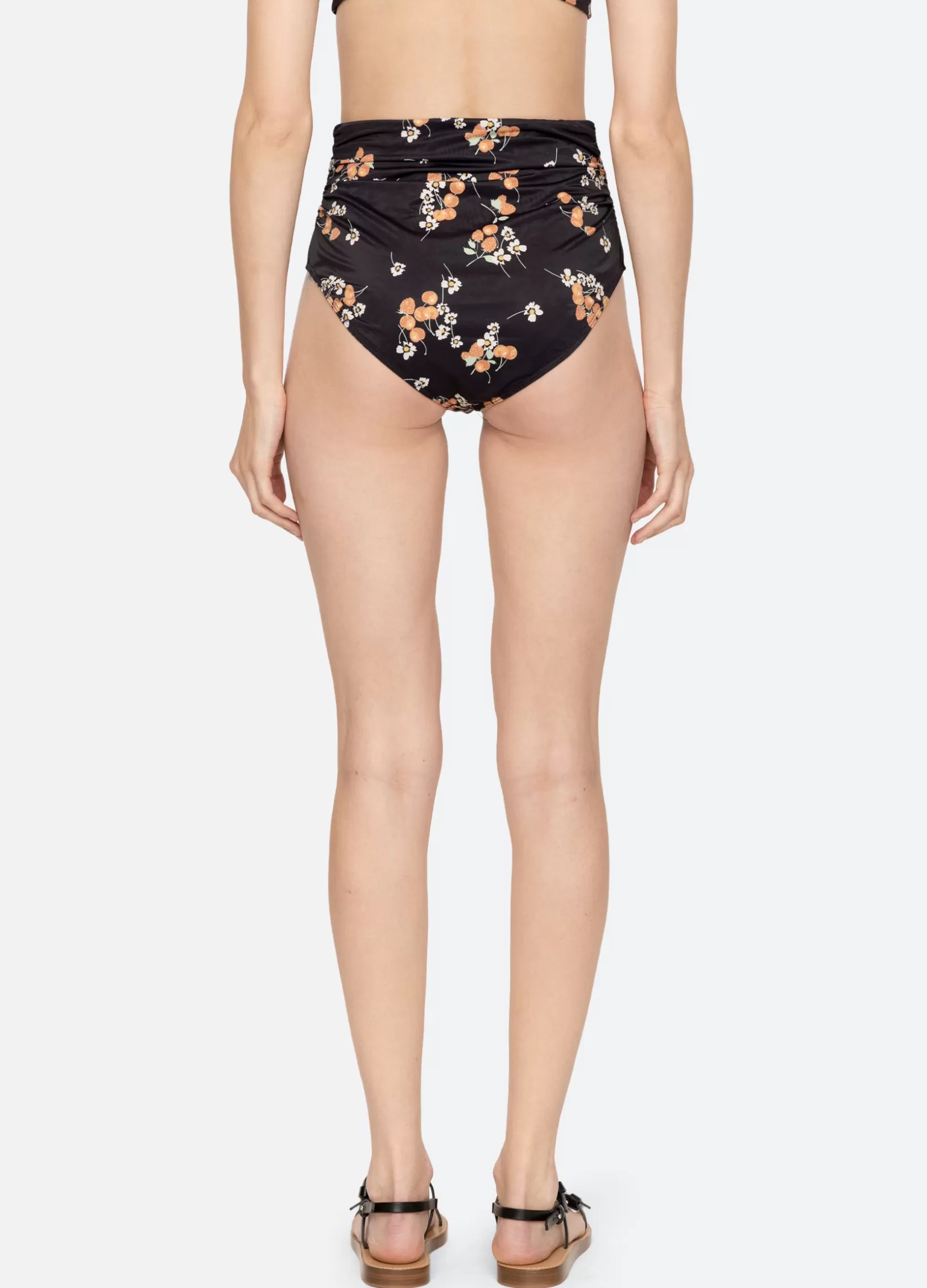 The Cerise fruit print bikini bottom features a high waisted silhouette with ruched detailing.