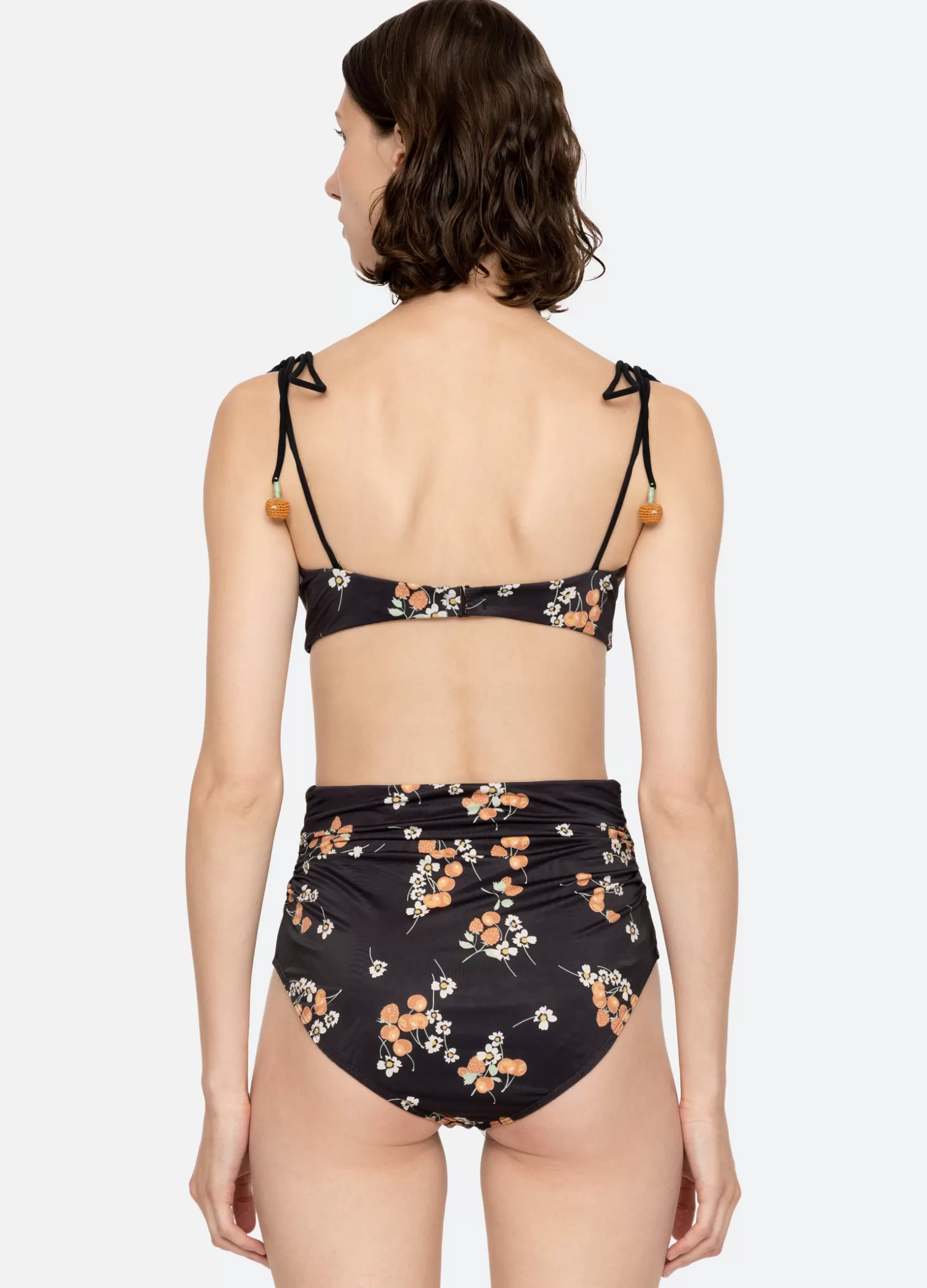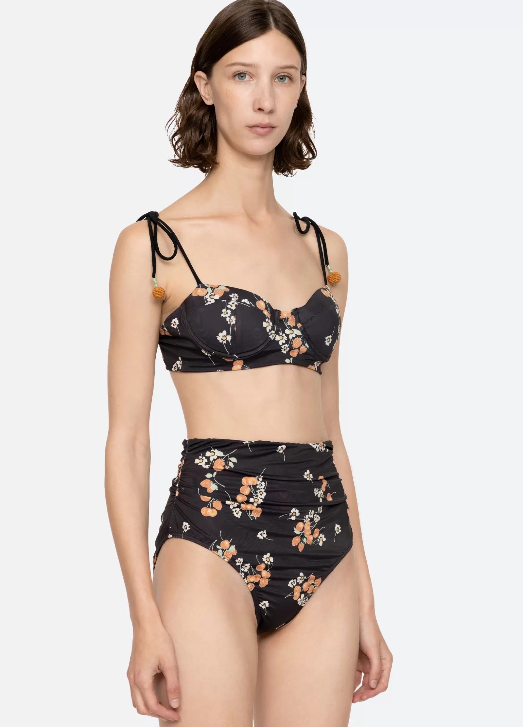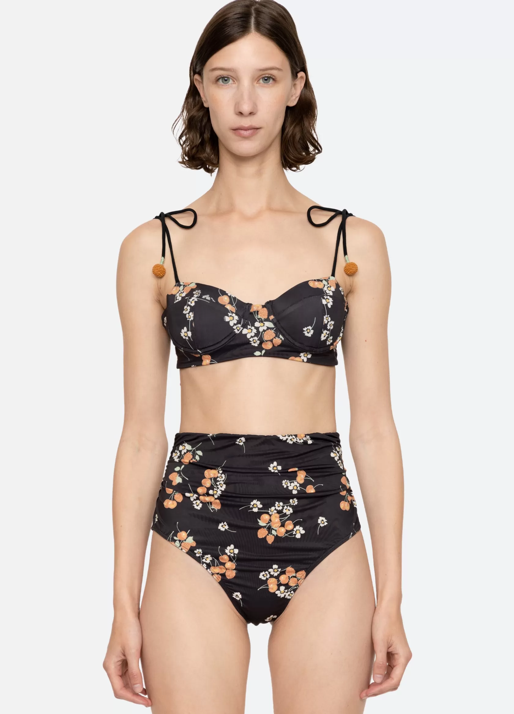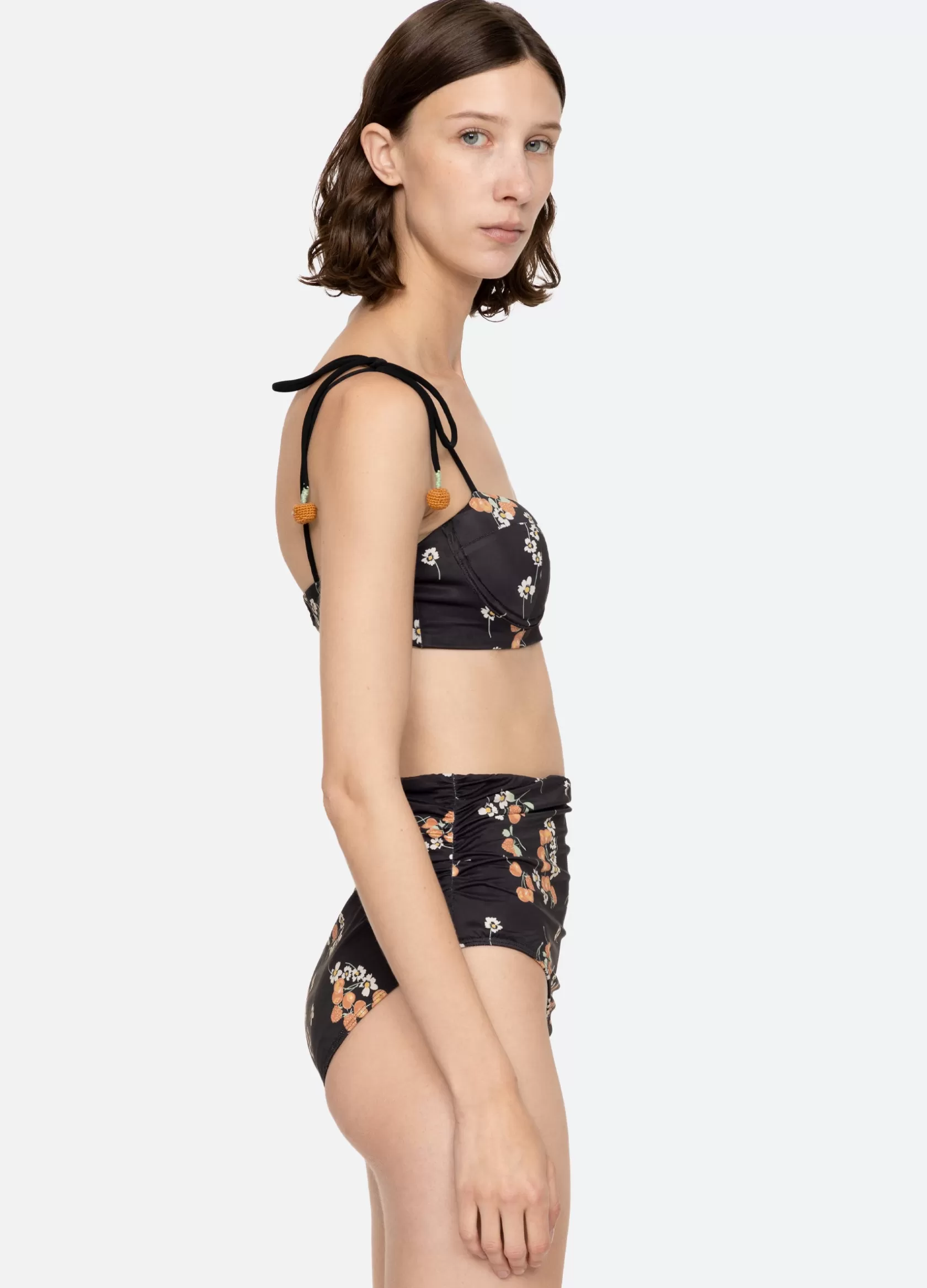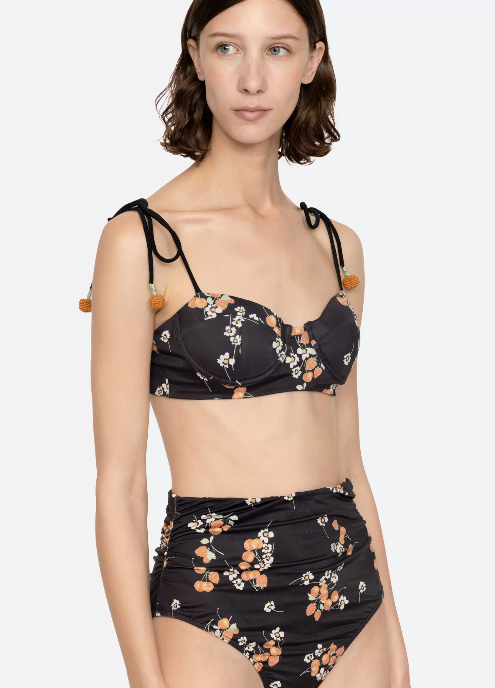 The Cerise fruit print bikini top features a bustier silhouette and self tie straps with pom poms.