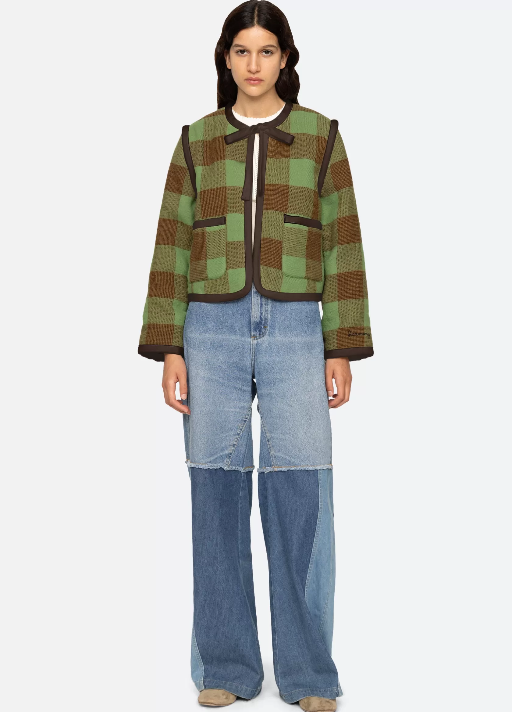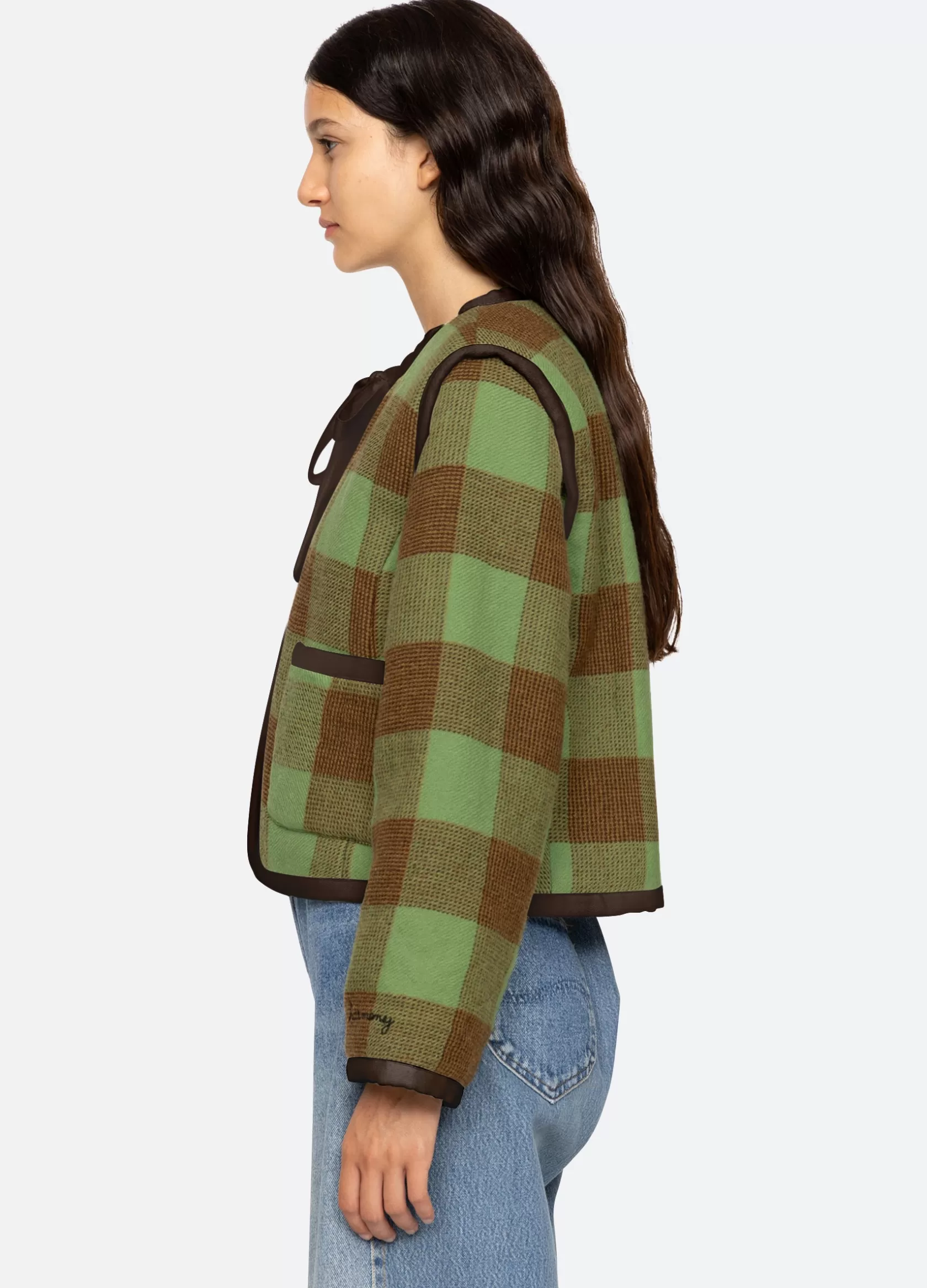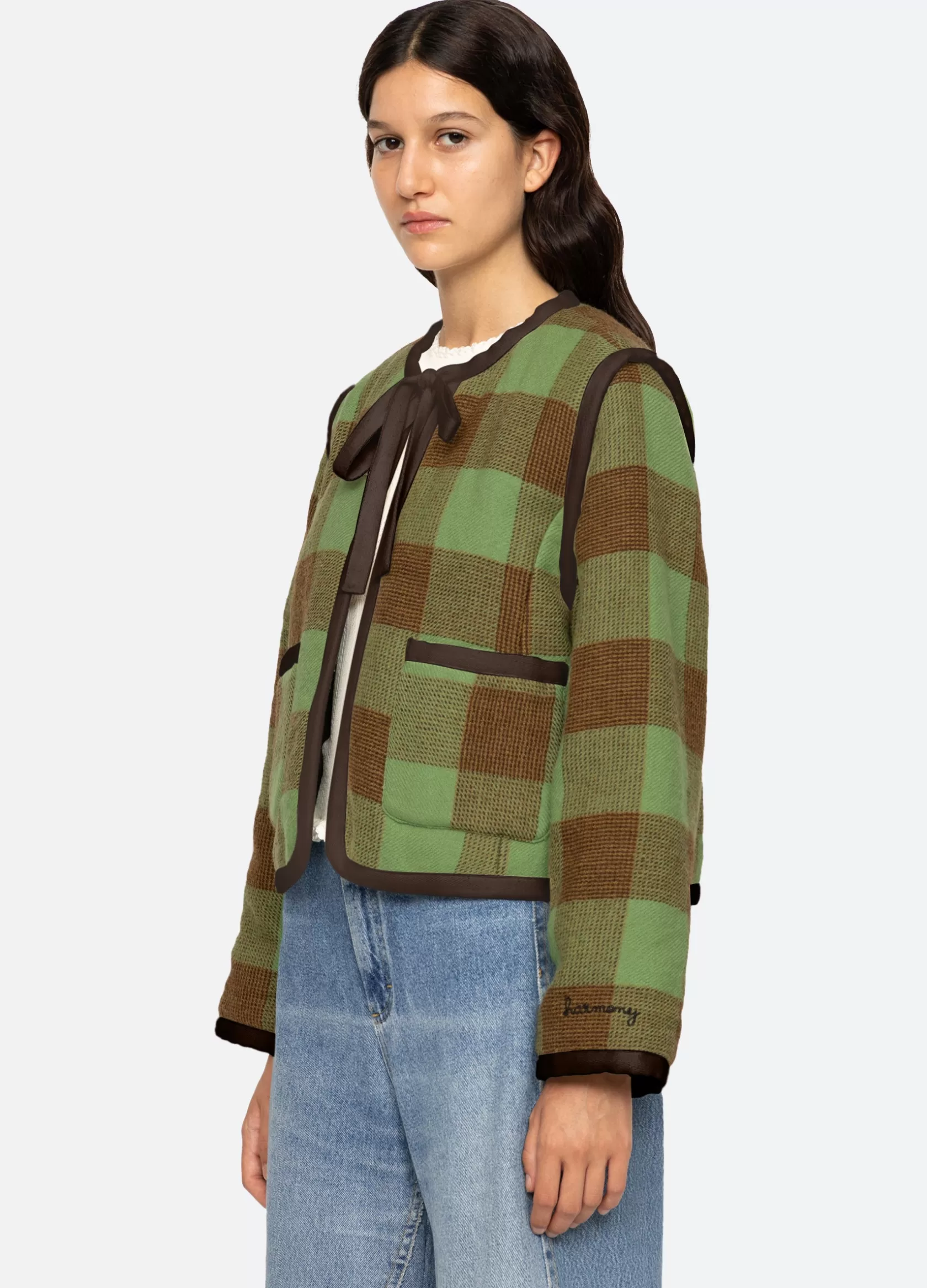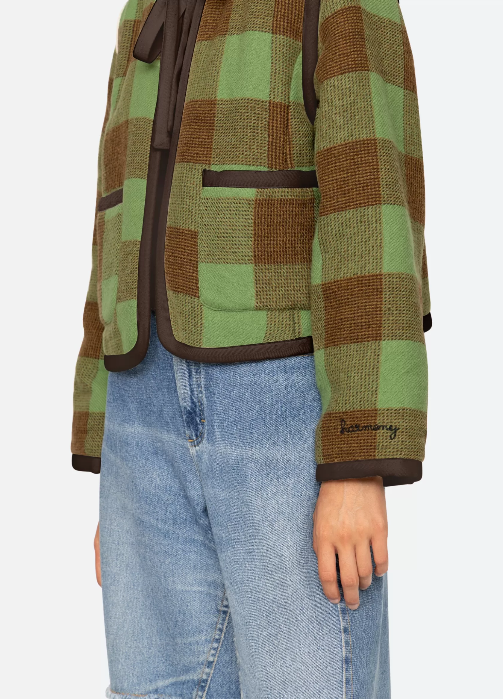 Exclusively Ours. The Clement jacket is part of our “Harmony” program that aims to simultaneously produce garments that are in-line with our values of recycling, reusing, connecting cultures and artisans, and manufacturing in a sustainable manner. We want this program to be a harmony of these goals. The Clement check wool jacket features a self tie closure.