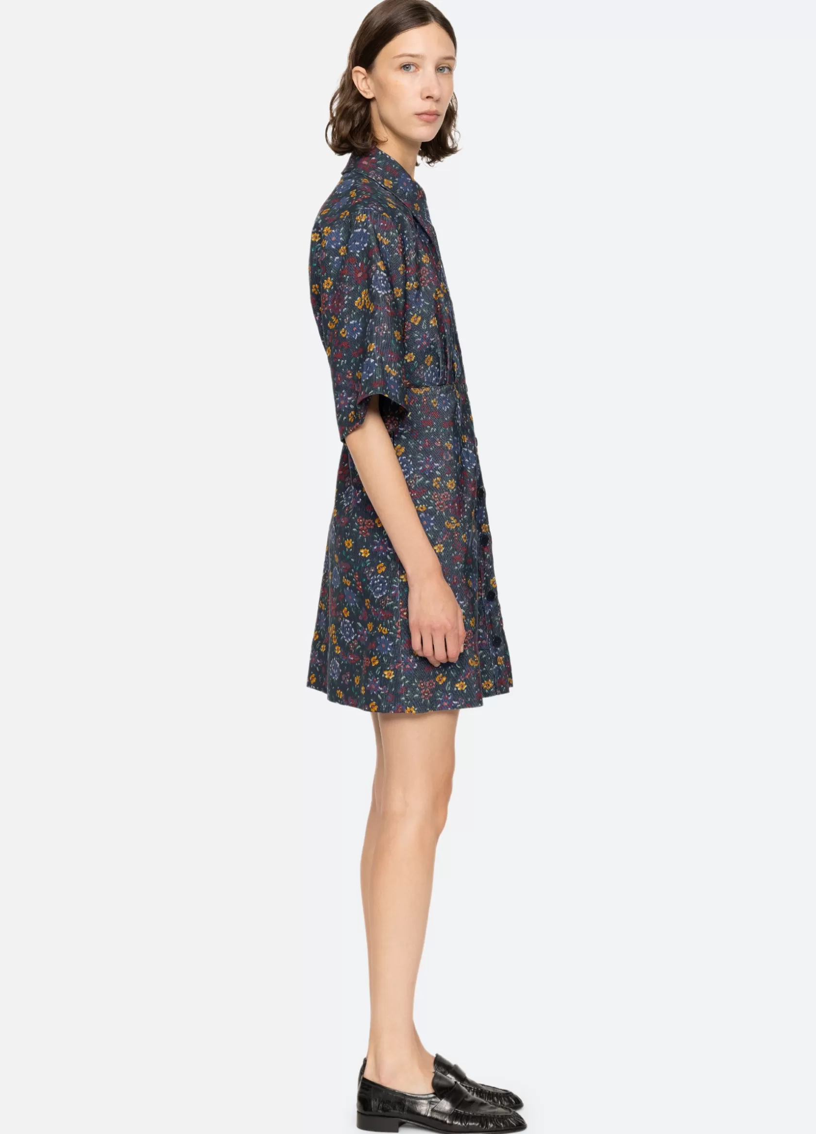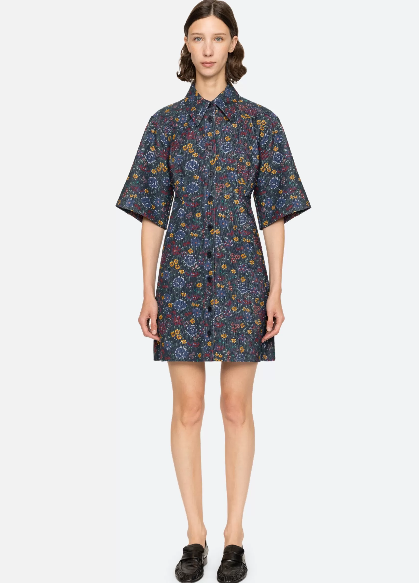 The Constance corduroy floral print dress features short sleeves, button front and mini silhouette.