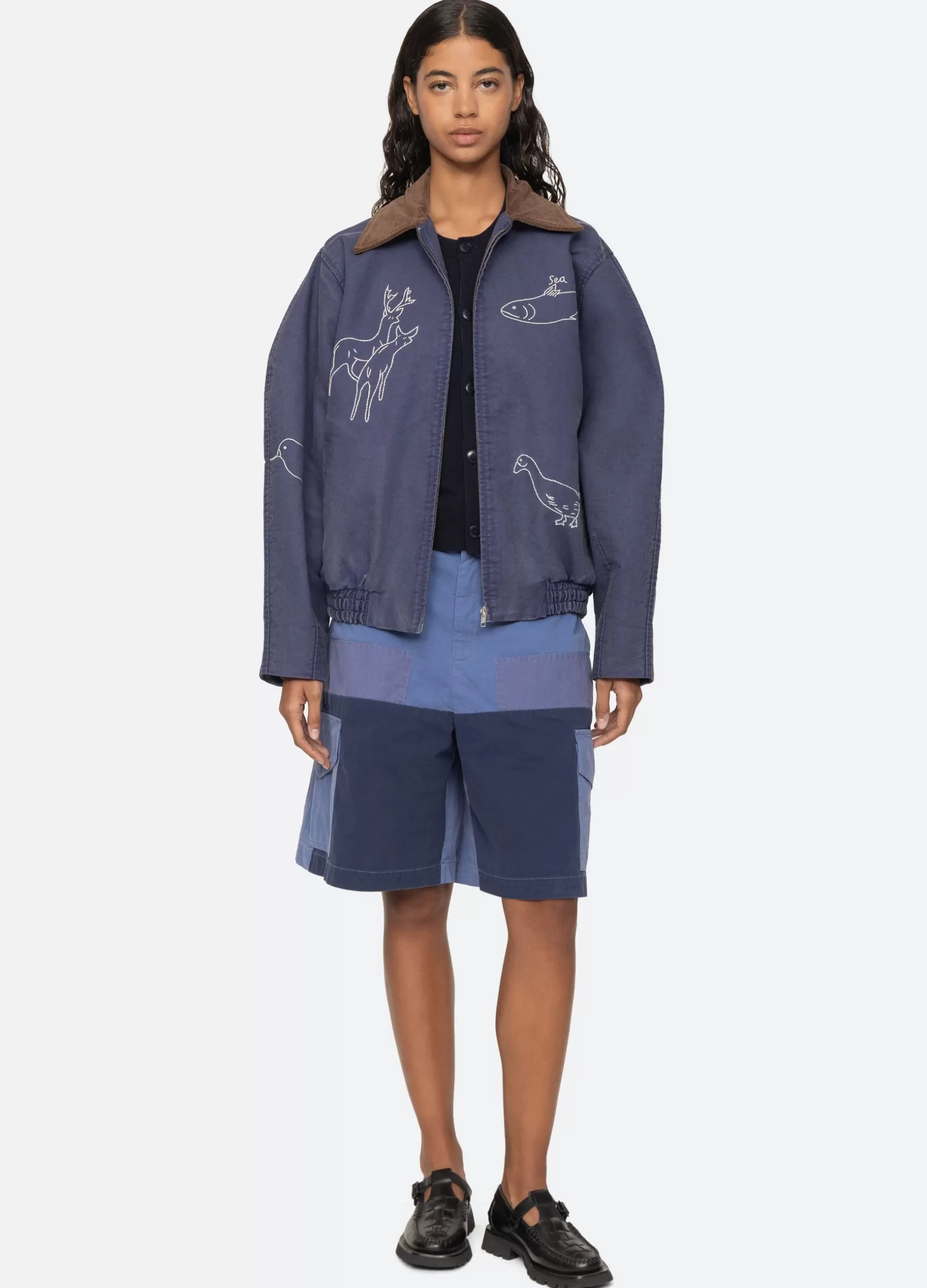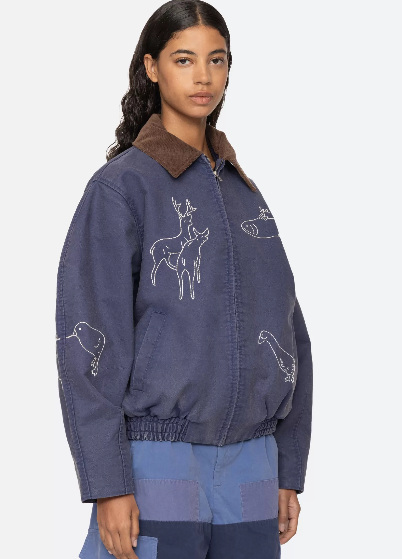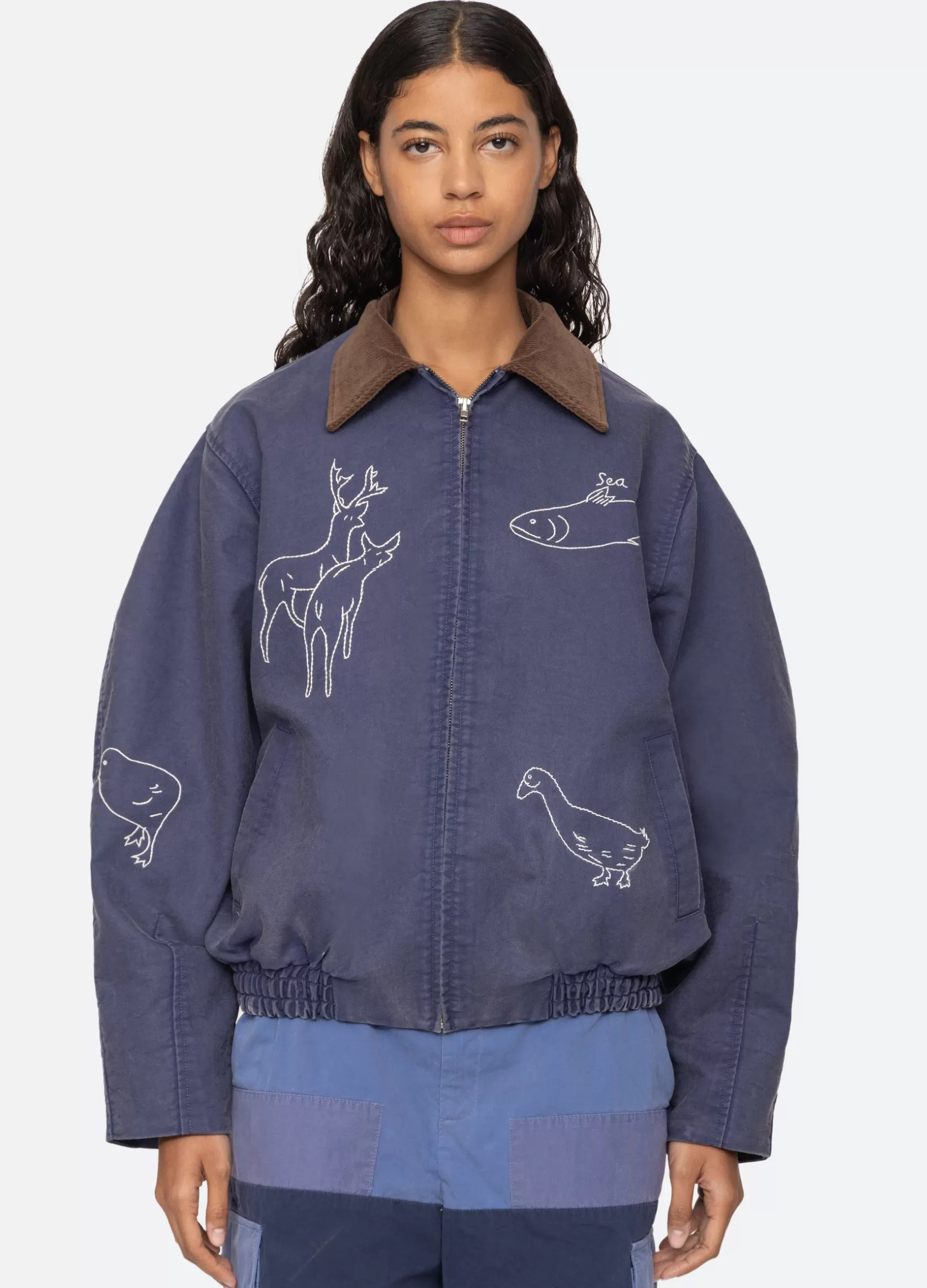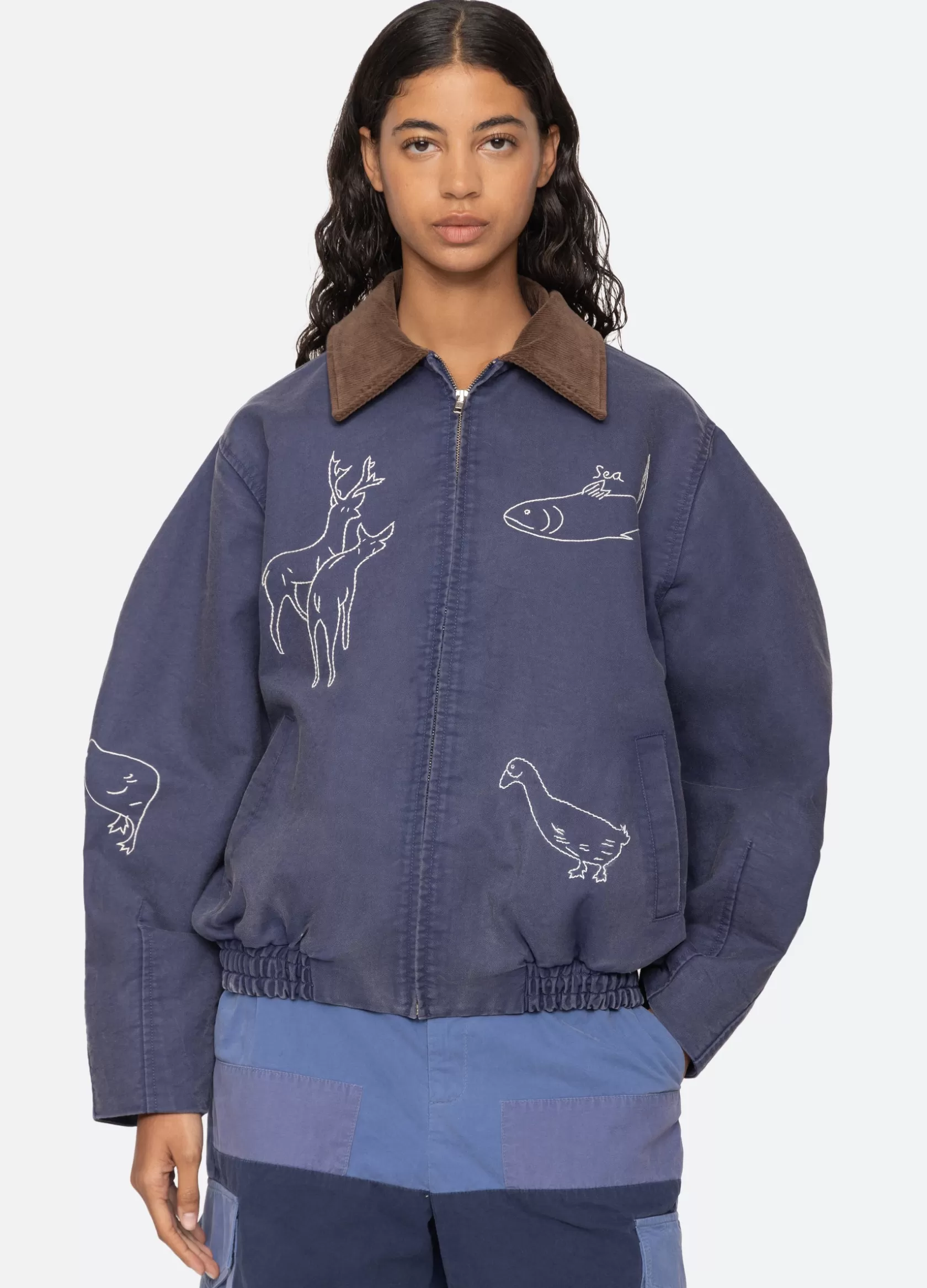 The Demi french workwear jacket features an oversized silhouette, embroidered detailing throughout and corduroy collar.