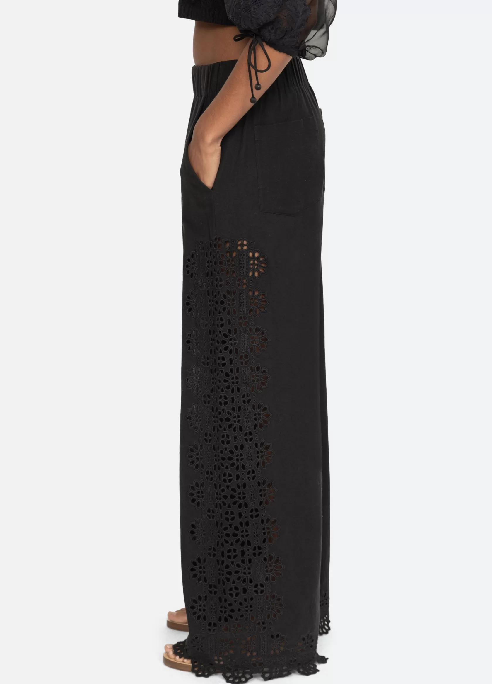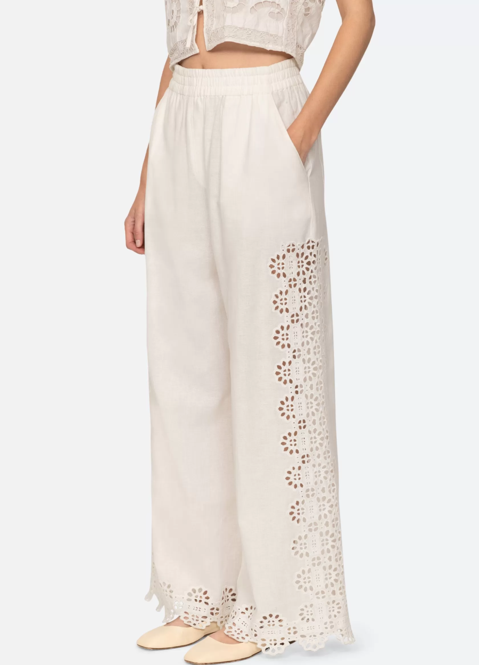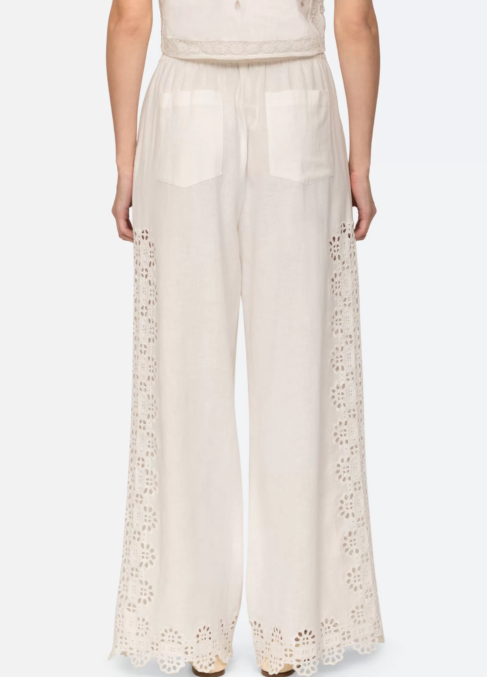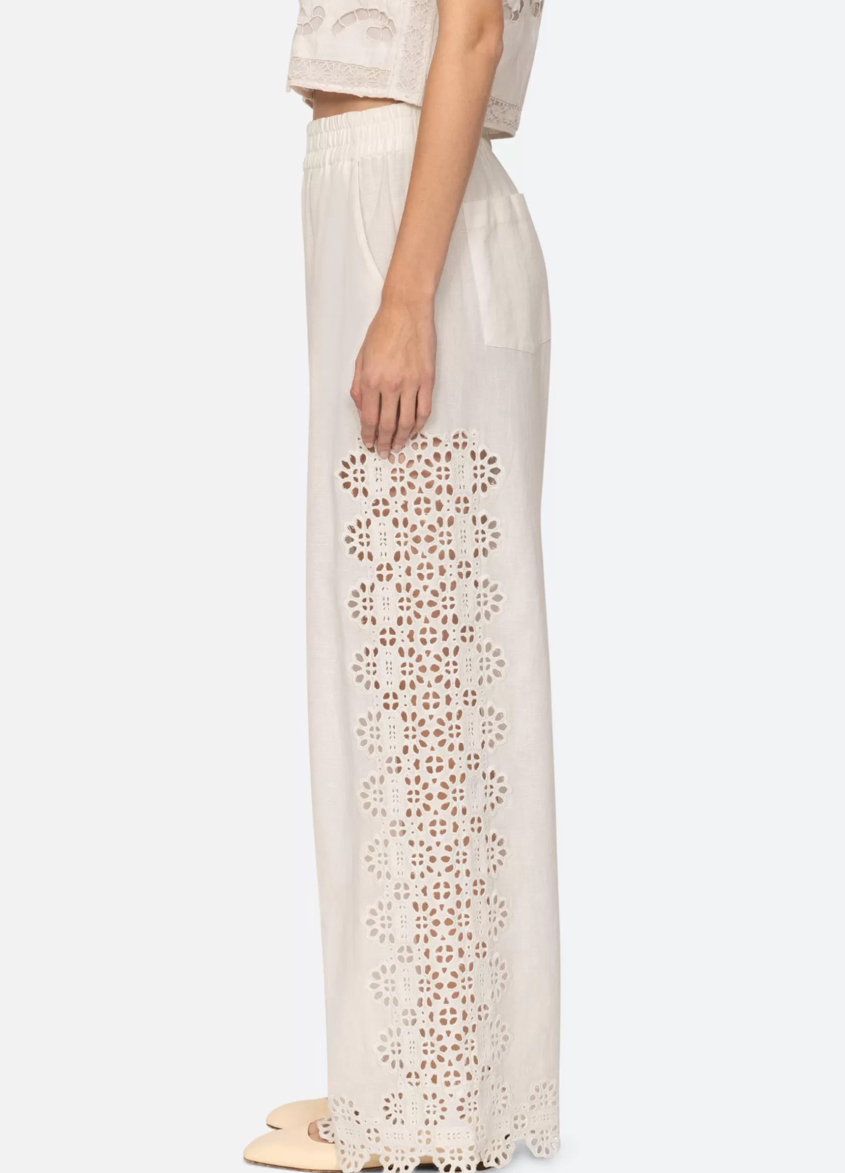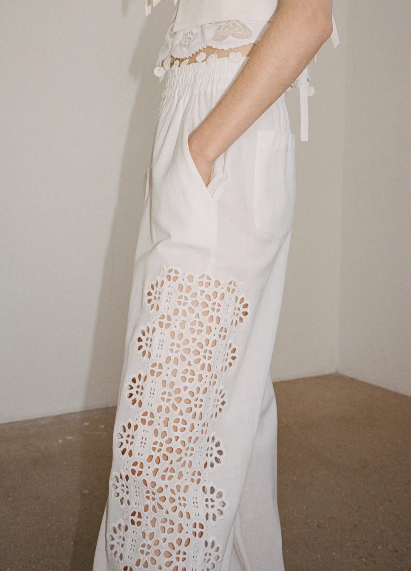 The Edith pants feature an elasticized waistband and embroidered detailing down the side of the leg. Designed for an easy, relaxed fit.