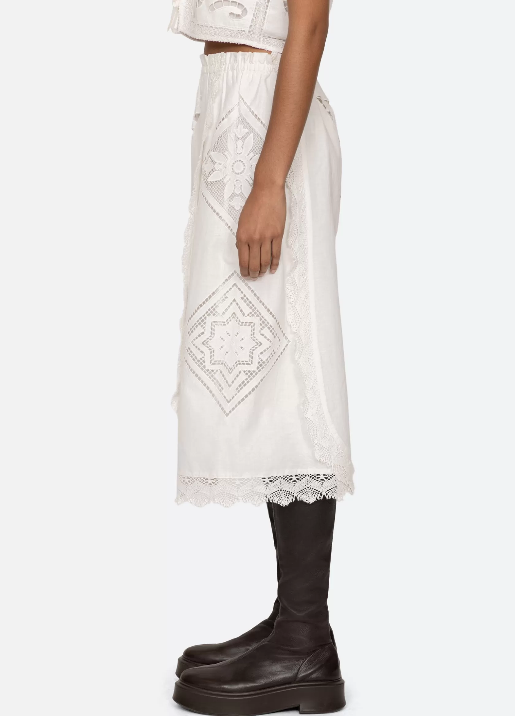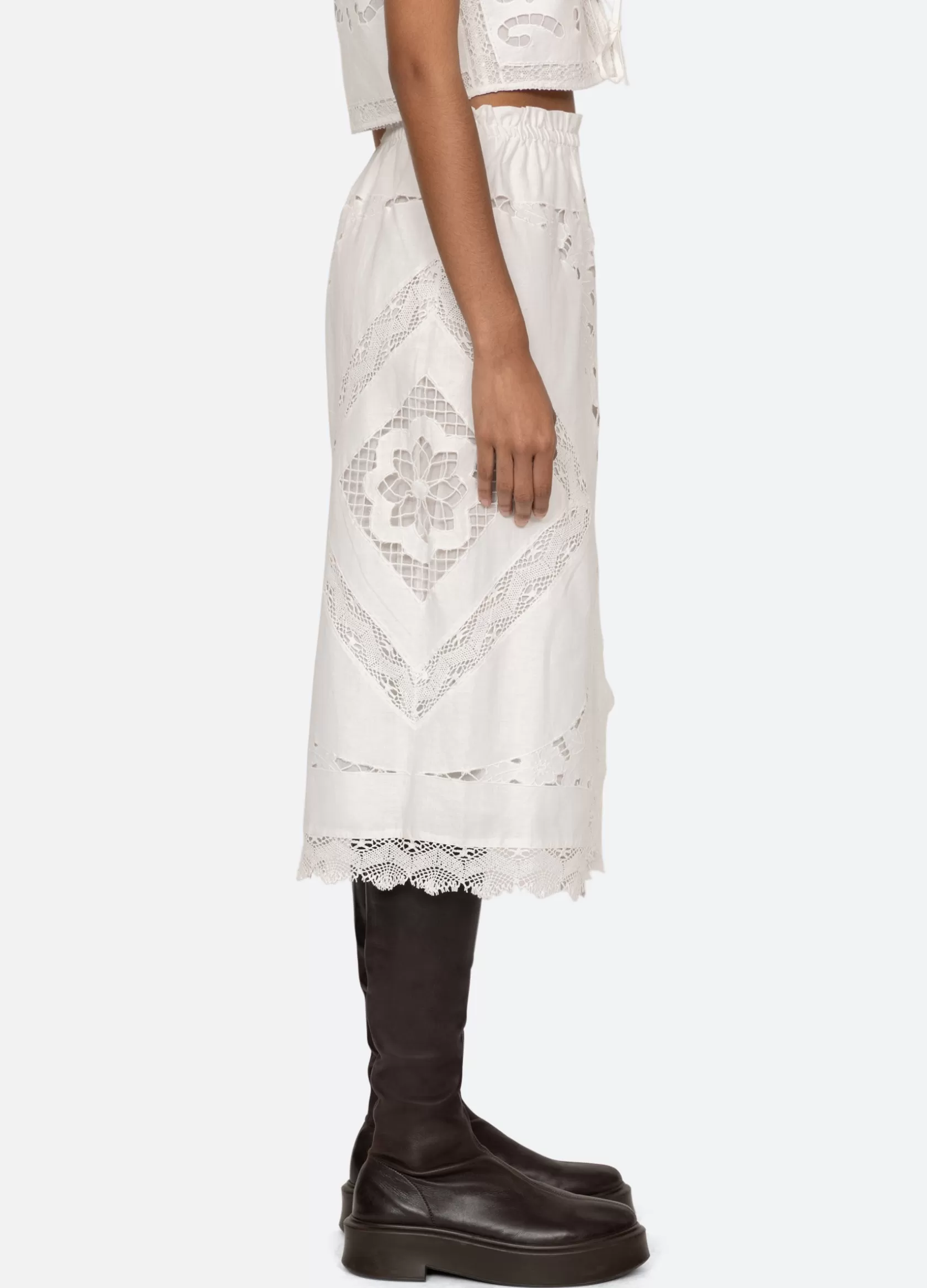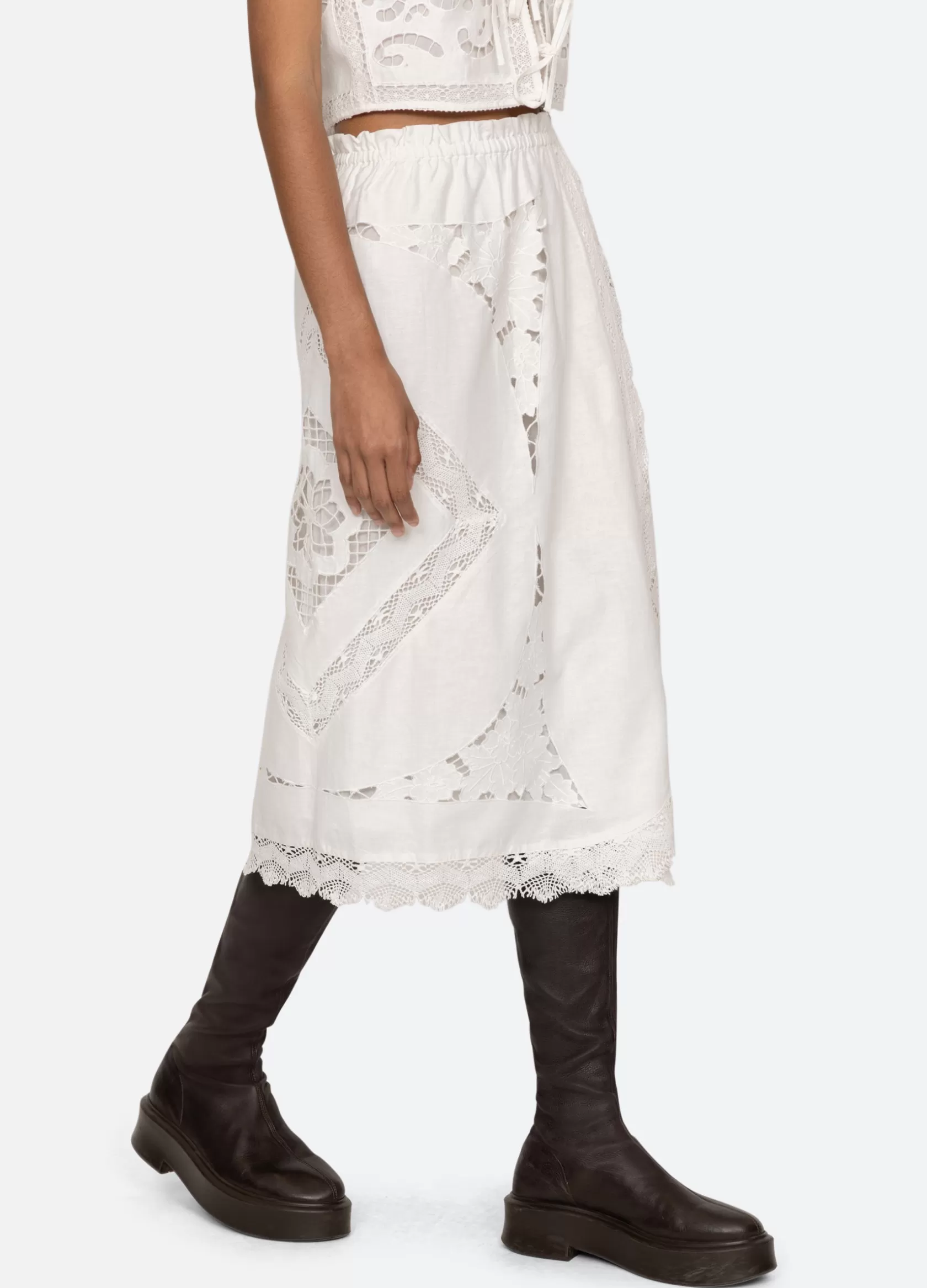 The Edith skirt features an elasticized waistband and embroidered detailing throughout.