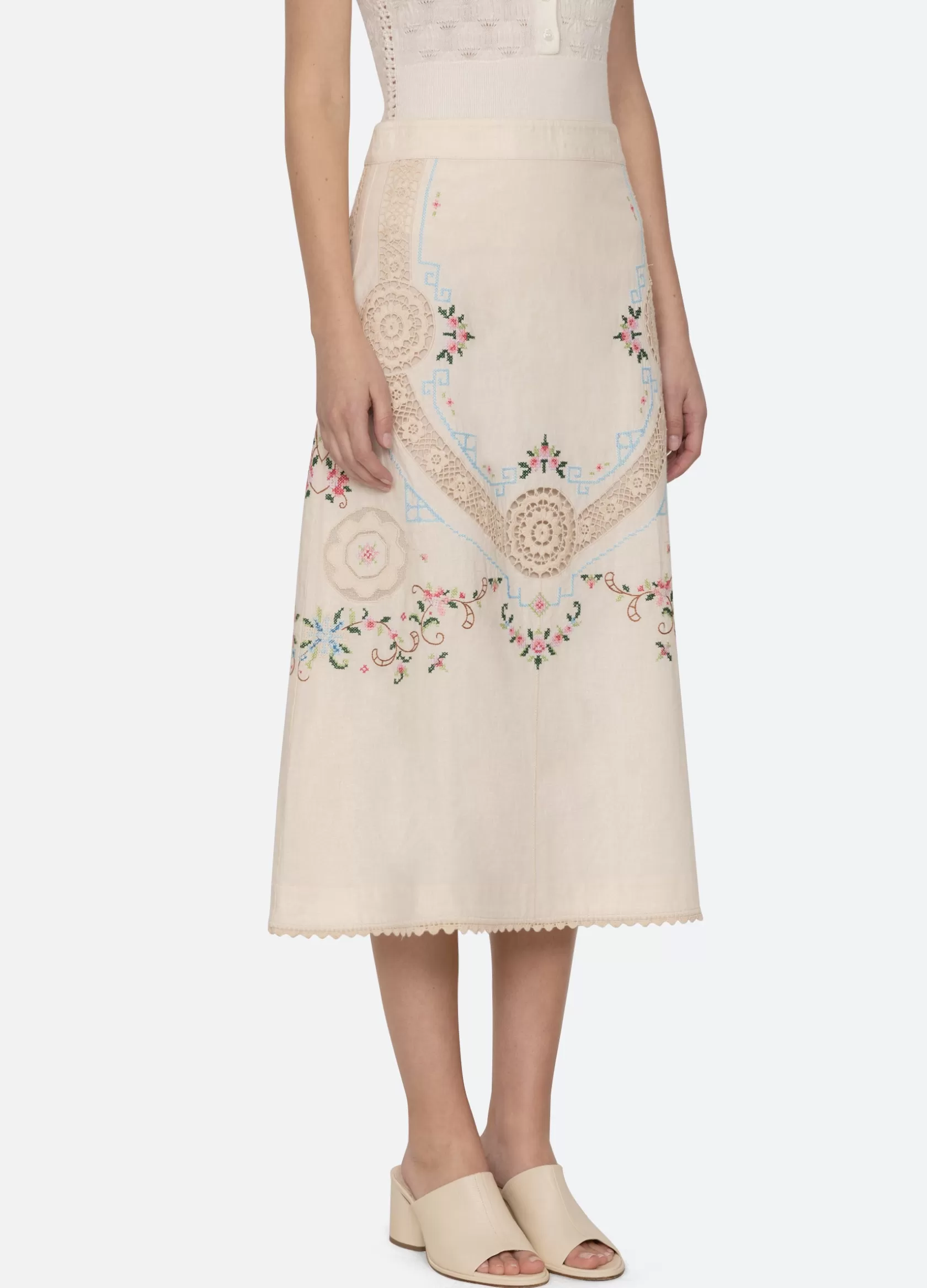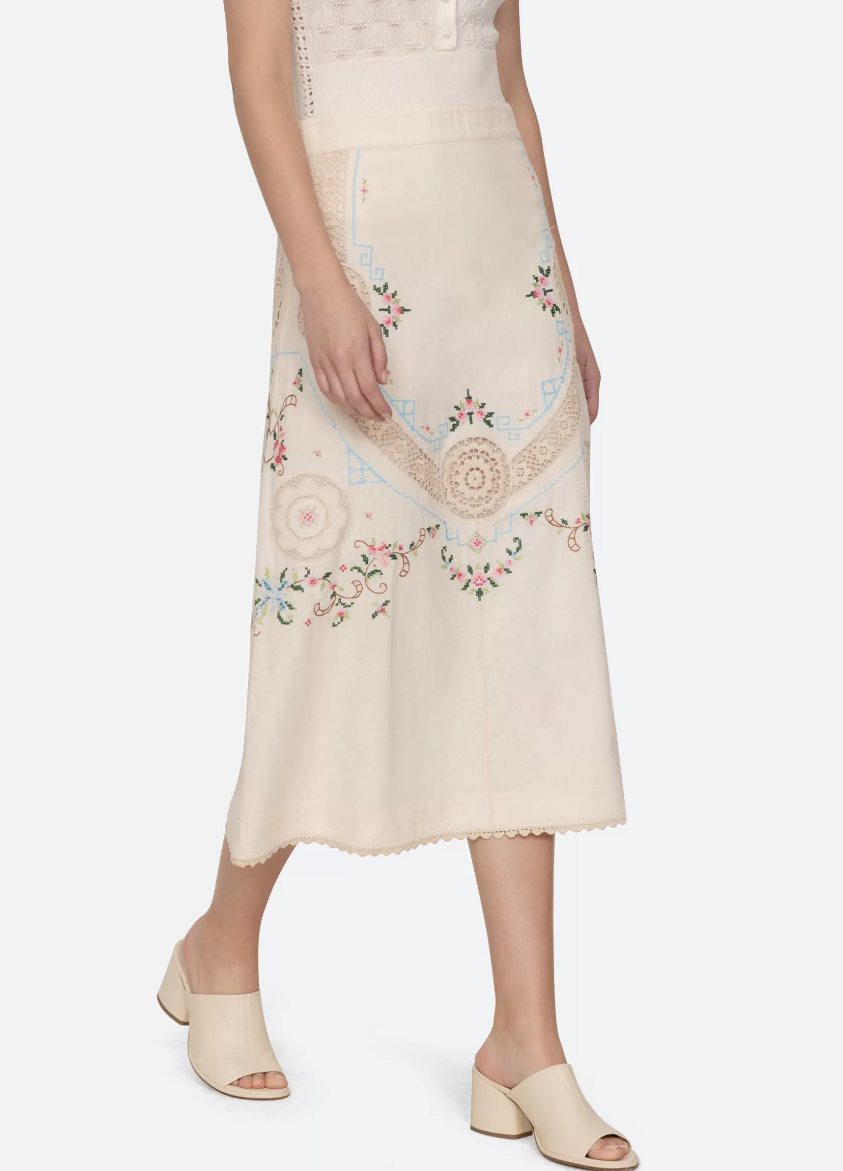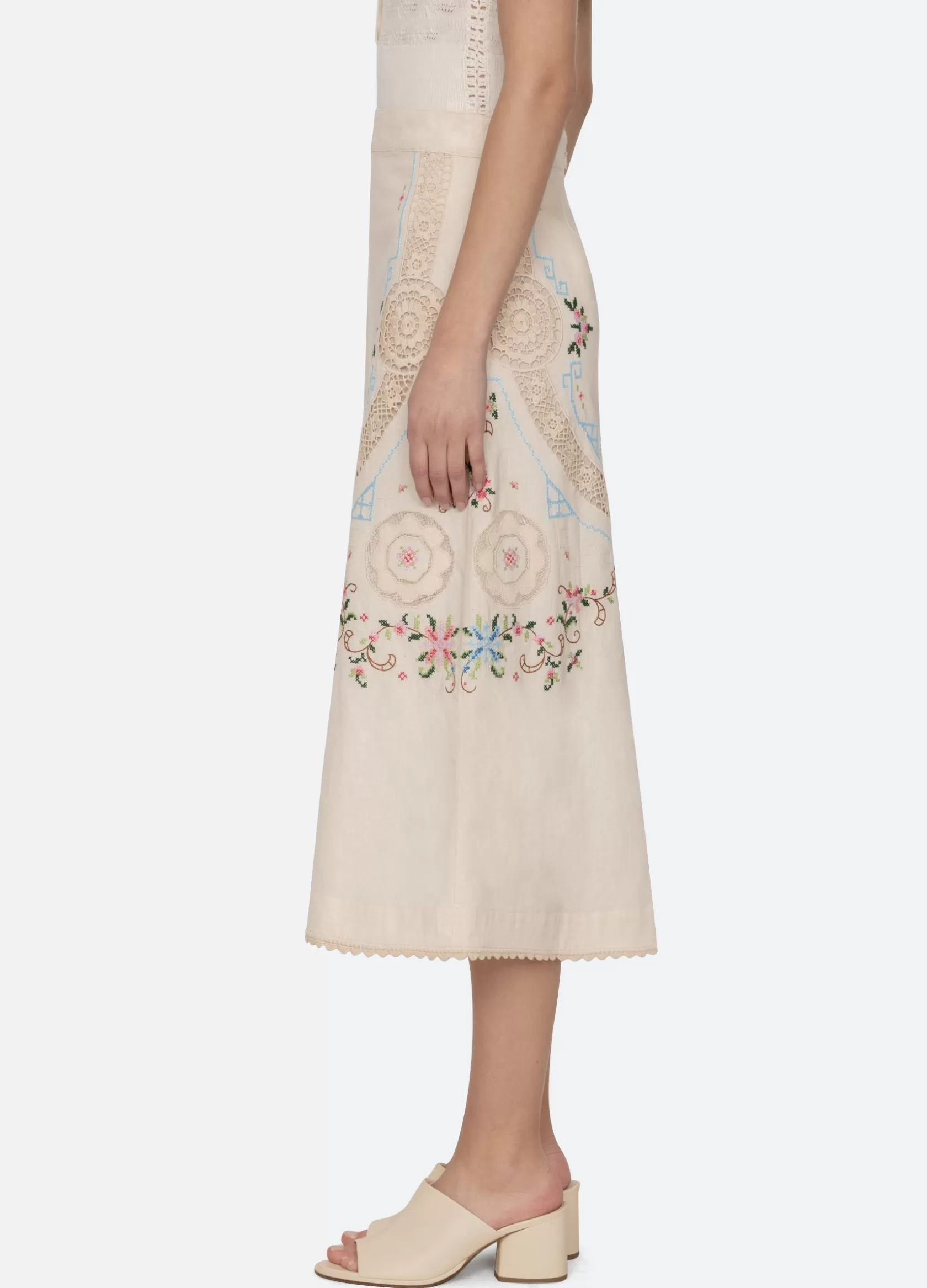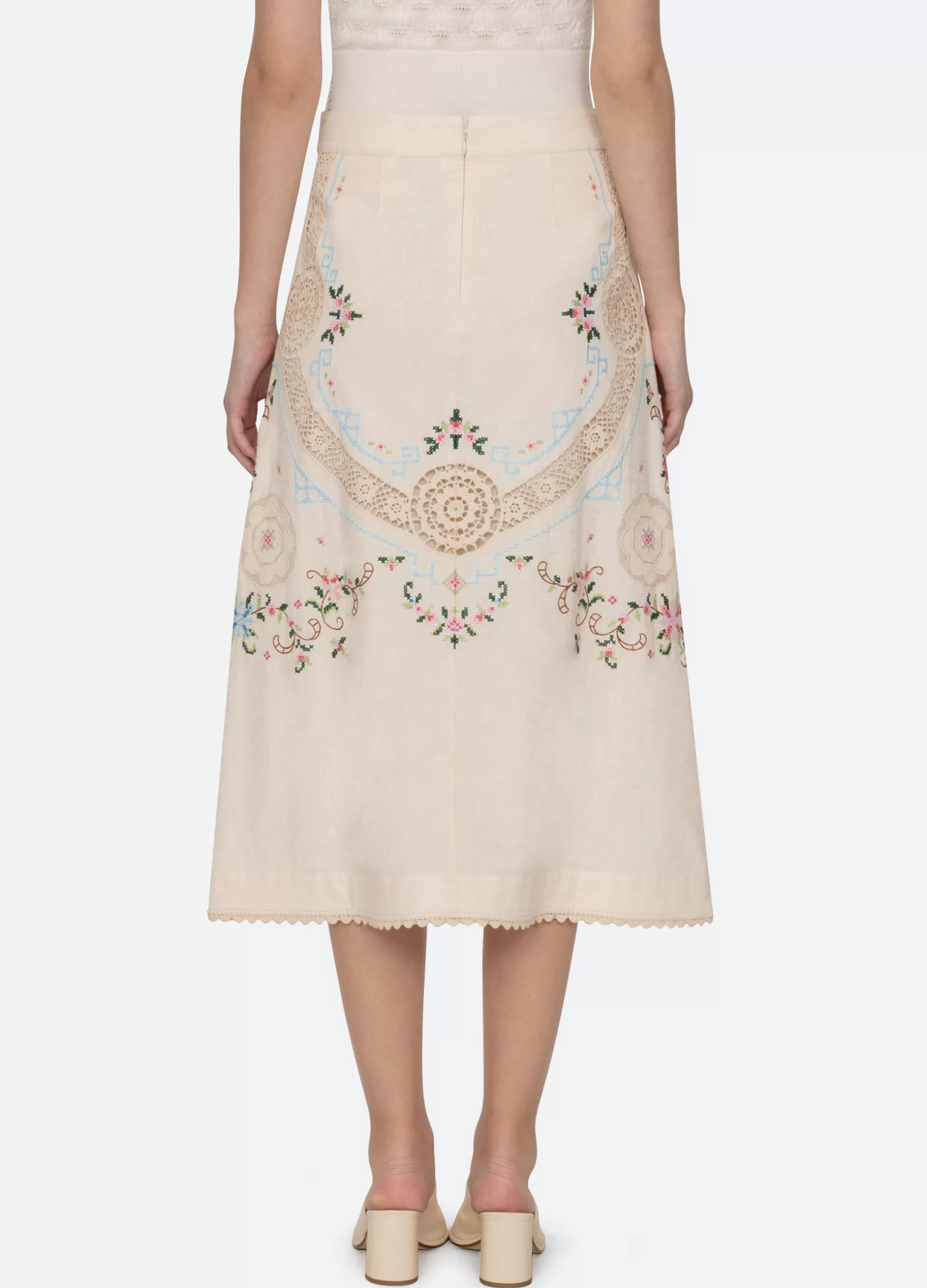 The Edwina skirt features cross stitch embroidery throughout and crochet trim detailing.