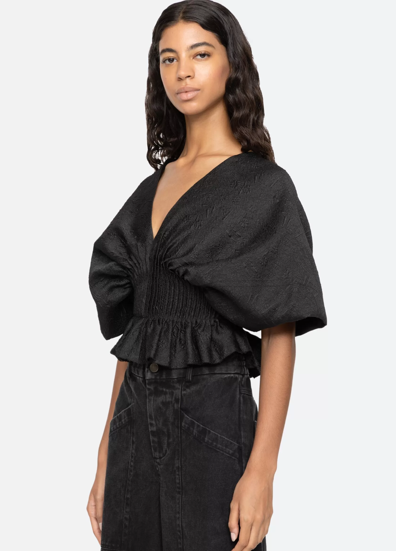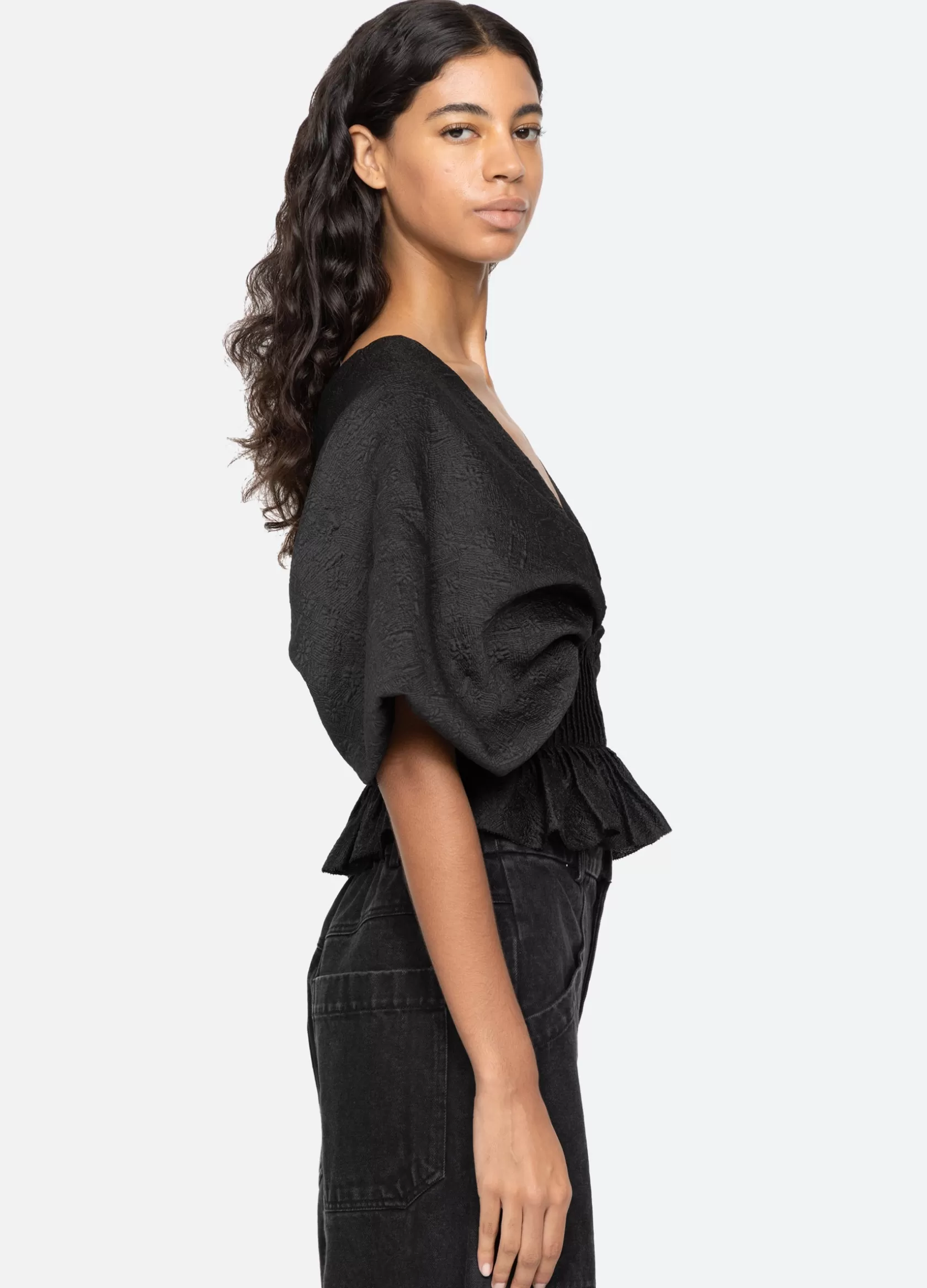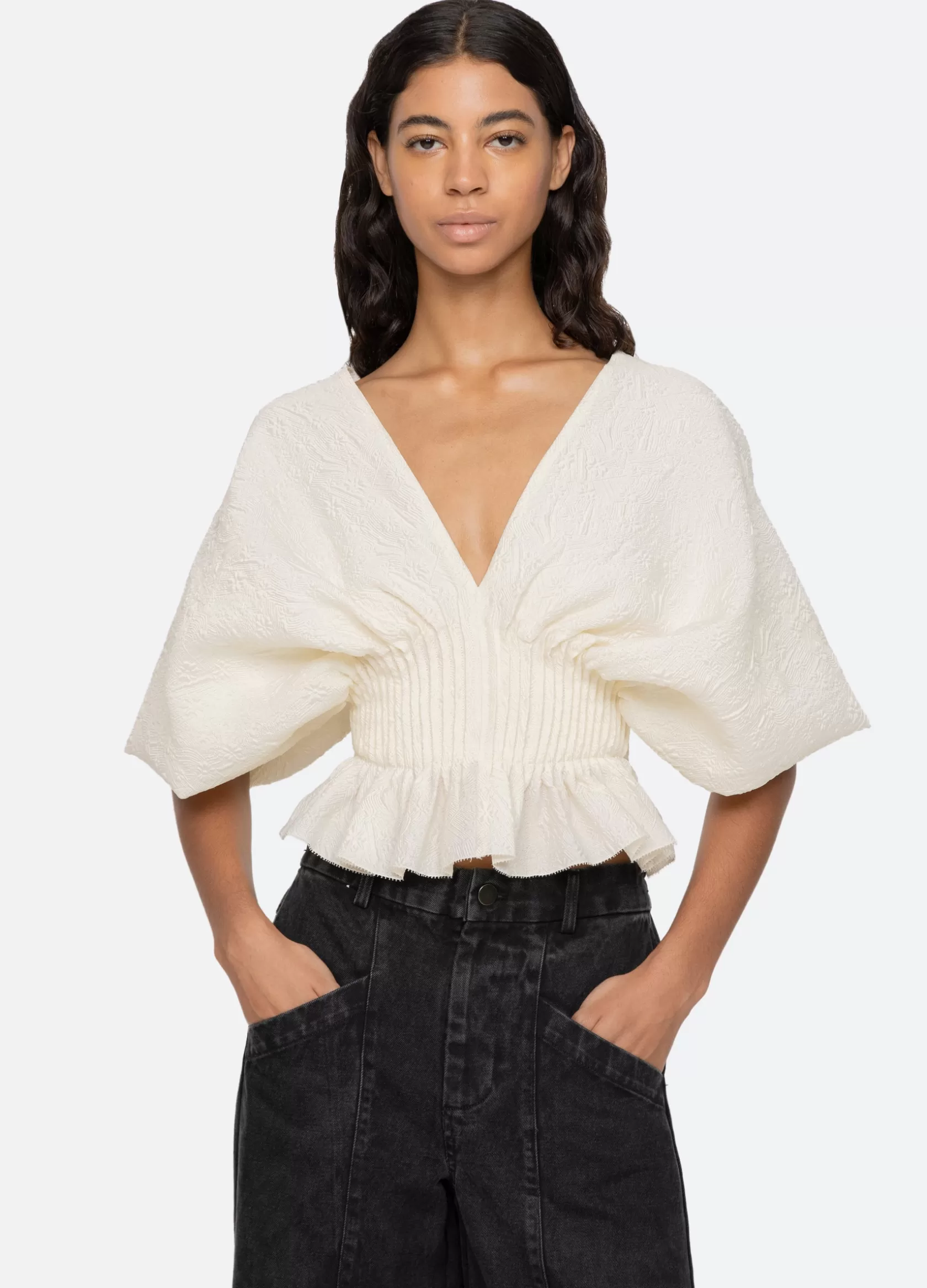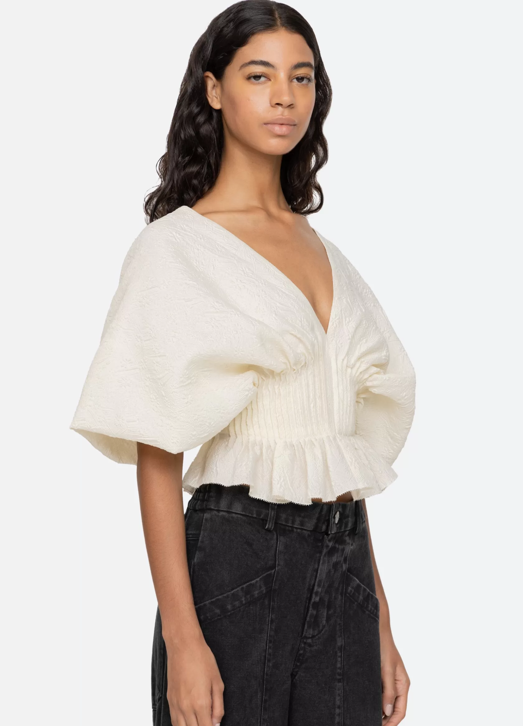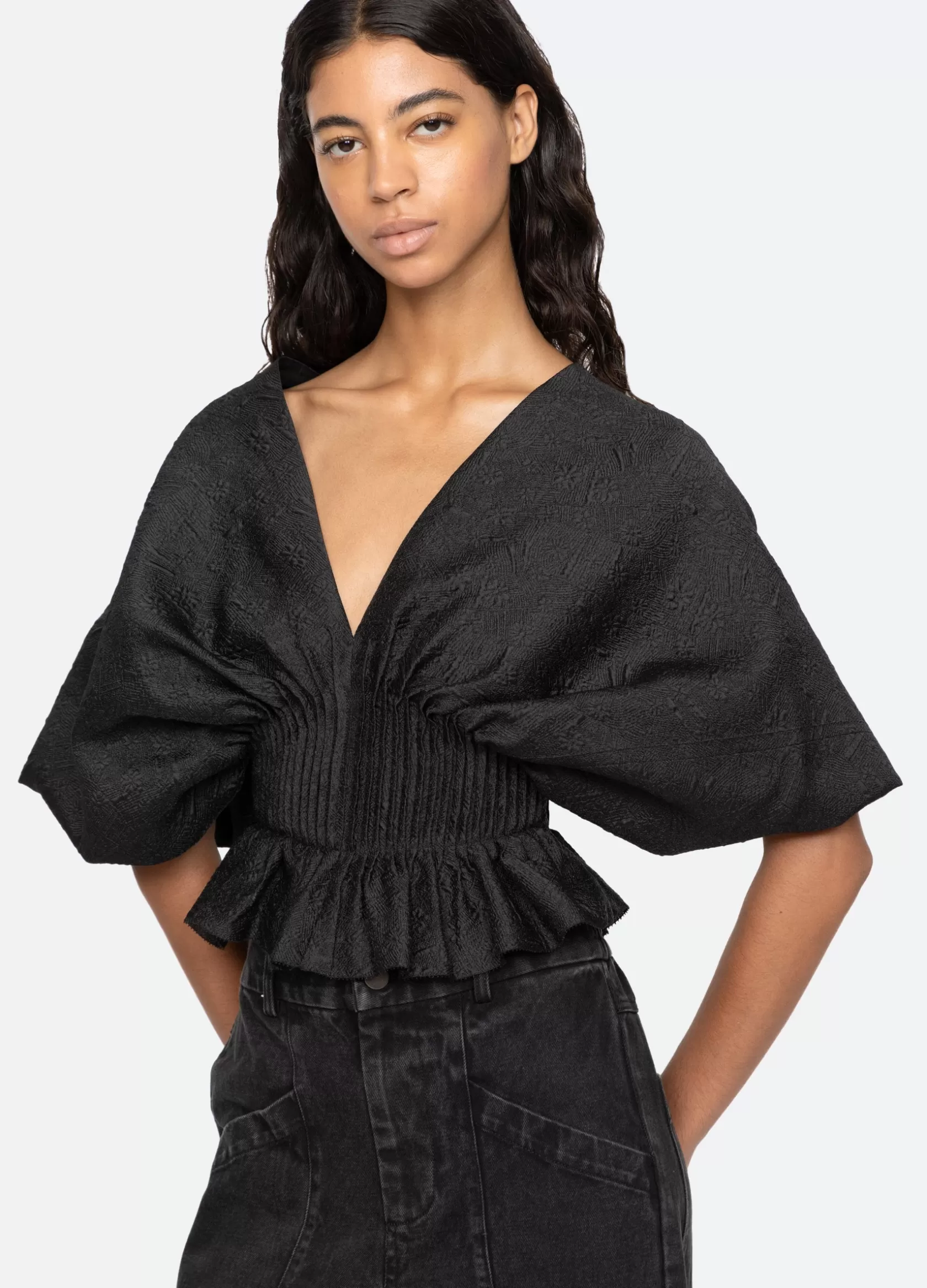 The Elegi jacquard top features an oversized sleeve with pleated bodice, deep v-neckline and ruffle hem.