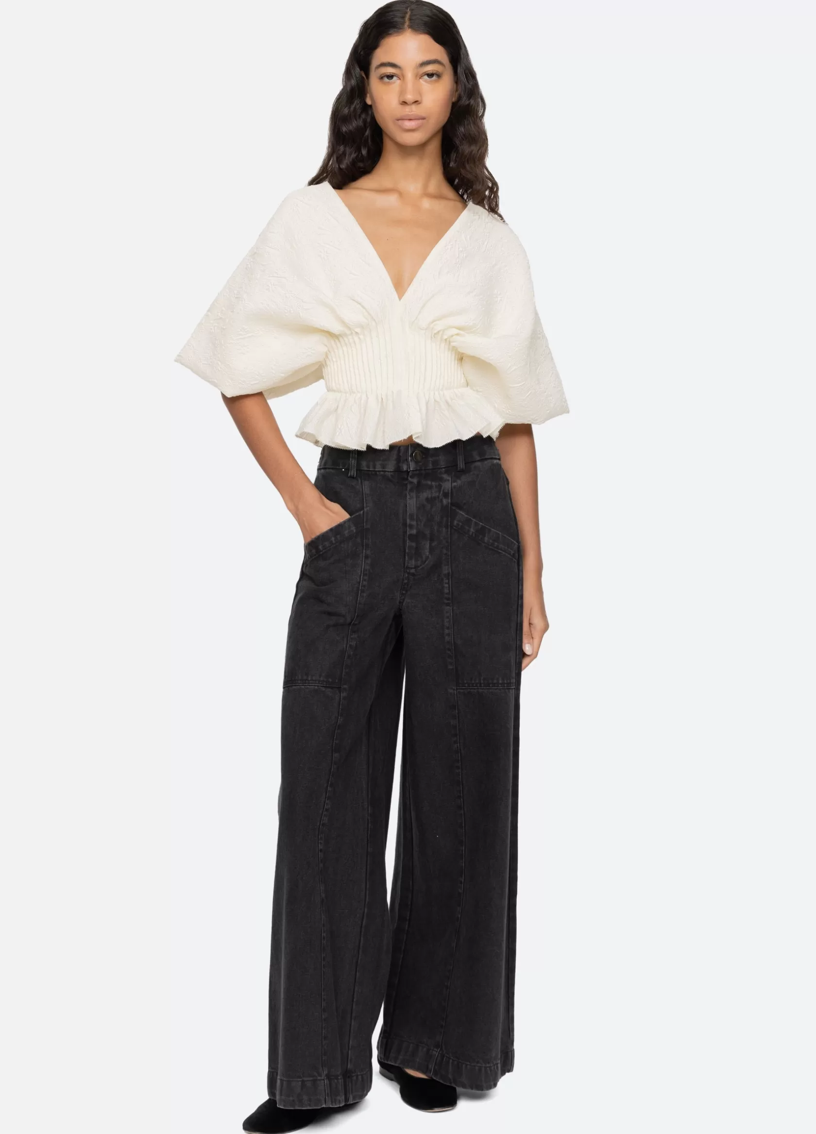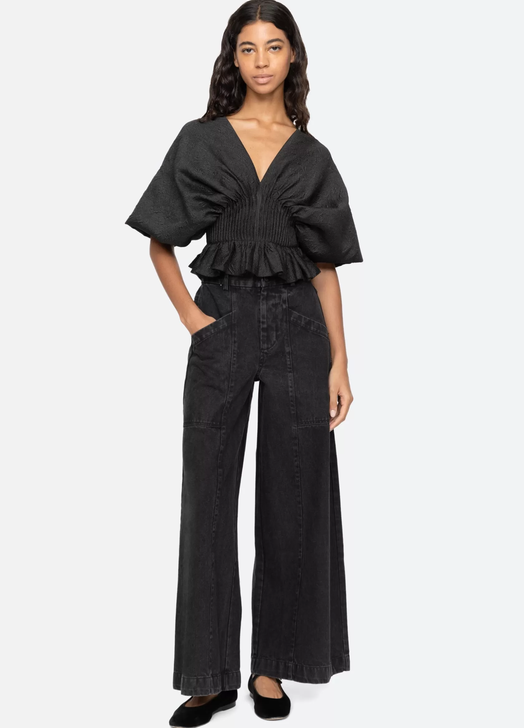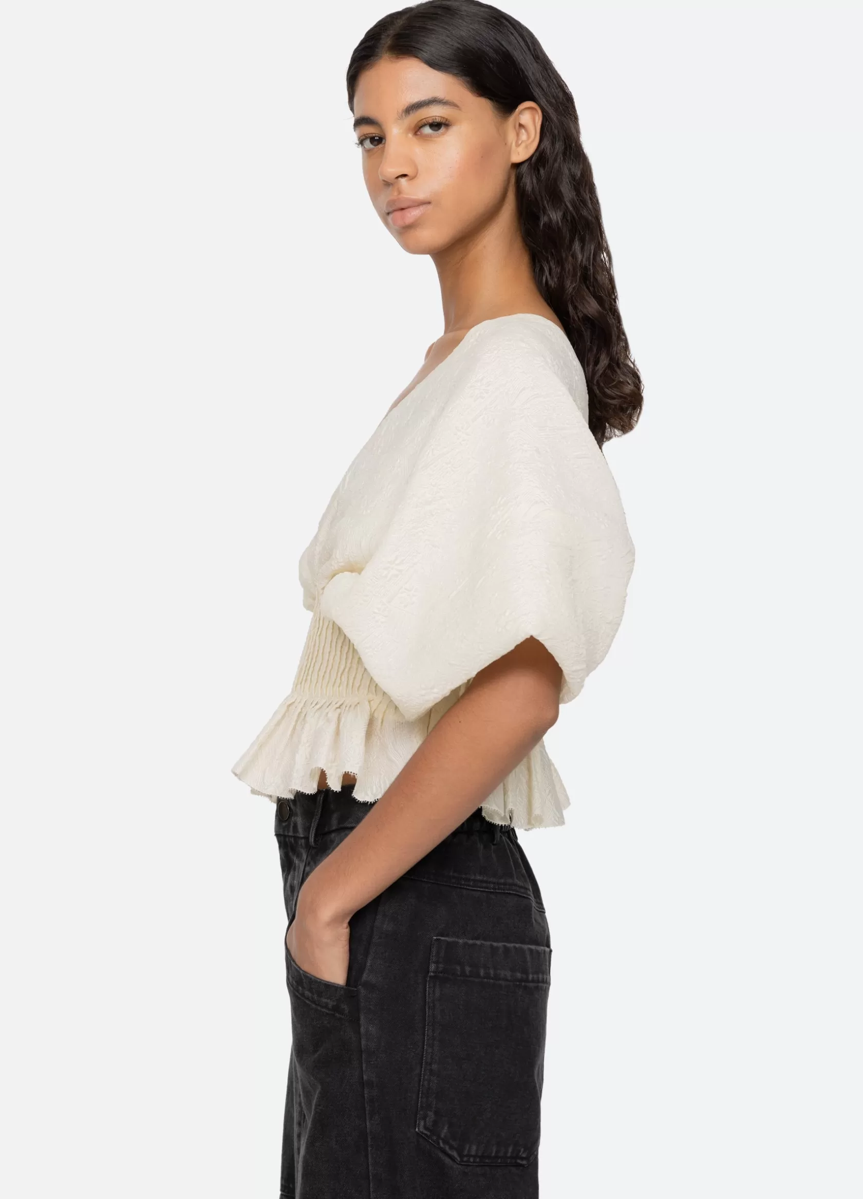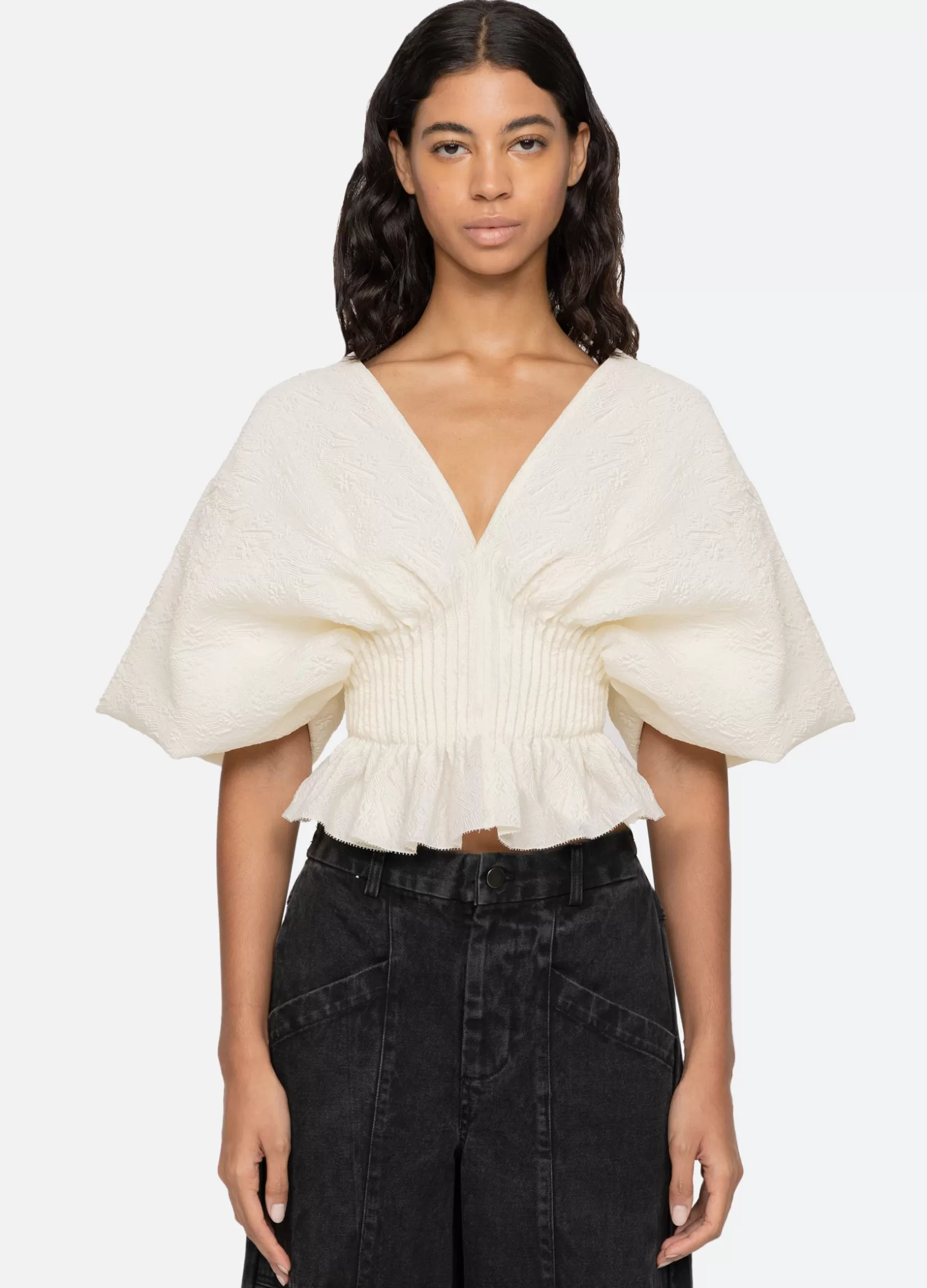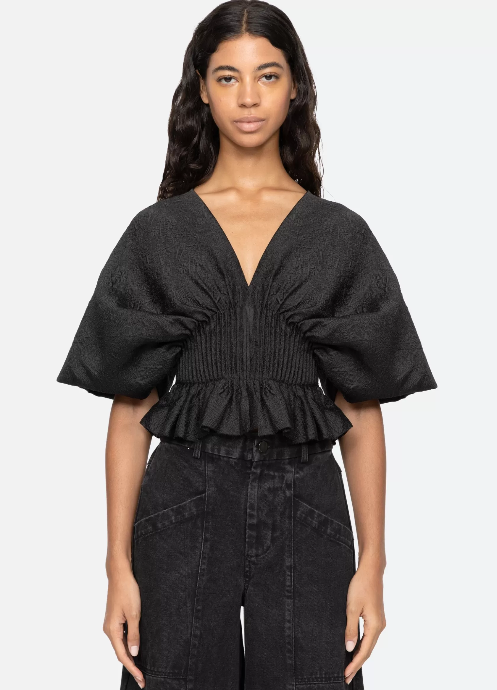 The Elegi jacquard top features an oversized sleeve with pleated bodice, deep v-neckline and ruffle hem.