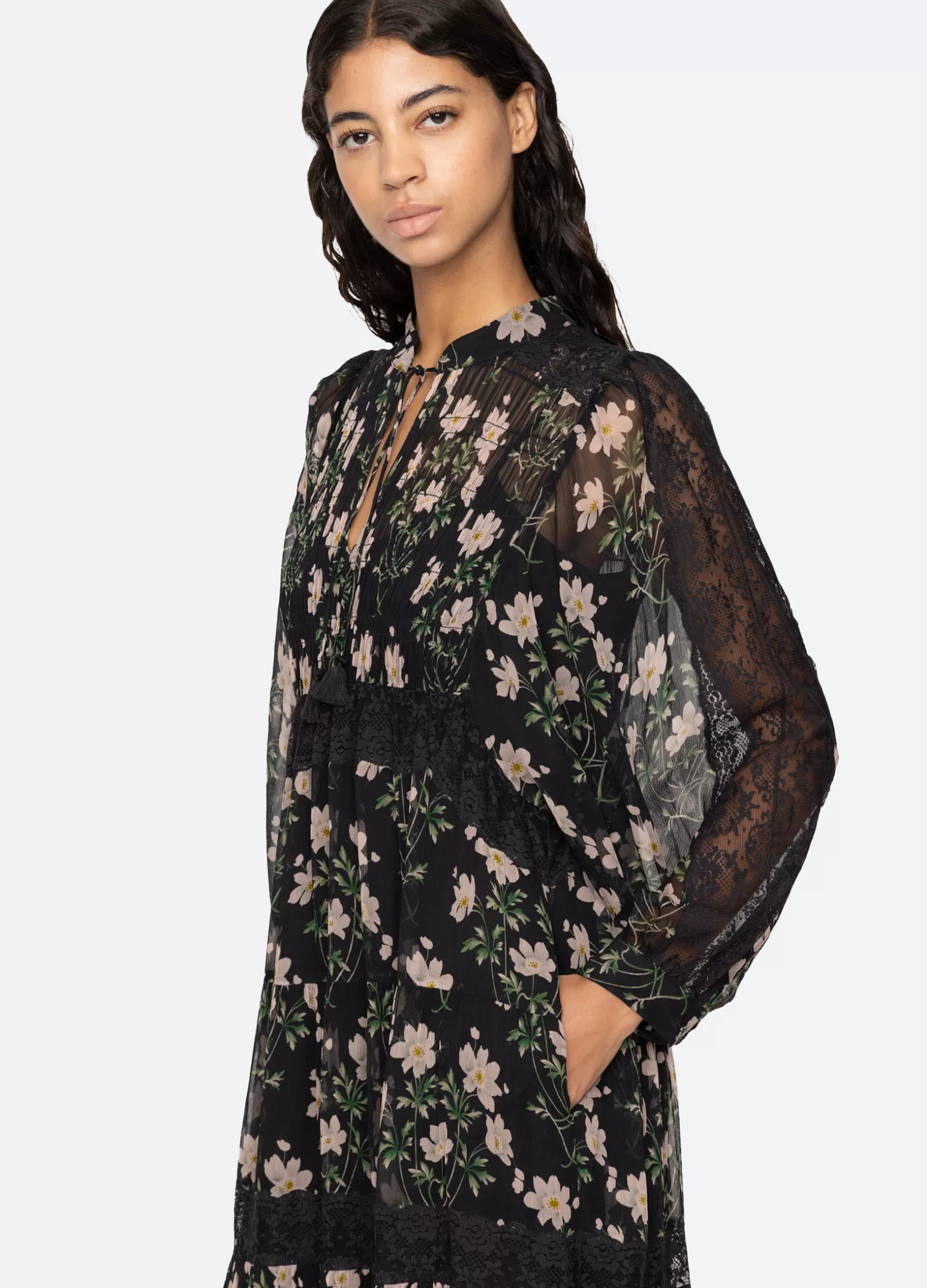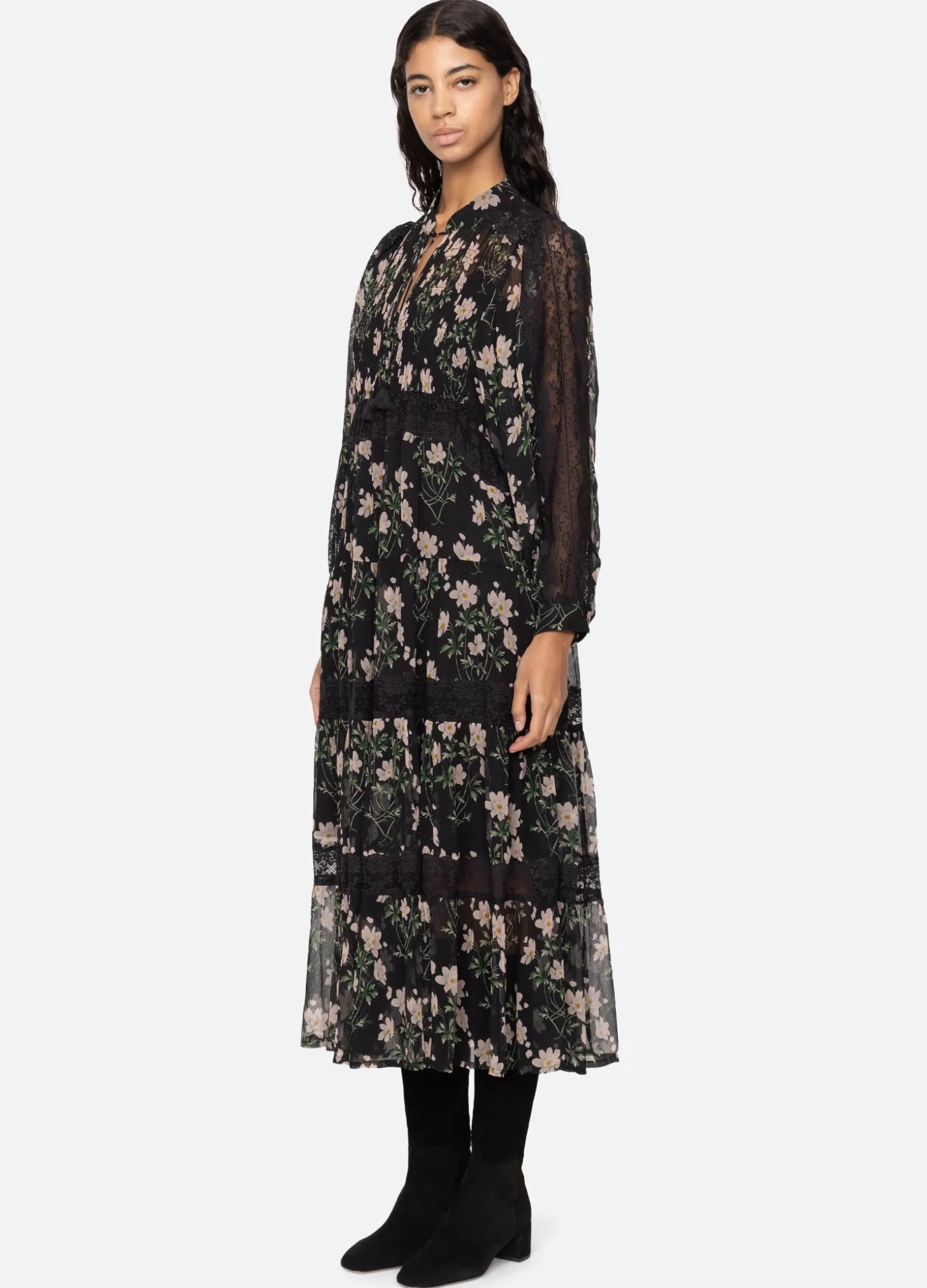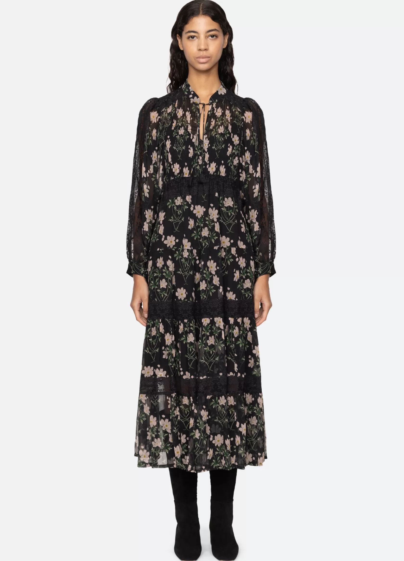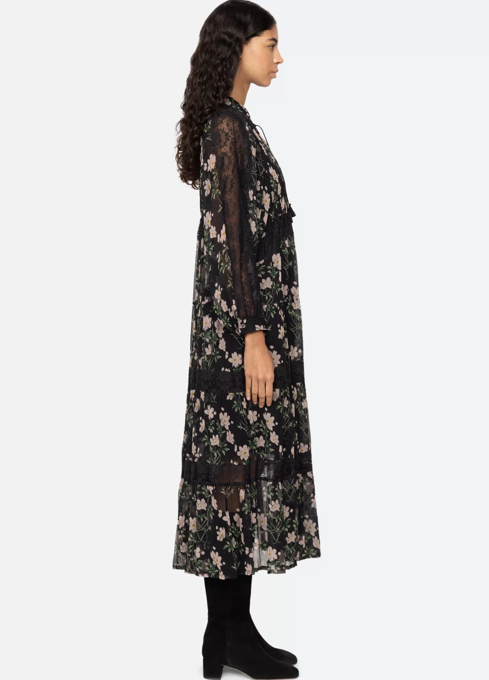 The Elizabeth floral print dress features a midi silhouette, delicate lace inserts, tiered skirt and tassel neck ties.