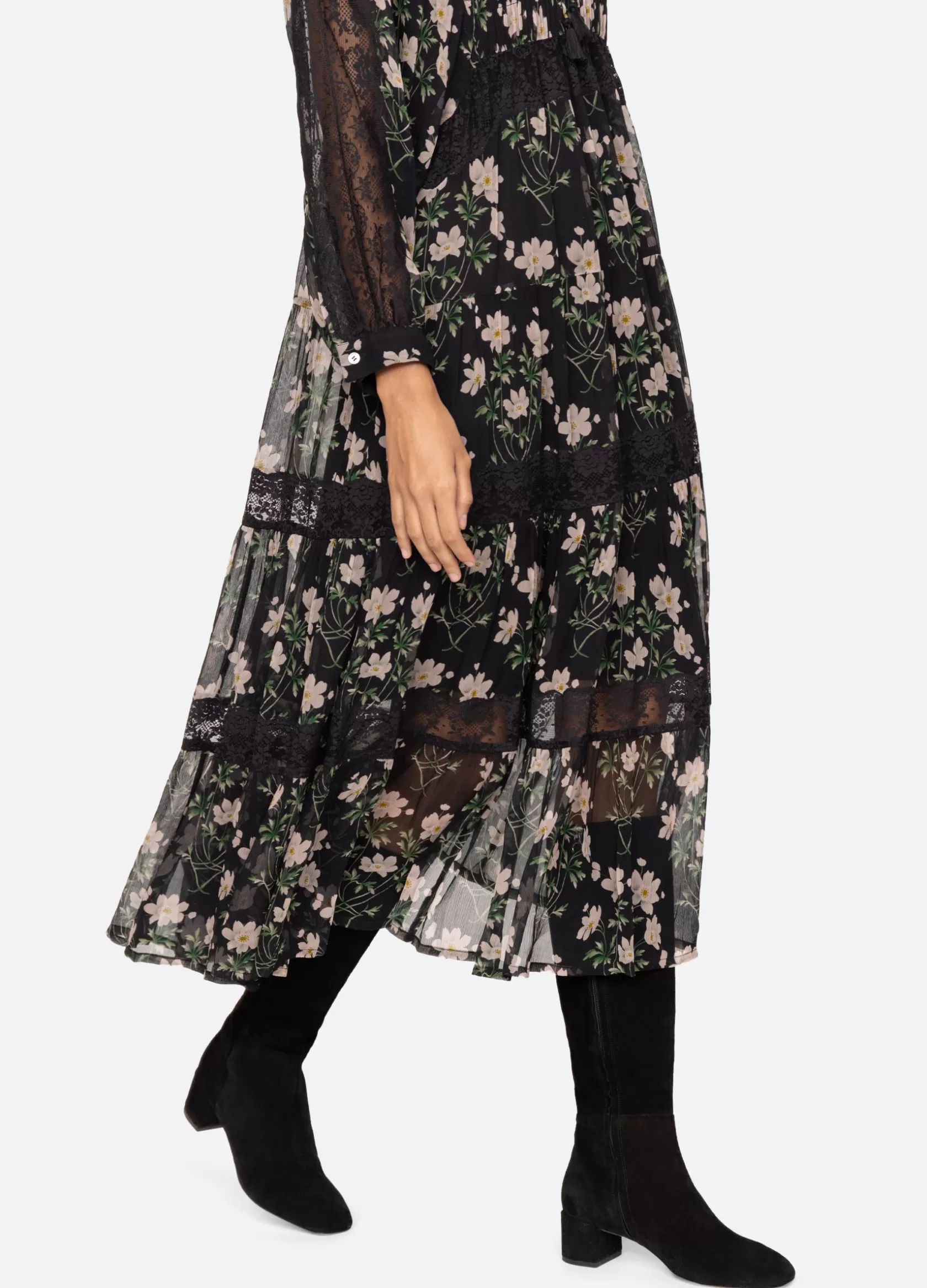 The Elizabeth floral print dress features a midi silhouette, delicate lace inserts, tiered skirt and tassel neck ties. …