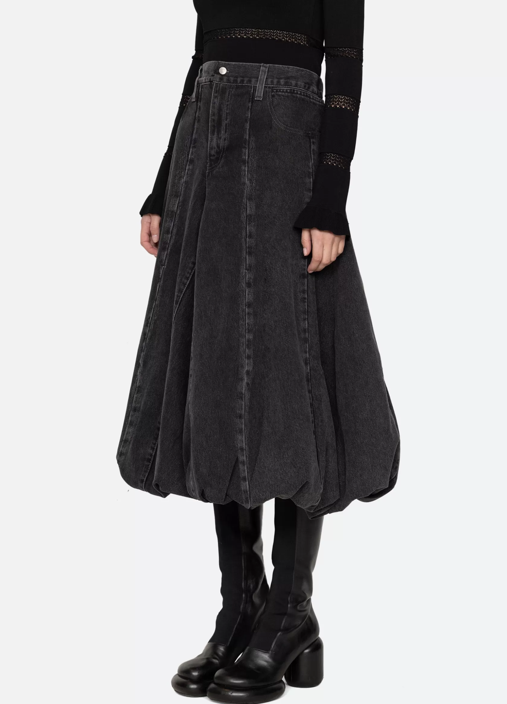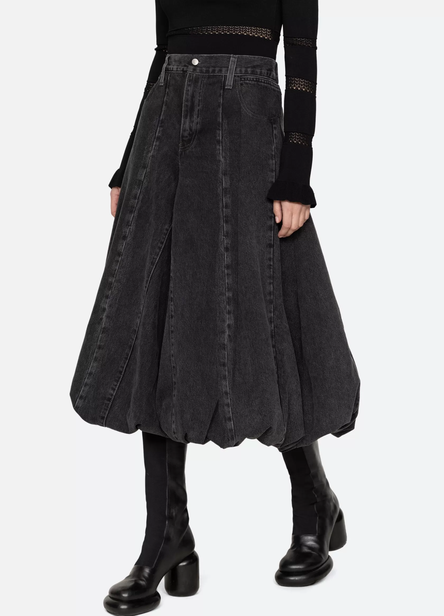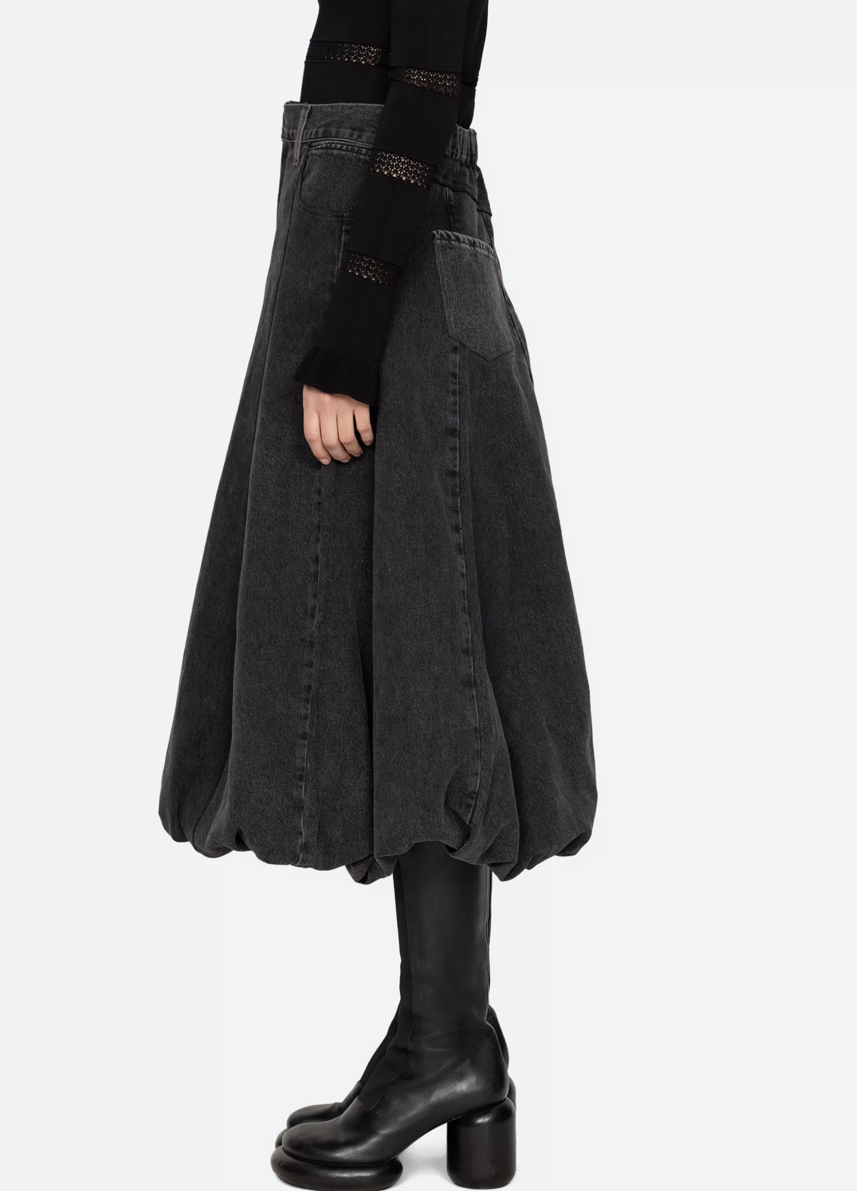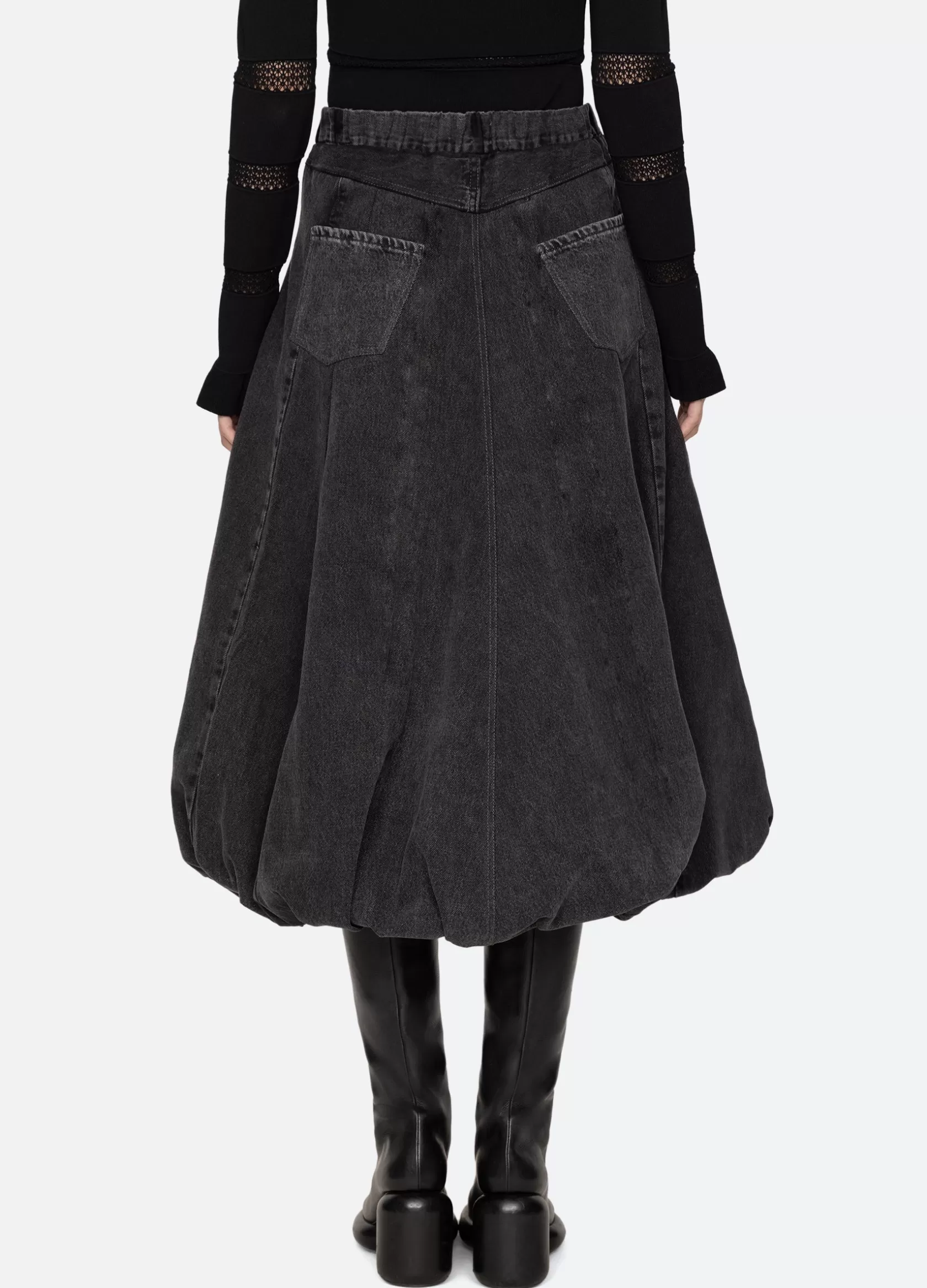 The Elle denim bubble skirt features a voluminous bubble hem and elasticized back.
