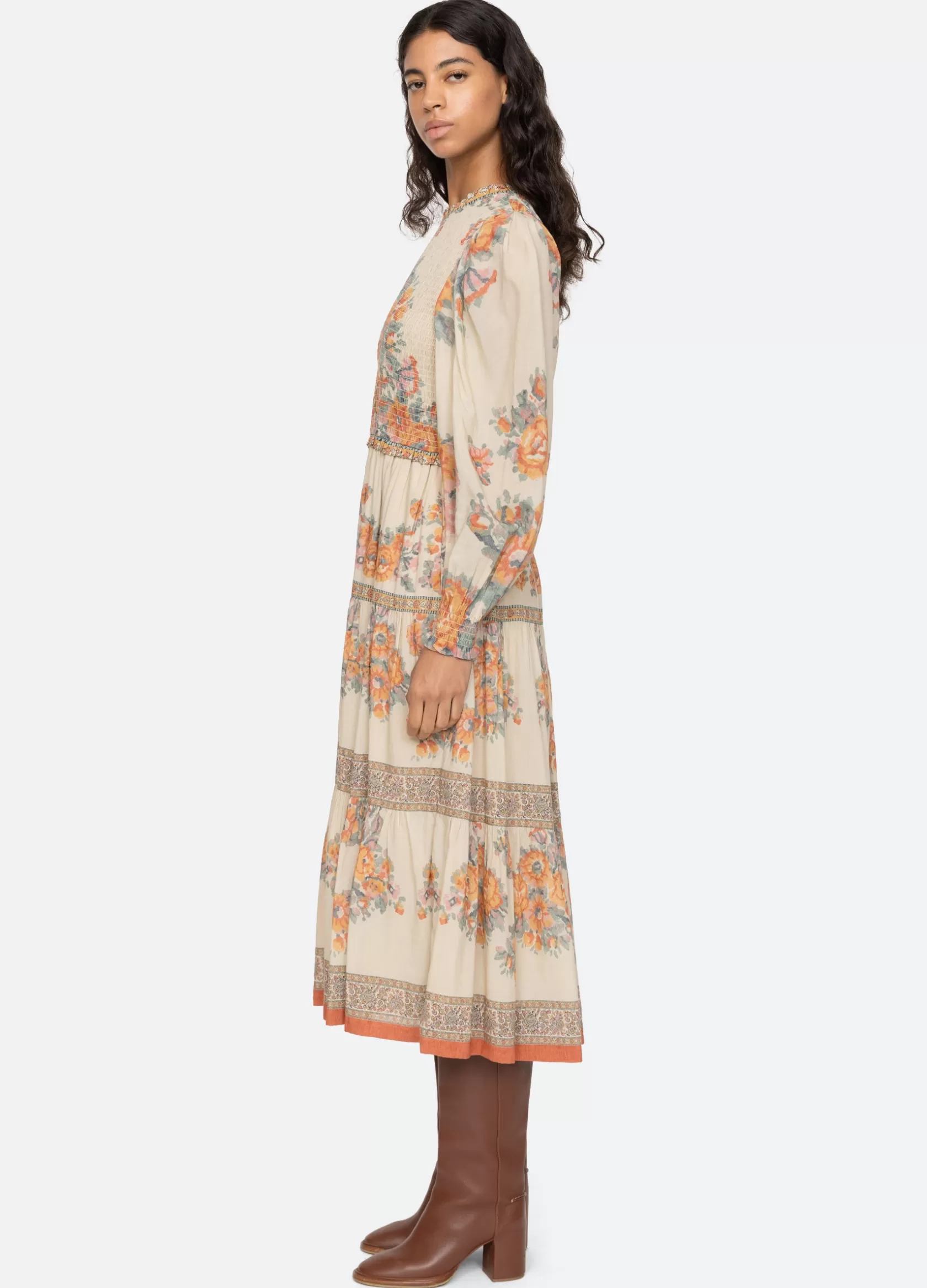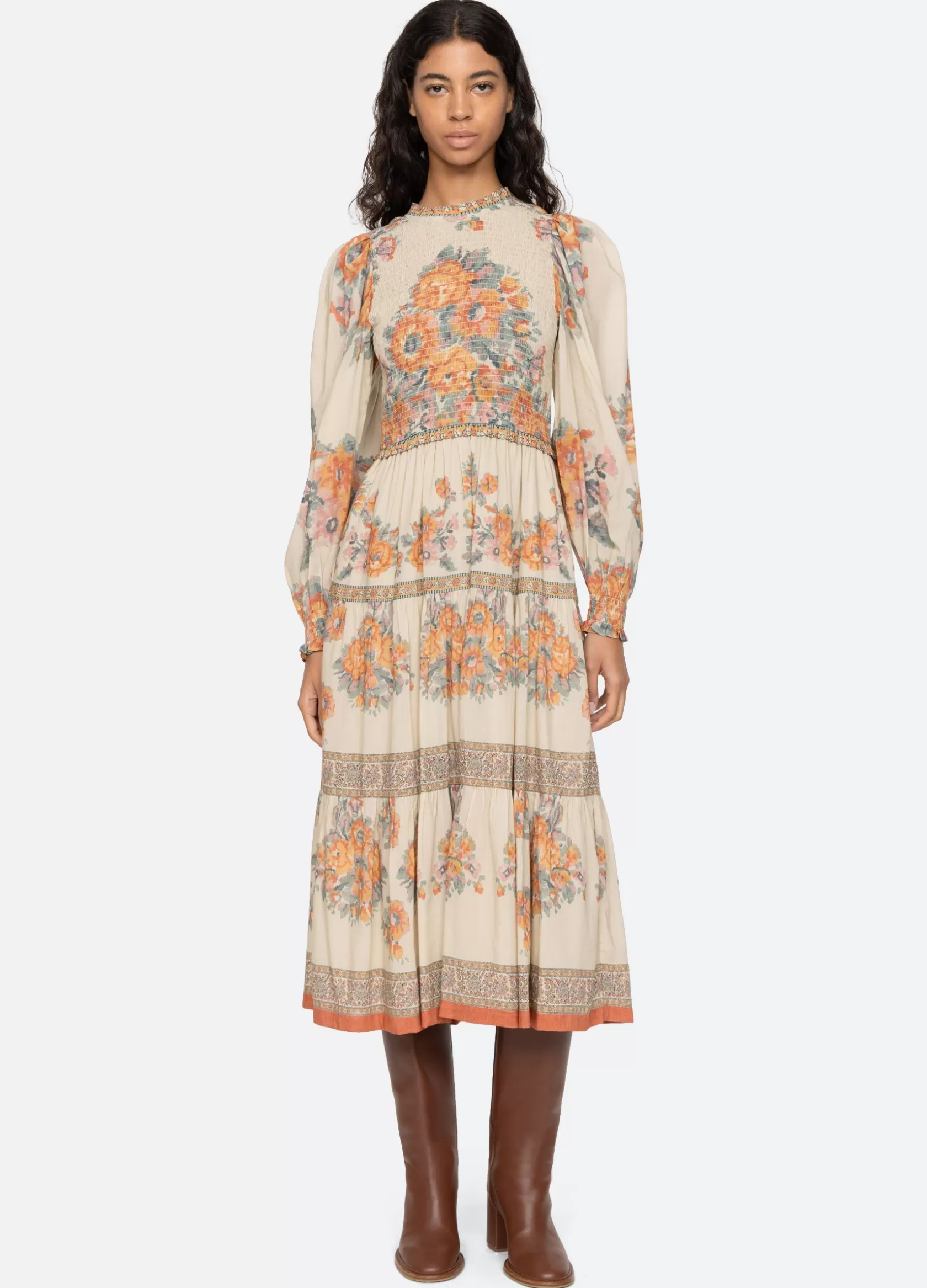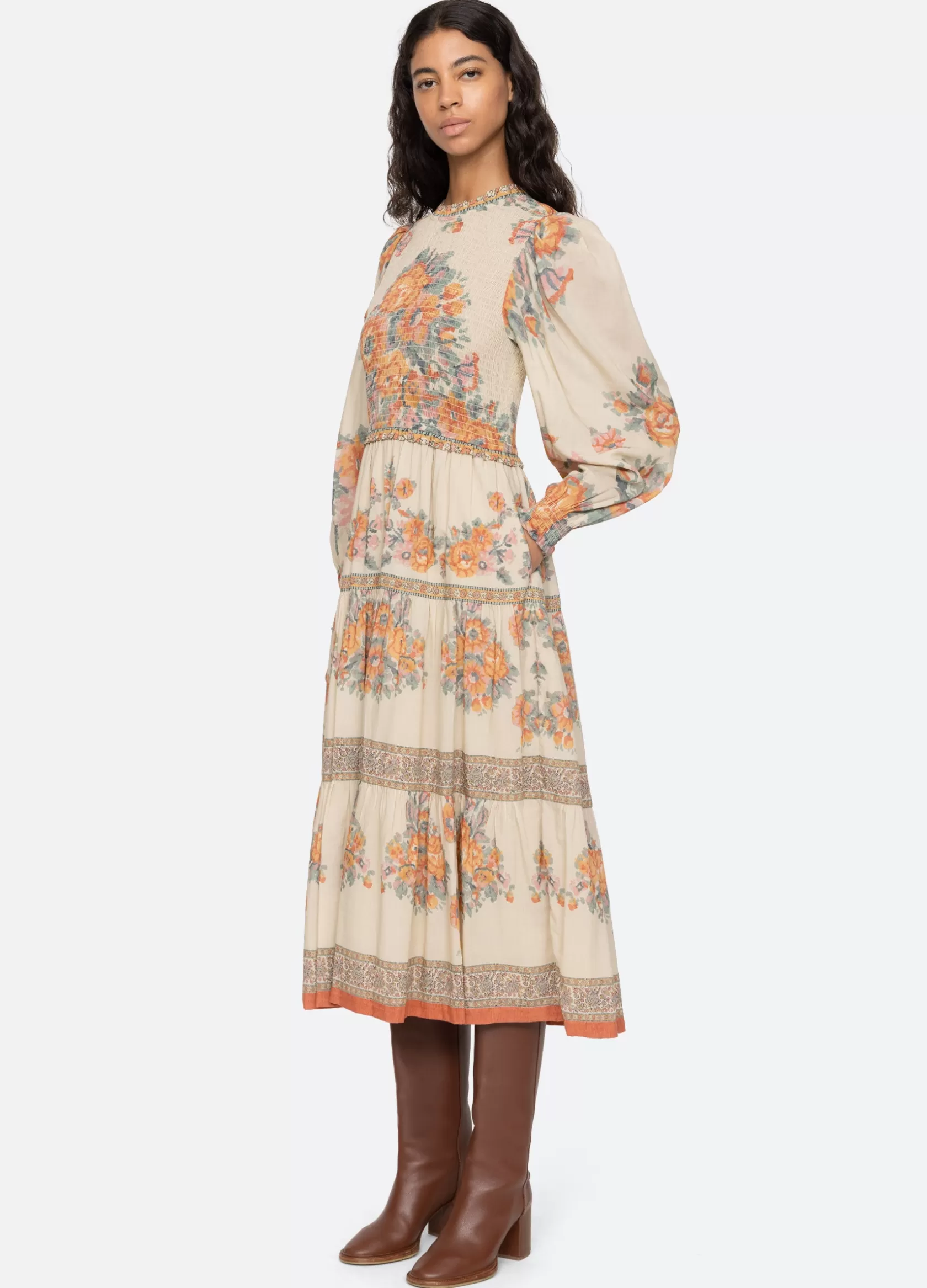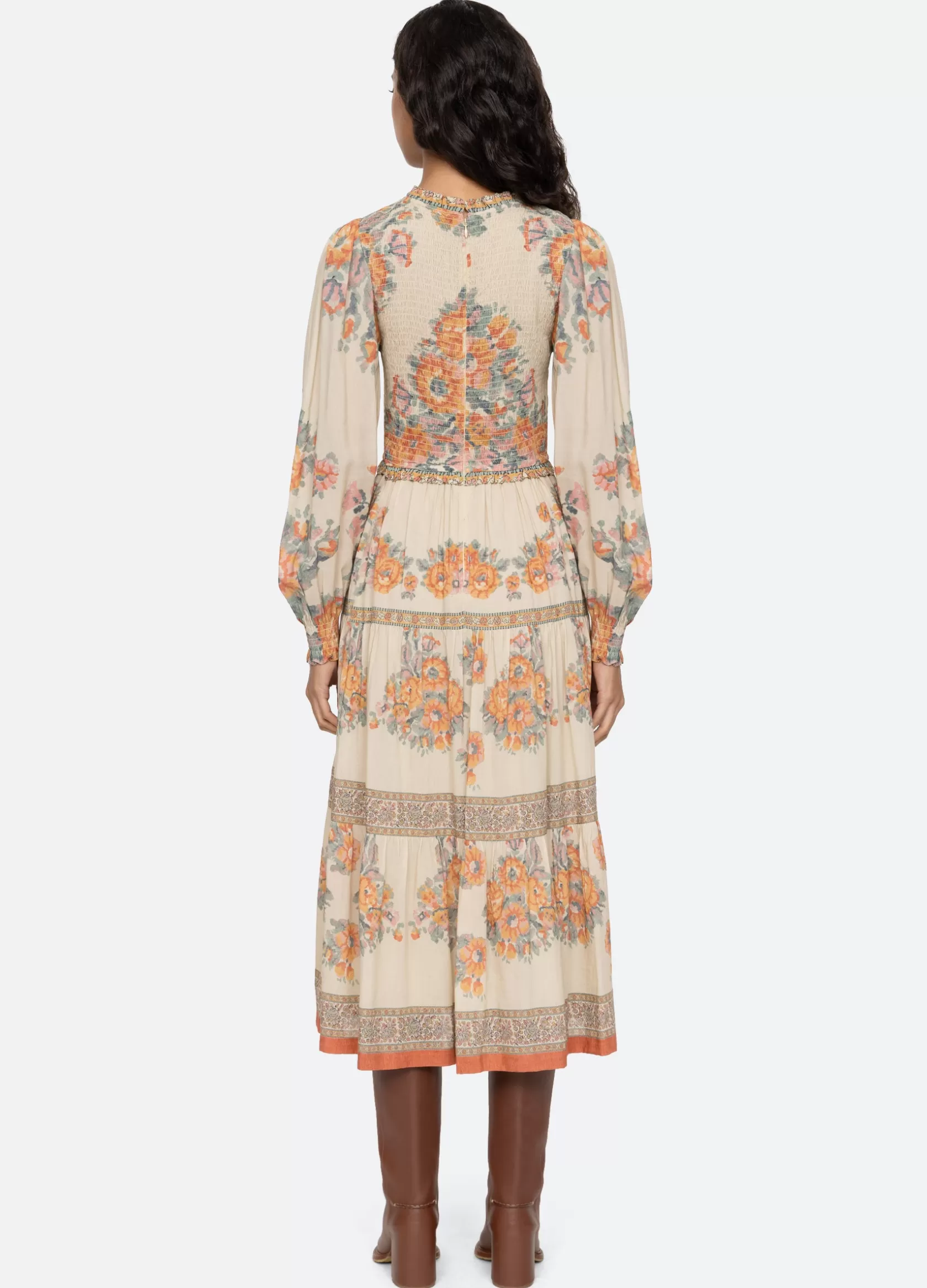 The Fiorella floral border print dress features a smocked bodice and voluminous long puff sleeves.