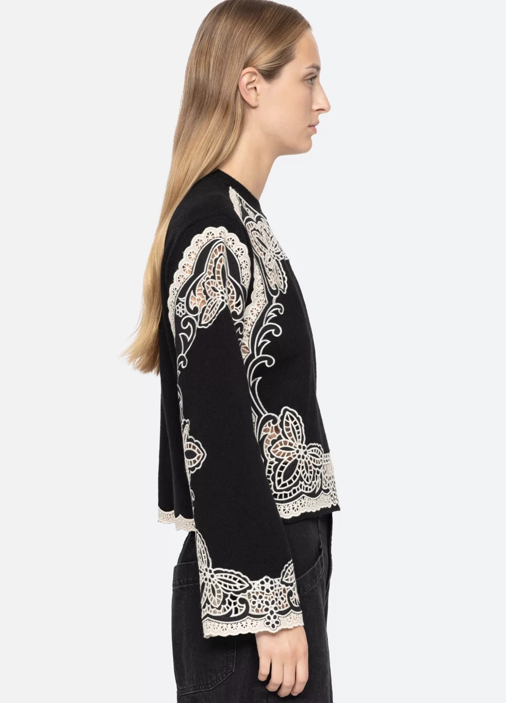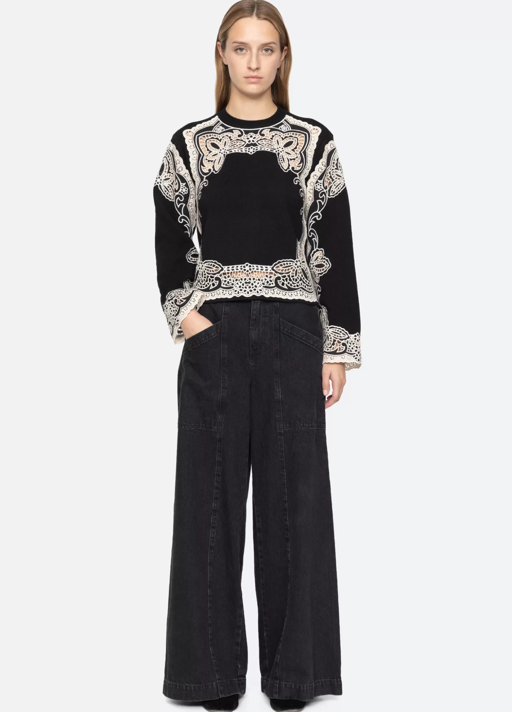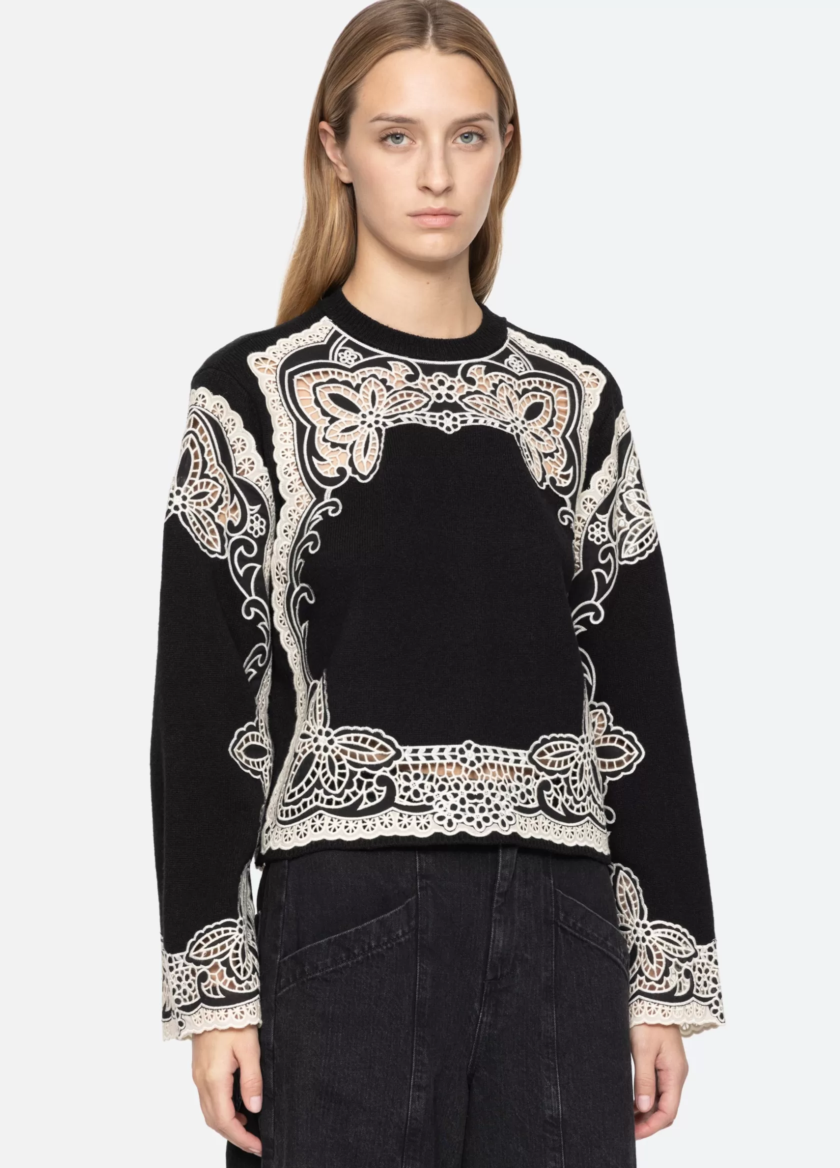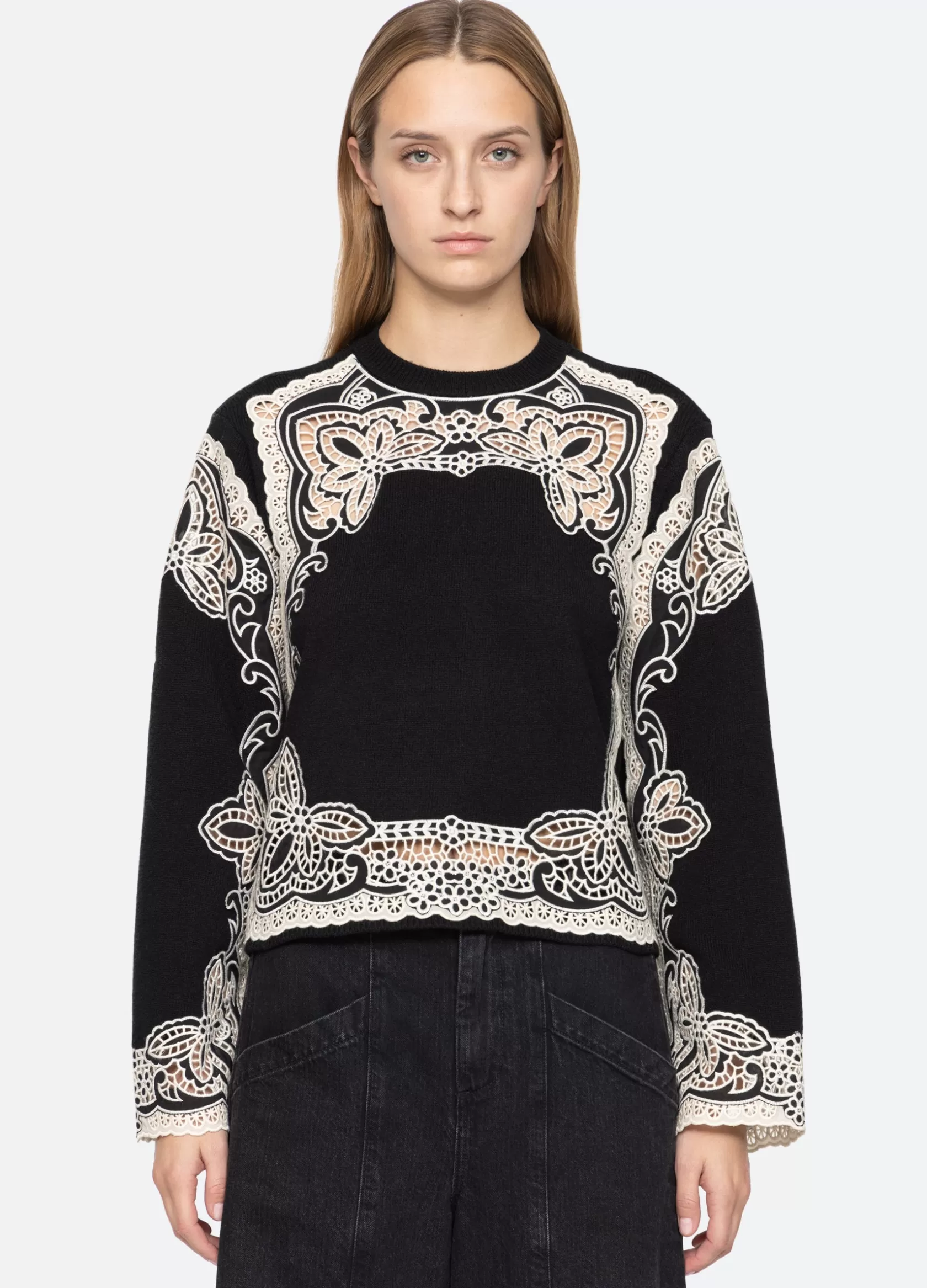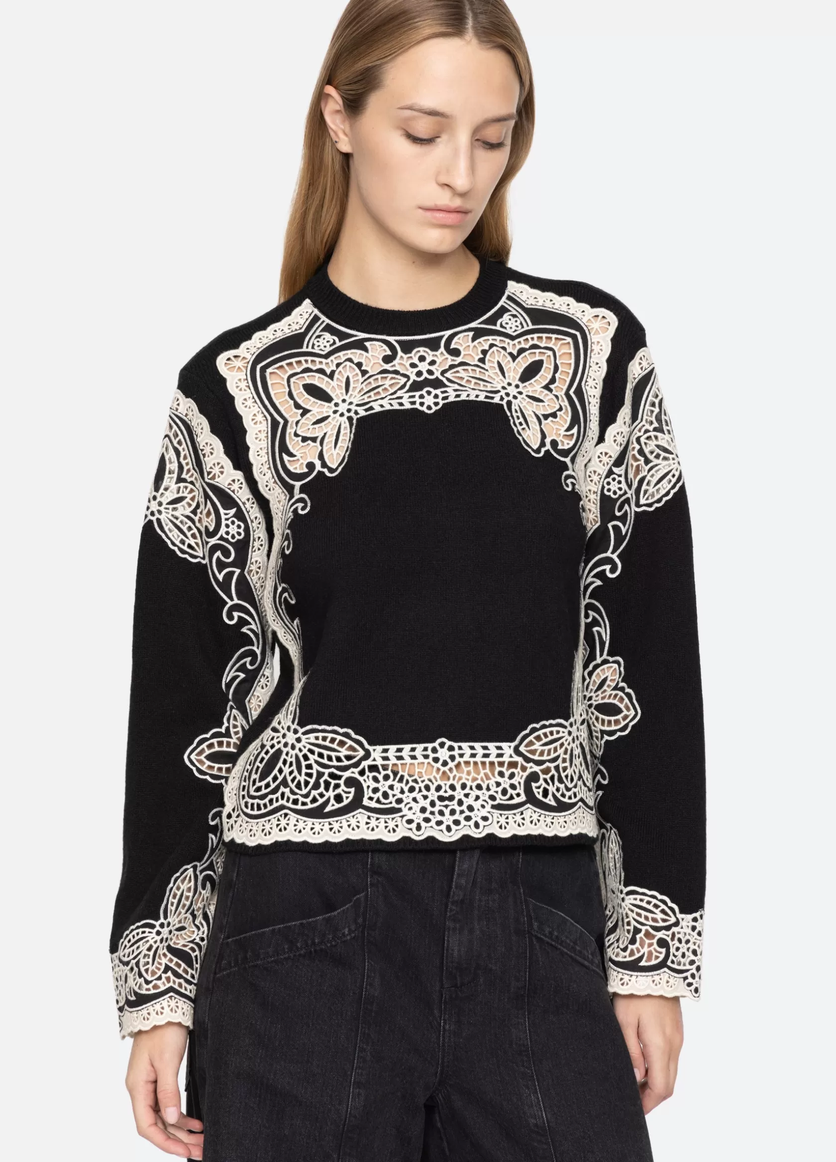 The Gianna knit combo sweater features embroidery and applique detailing throughout.
