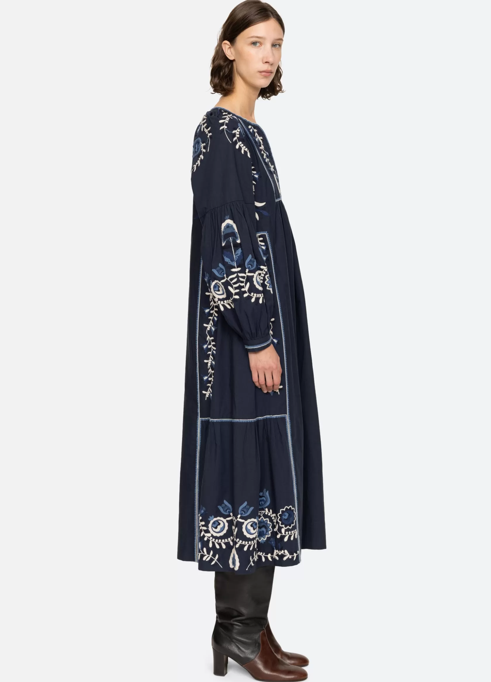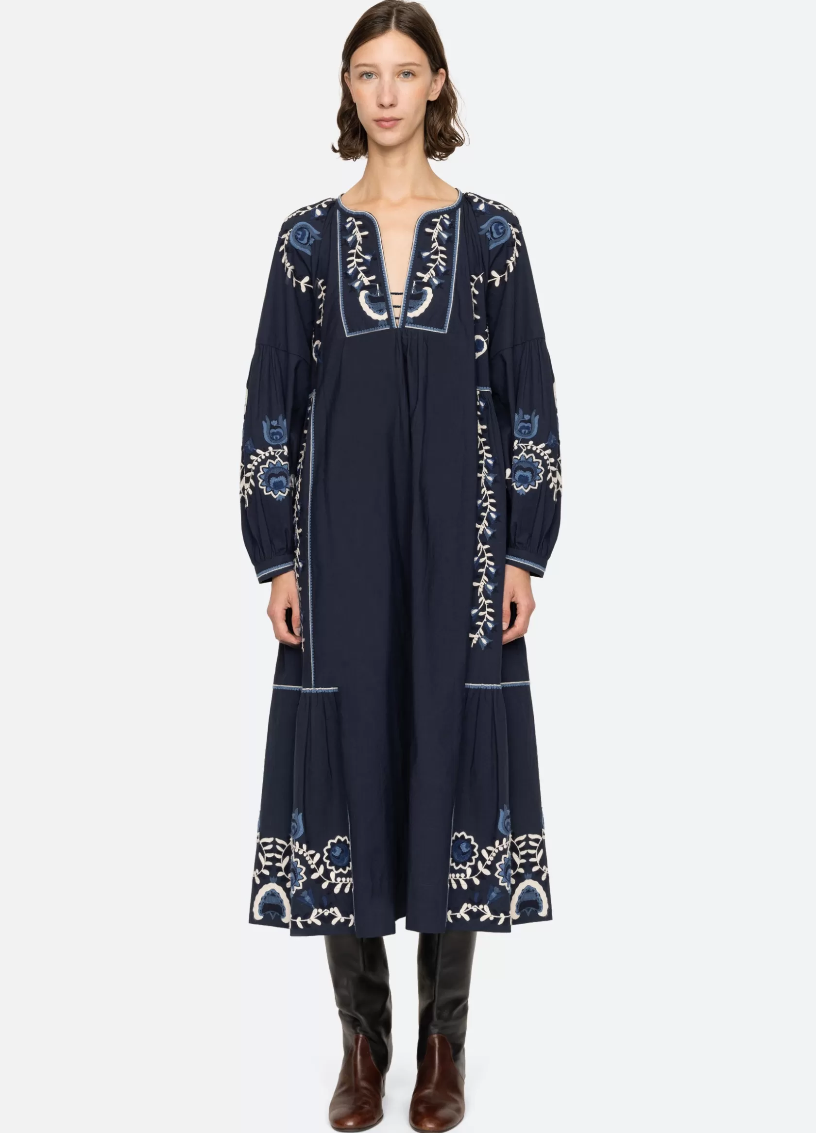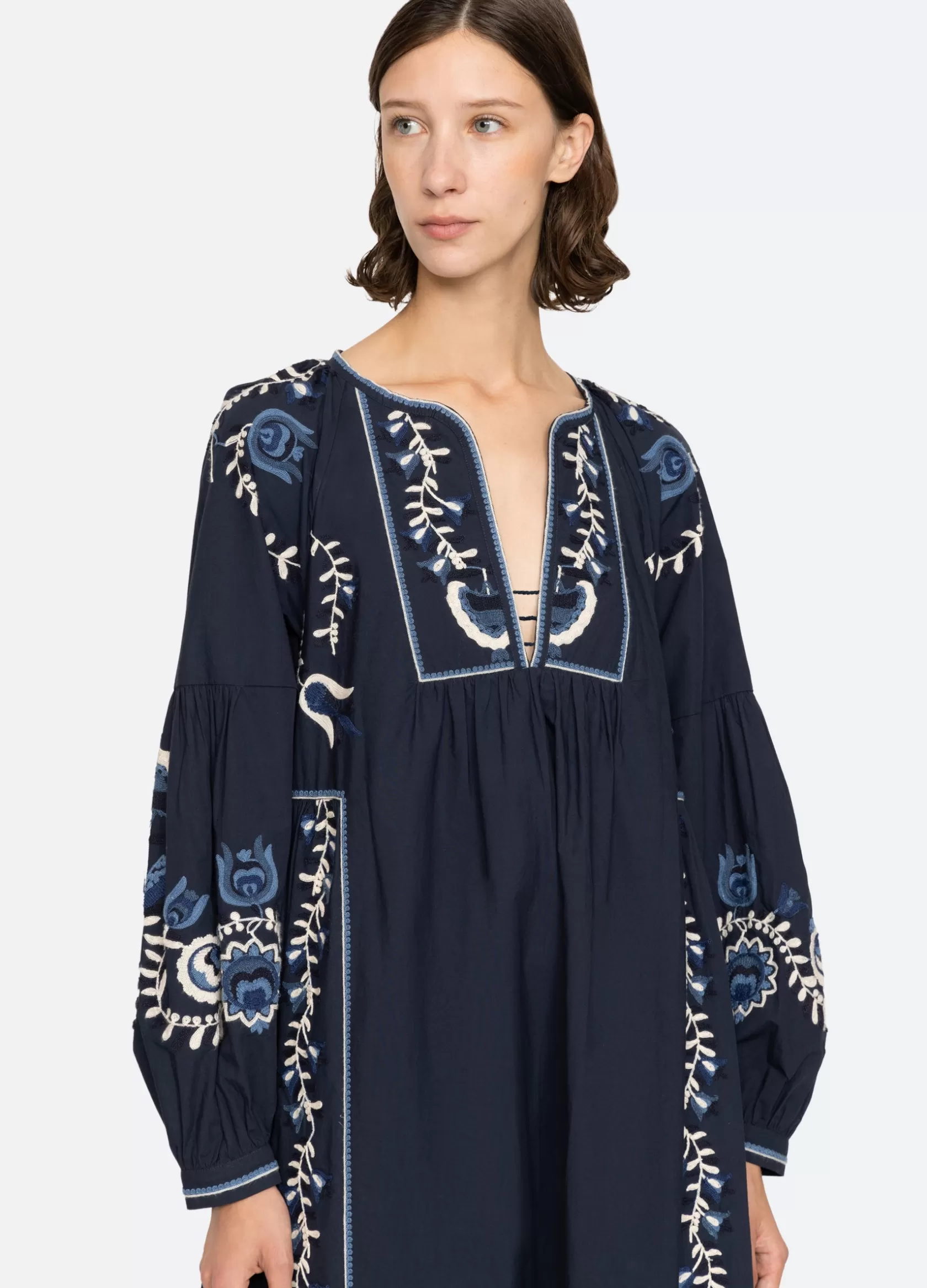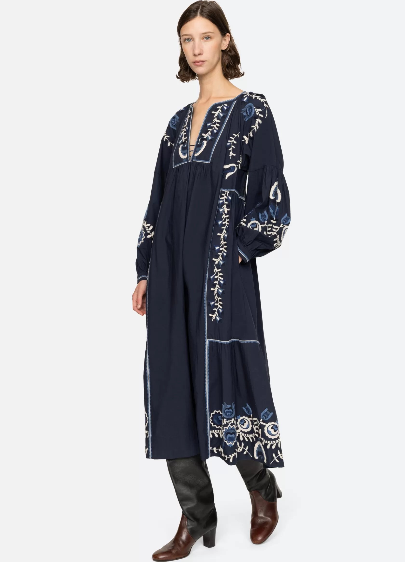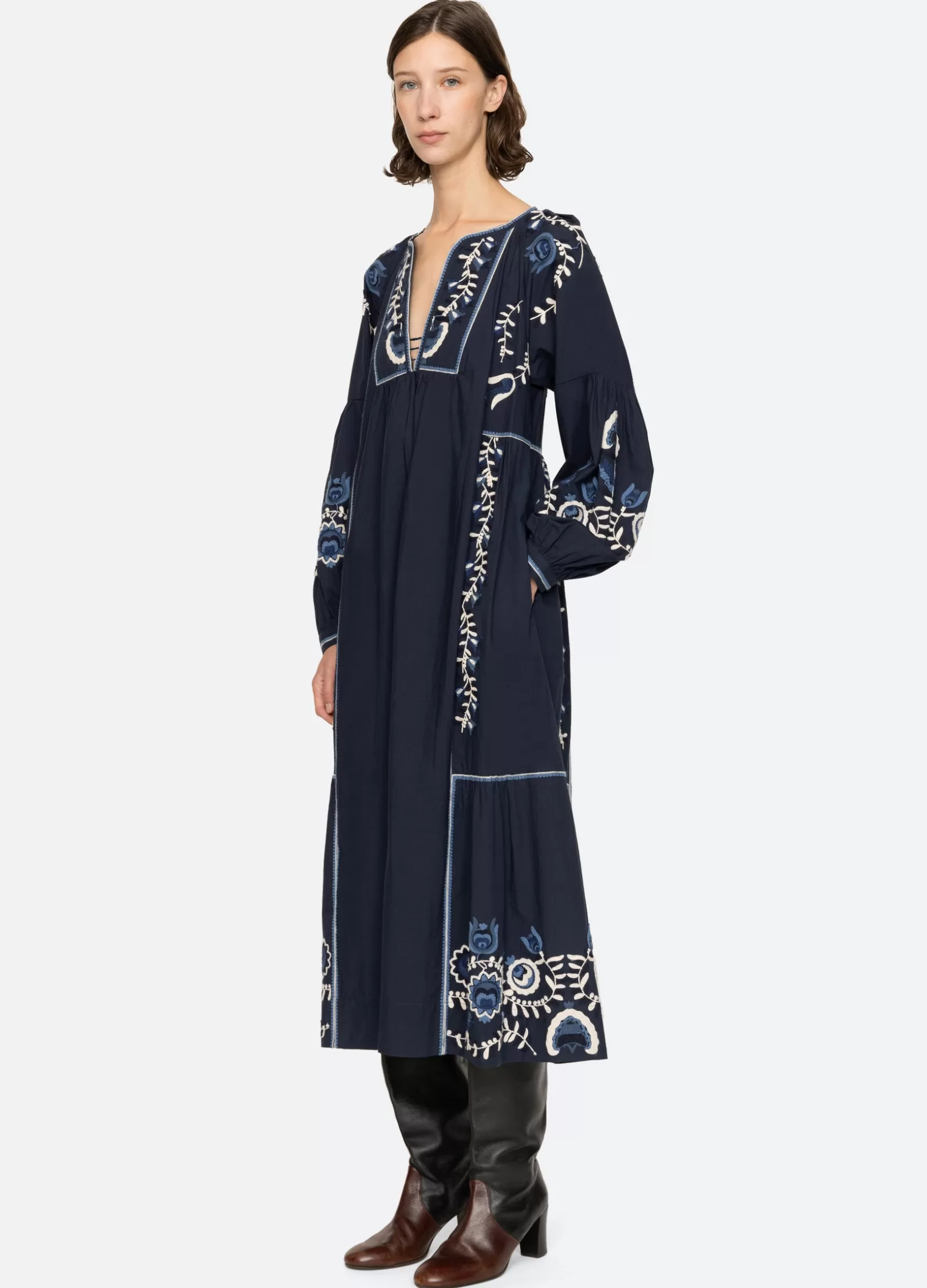 The Inga embroidered dress features long puff sleeves, deep v-neckline and floral embroidery throughout.