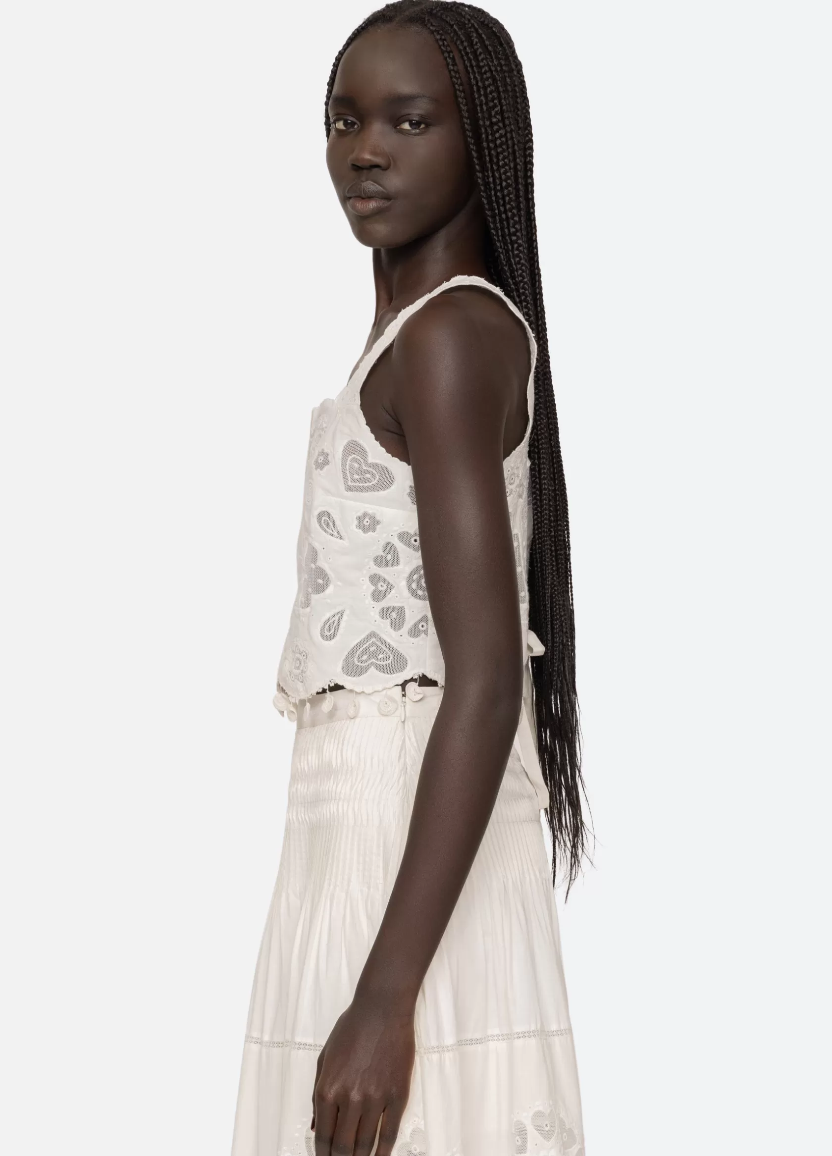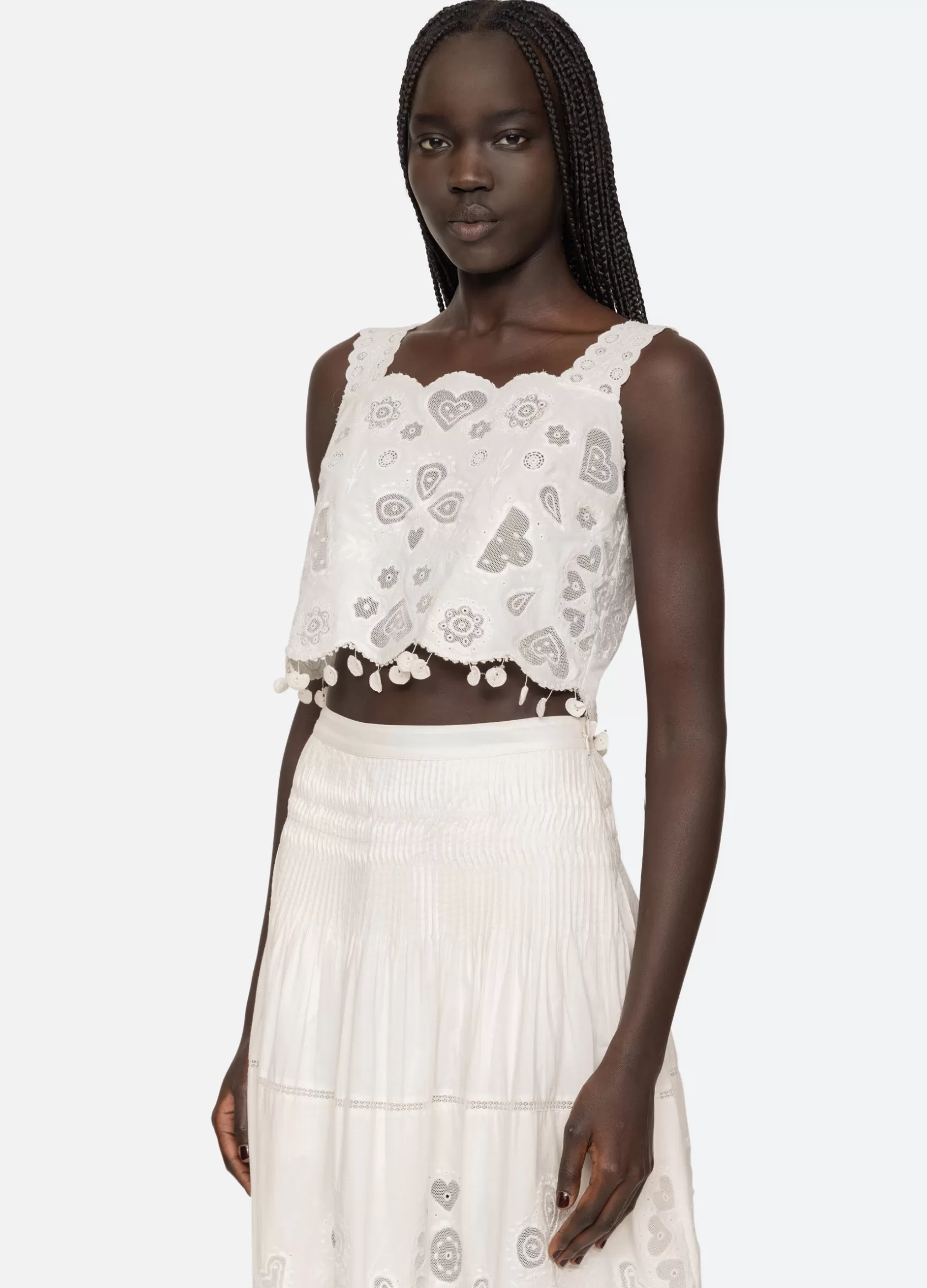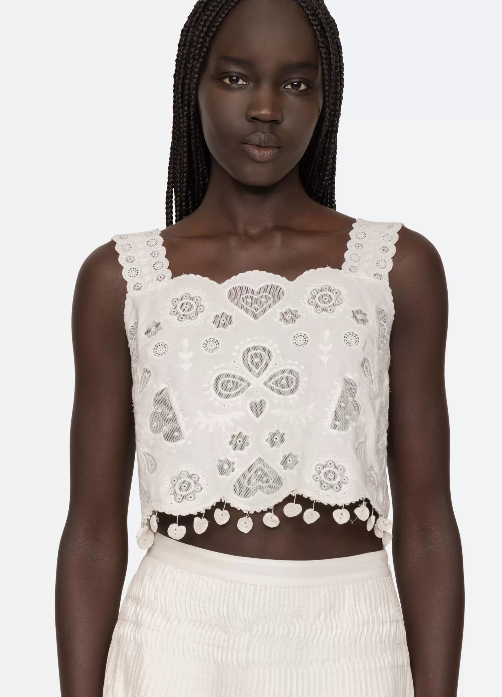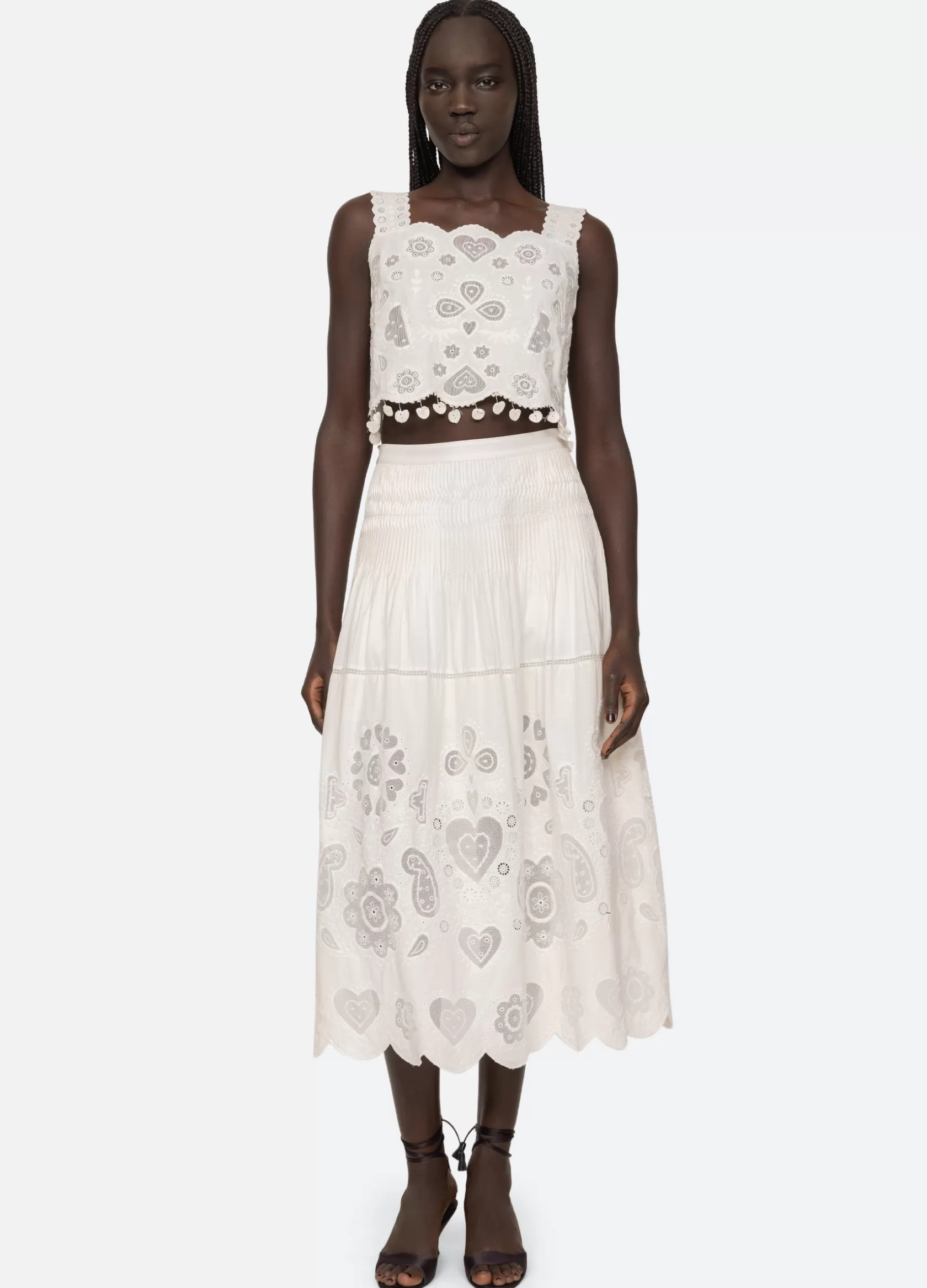 The Jeanetta eyelet top features delicate eyelet detailing throughout, scalloped hemline with crochet hearts and tie back closures.