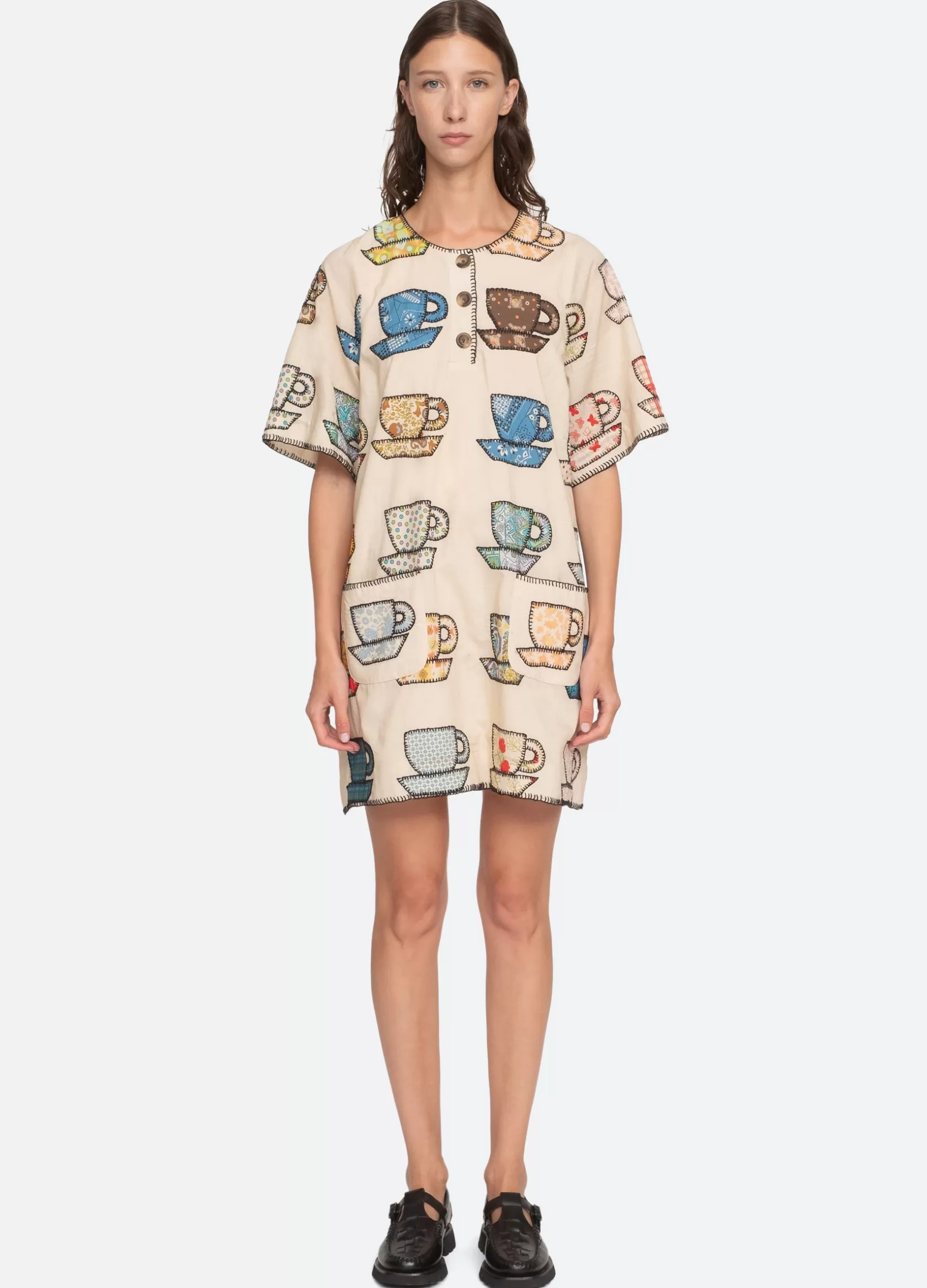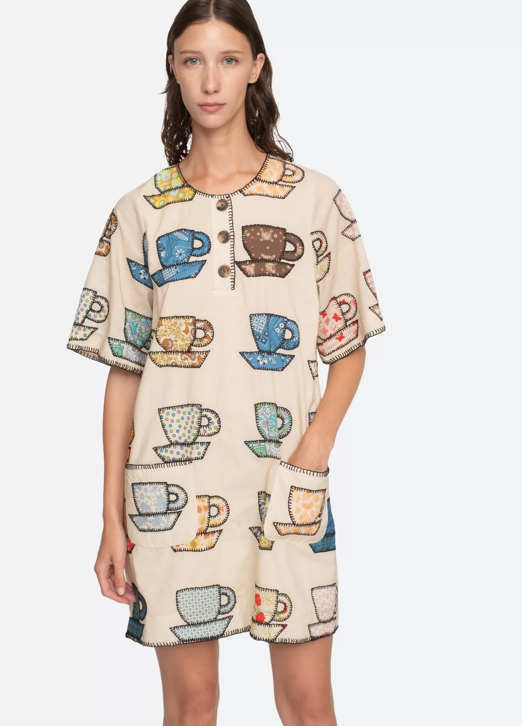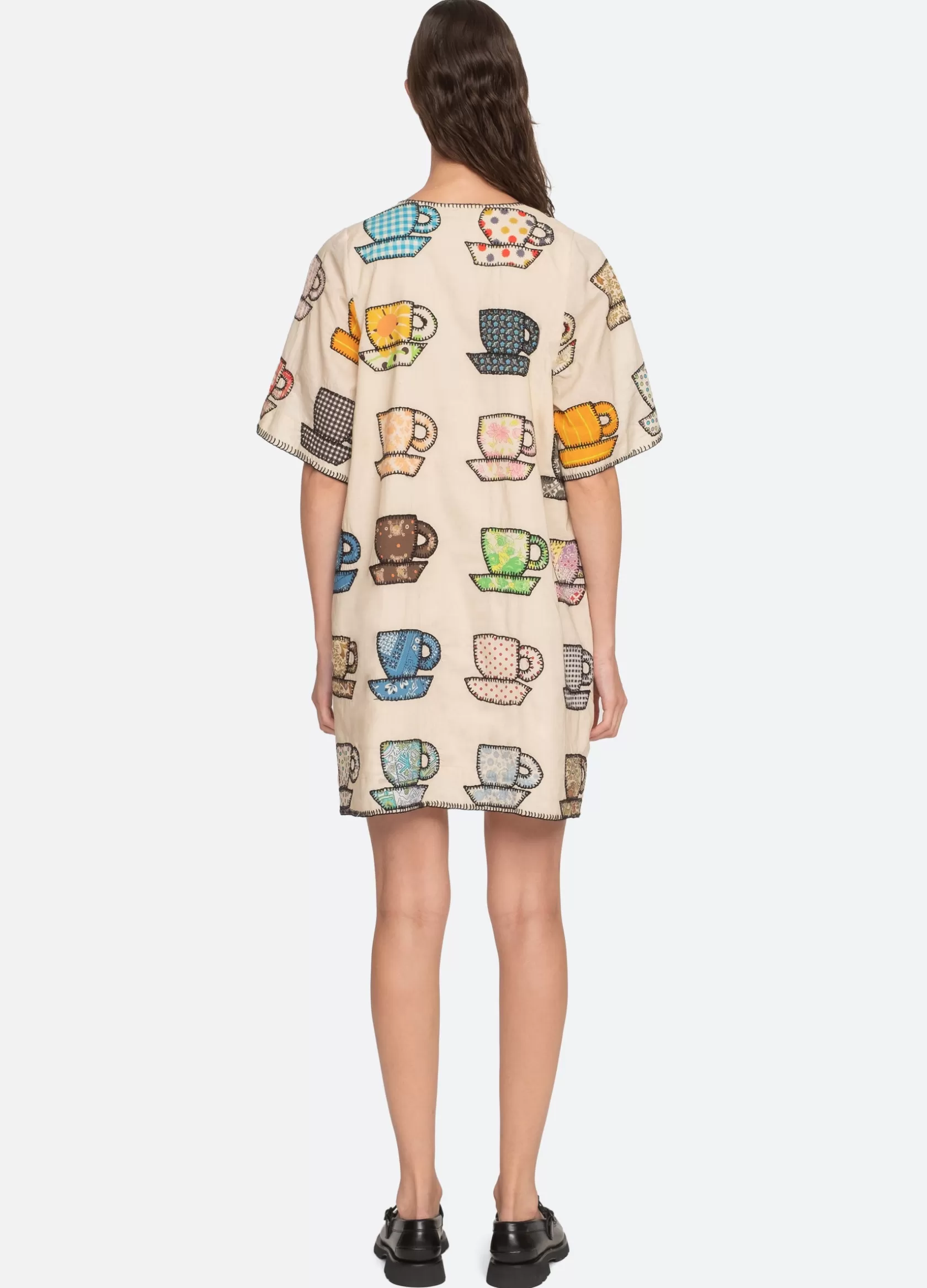 The Karmen tea cup embroidered dress features short sleeves, mini silhouette and playful tea cup print. Designed for an easy, relaxed fit. Due to the handmade appliqué process, motif variations may occur form garment to garment. No two are exactly alike.