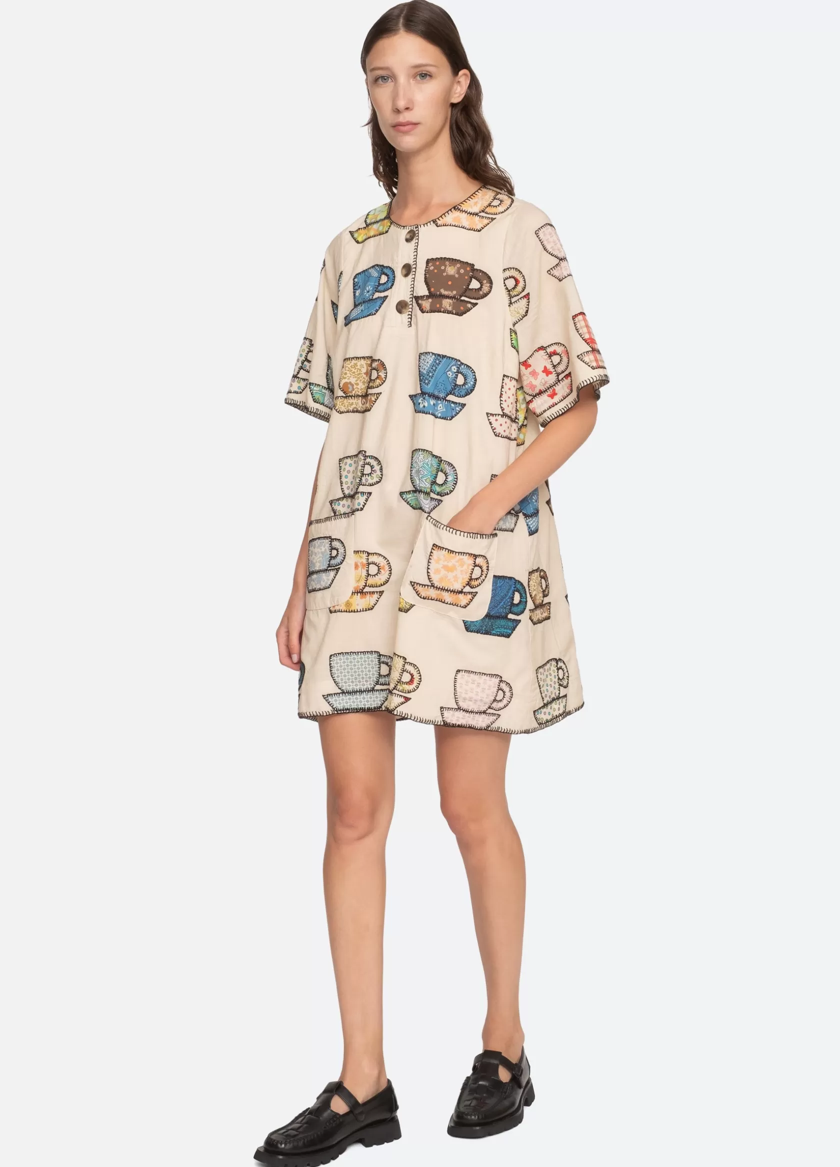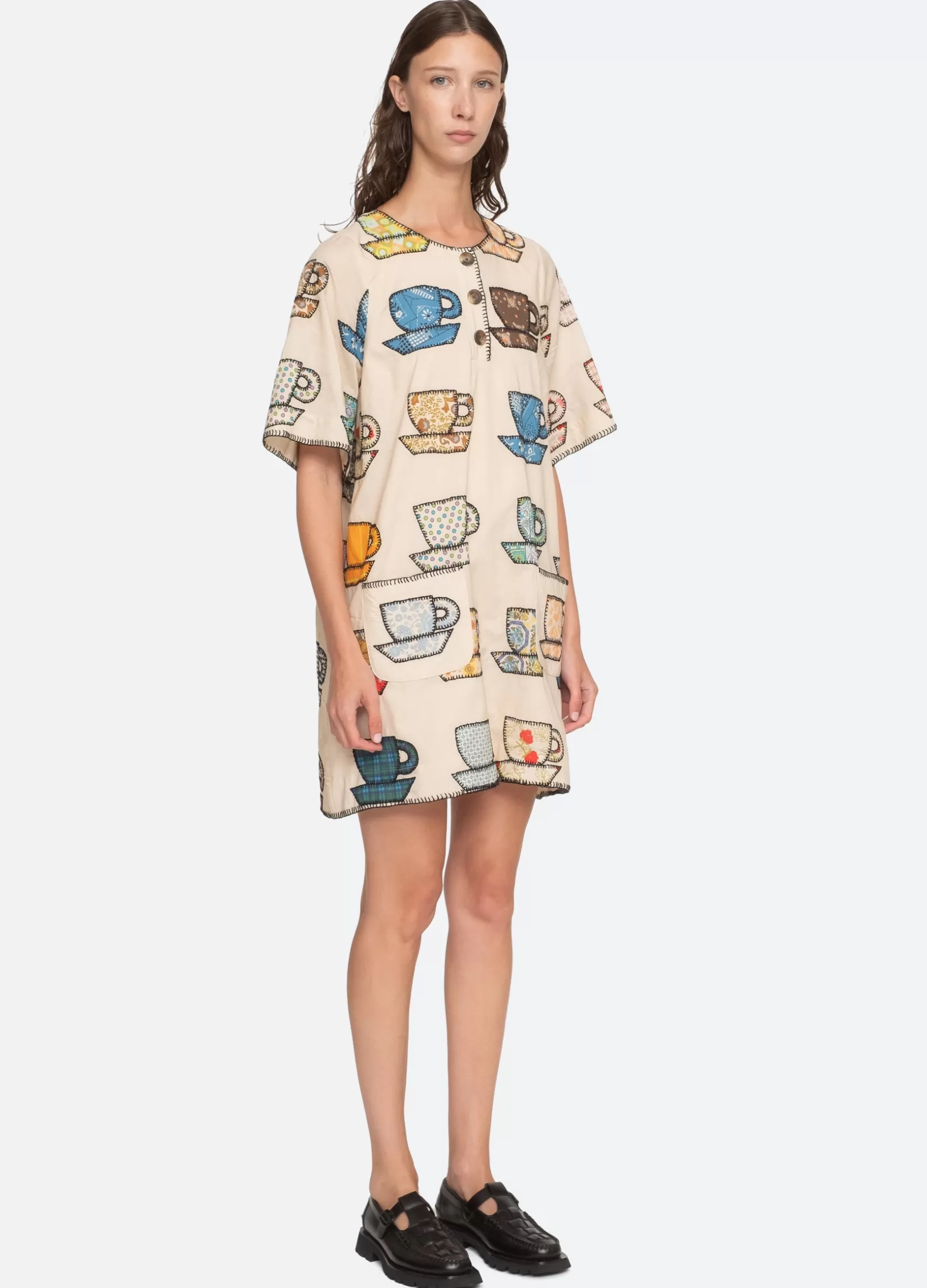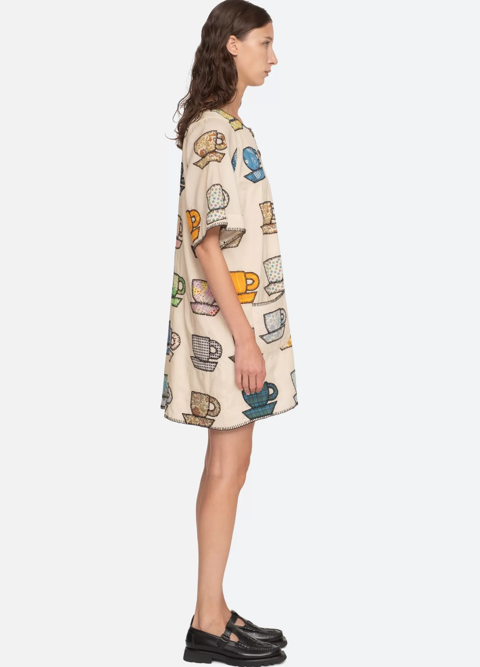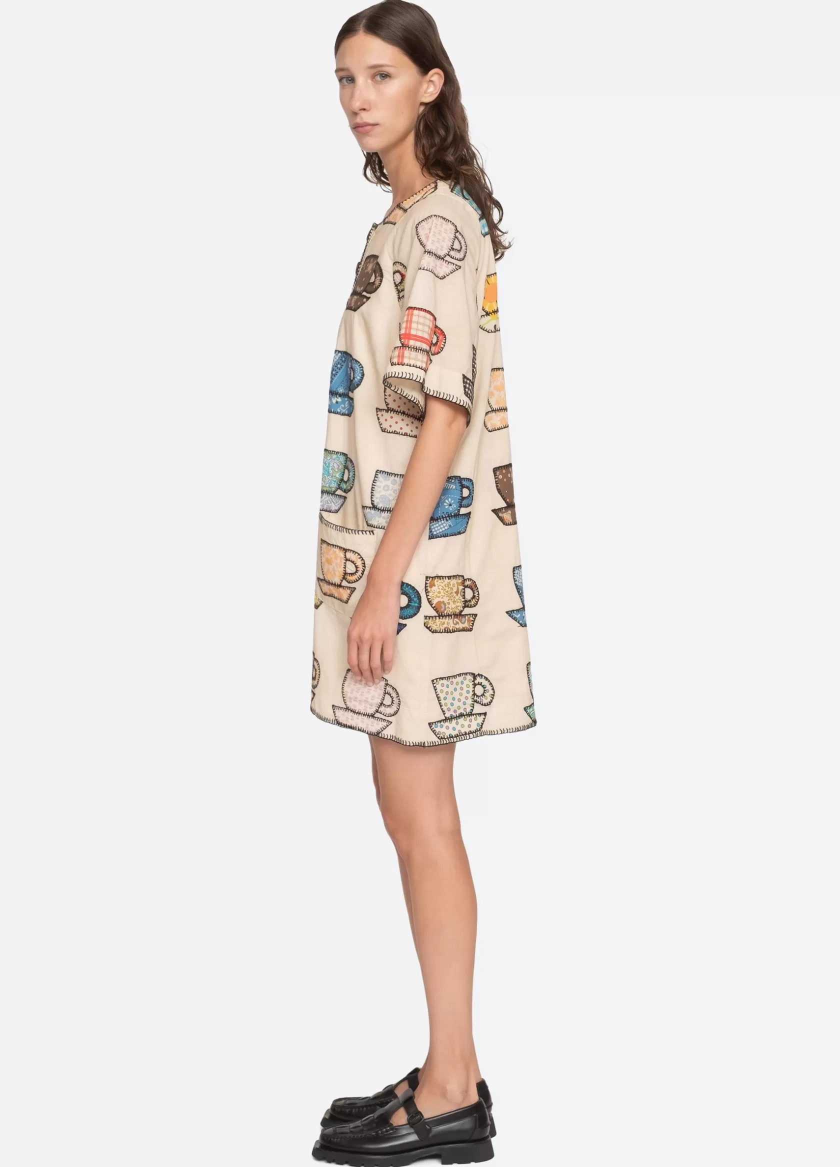 The Karmen tea cup embroidered dress features short sleeves, mini silhouette and playful tea cup print. Designed for an easy, relaxed fit. Due to the handmade appliqué process, motif variations may occur form garment to garment. No two are exactly alike.