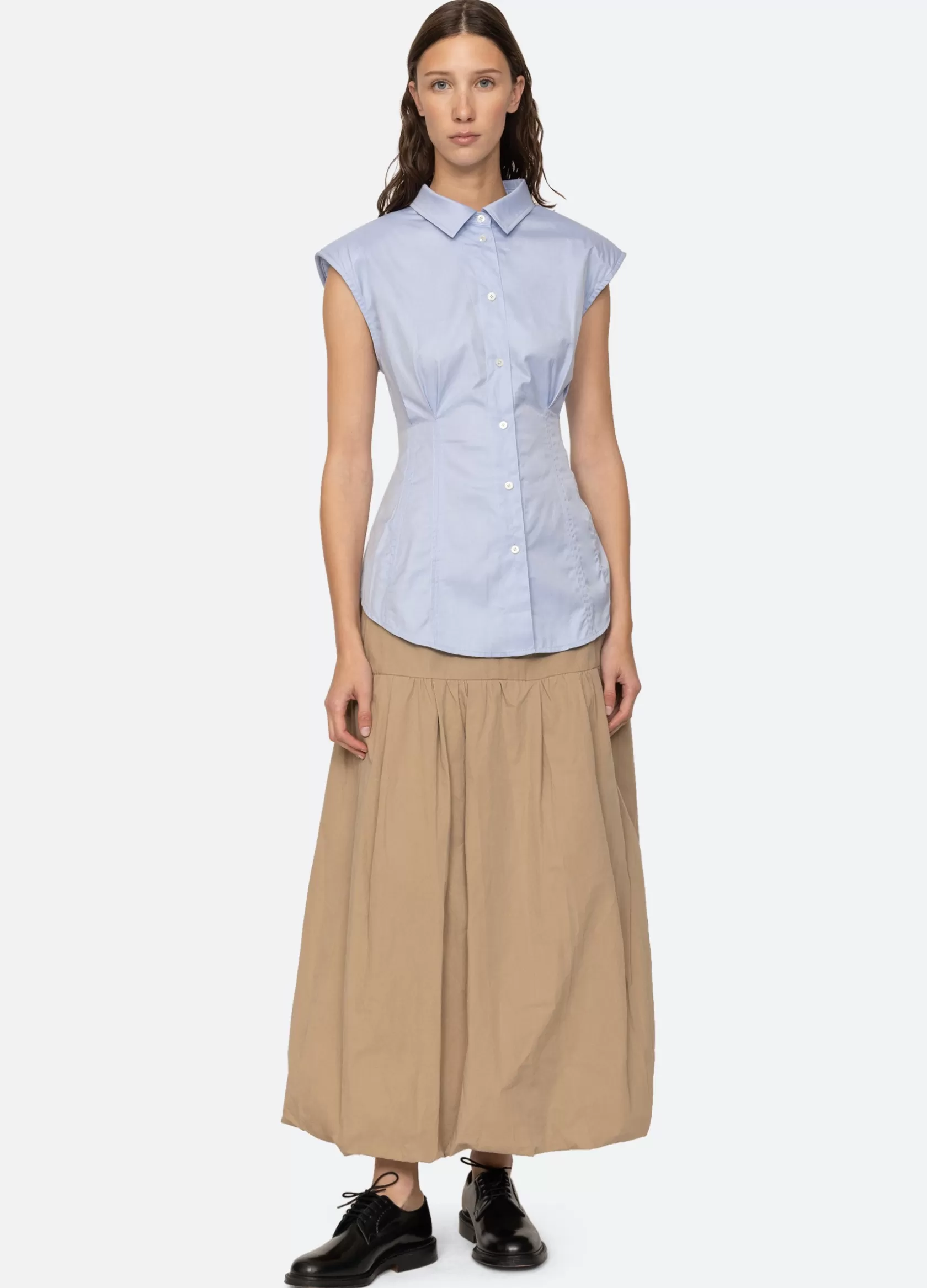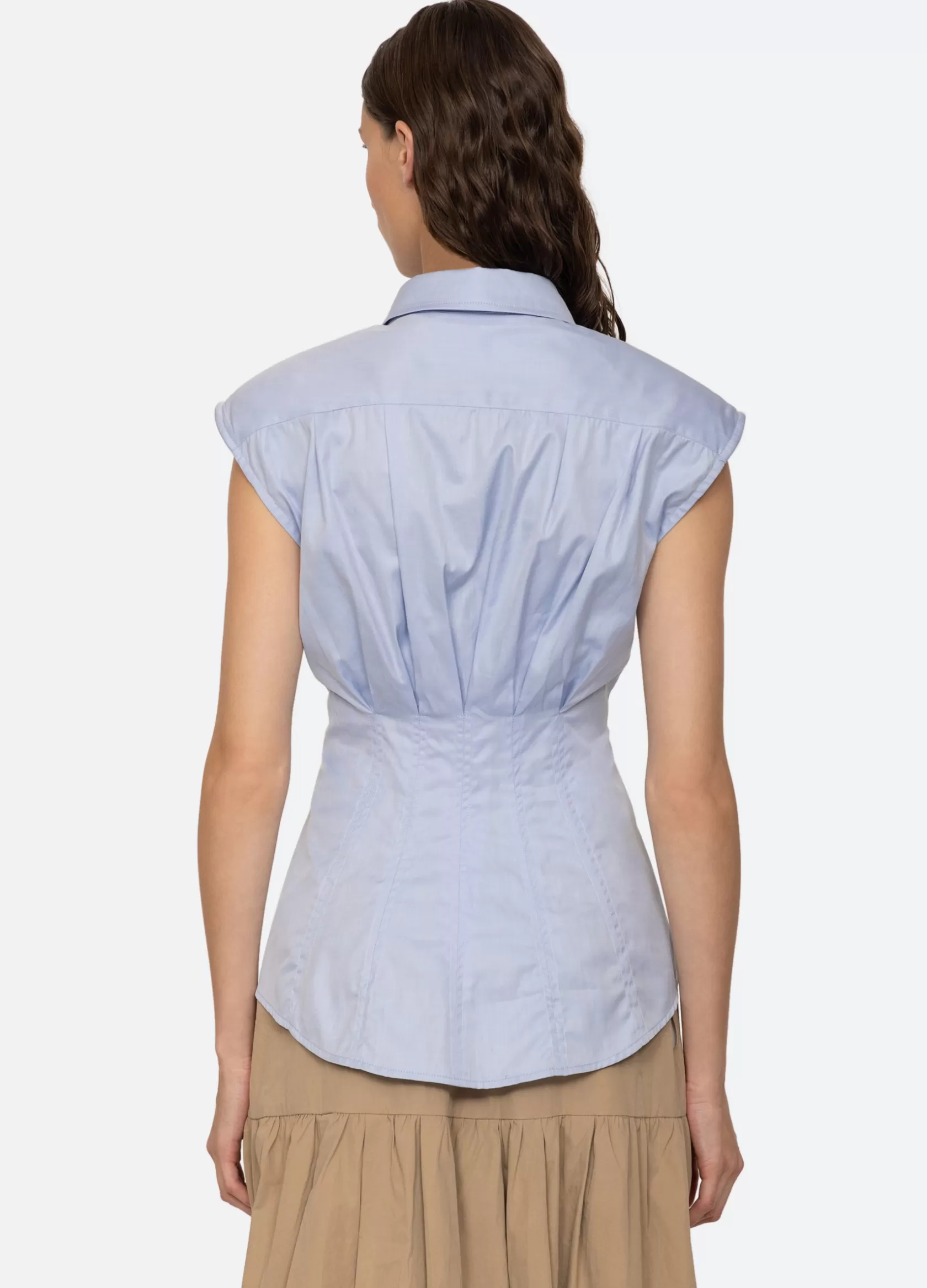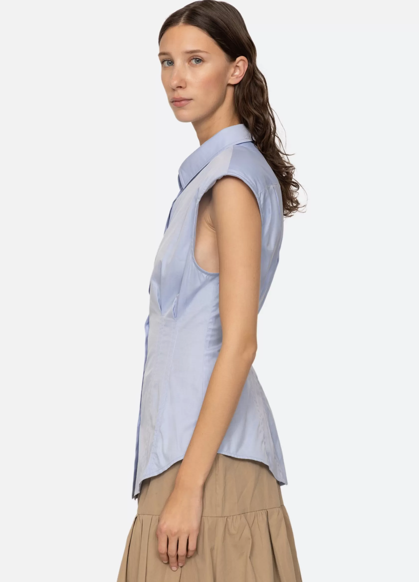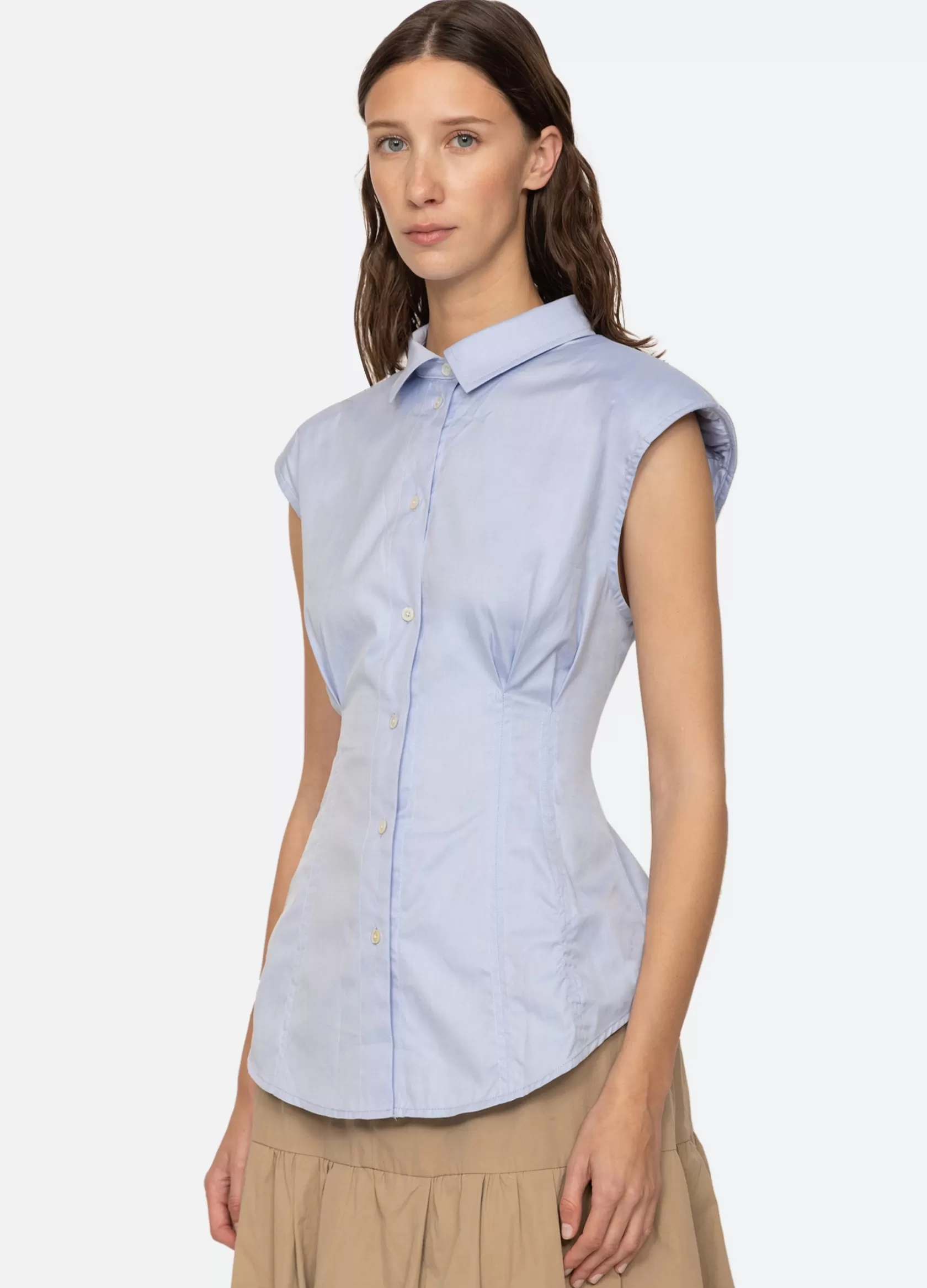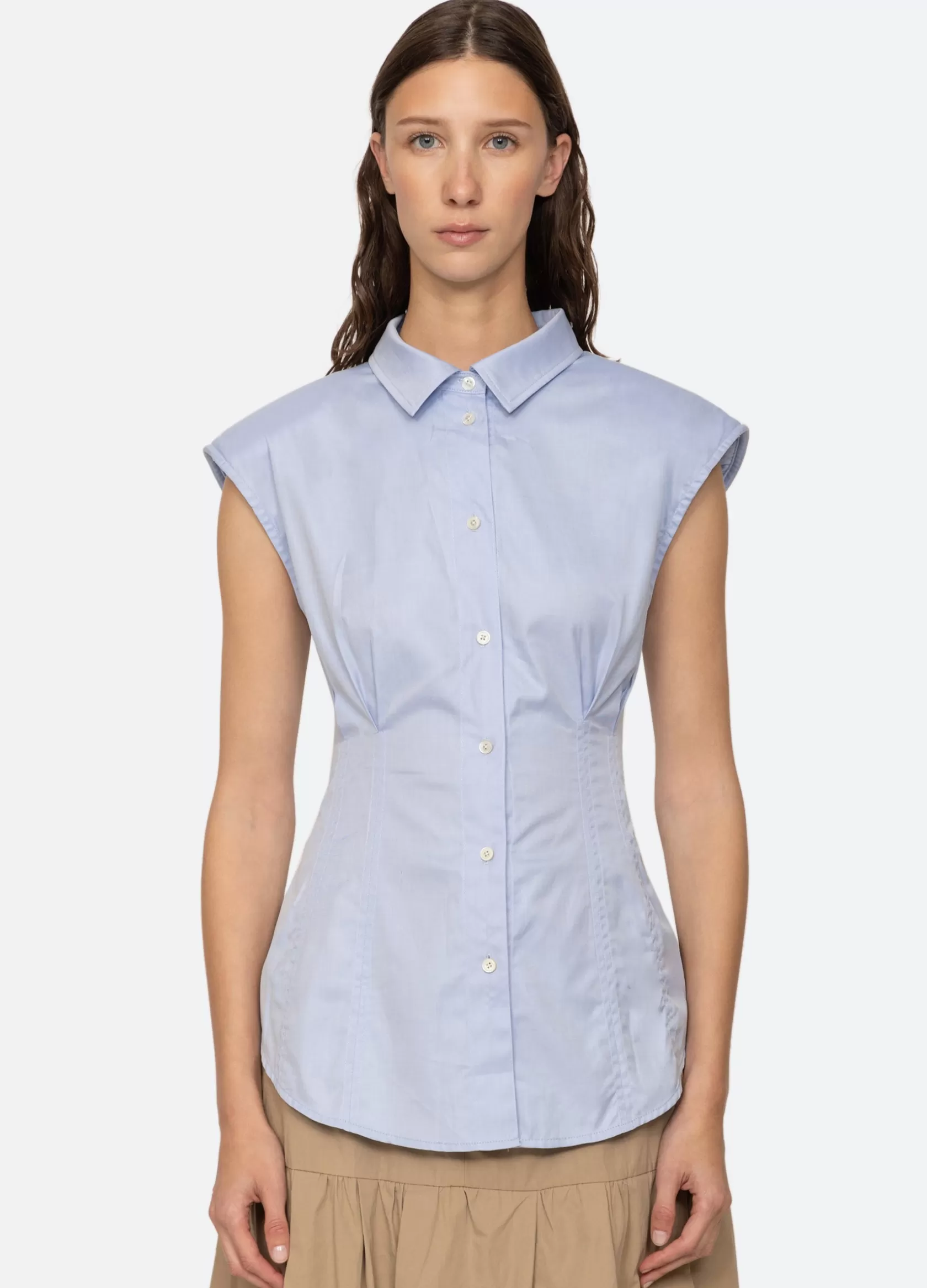 The Kendra sleeveless button down top features shoulder pads and is designed for a slim fit.