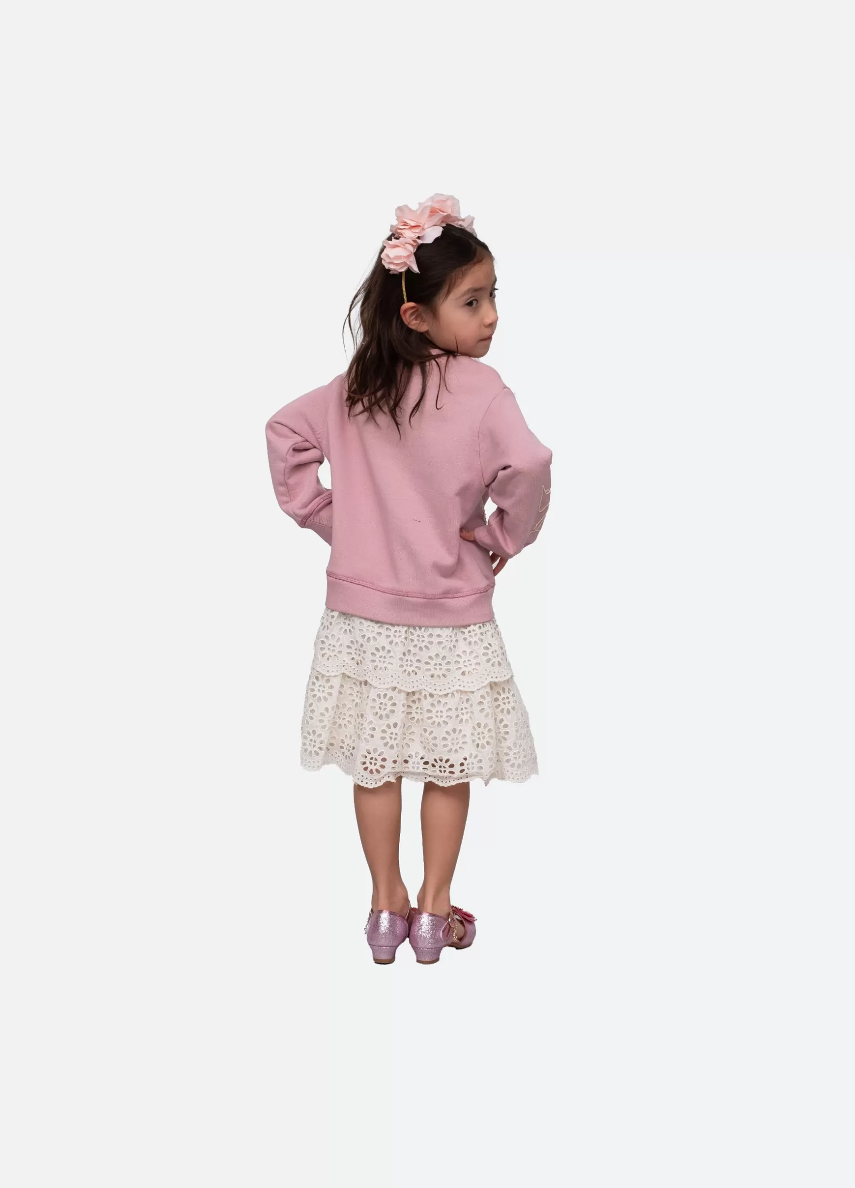 The Lainey embroidery kids combo sweatshirt dress features embroidered detailing and tiered eyelet skirt. Part of our mommy & me coordinating collection.