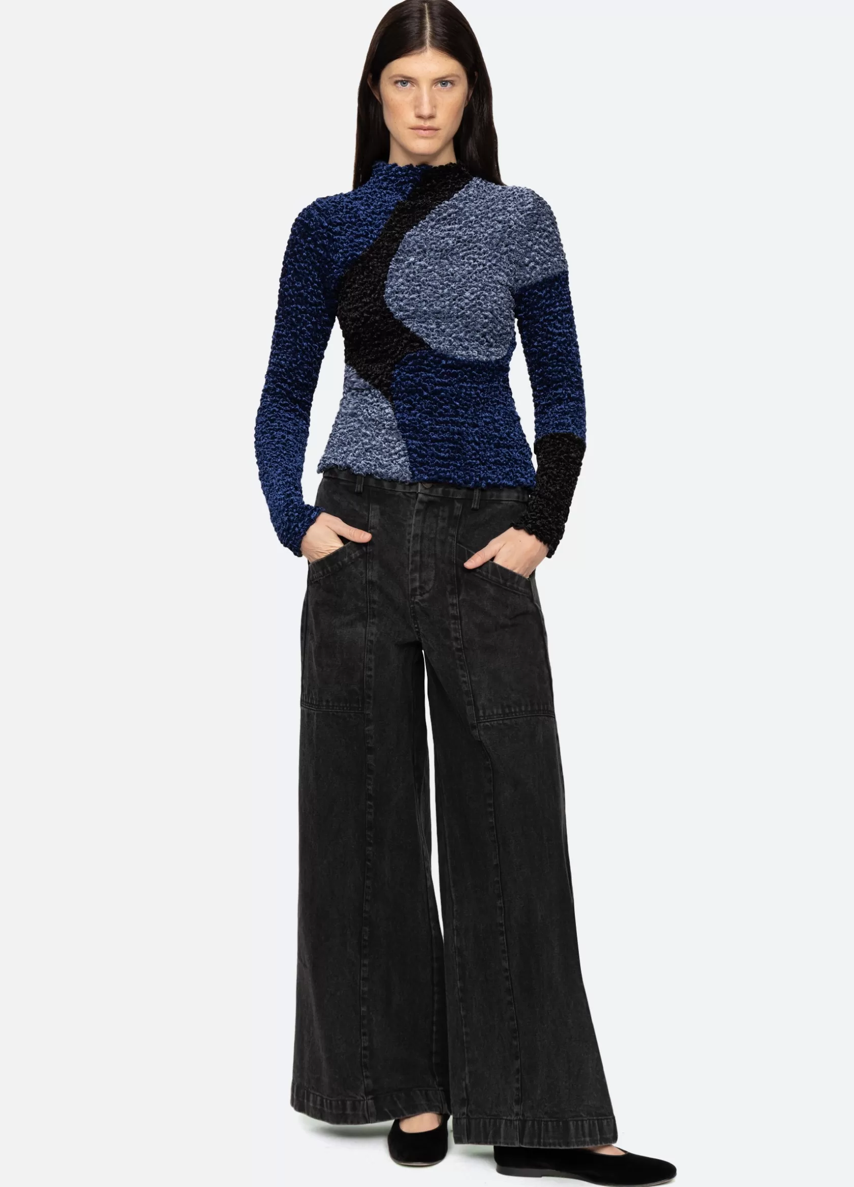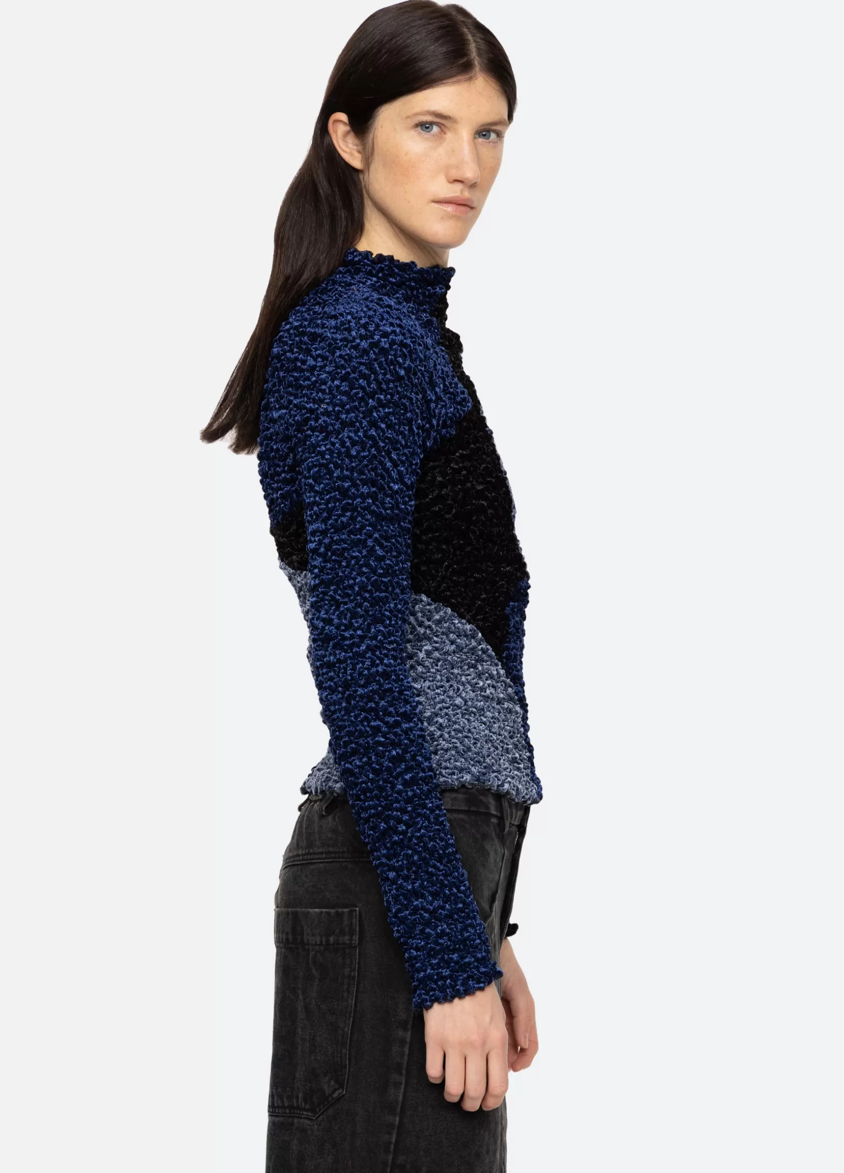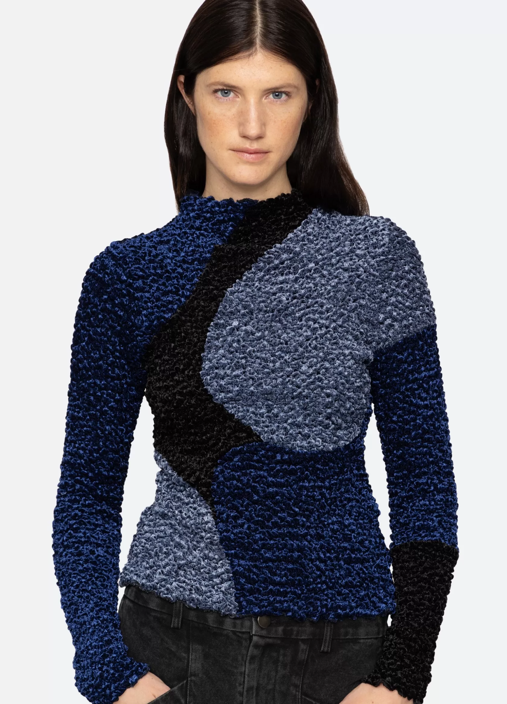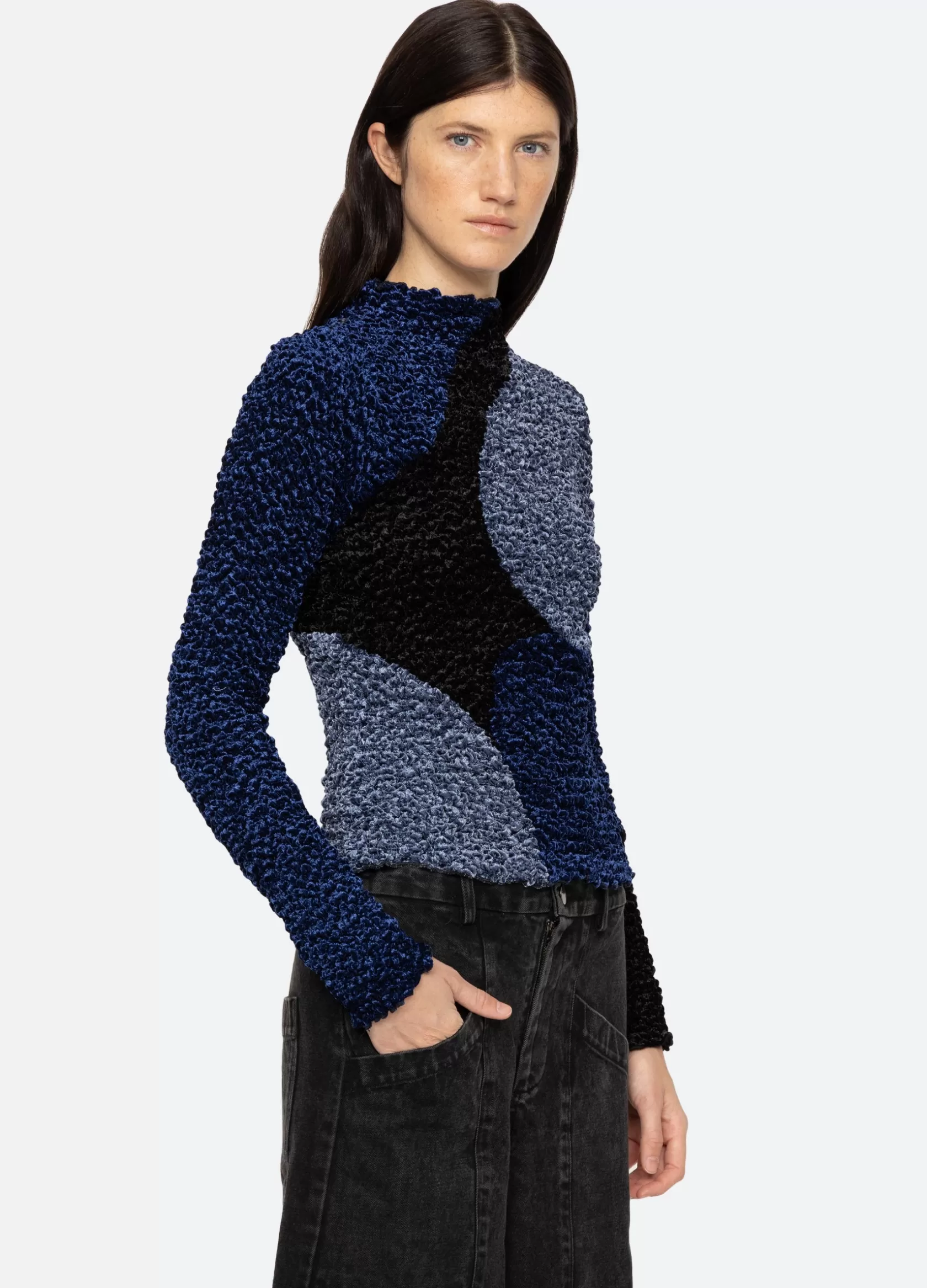 The Malene crushed velvet patchwork top features a smocked textured velvet and long sleeves.