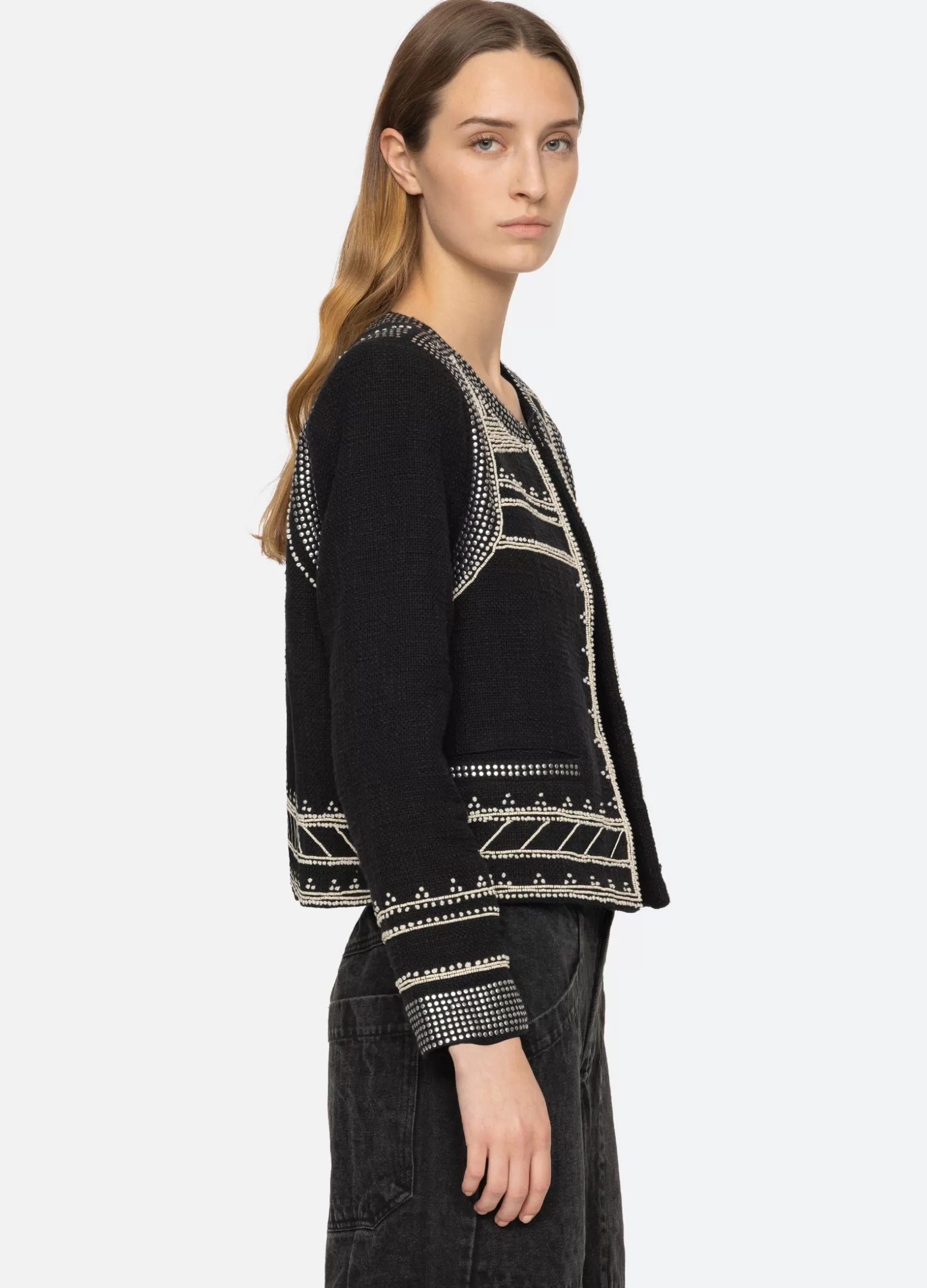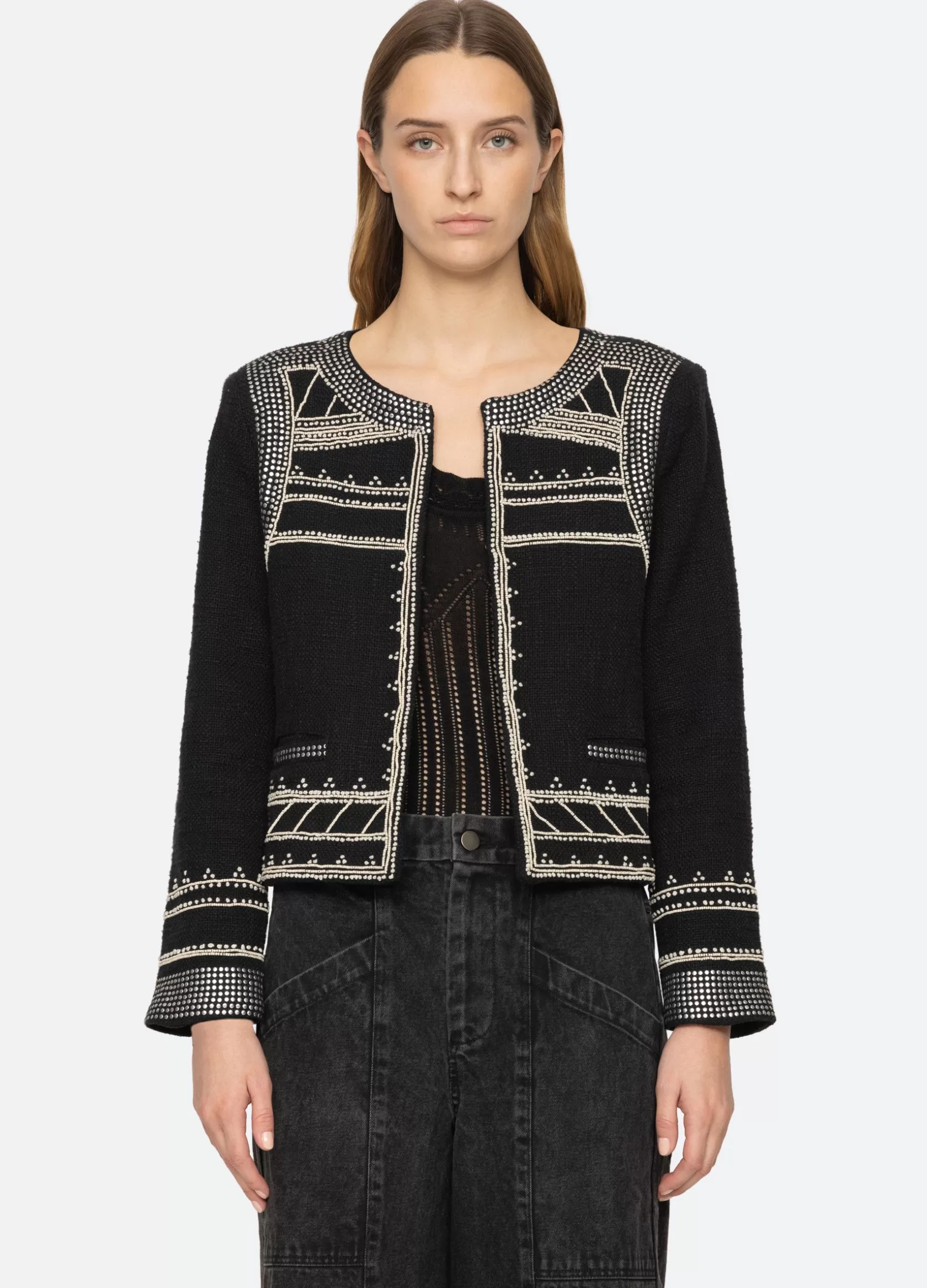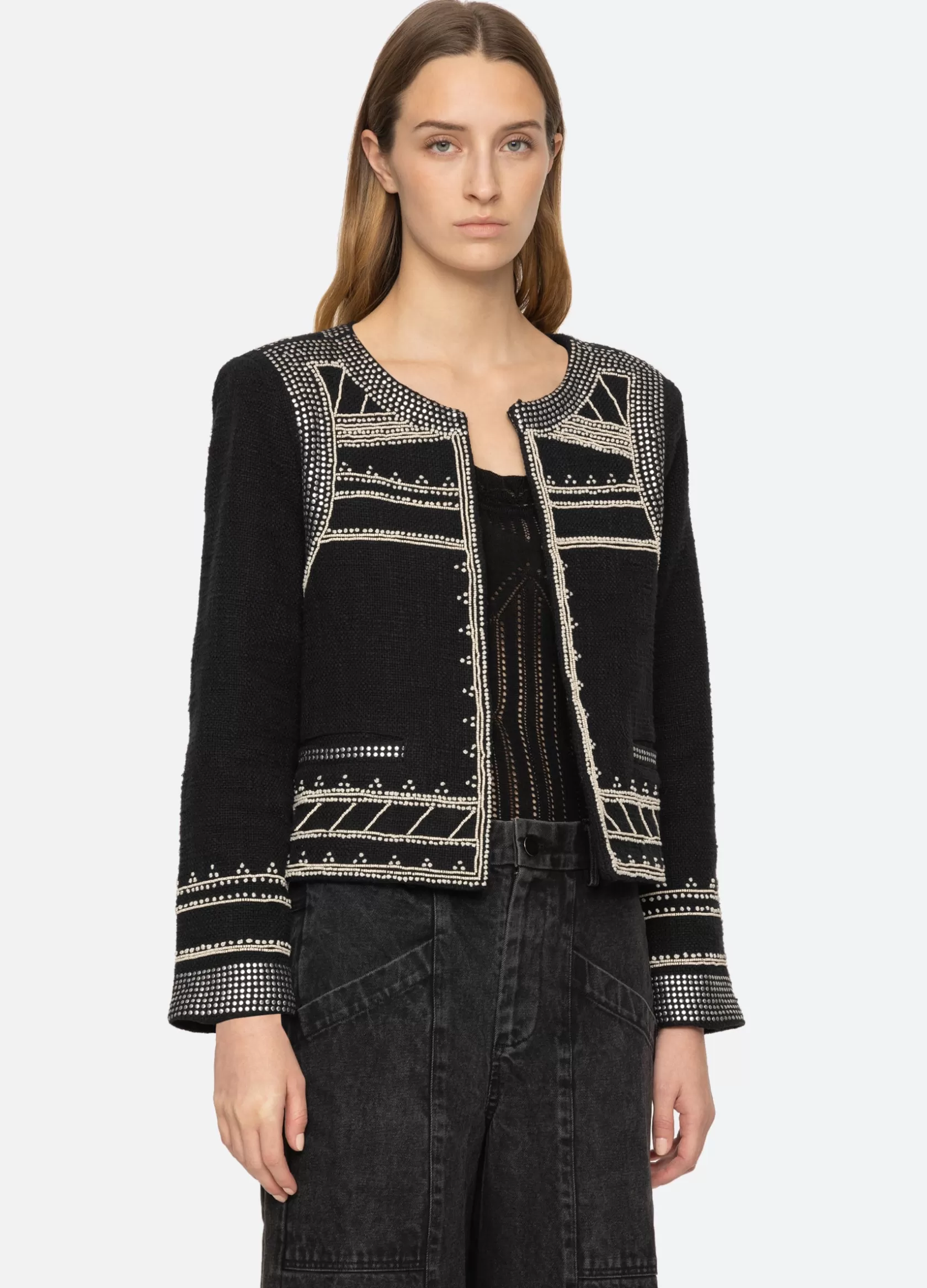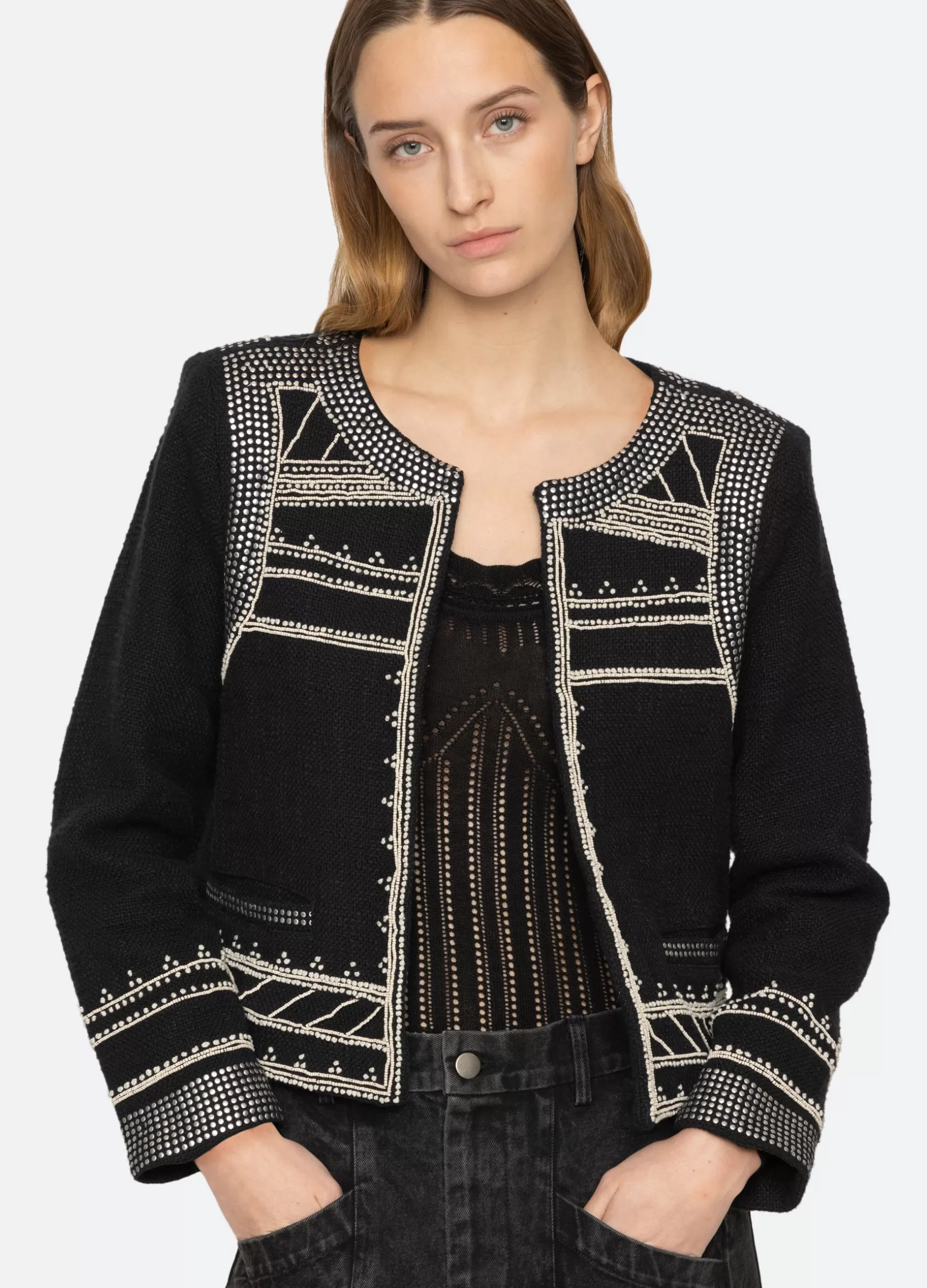 The Mille embroidered jacket features beading, metal rivets and french knot embroidery.