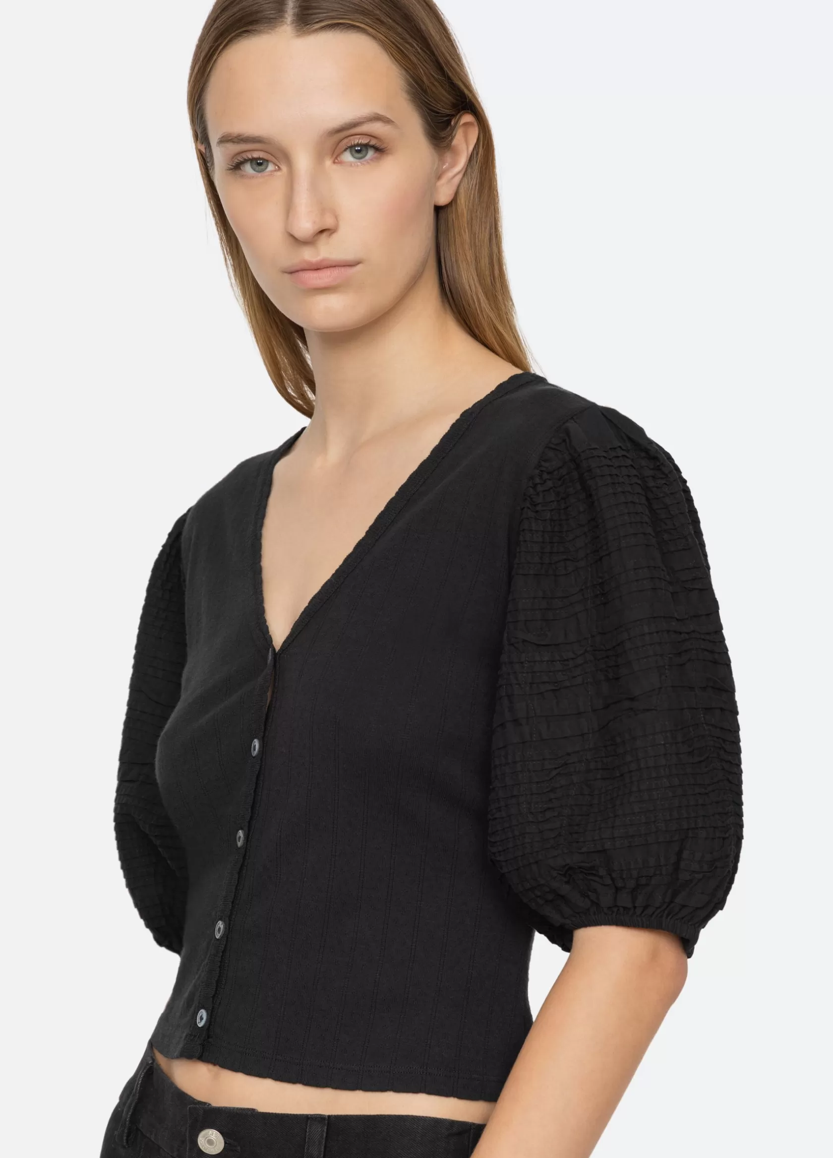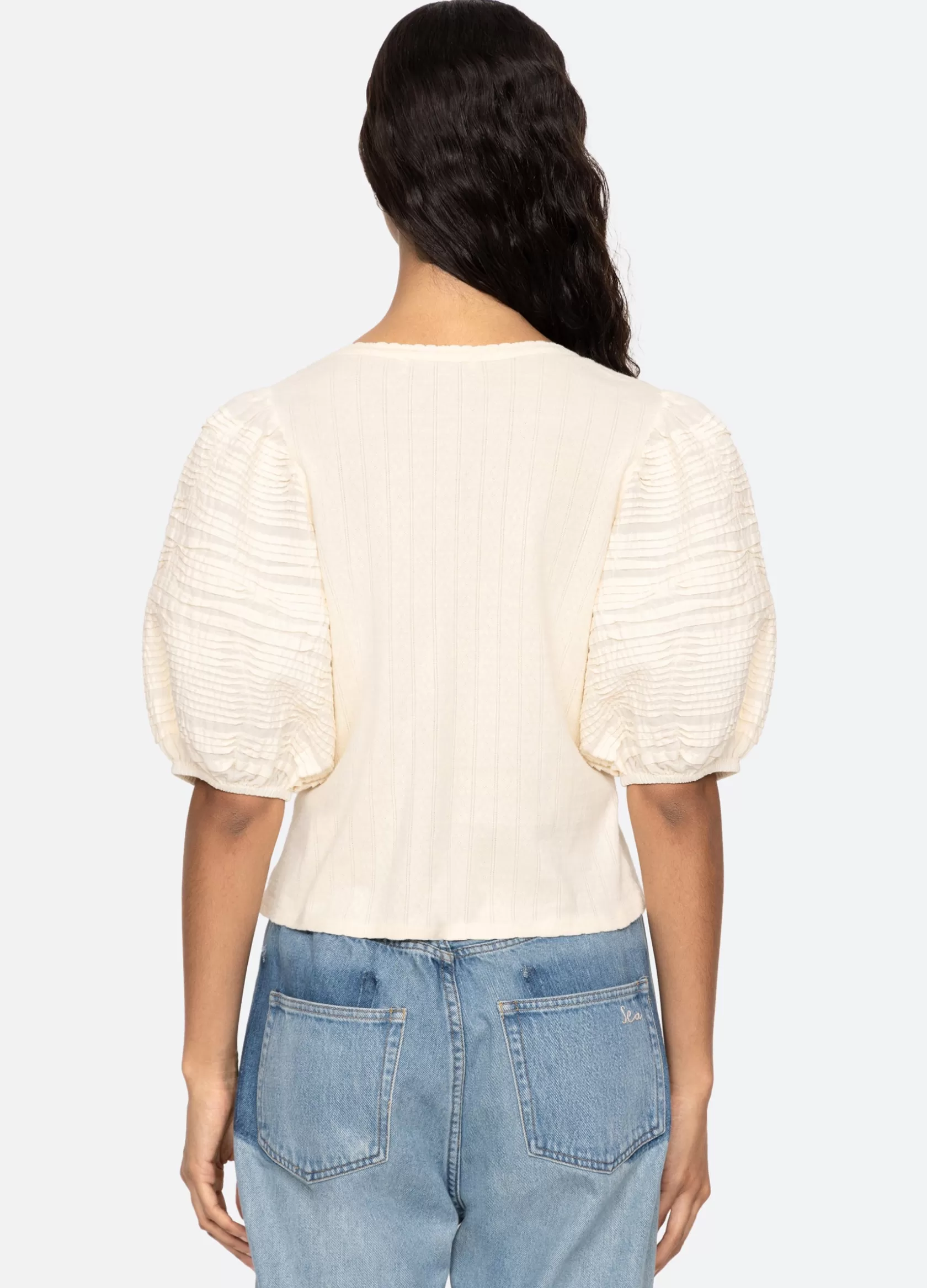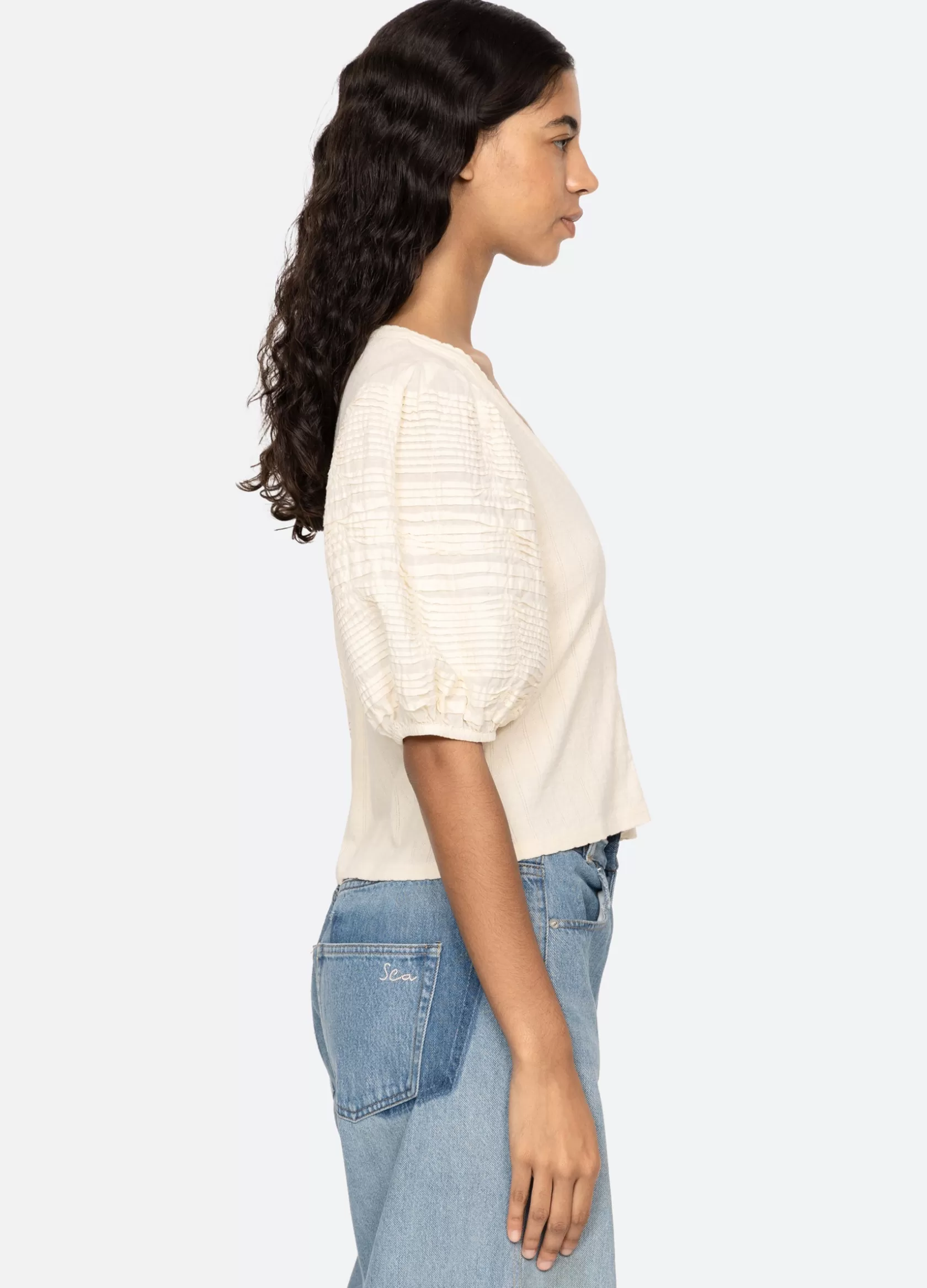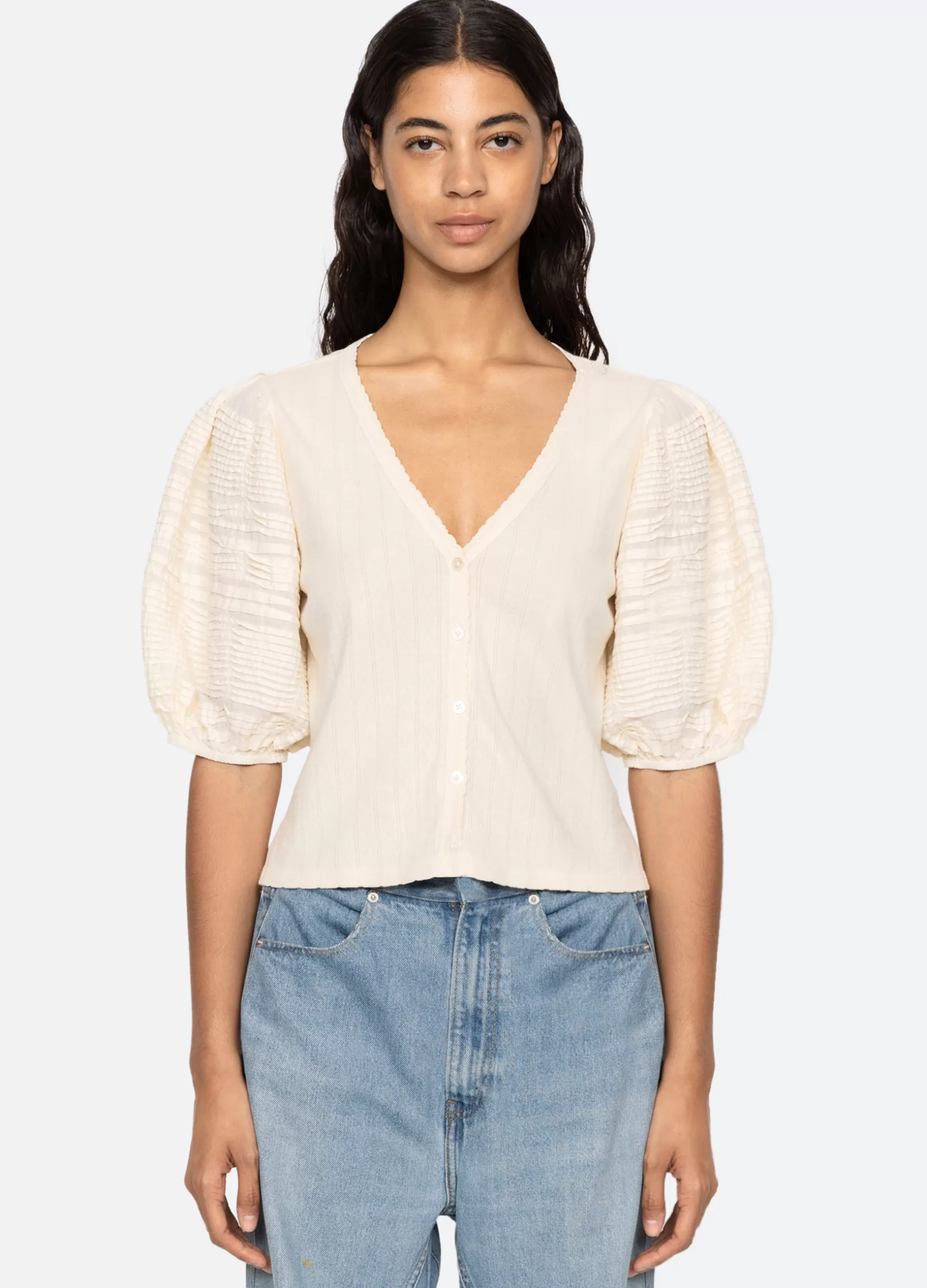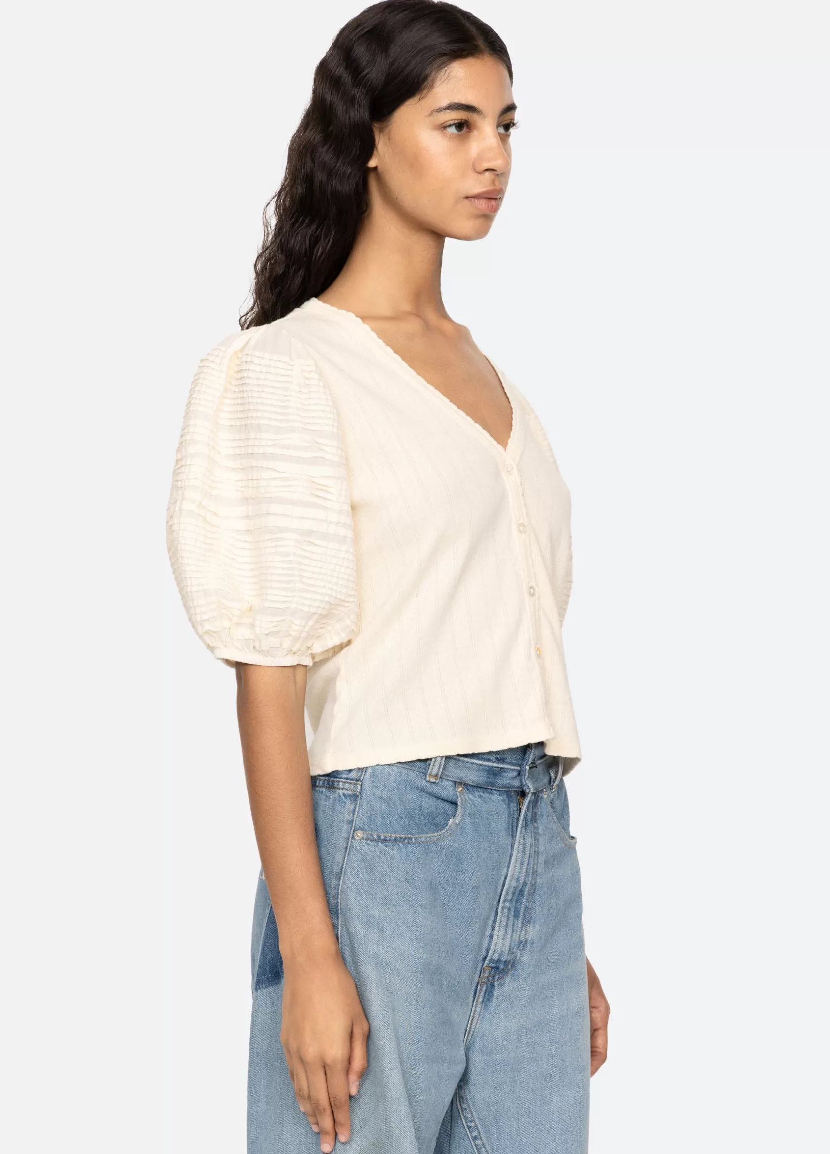 The Myra short sleeve top features puff sleeves with pleated detailing and button front closure.
