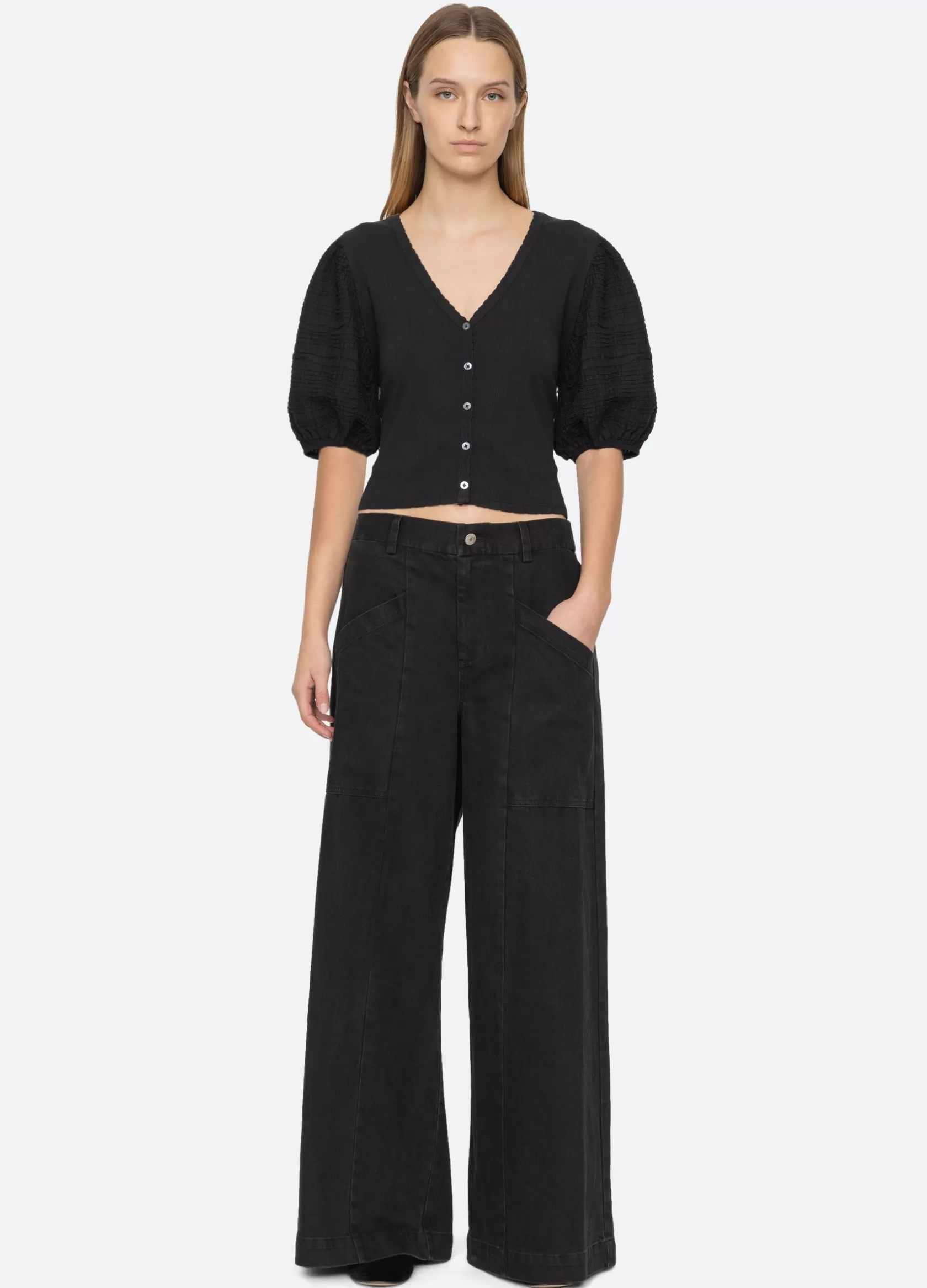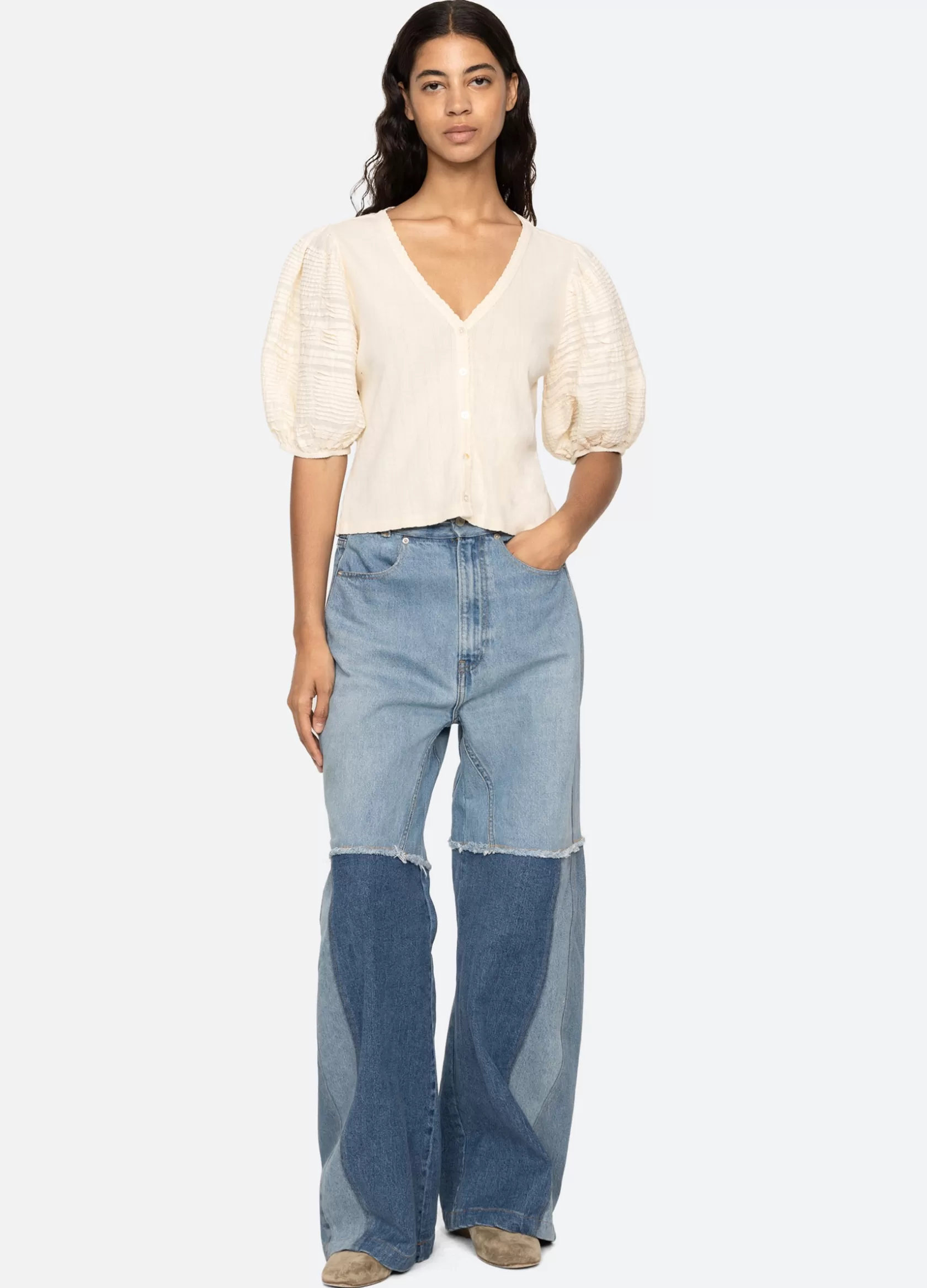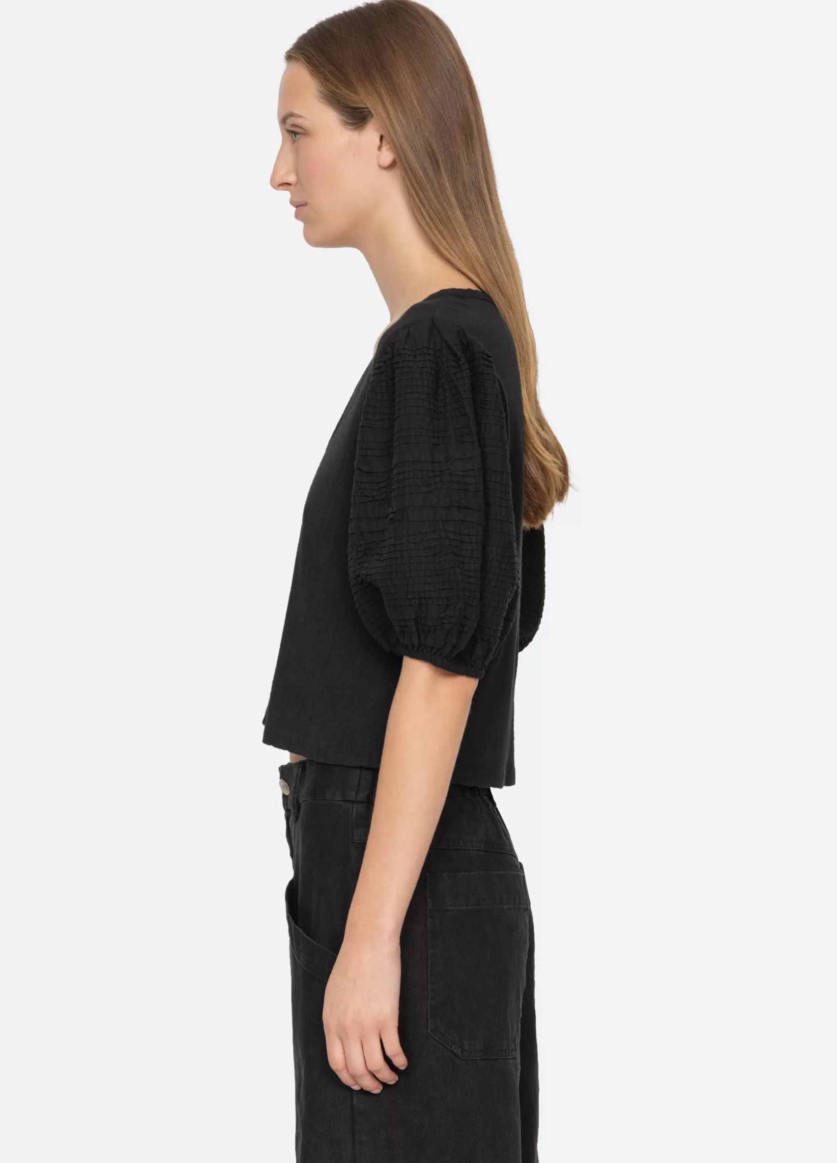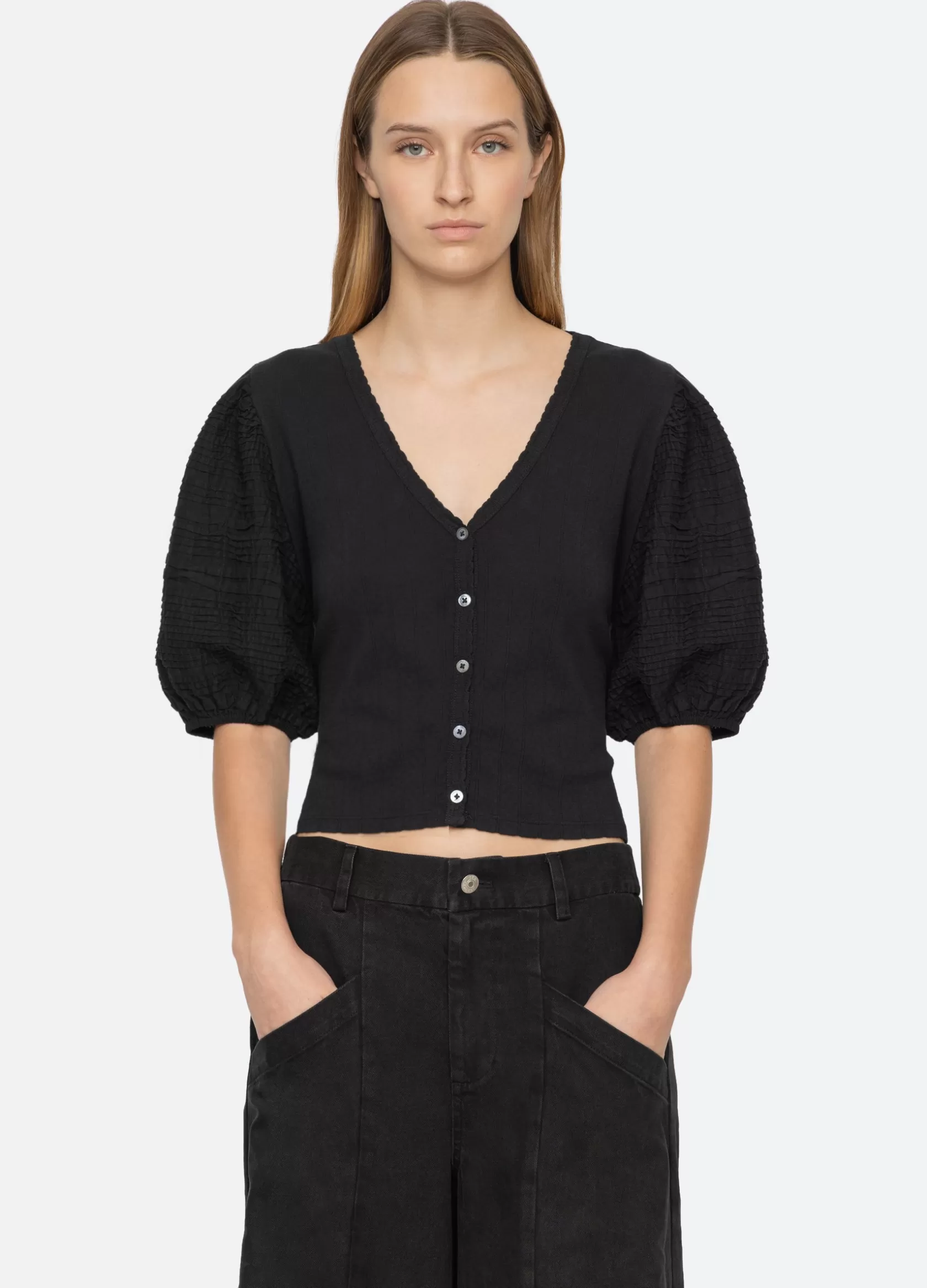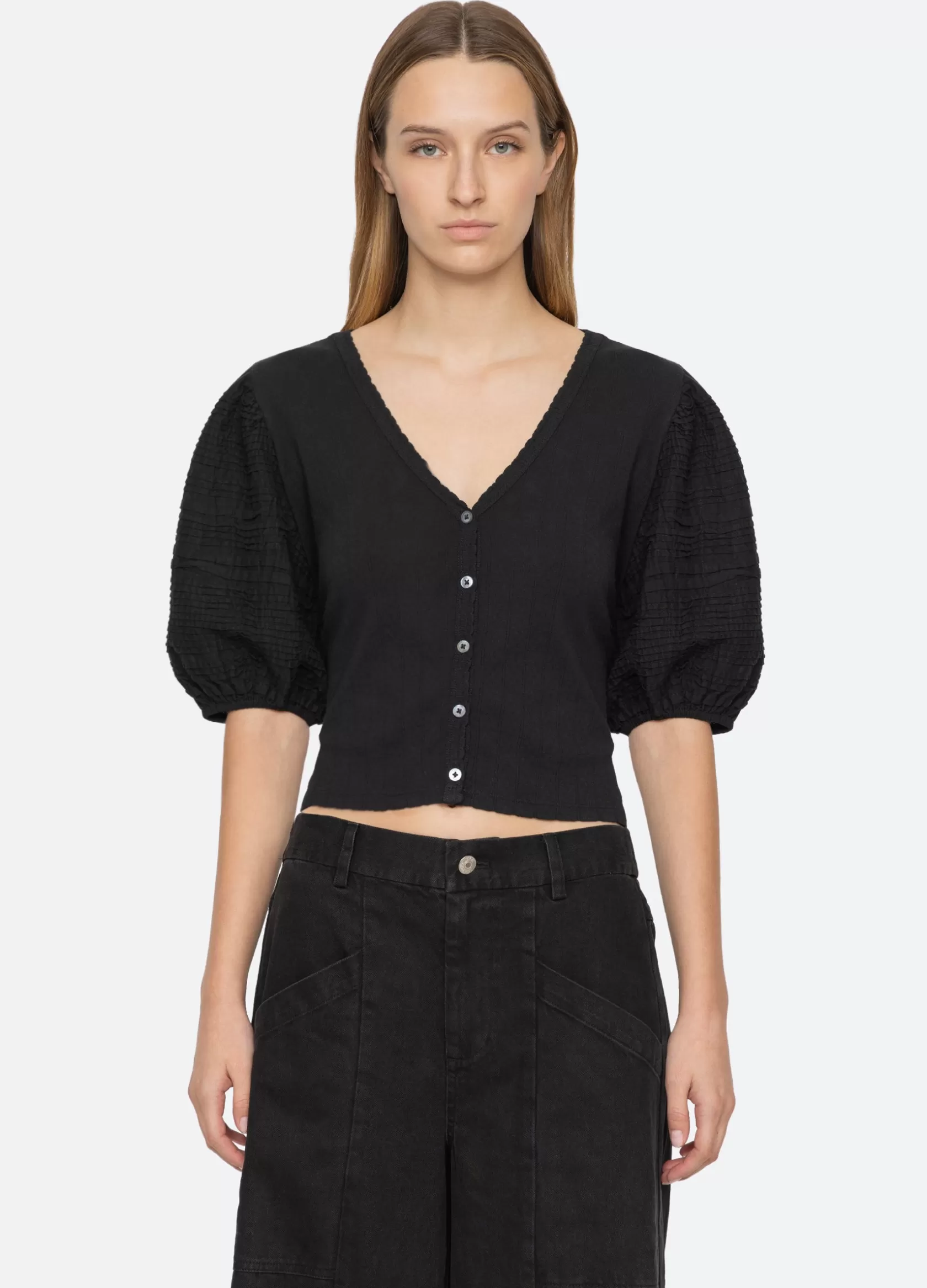 The Myra short sleeve top features puff sleeves with pleated detailing and button front closure.