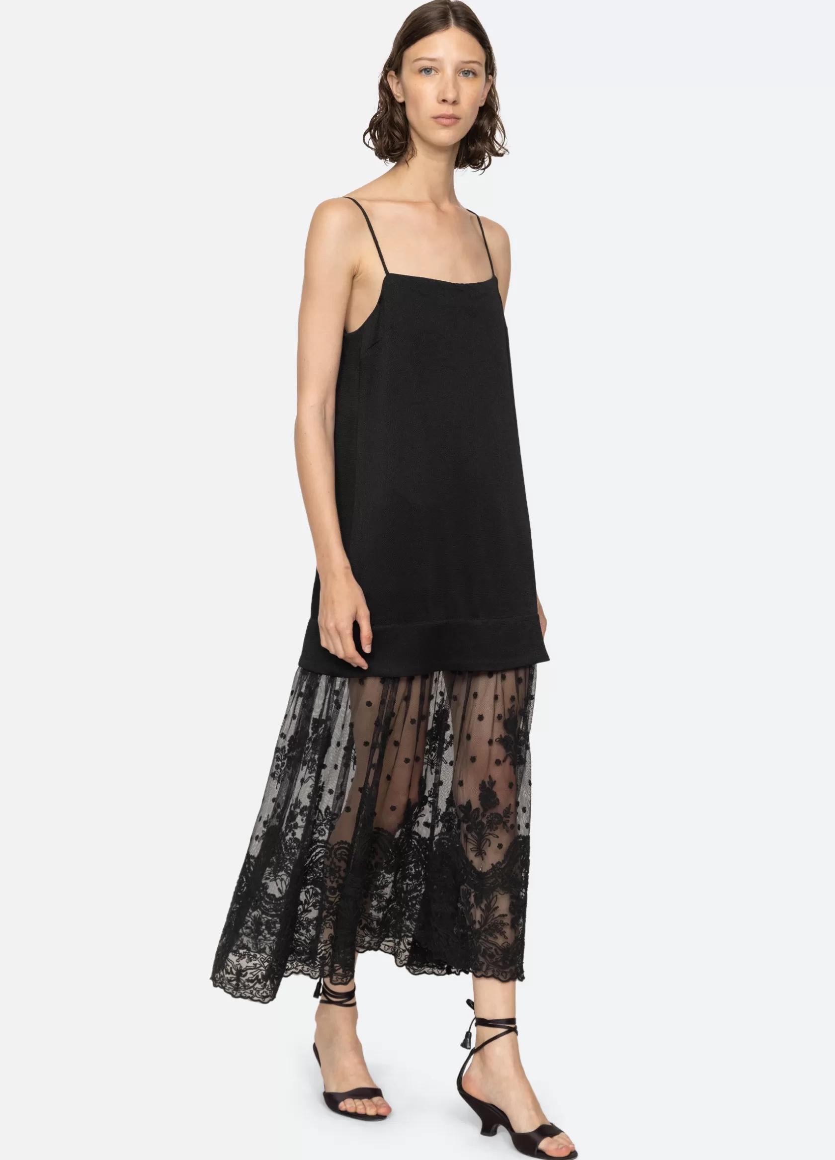 The Noa satin combo slip dress features a sheer applique mesh skirt.