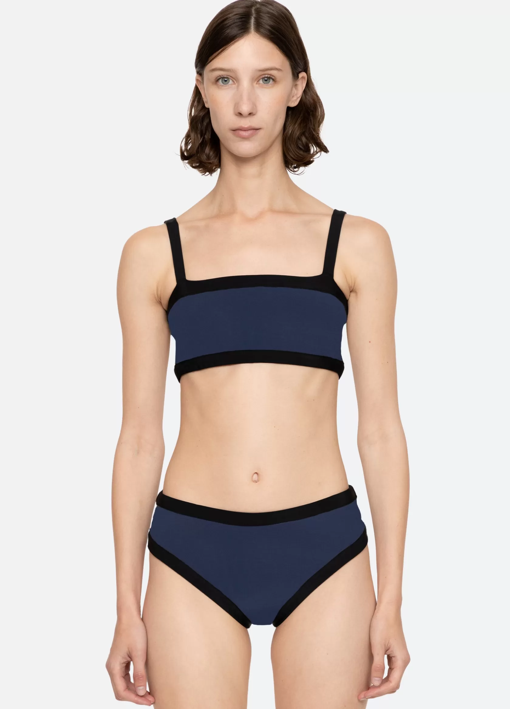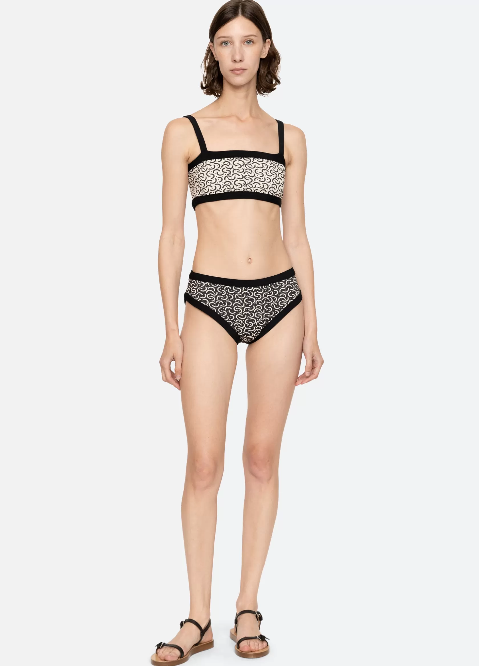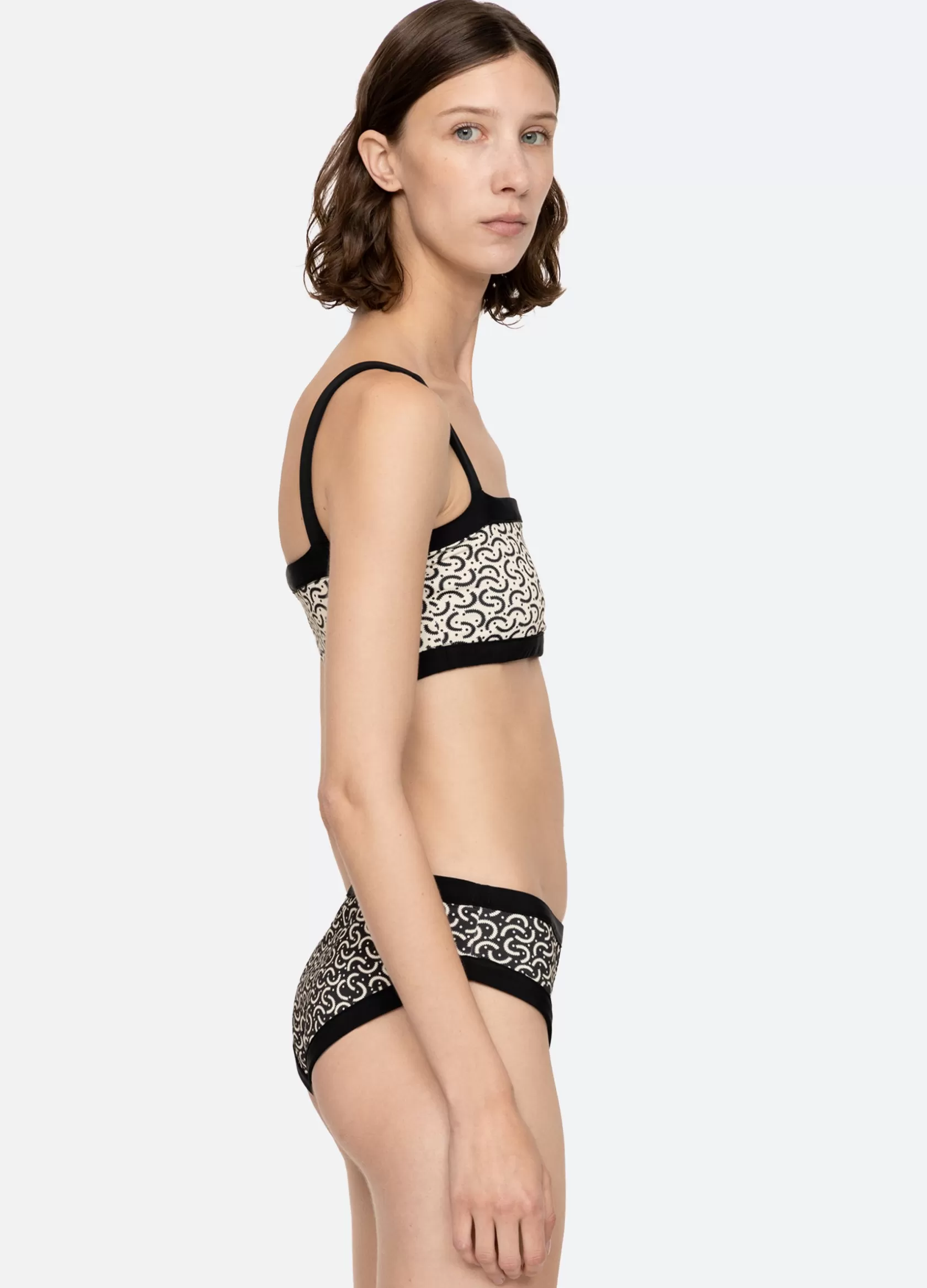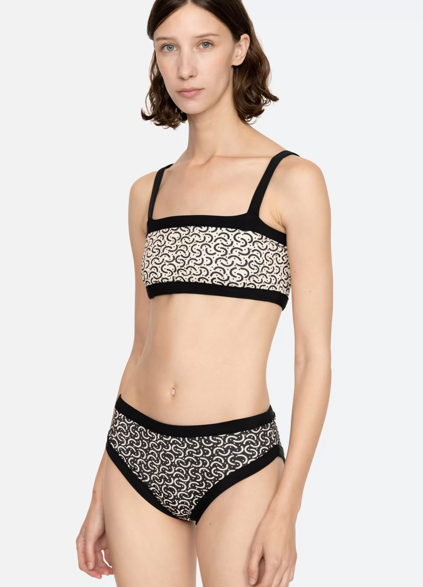 The Panna reversible bikini top features a contrasting border and a geometric print that reverses into a solid. Details…