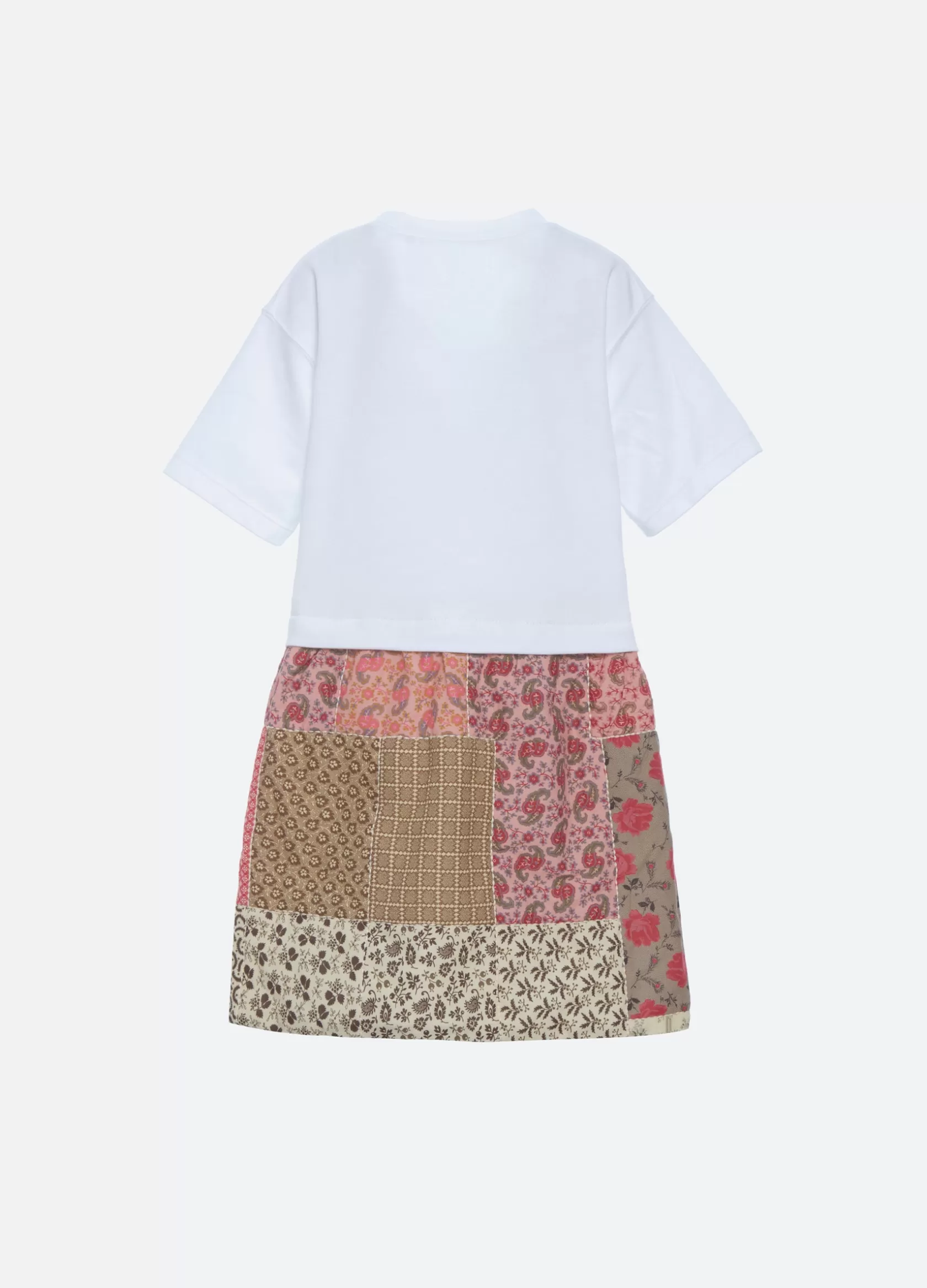 The Panna patchwork print kids t-shirt dress features a cotton t-shirt top and a multi colored patchwork print design. …