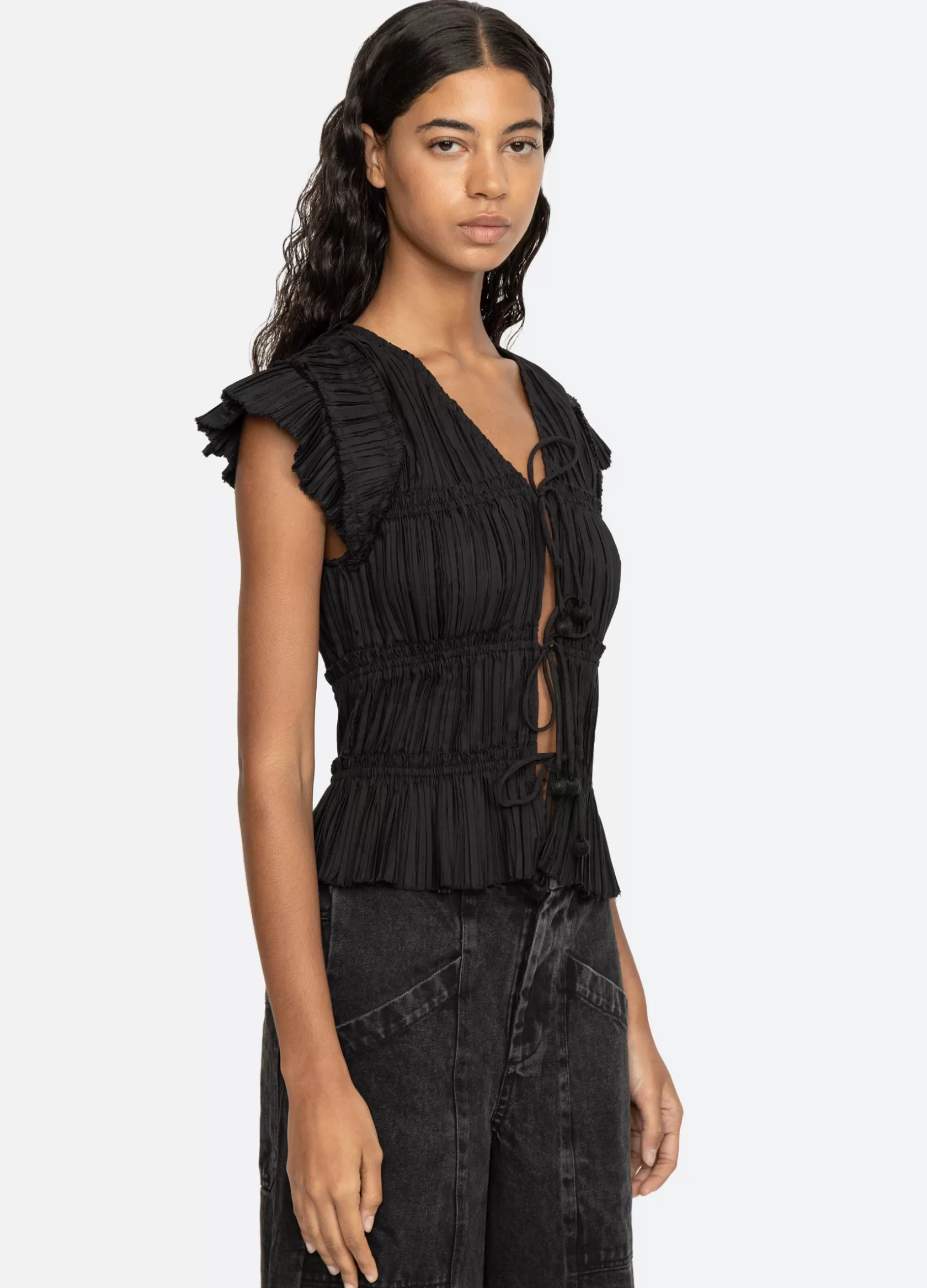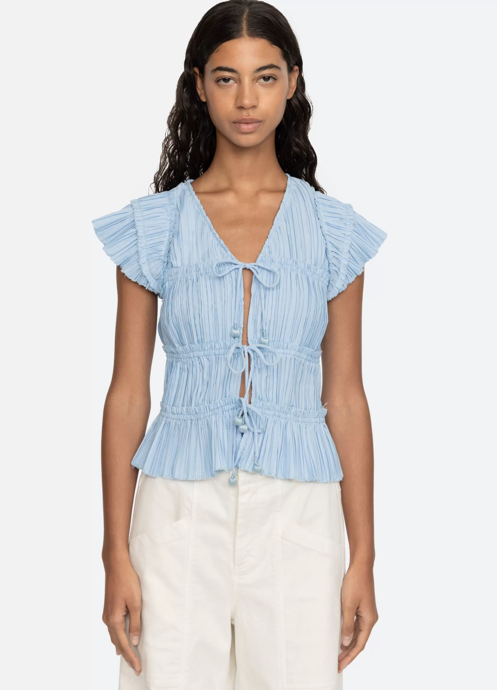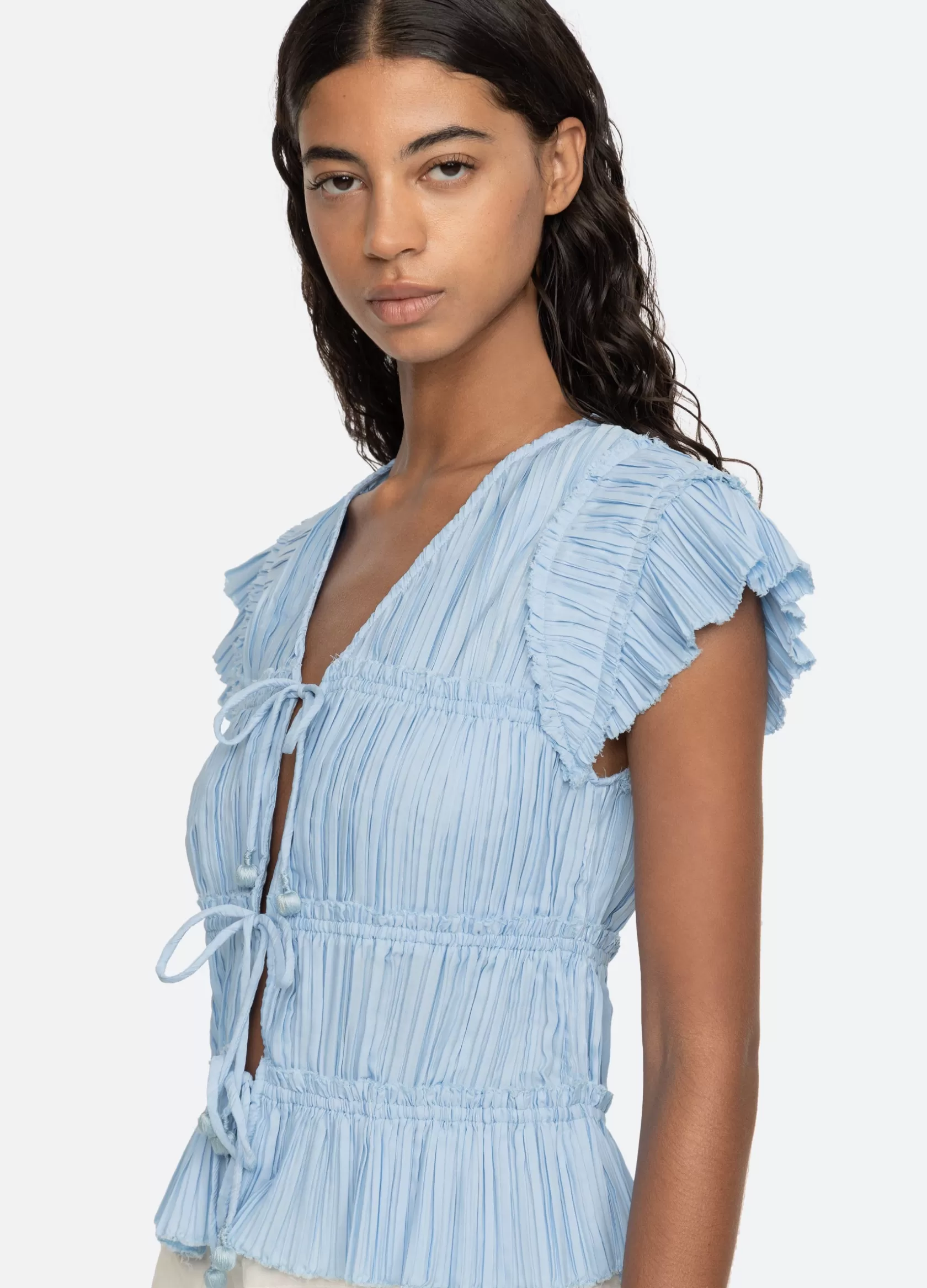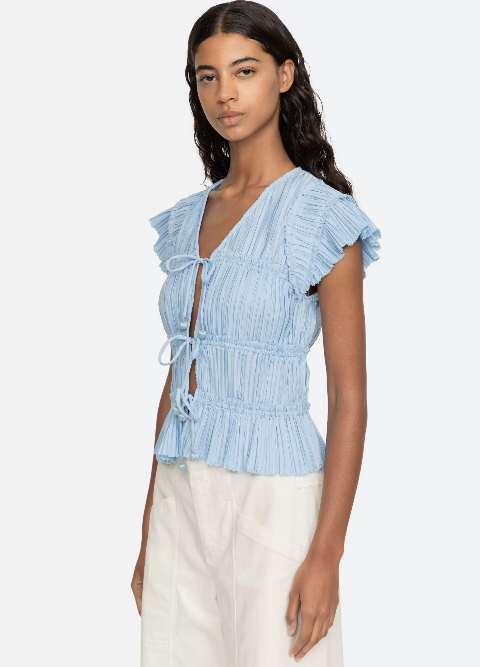 The Parcie crinkle tank top features flutter sleeves, raw edge detailing and tie front closures.