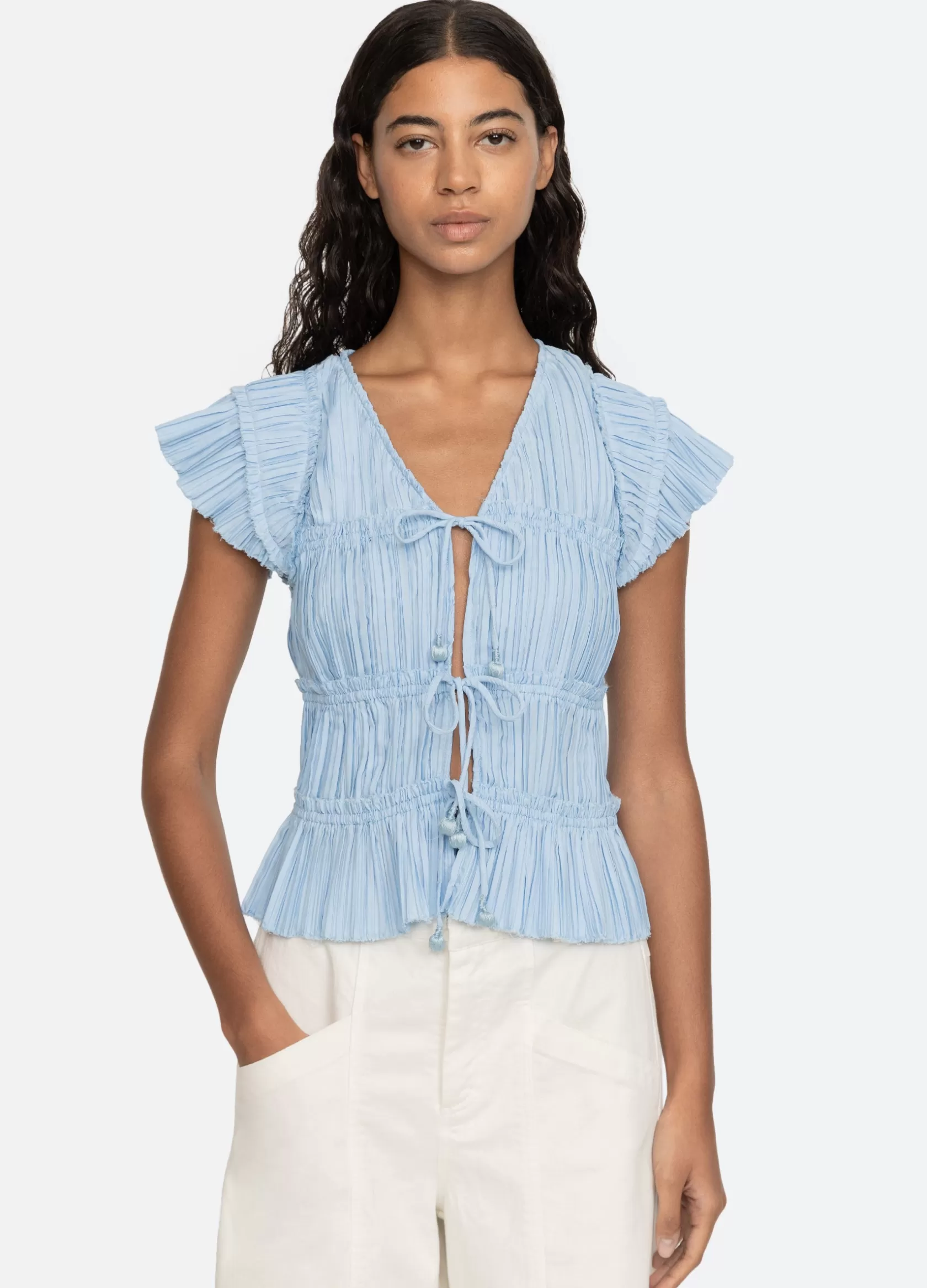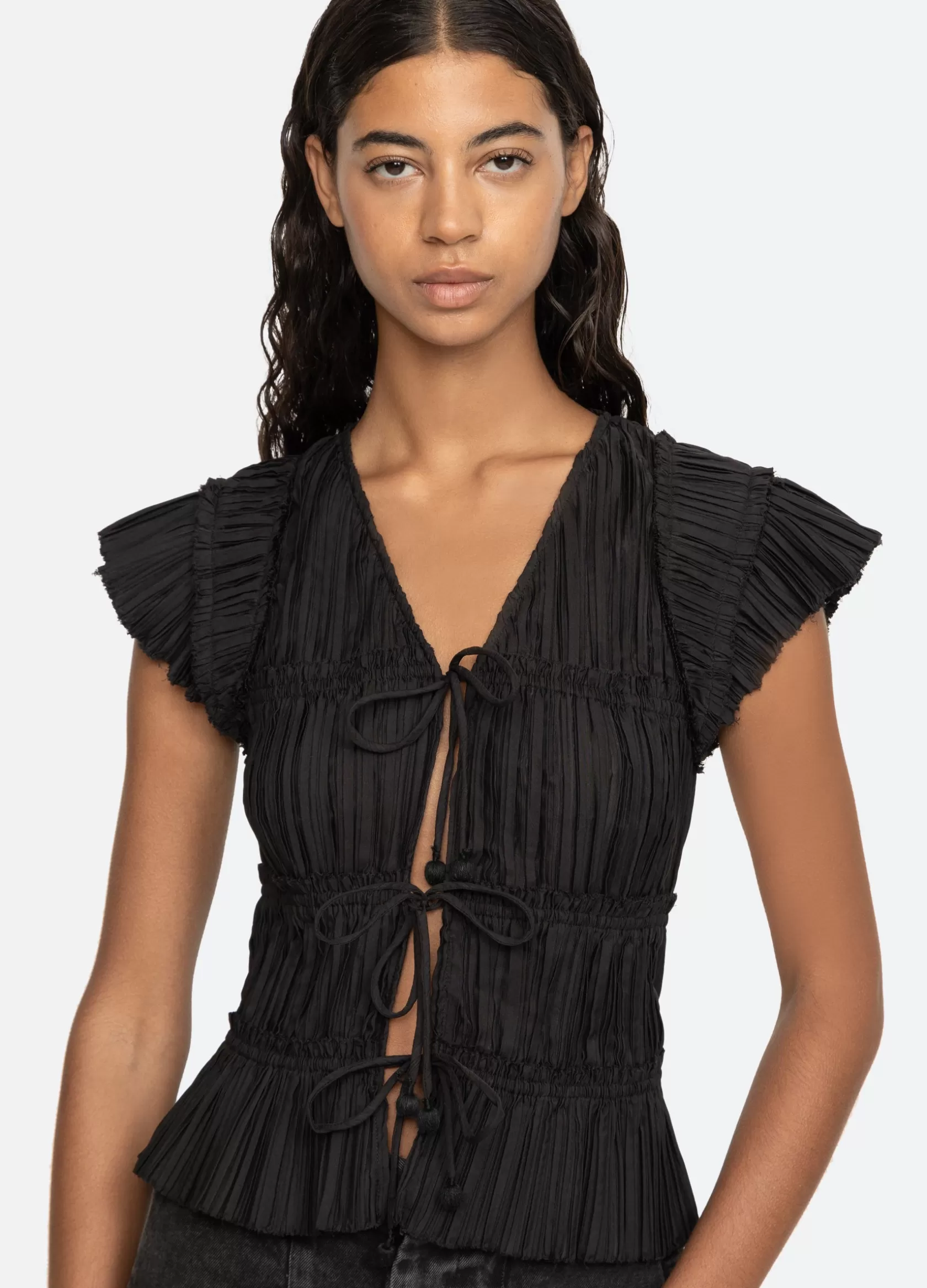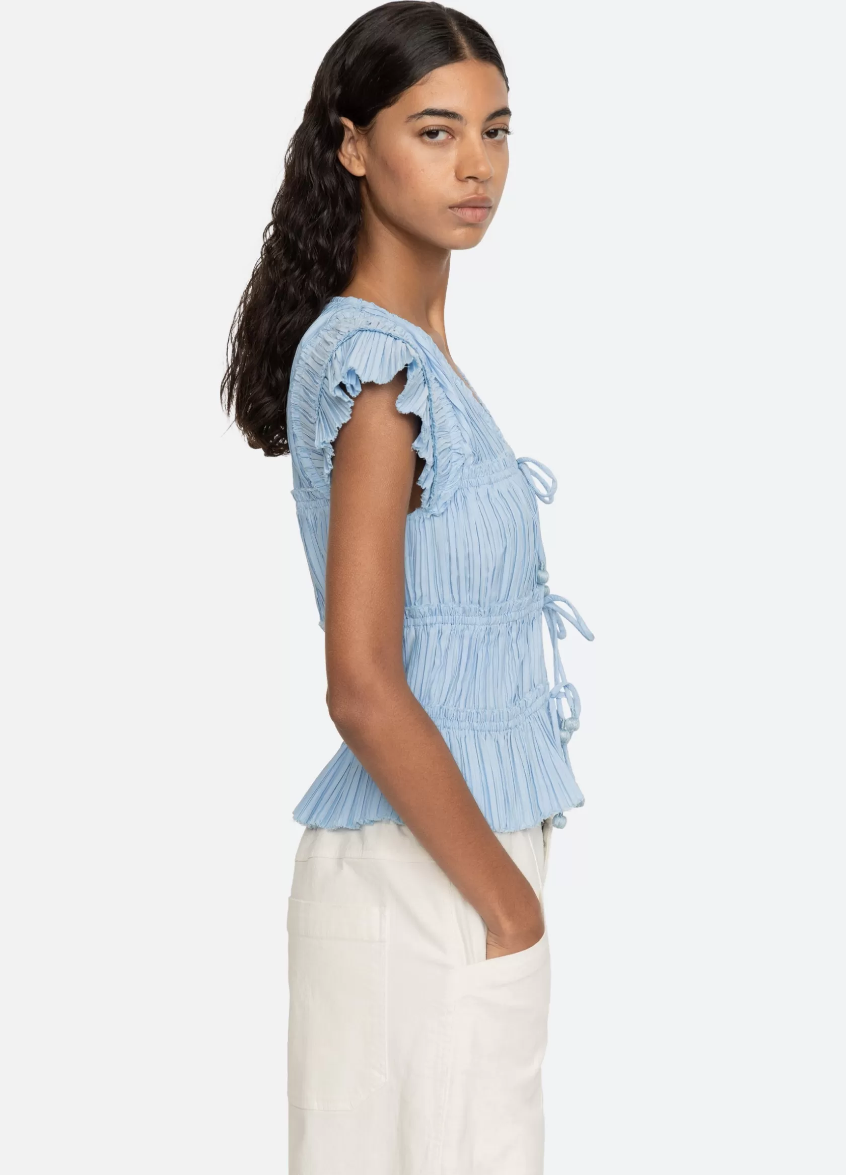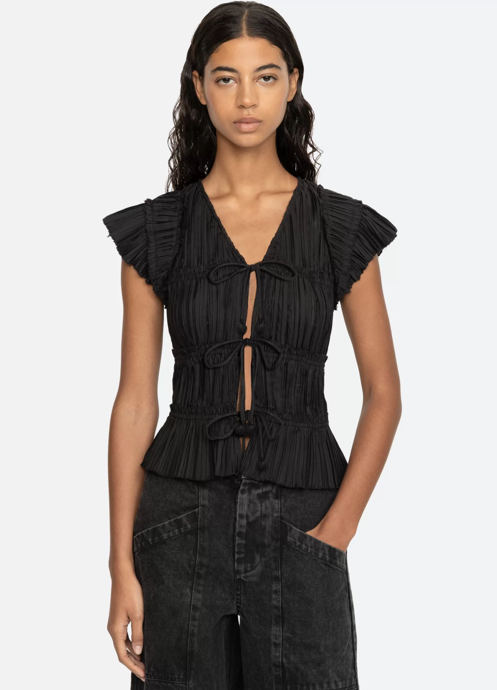 The Parcie crinkle tank top features flutter sleeves, raw edge detailing and tie front closures.