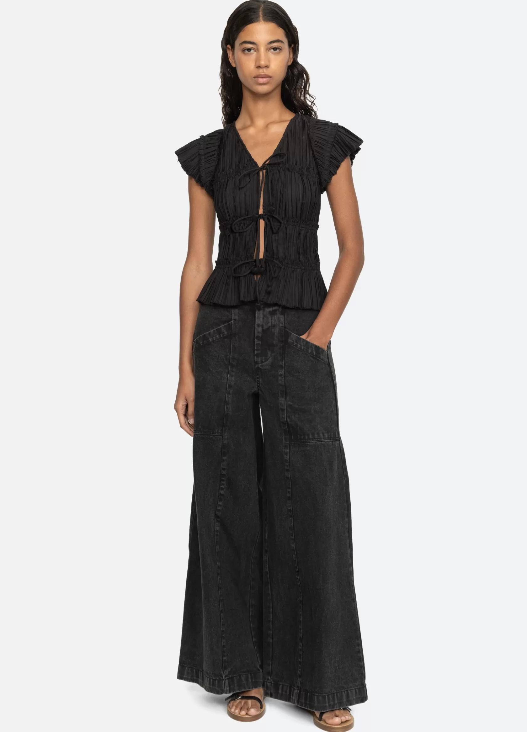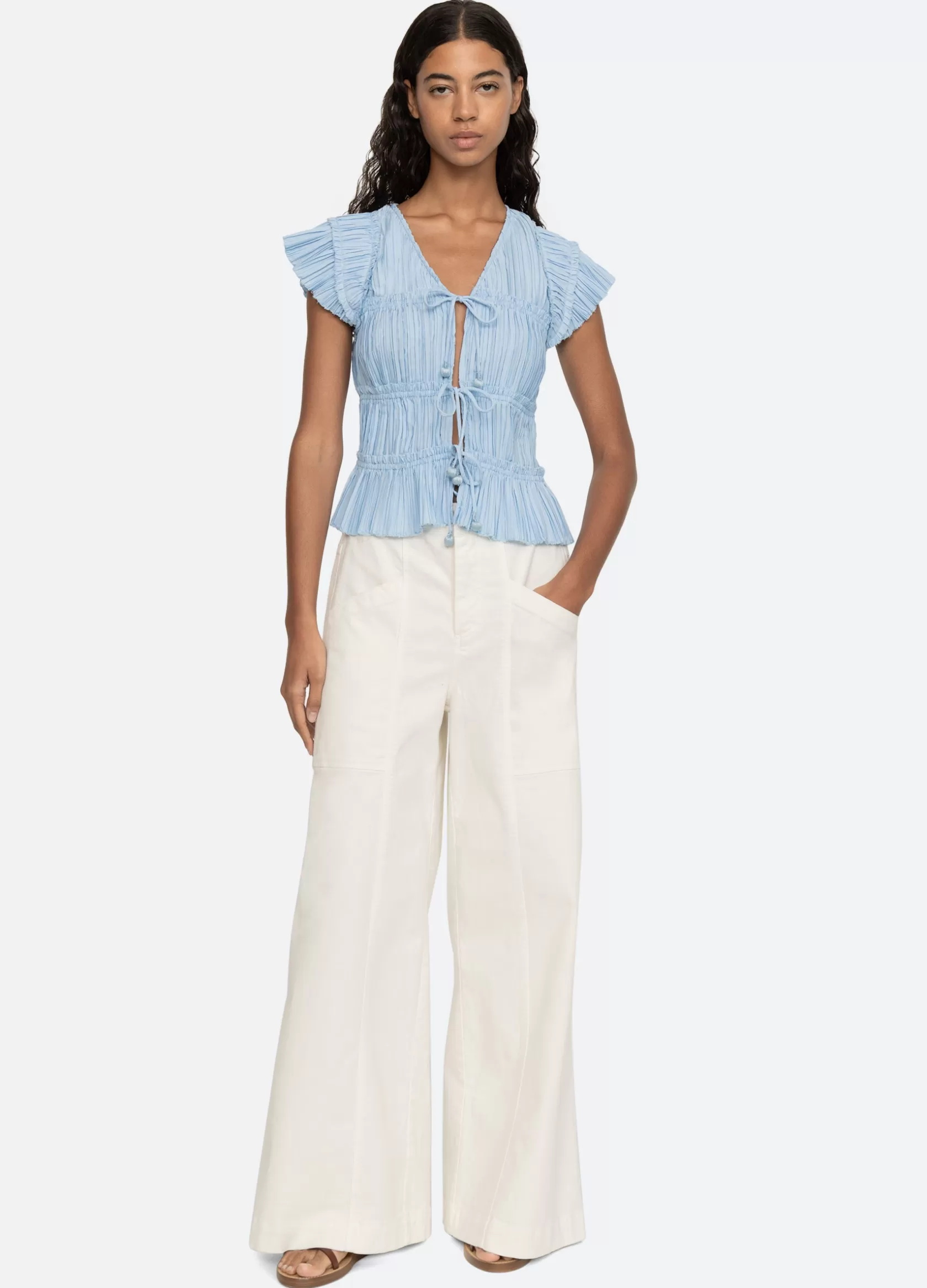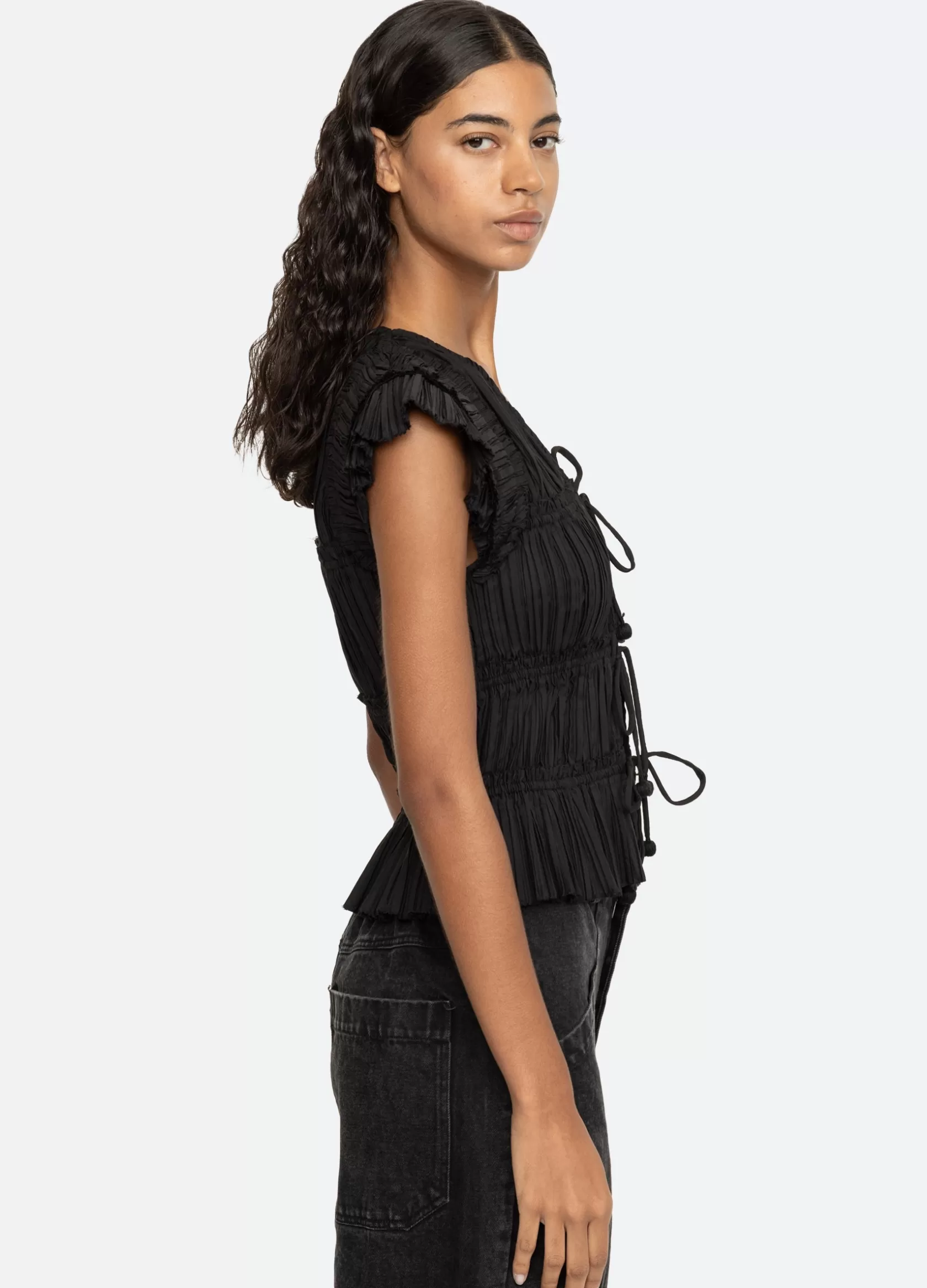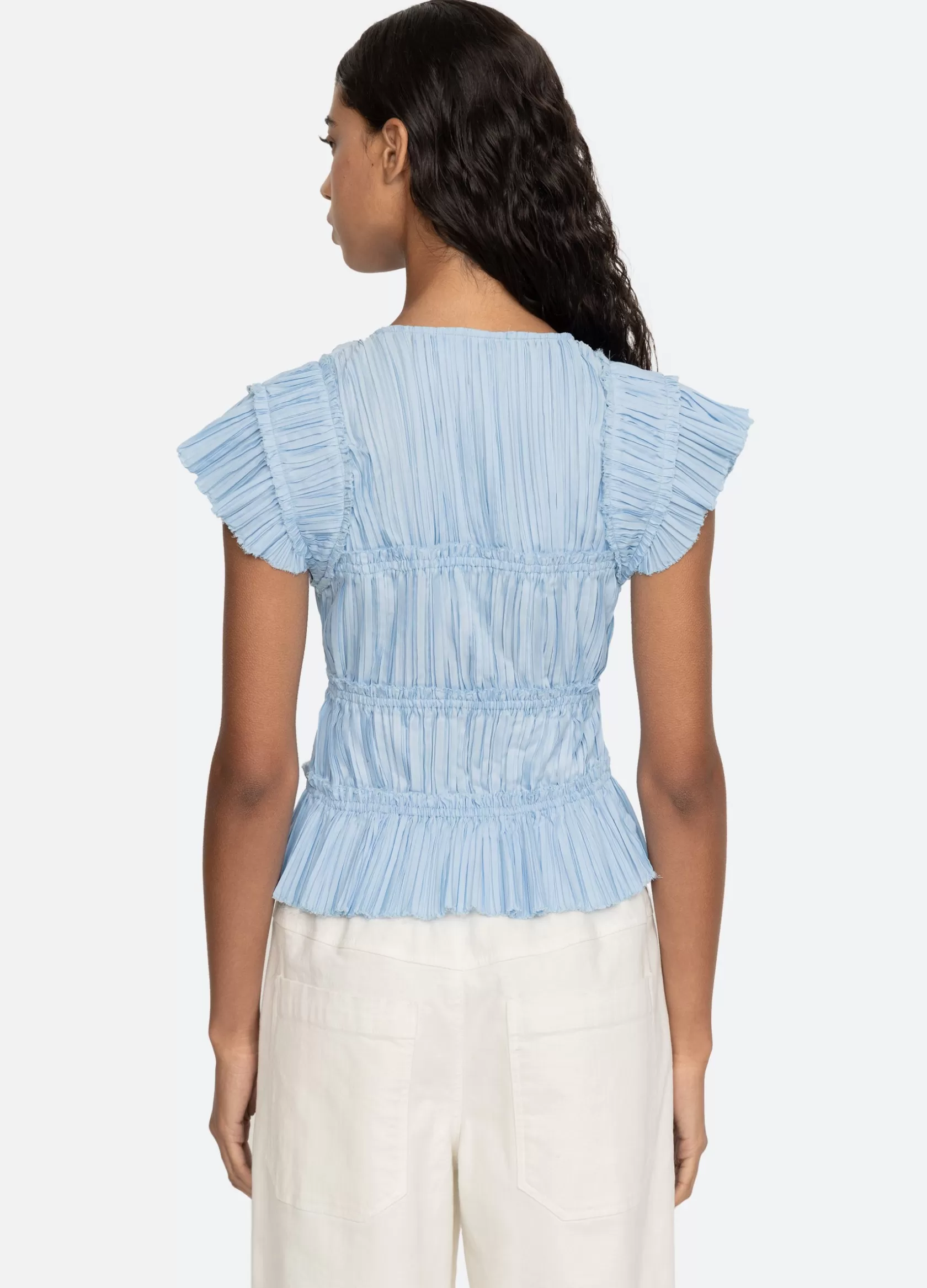 The Parcie crinkle tank top features flutter sleeves, raw edge detailing and tie front closures.