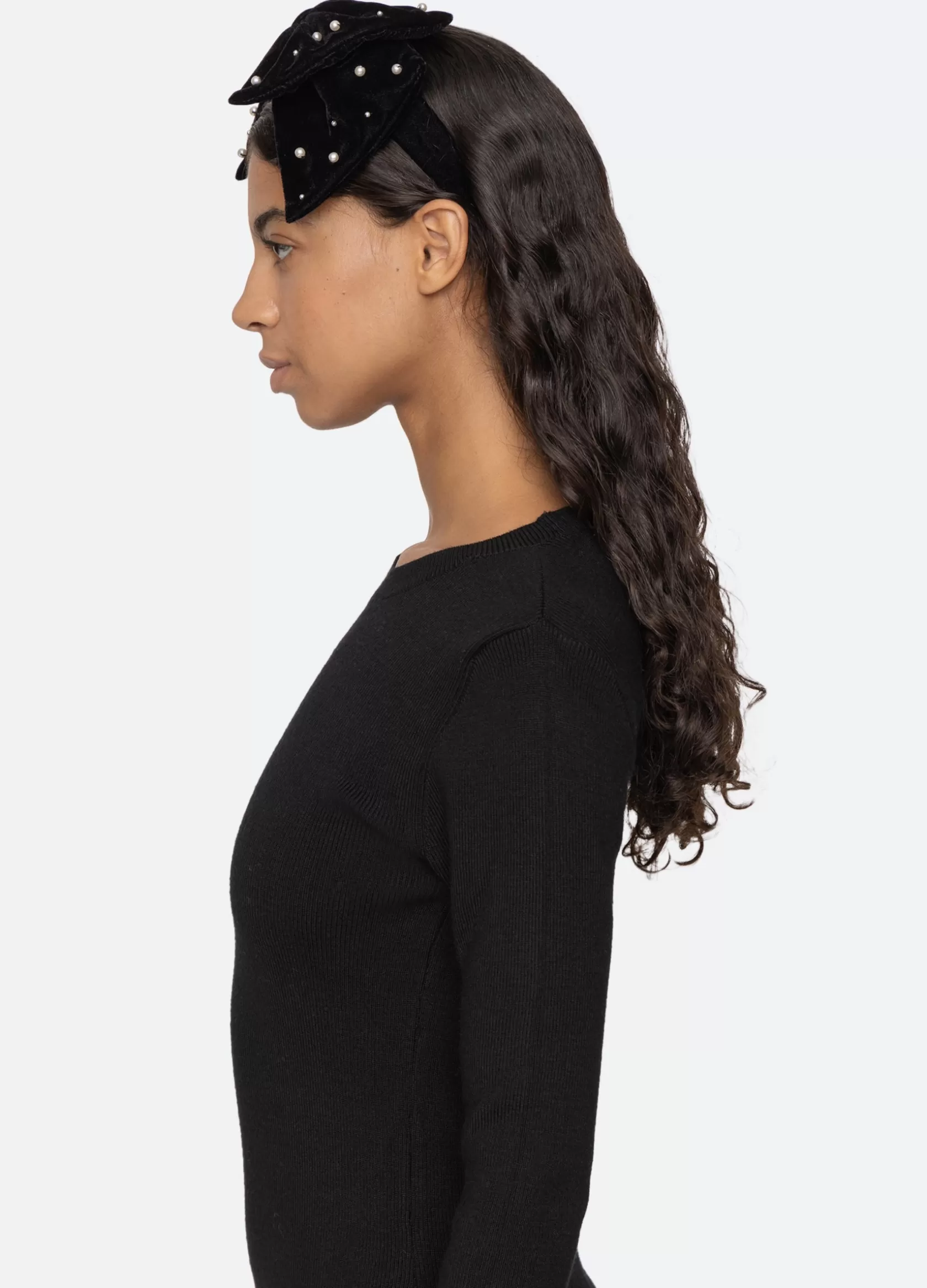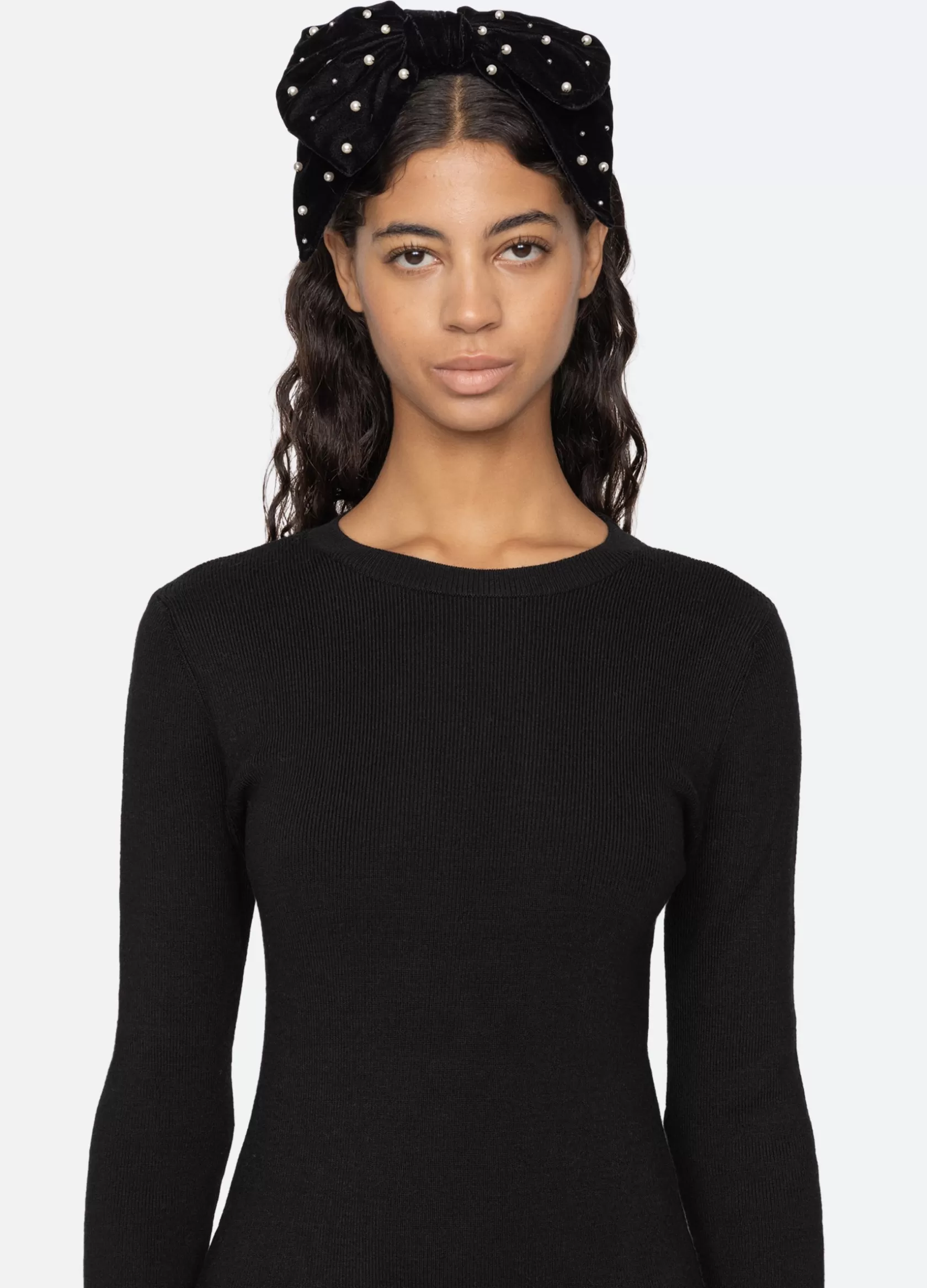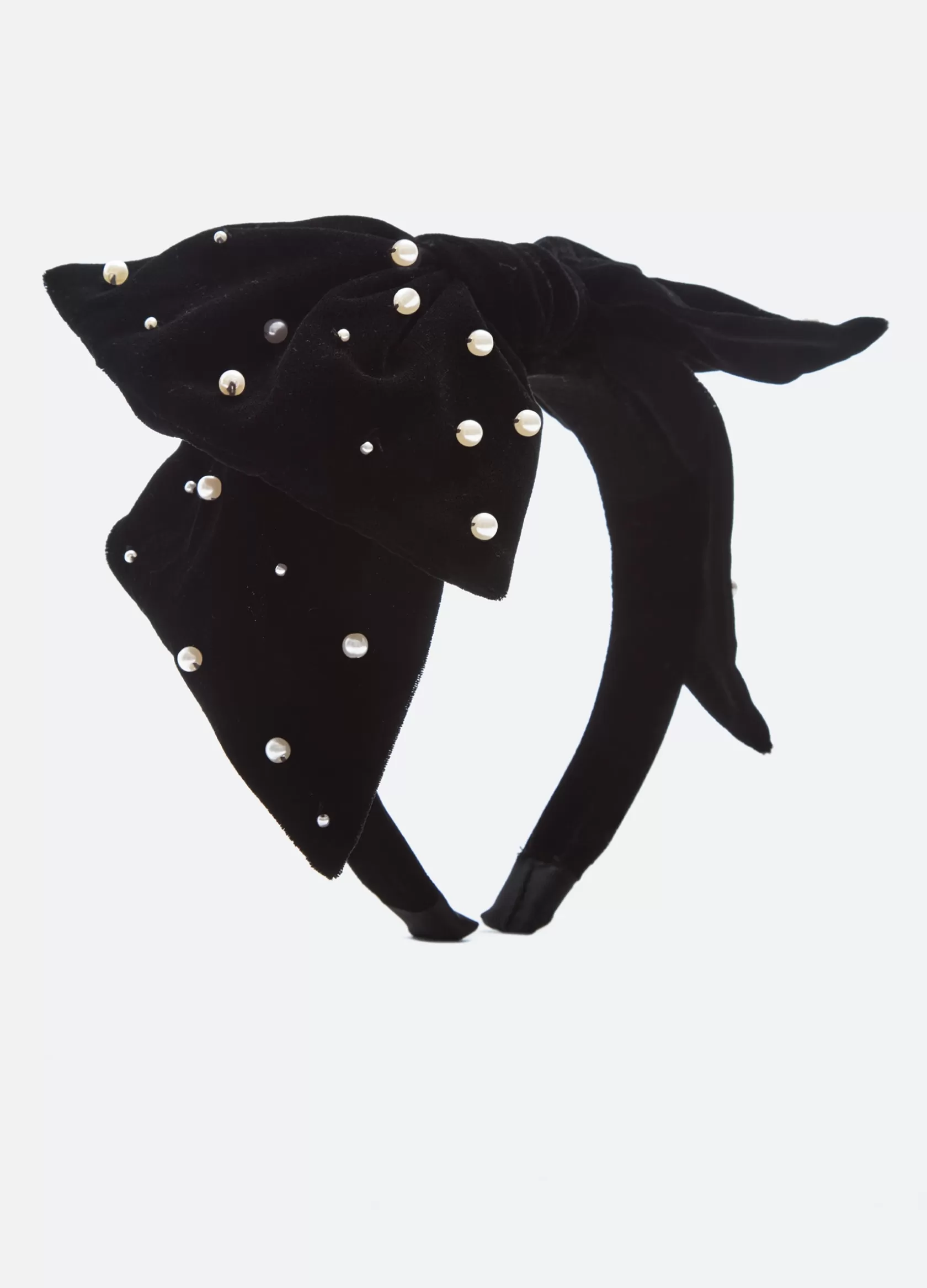 An online and in store exclusive. The Pearl velvet headband features an oversized bow and pearl accents.