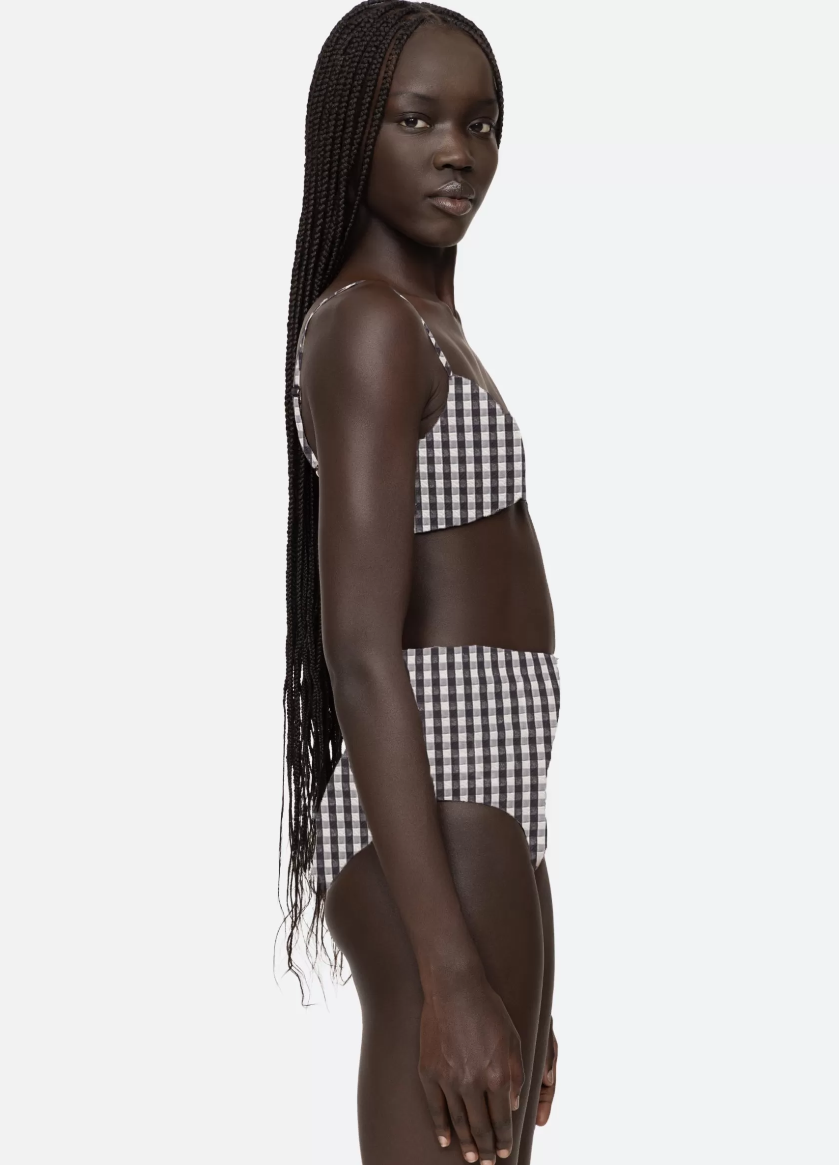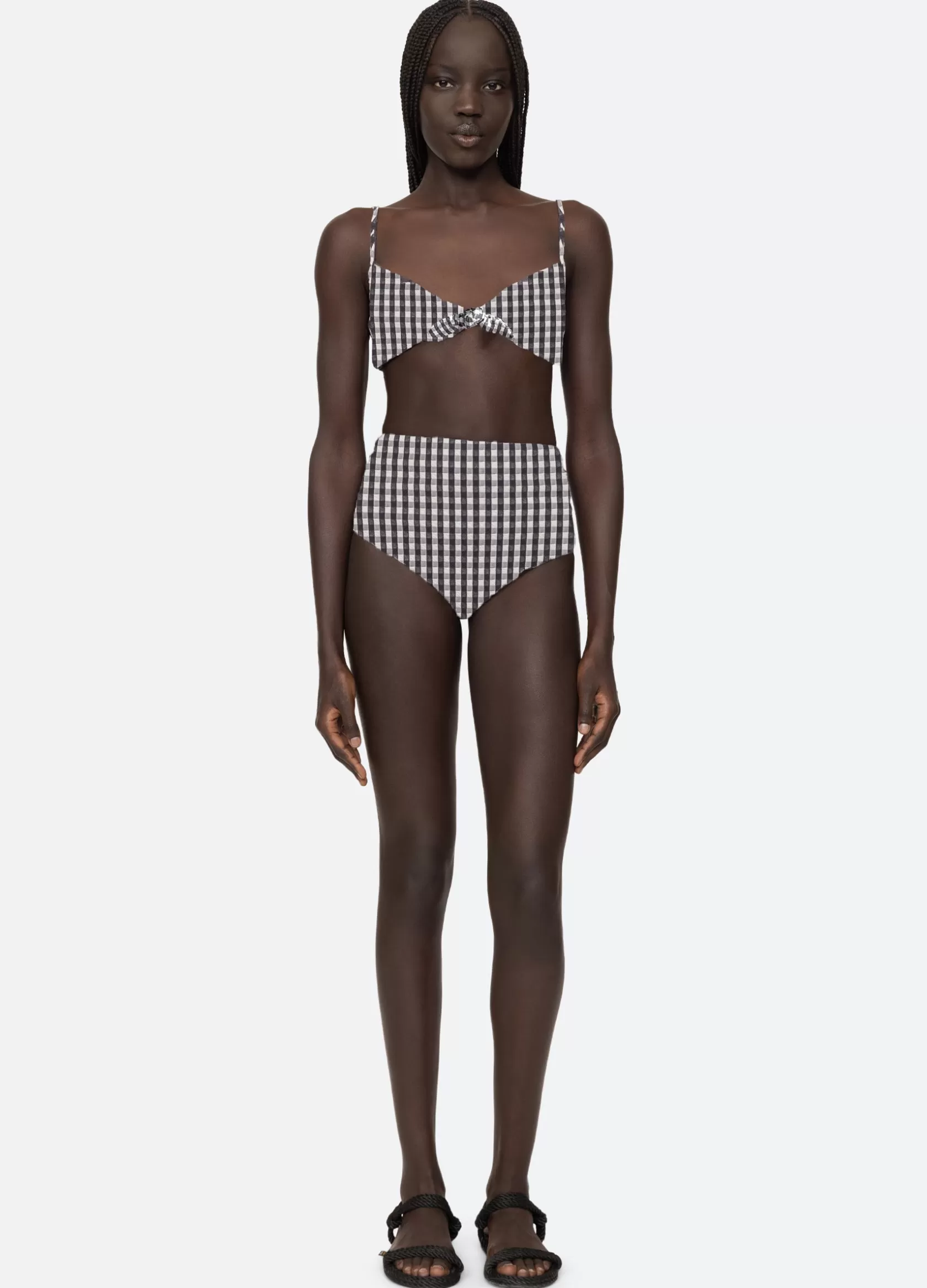 The Pucker gingham bikini top features a textured fabric, front tie and clasp fastening at back.