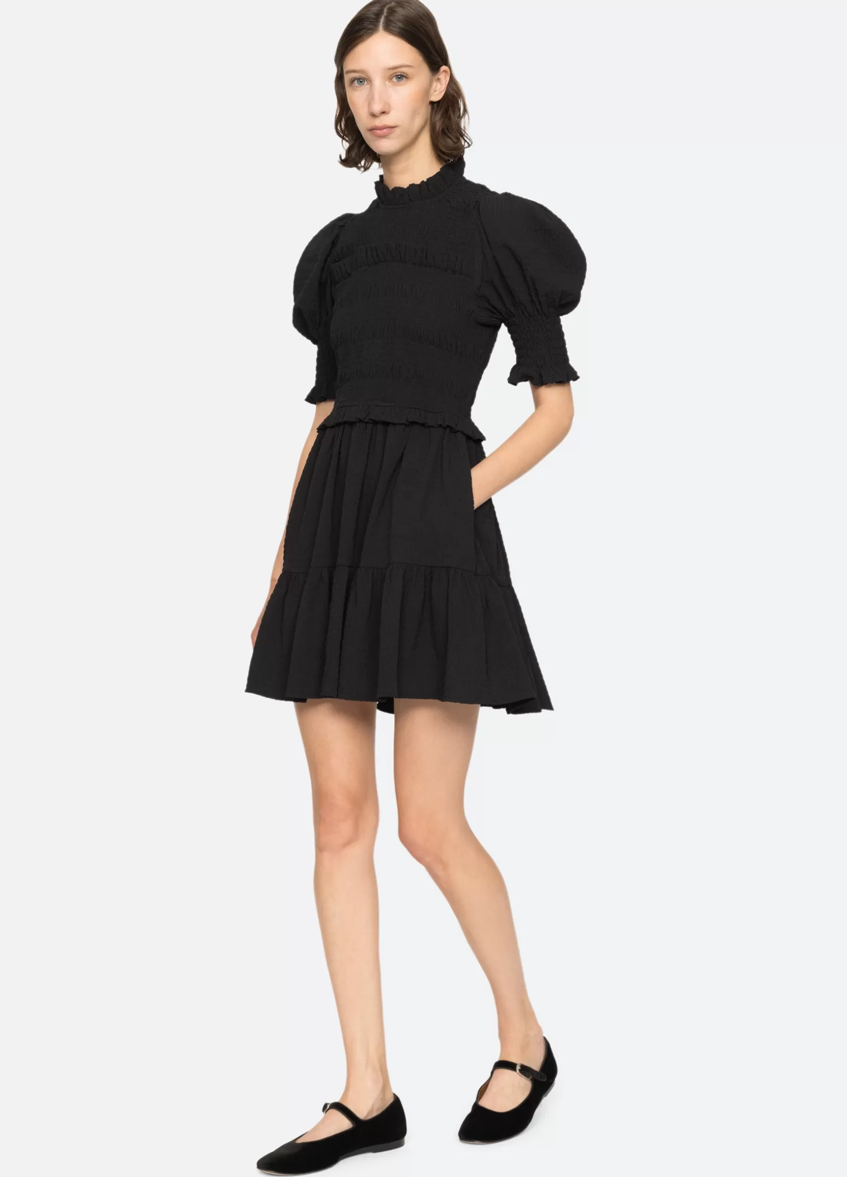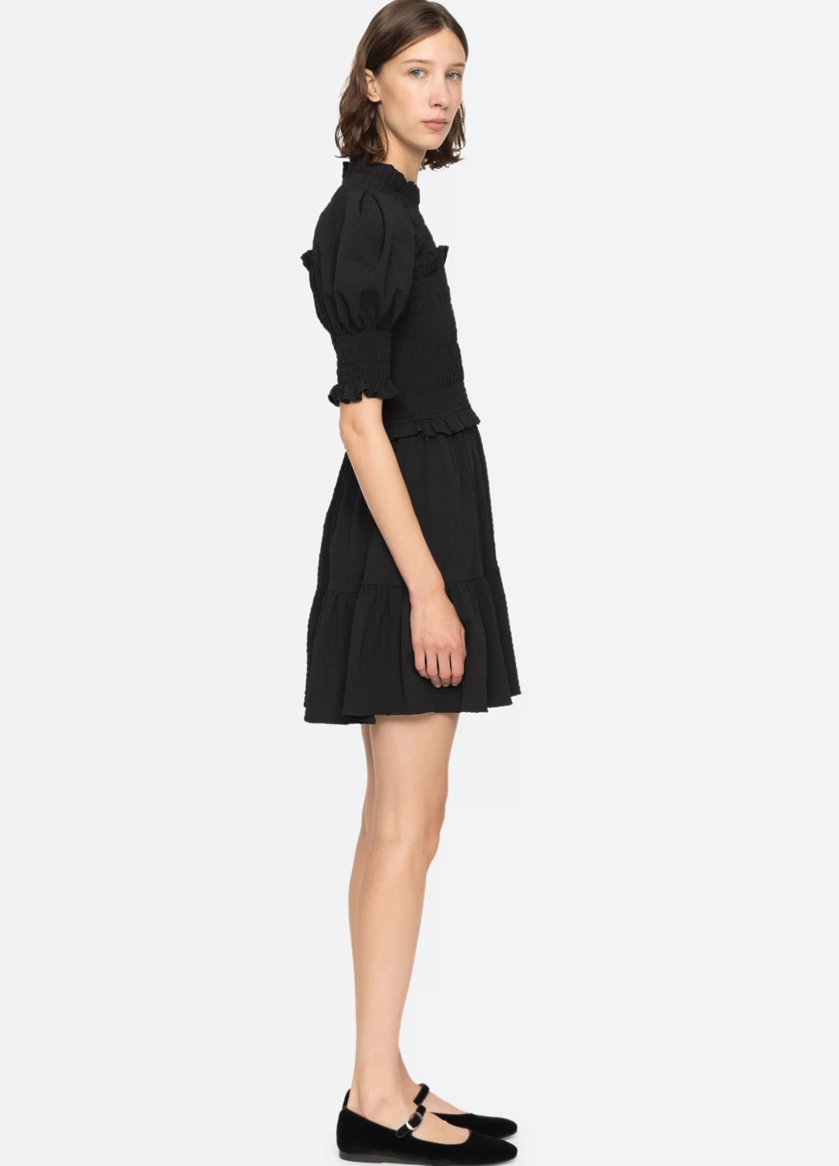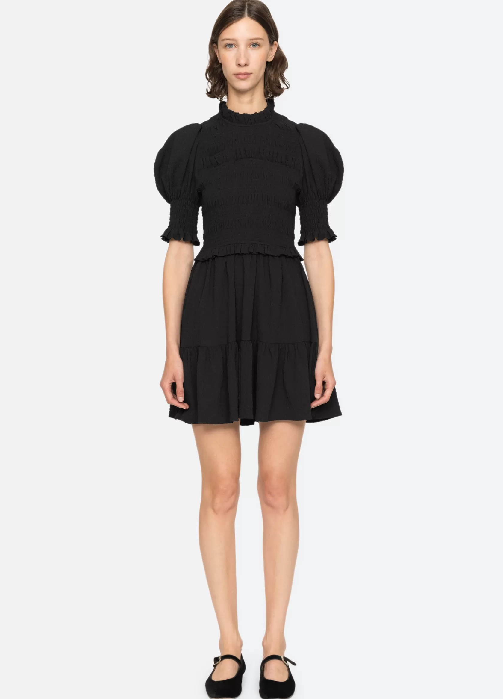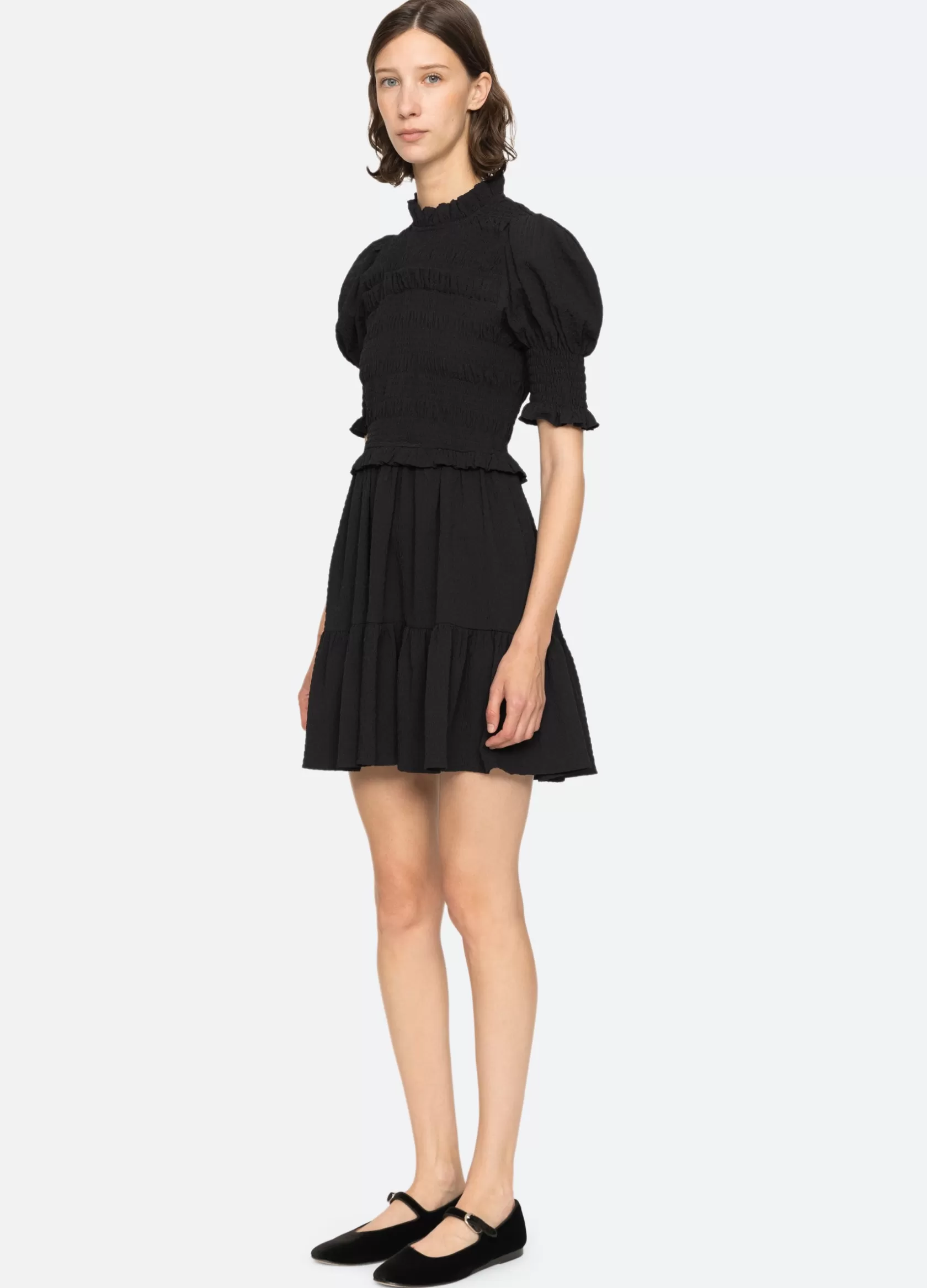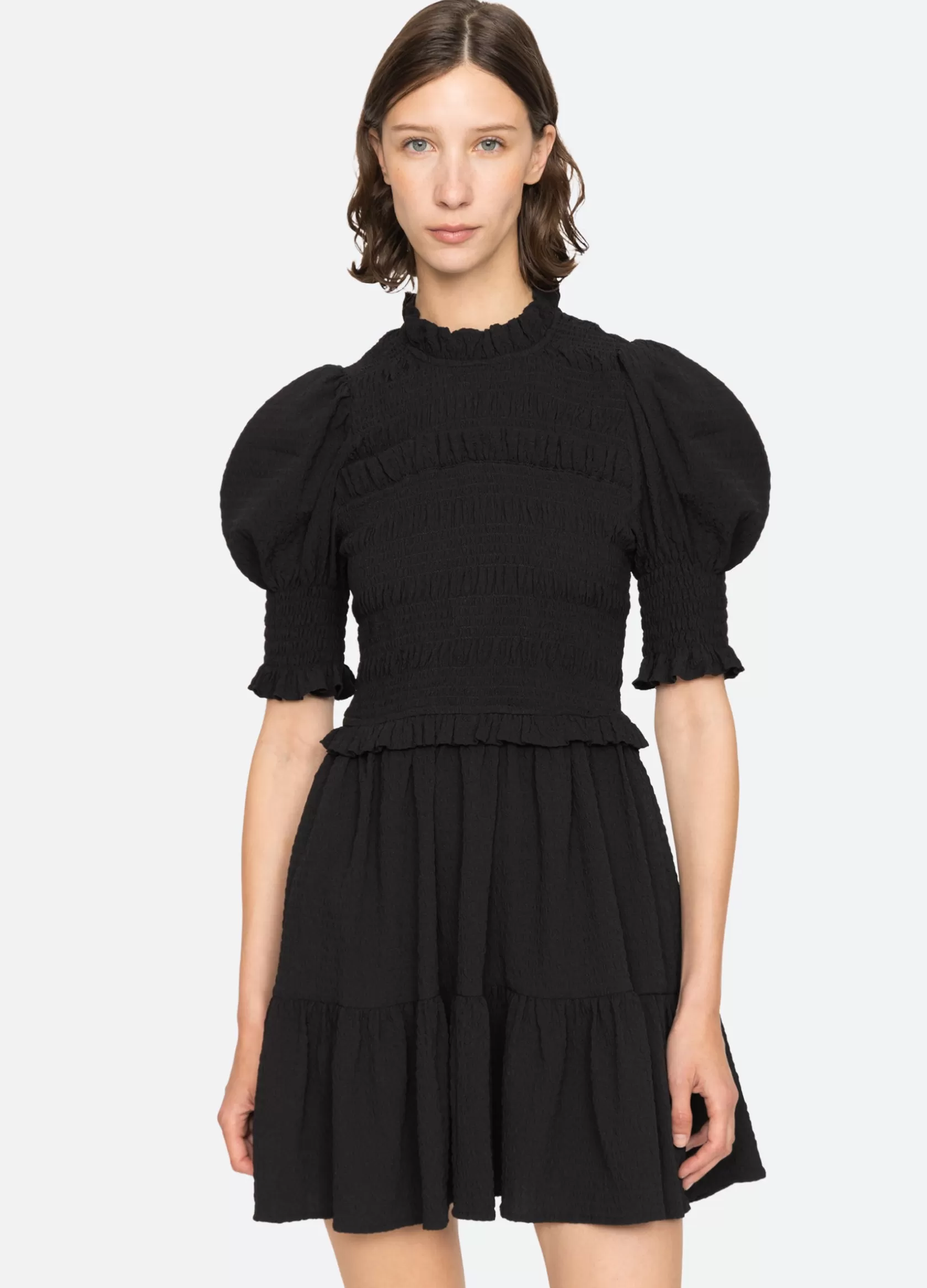 The Regina seersucker mini dress features a smocked bodice, puff sleeves and ruffle trim detailing.